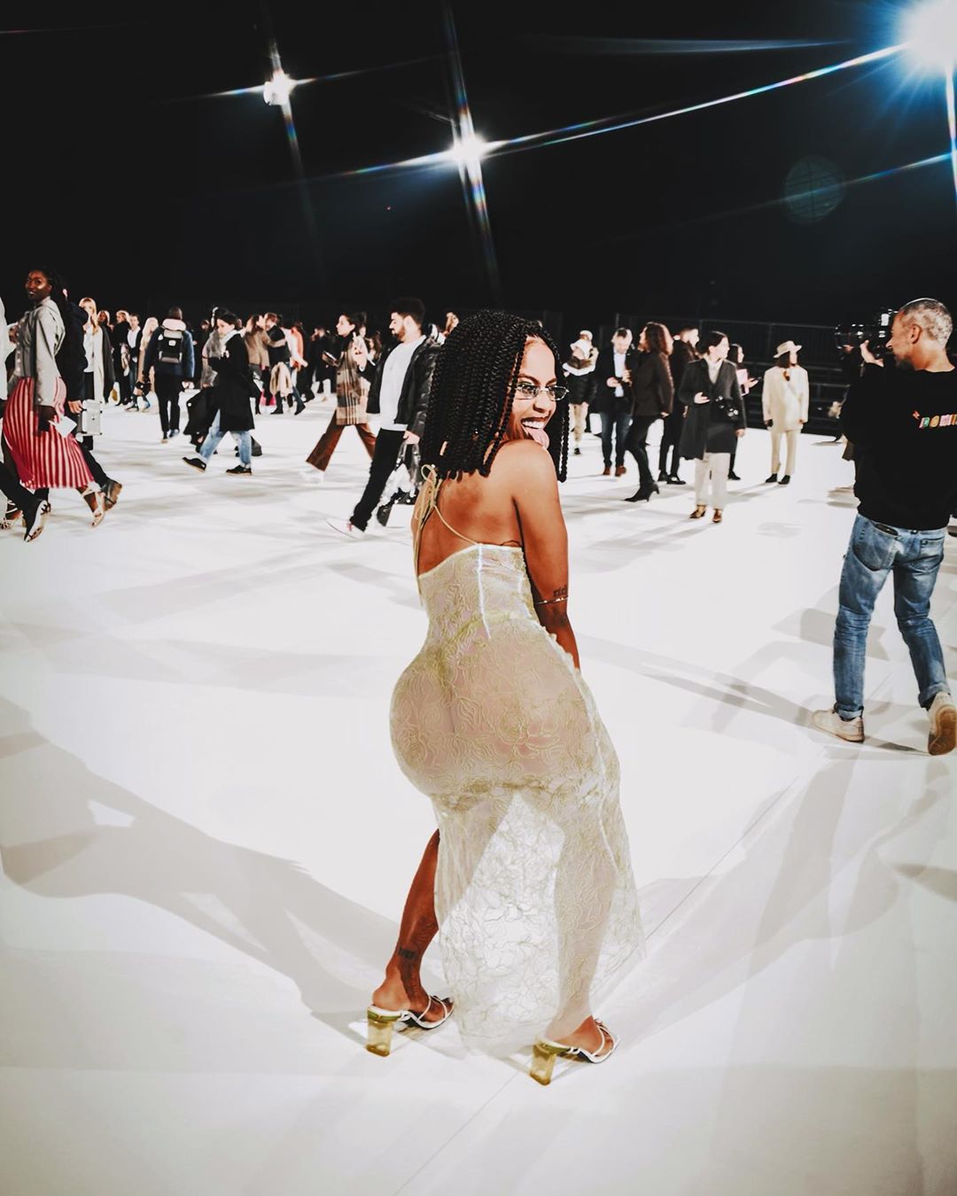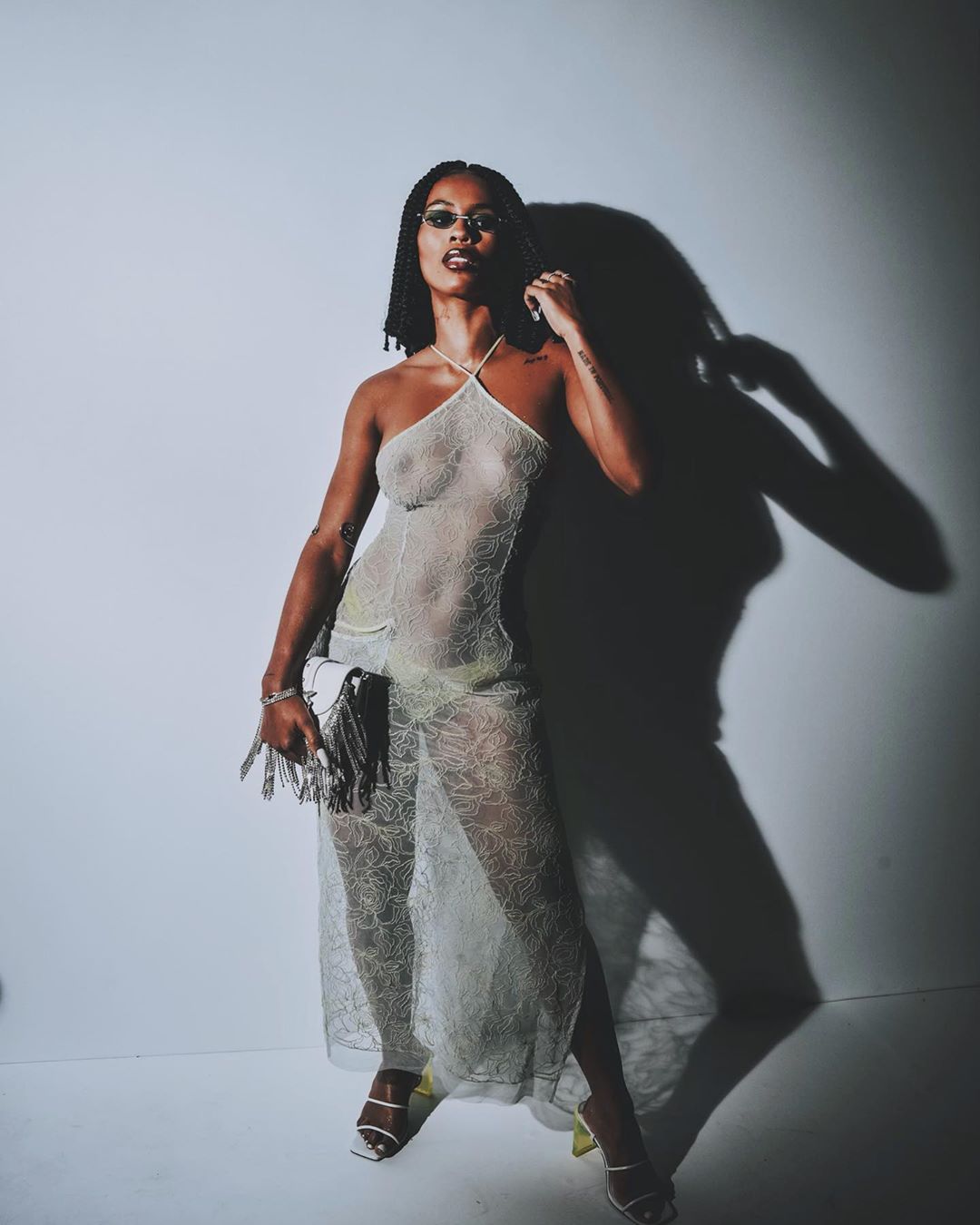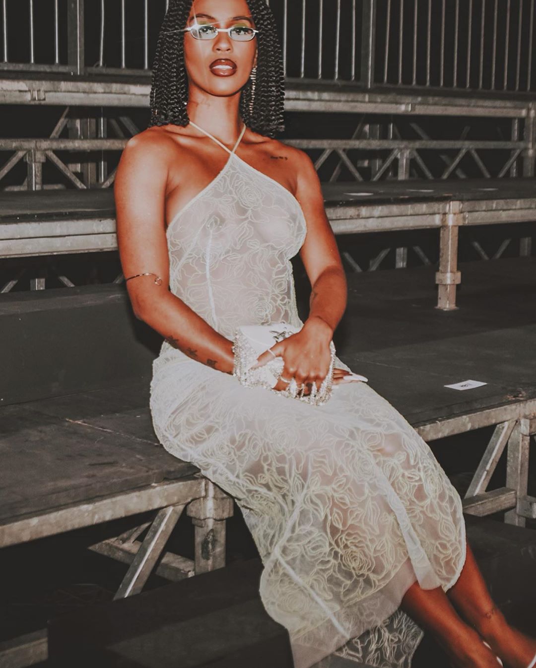 Singer IAMDDB shows off her tits, wearing a see-through white dress at the Jacquemu fashion show during Paris Fashion Week – Instagram, 01/19/2020.