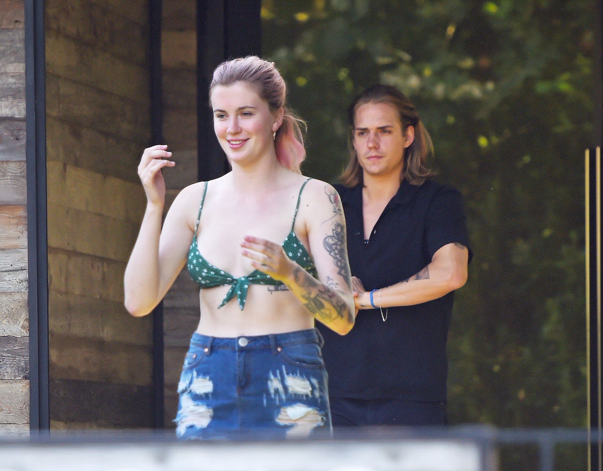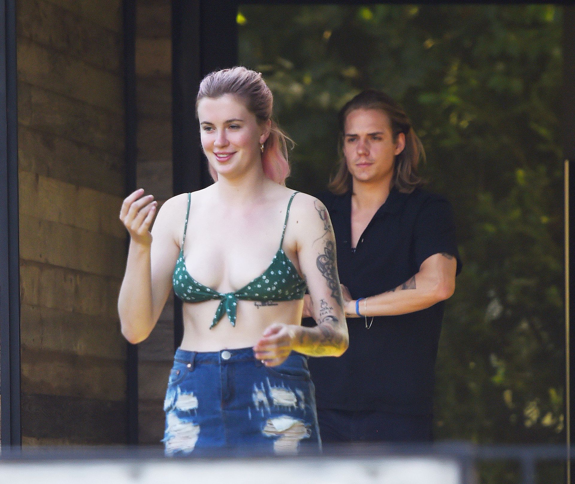 Ireland Baldwin shows off her bikini body and new pink hairdo as she and her boyfriend Corey Harper leave a party in Los Angeles, 07/04/2019.