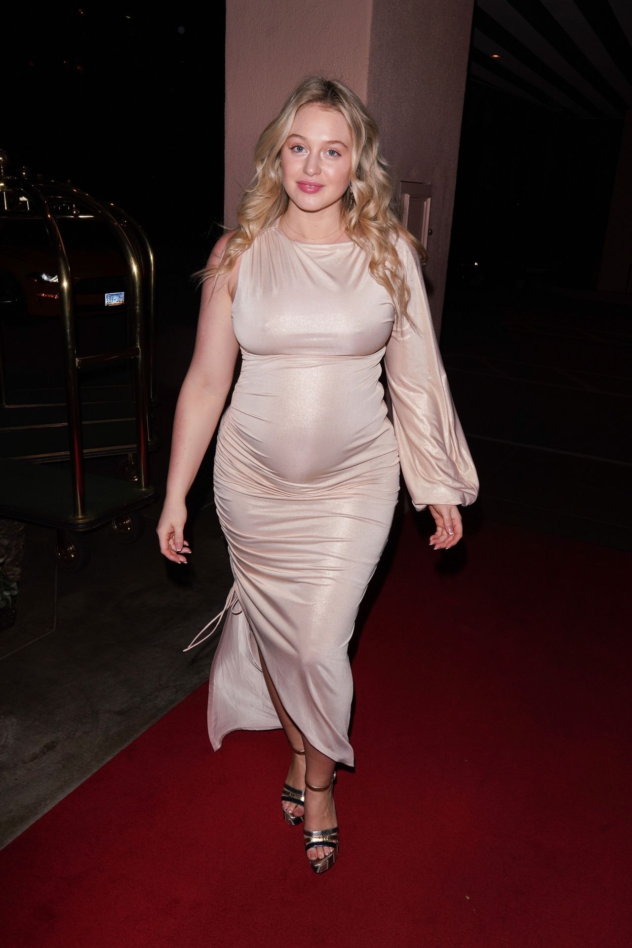 Model Iskra Lawrence shows off baby bump in tan dress at Golden Globes pre party in Beverly Hills, 01/04/2020.