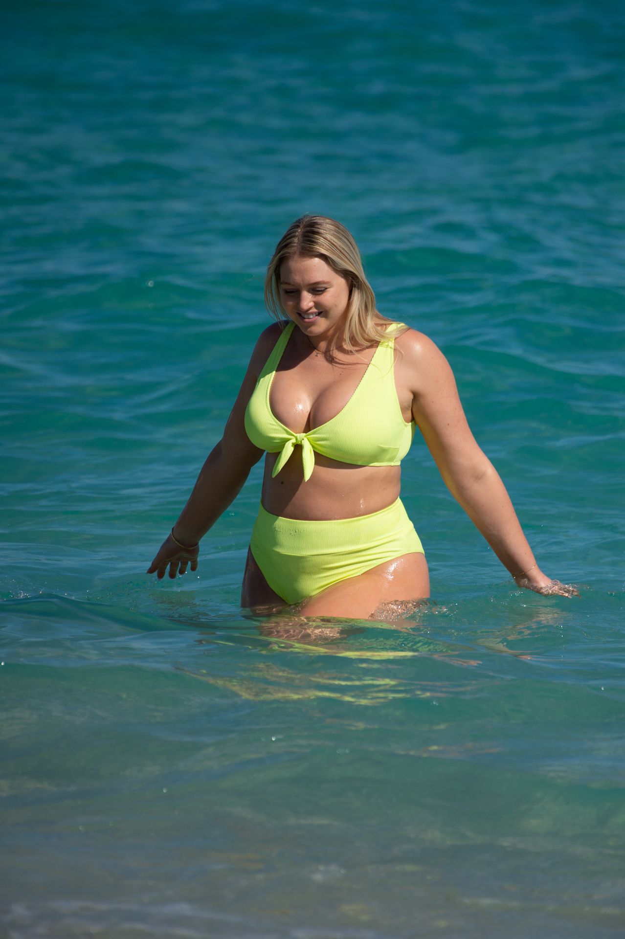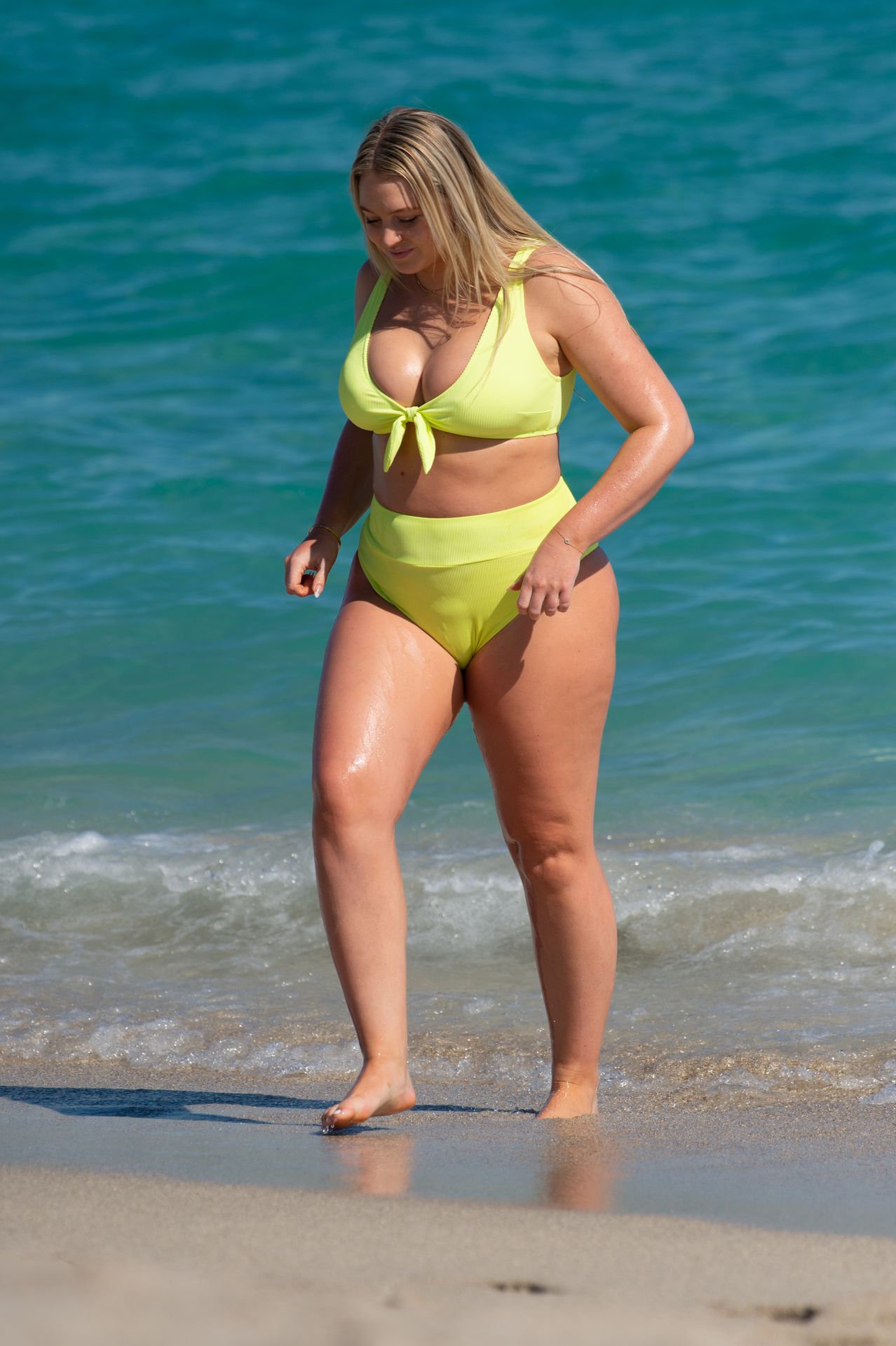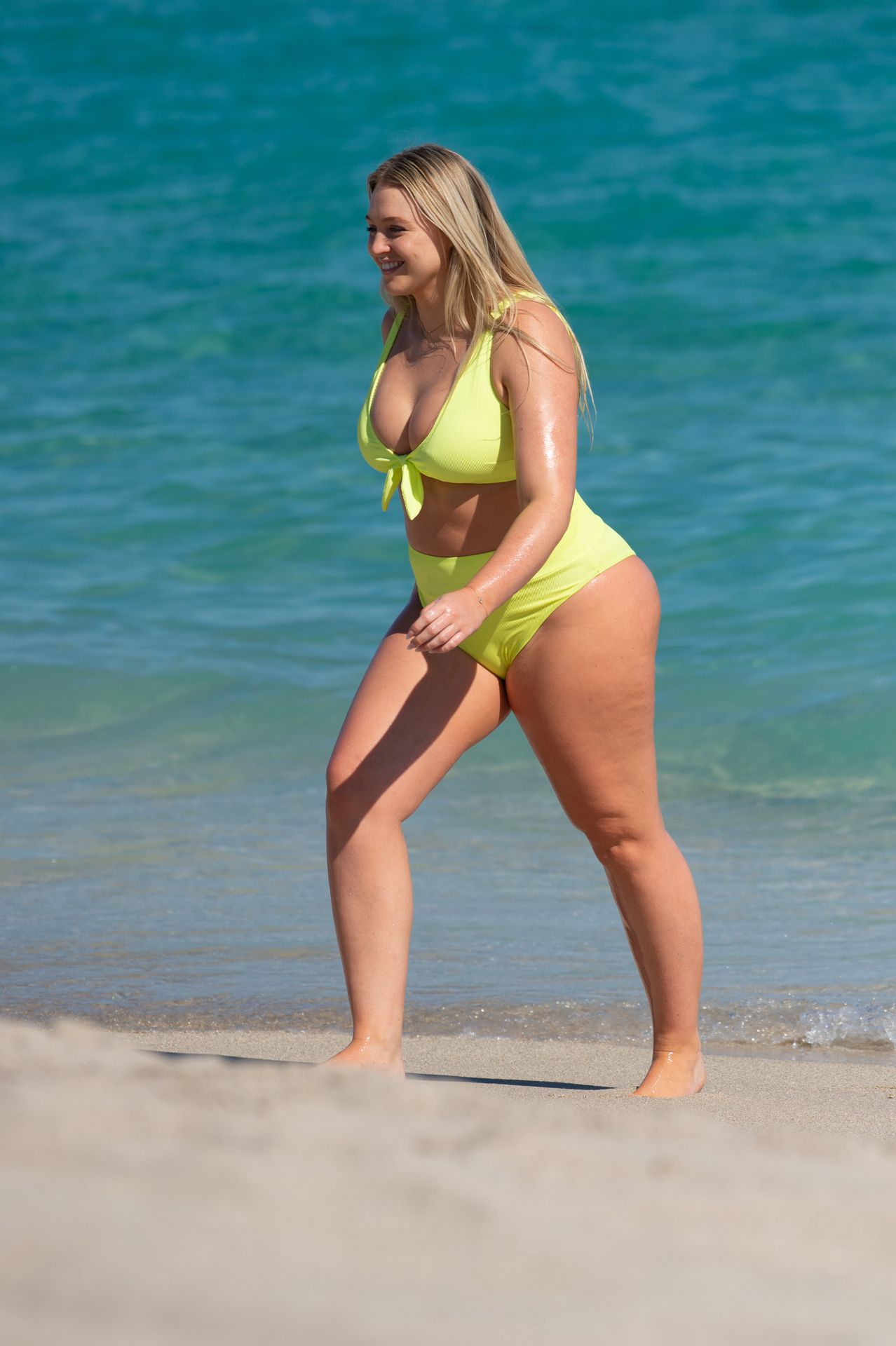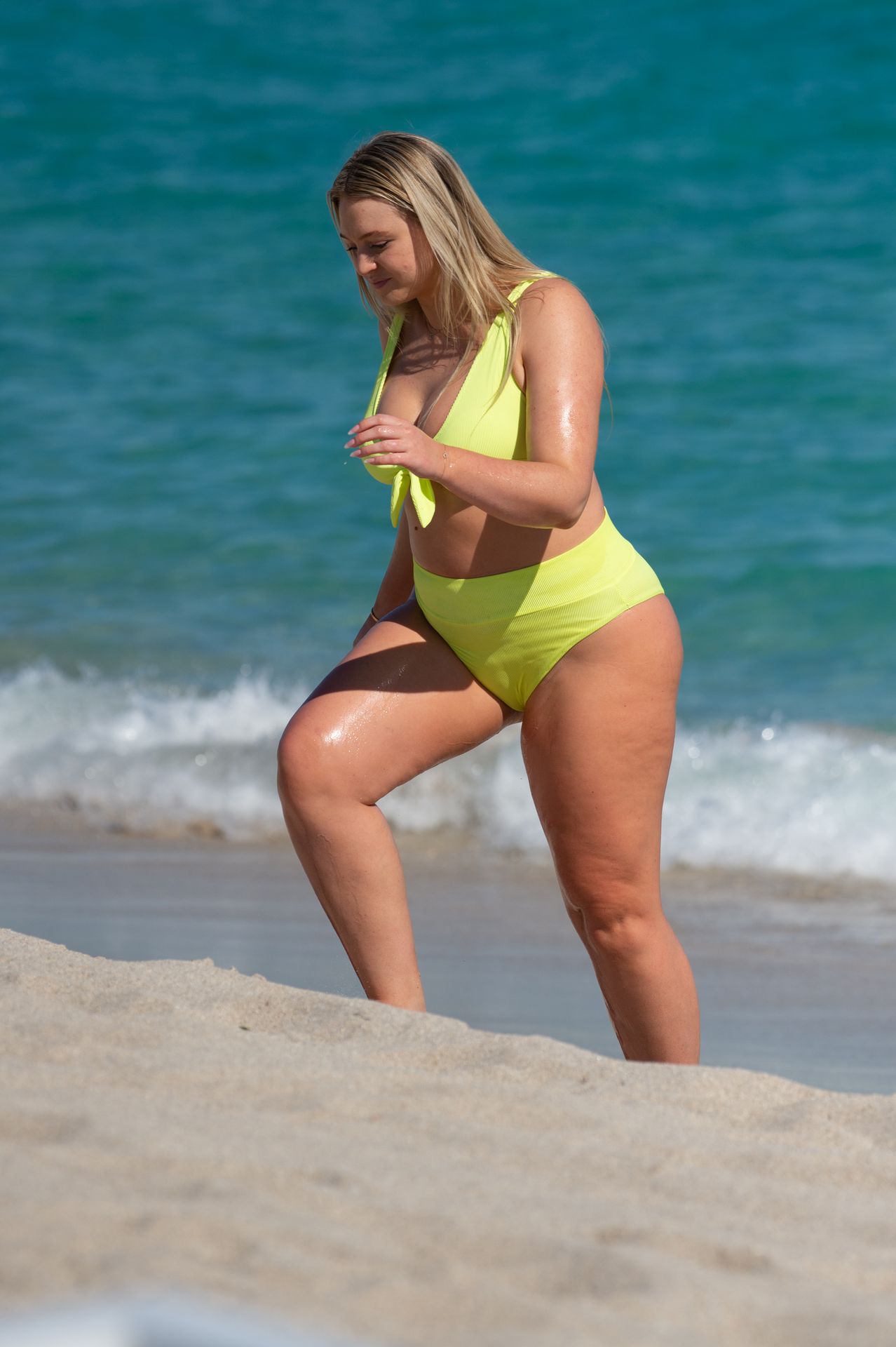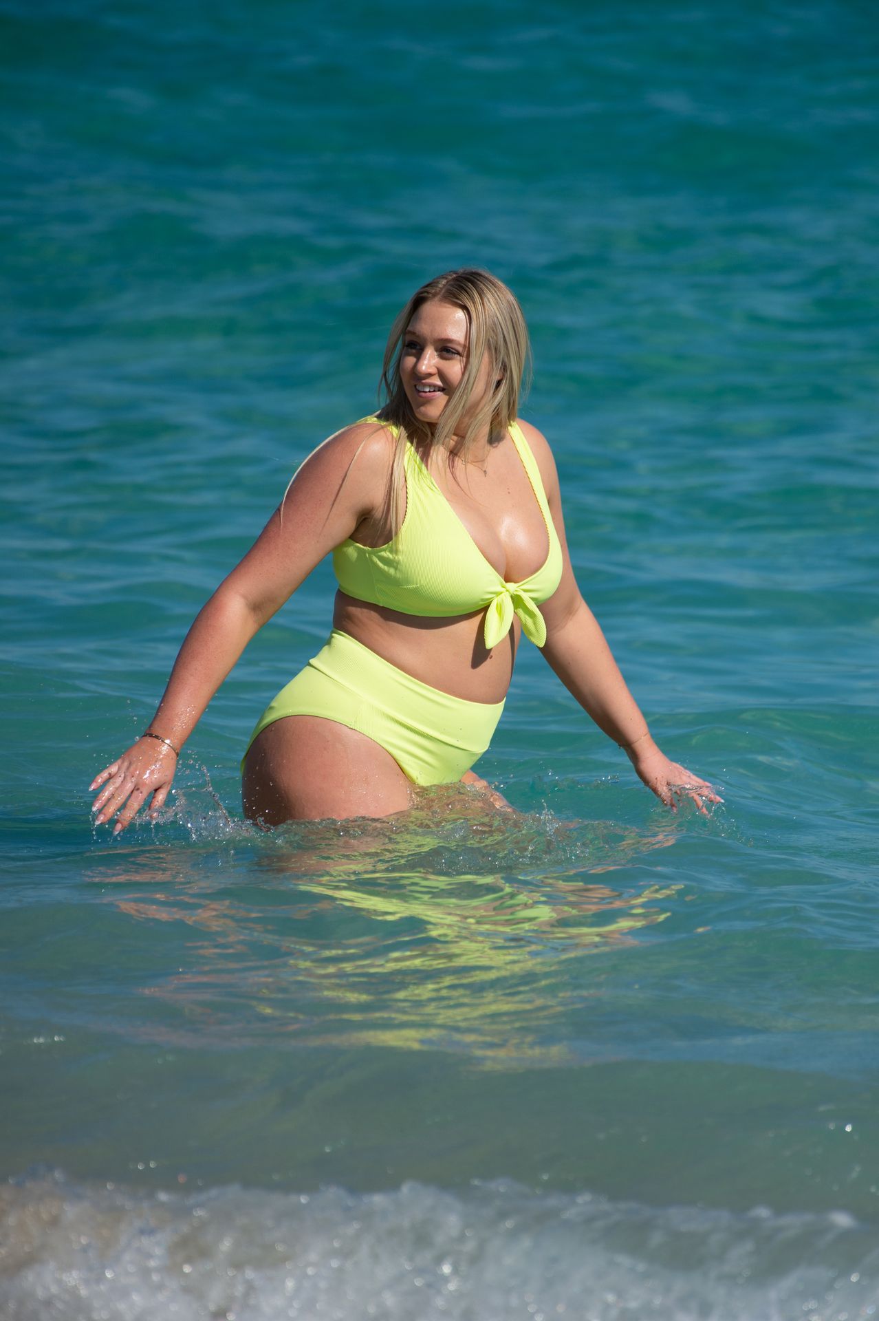 Pregnant Iskra Lawrence shows off her growing baby bump in Miami Beach. The curvaceous model was spotted in an eye-catching yellow bikini as she cooled off with a dip in the ocean on Friday.