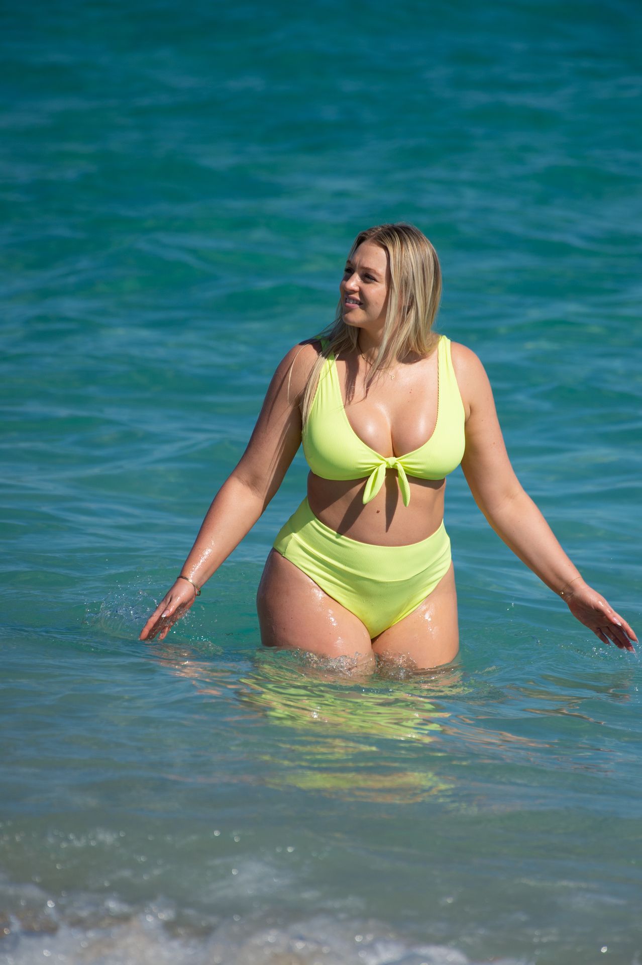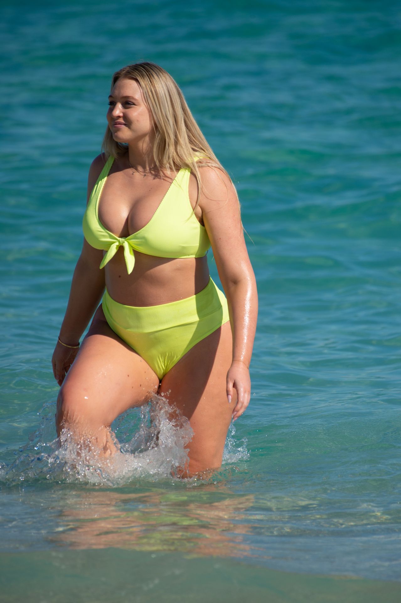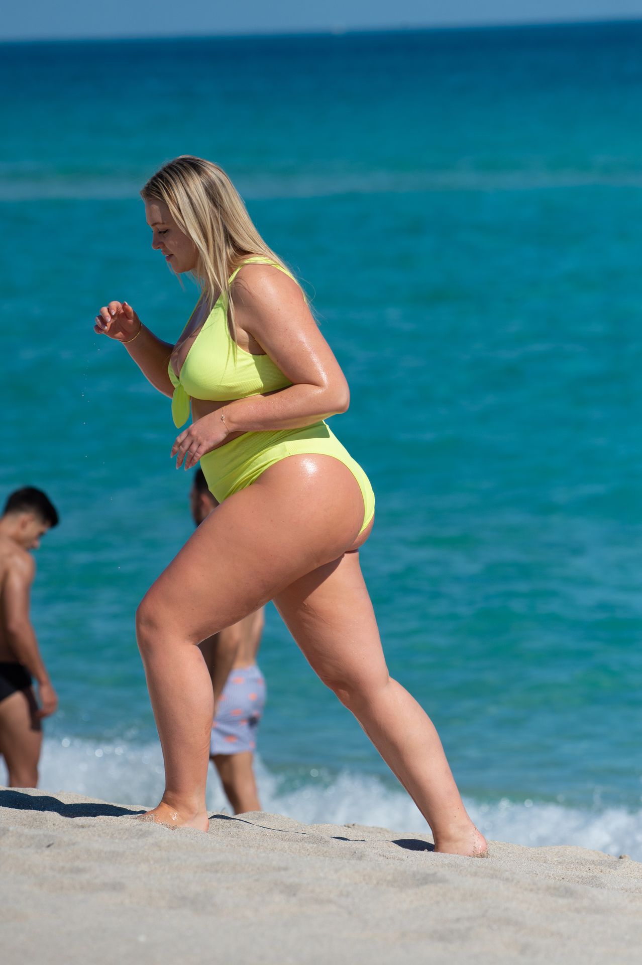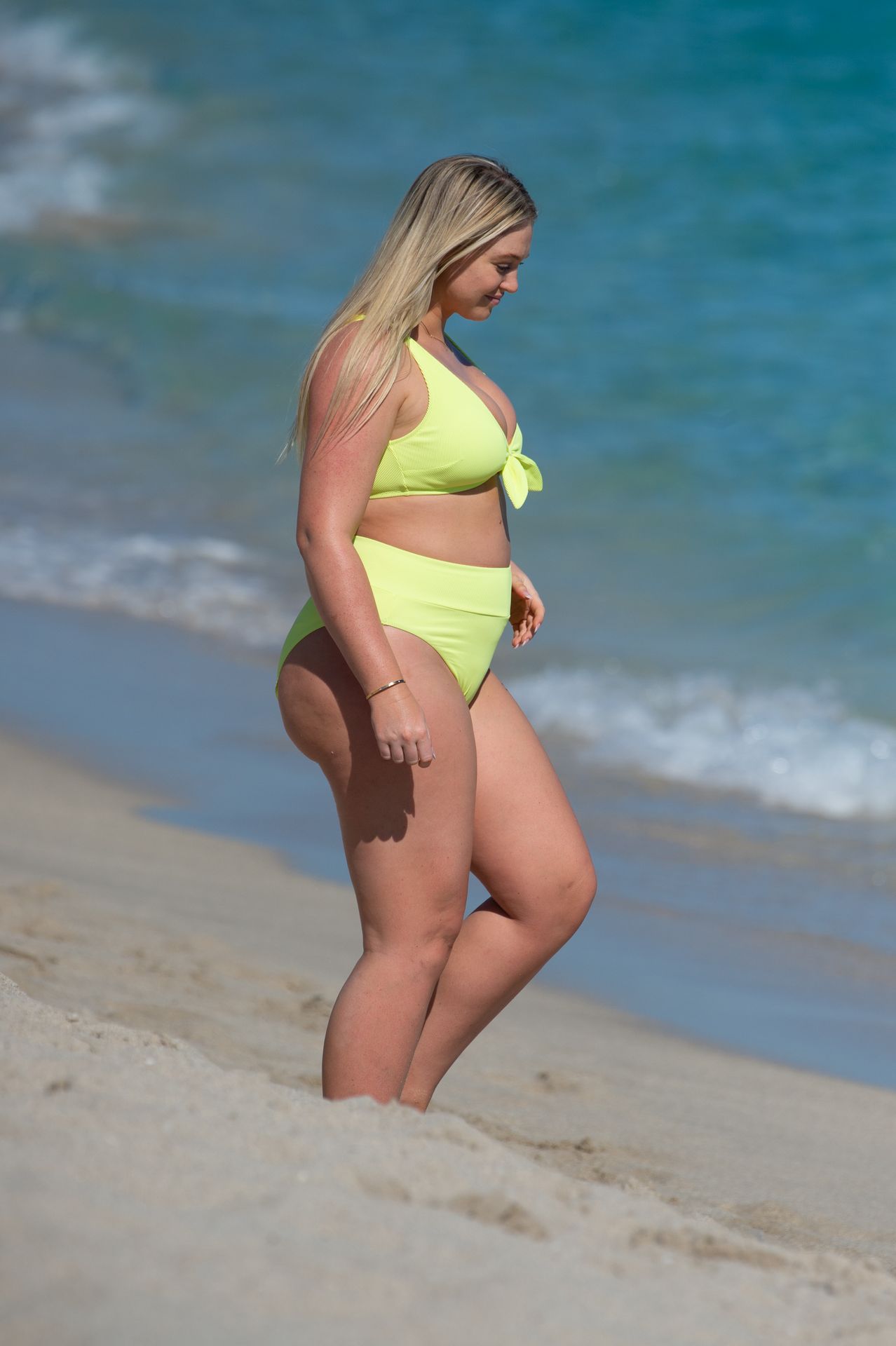 Pregnant Iskra Lawrence shows off her growing baby bump in Miami Beach. The curvaceous model was spotted in an eye-catching yellow bikini as she cooled off with a dip in the ocean on Friday.