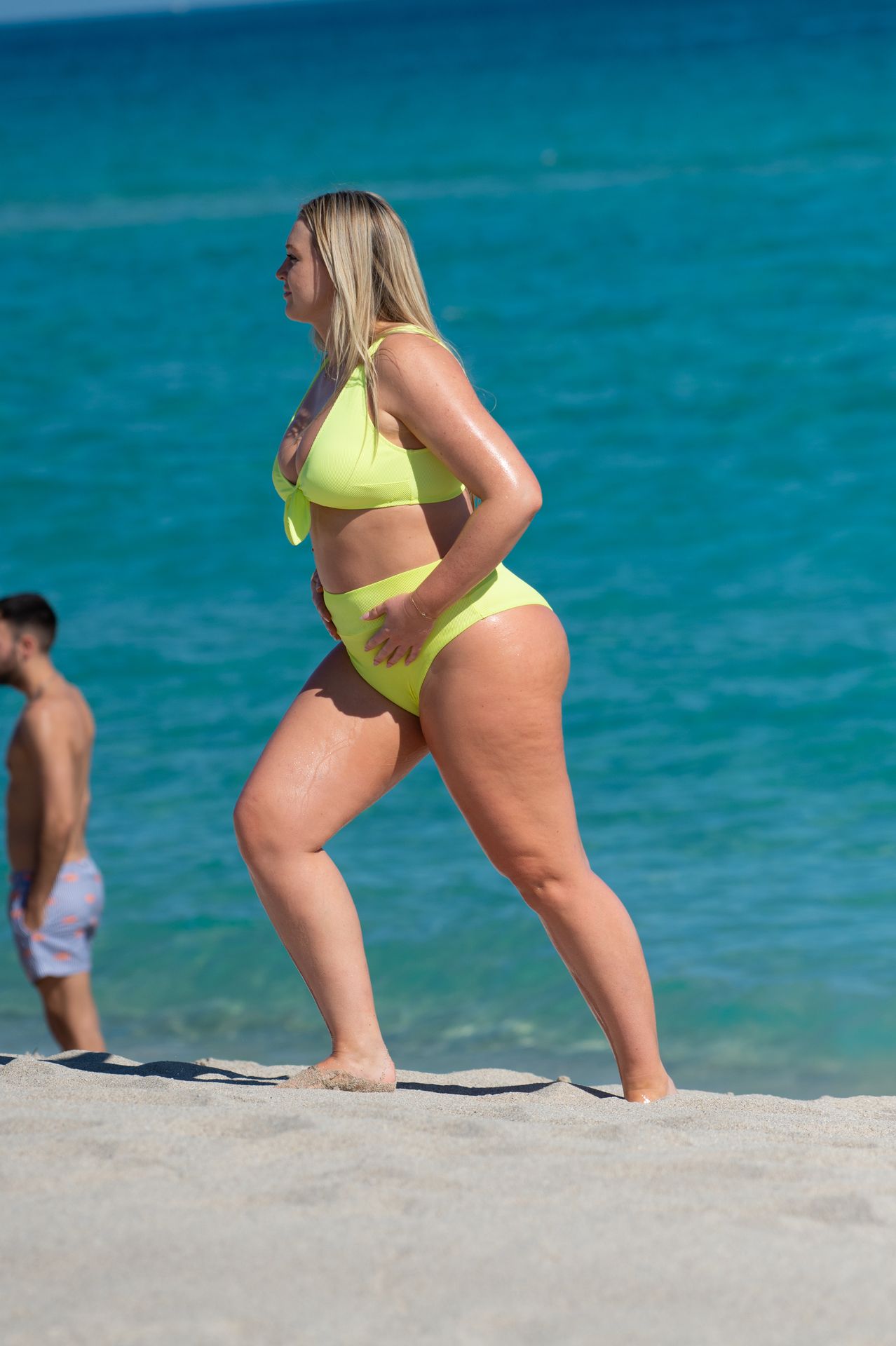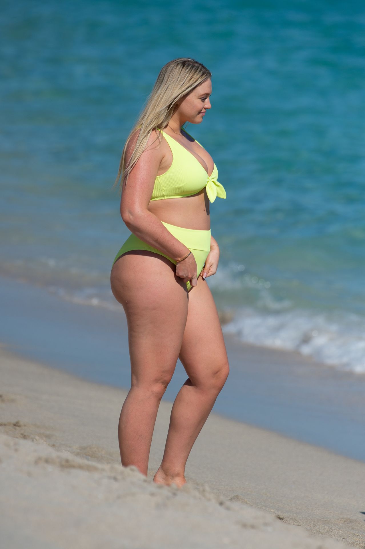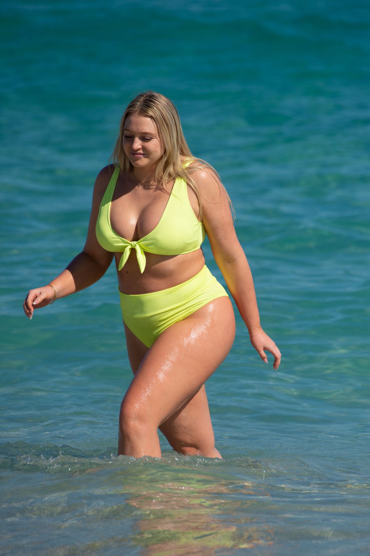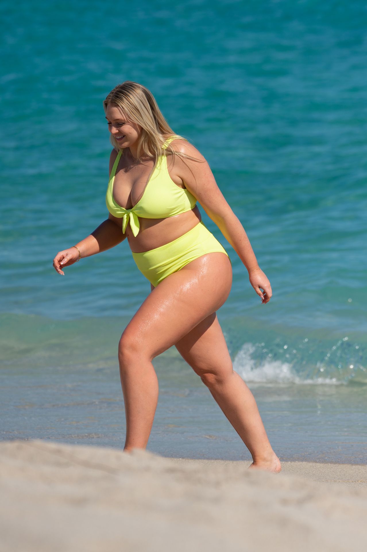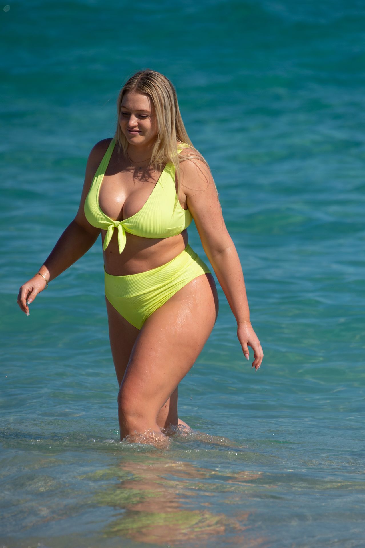 Pregnant Iskra Lawrence shows off her growing baby bump in Miami Beach. The curvaceous model was spotted in an eye-catching yellow bikini as she cooled off with a dip in the ocean on Friday.