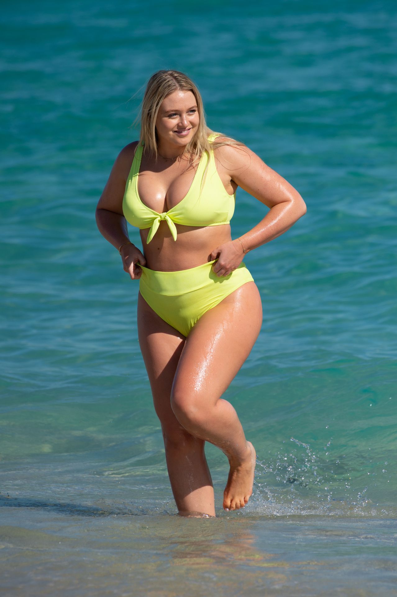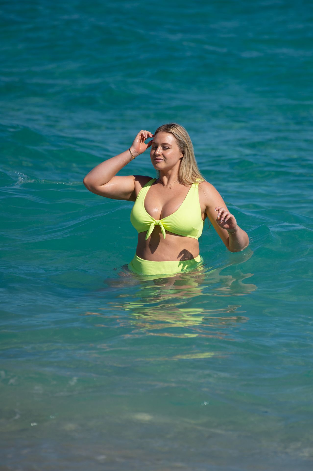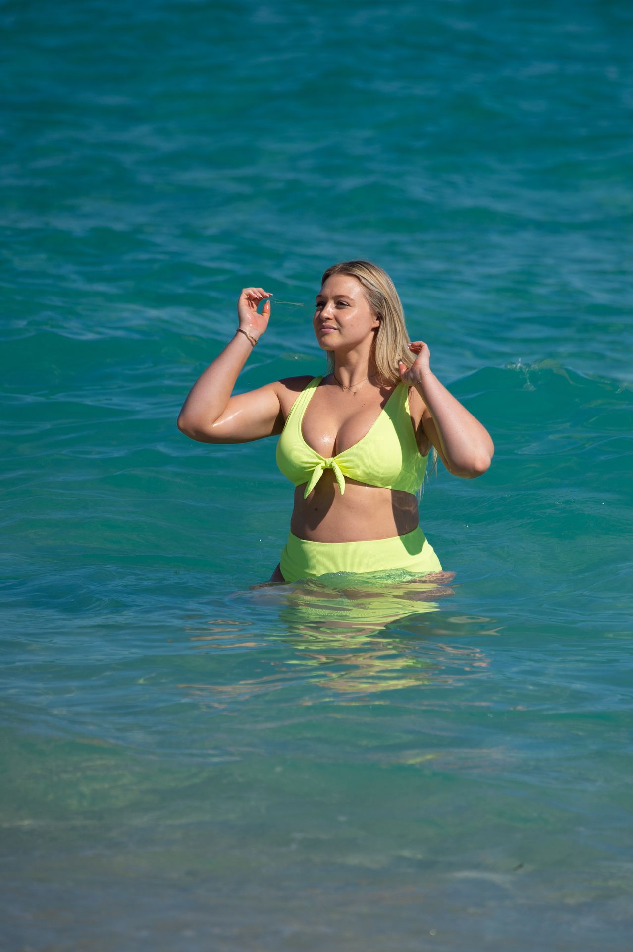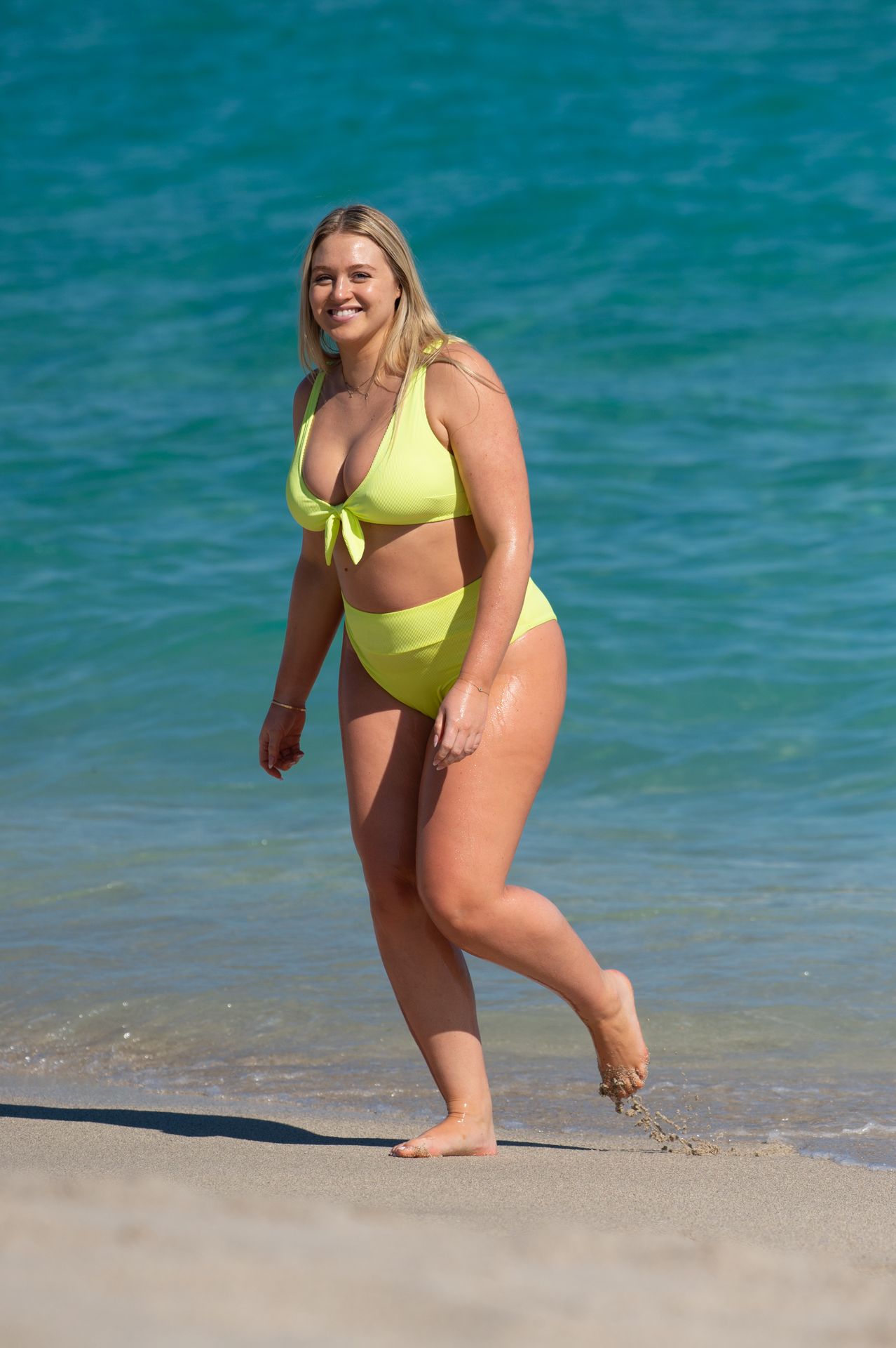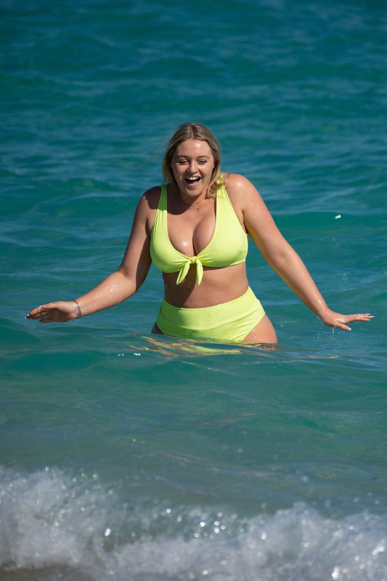 Pregnant Iskra Lawrence shows off her growing baby bump in Miami Beach. The curvaceous model was spotted in an eye-catching yellow bikini as she cooled off with a dip in the ocean on Friday.