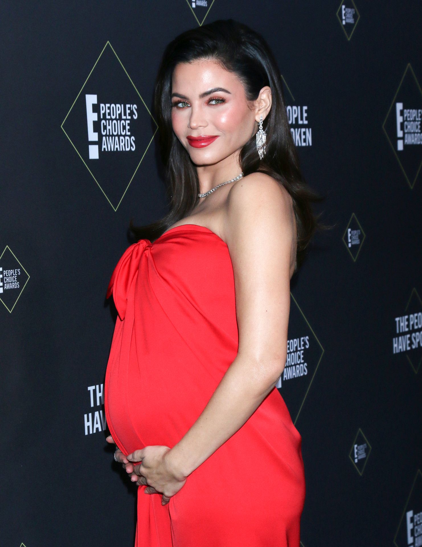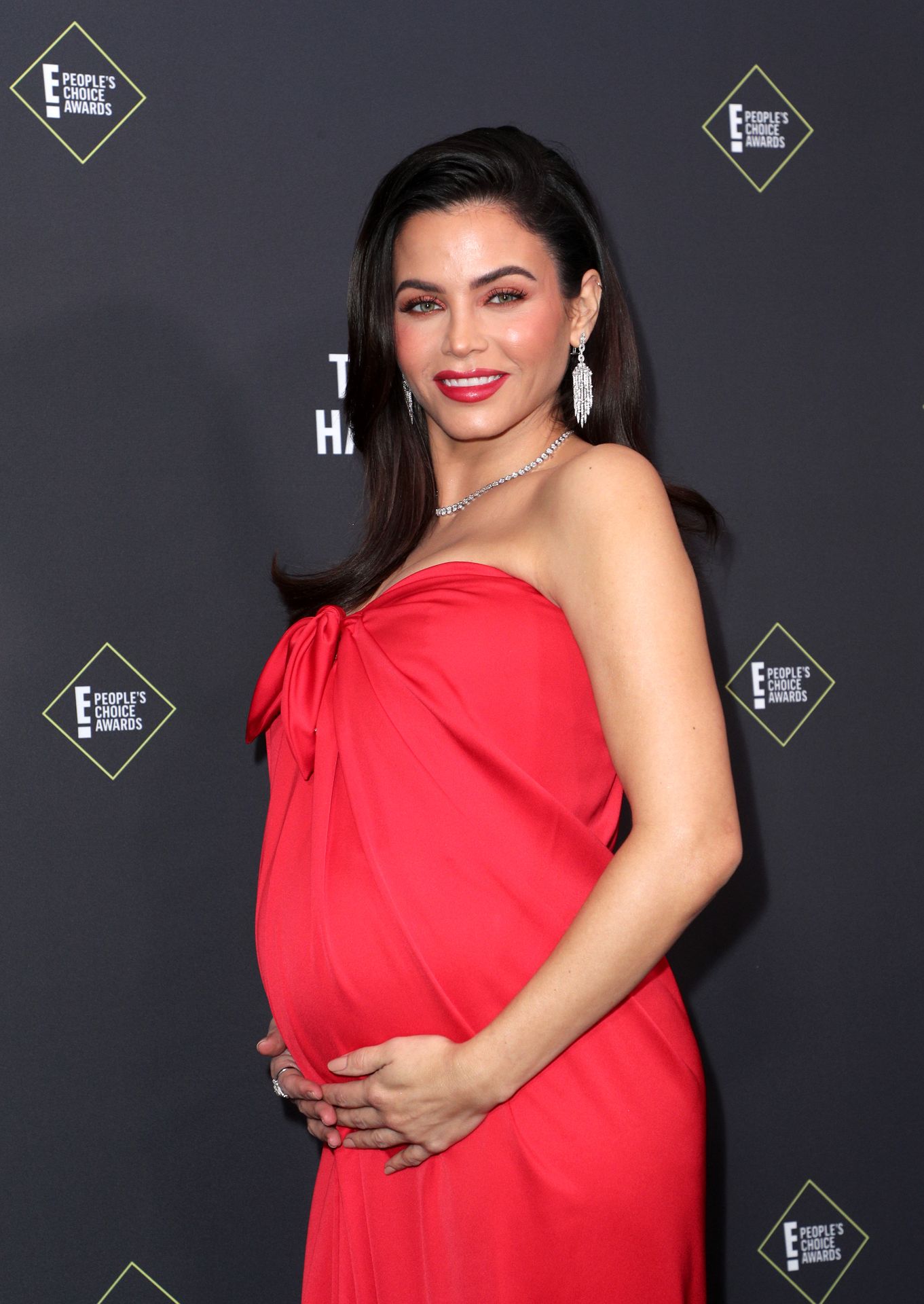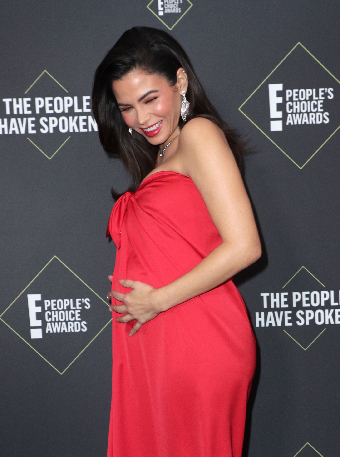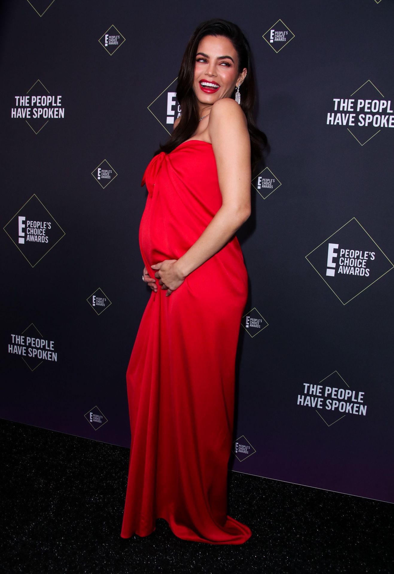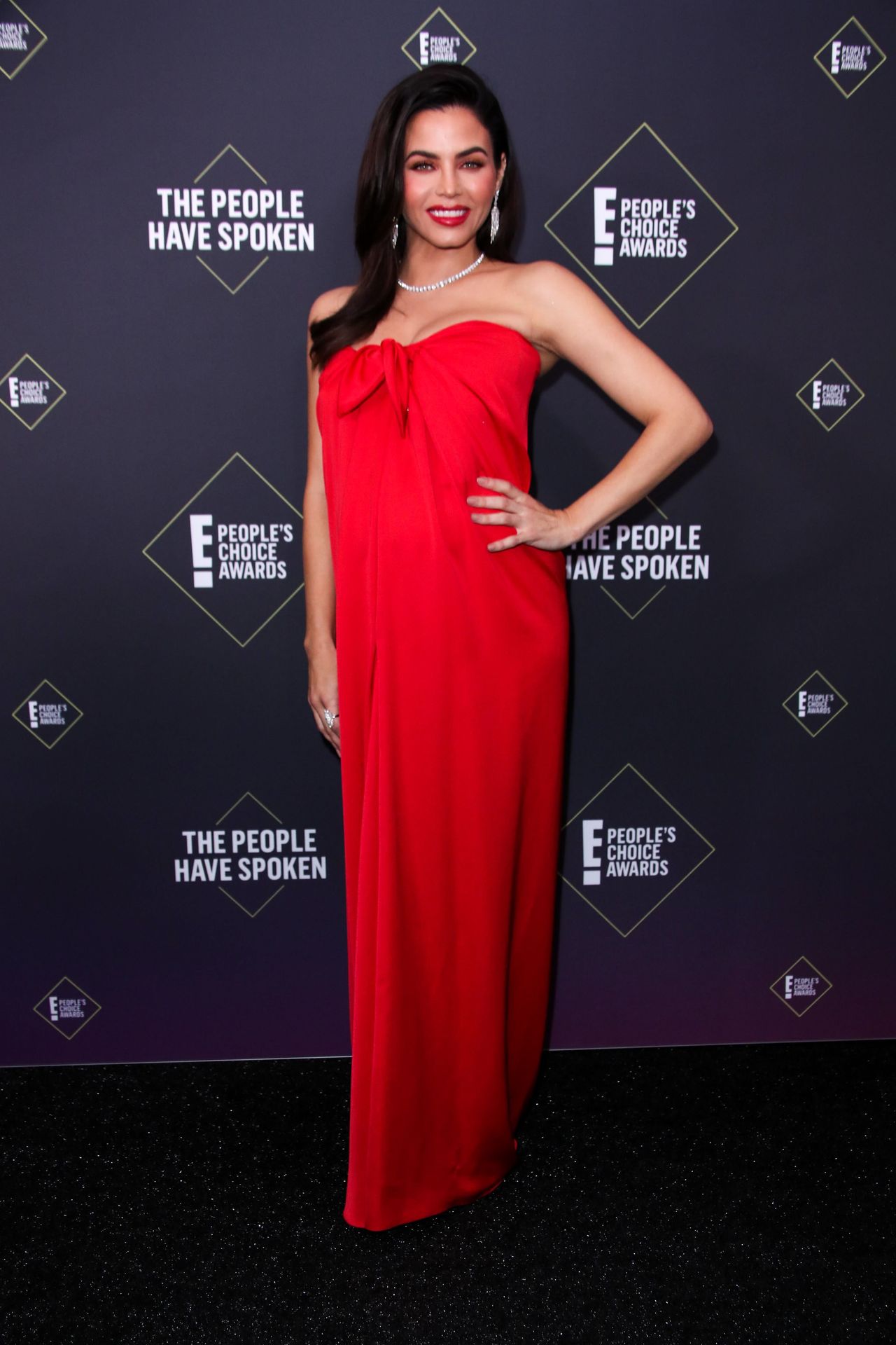 Pregnant Jenna Dewan poses in a red dress in the press room during the 2019 E! People’s Choice Awards at Barker Hangar in Santa Monica, 11/10/2019.