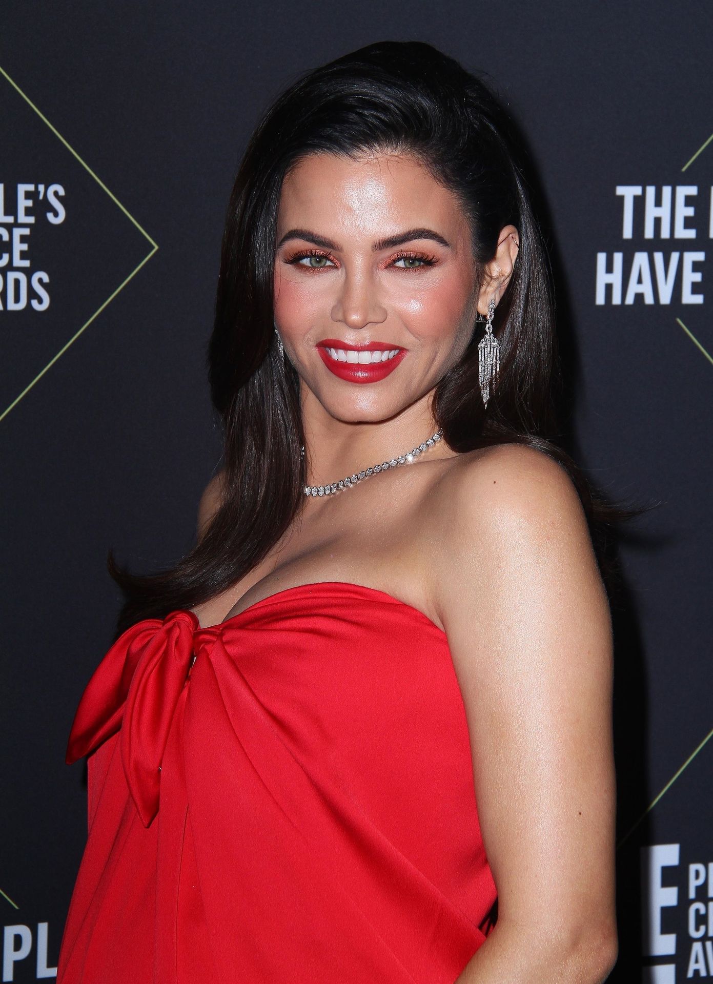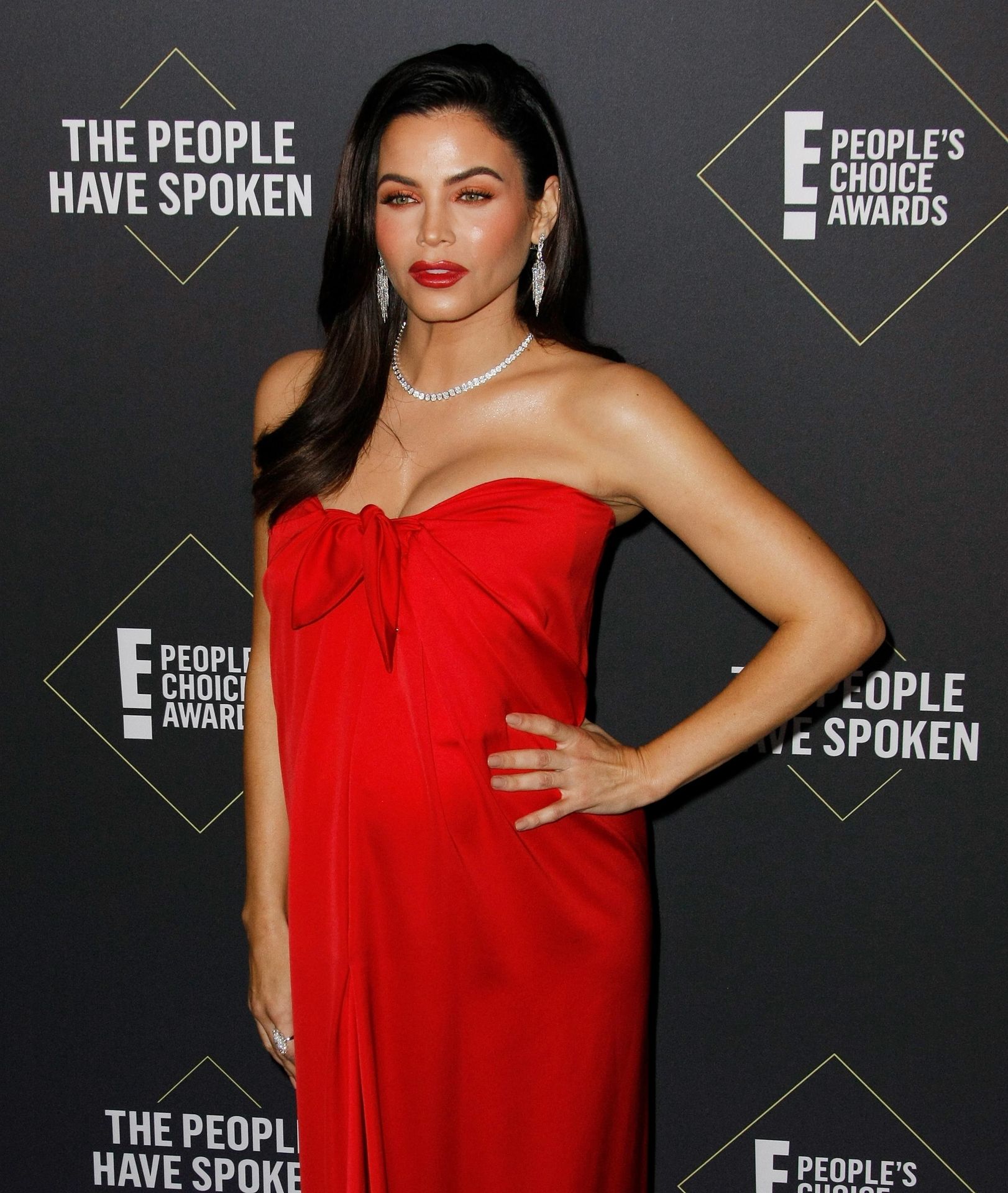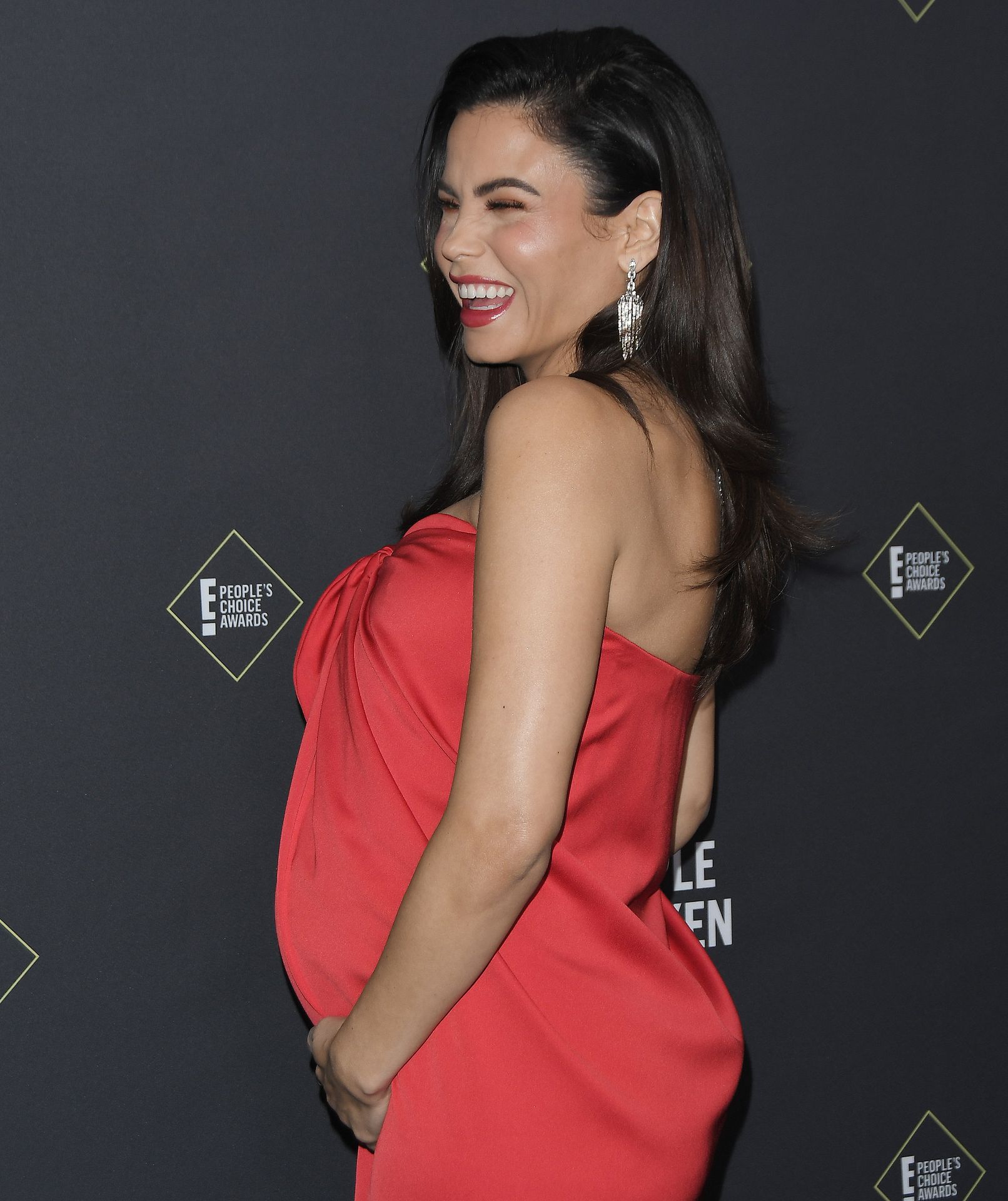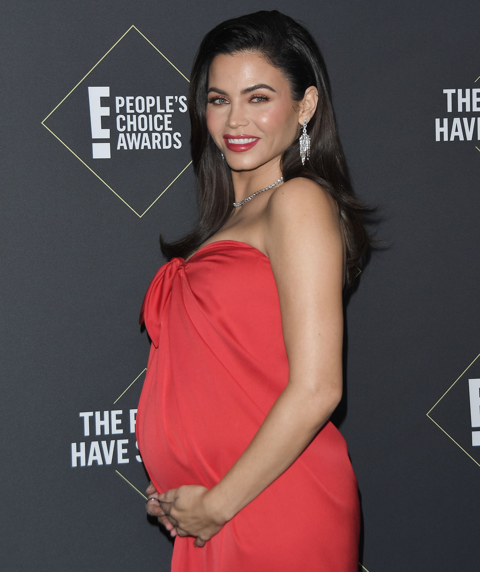Pregnant Jenna Dewan poses in a red dress in the press room during the 2019 E! People’s Choice Awards at Barker Hangar in Santa Monica, 11/10/2019.