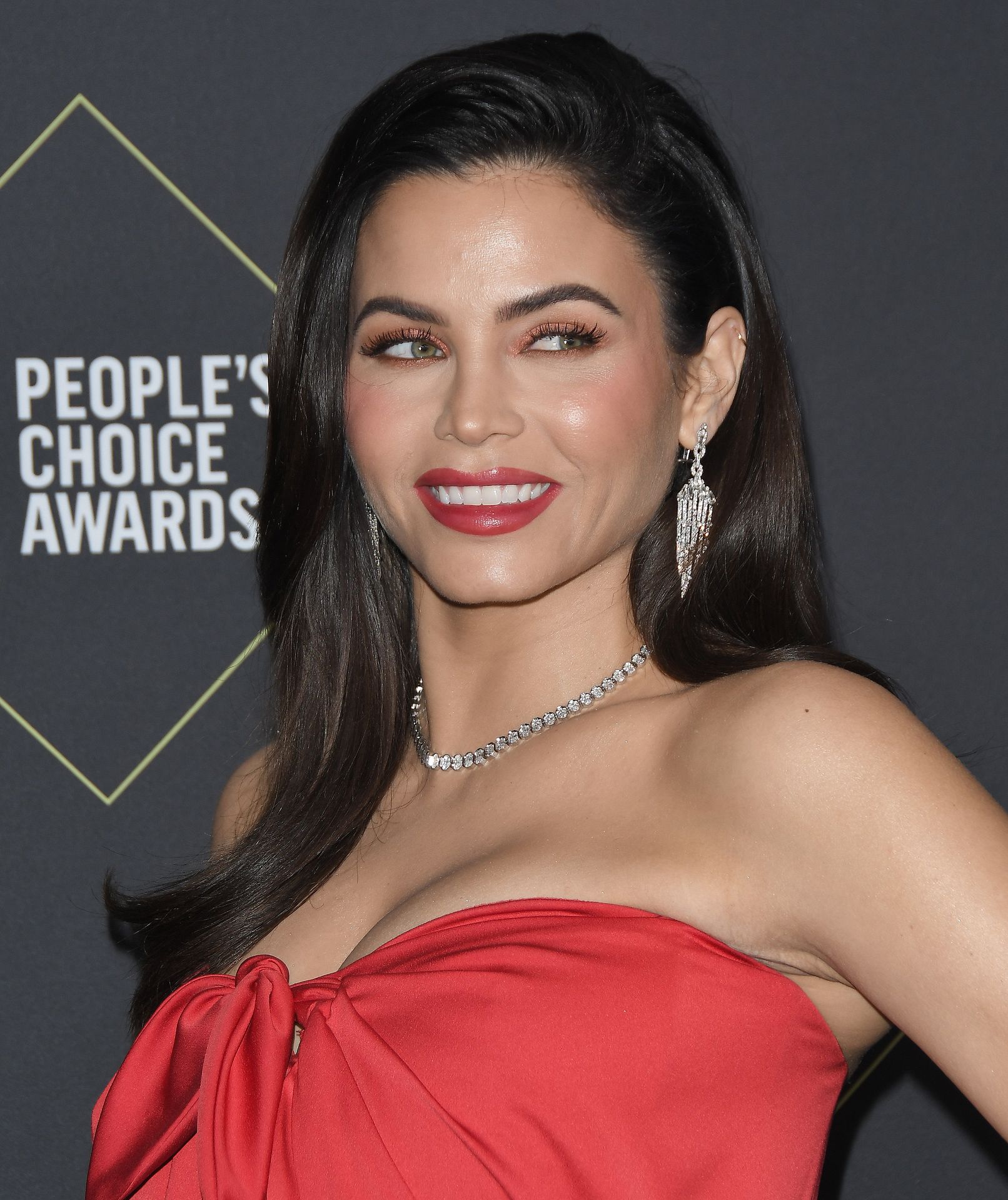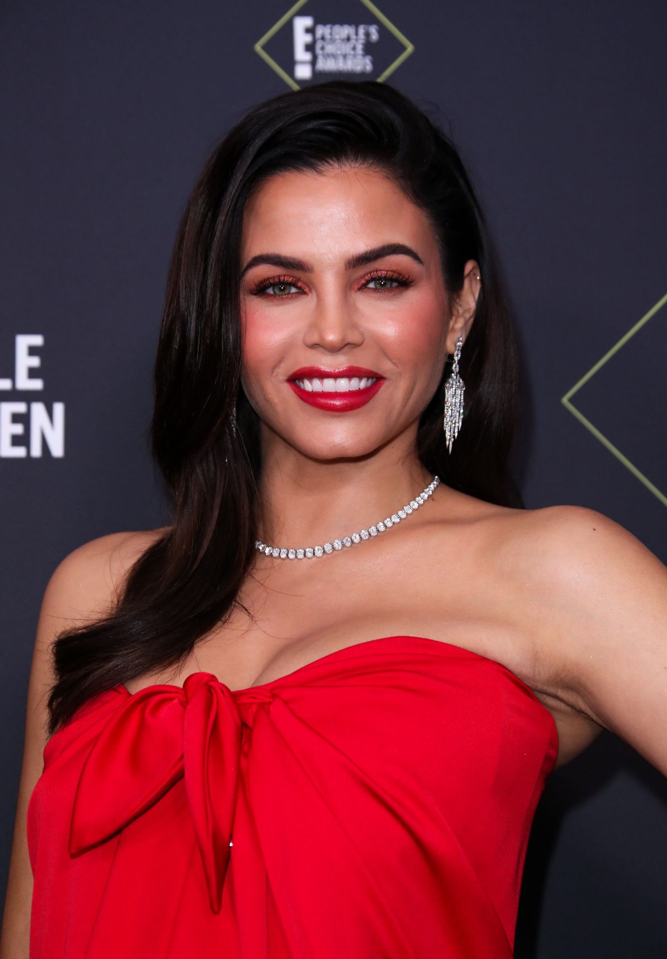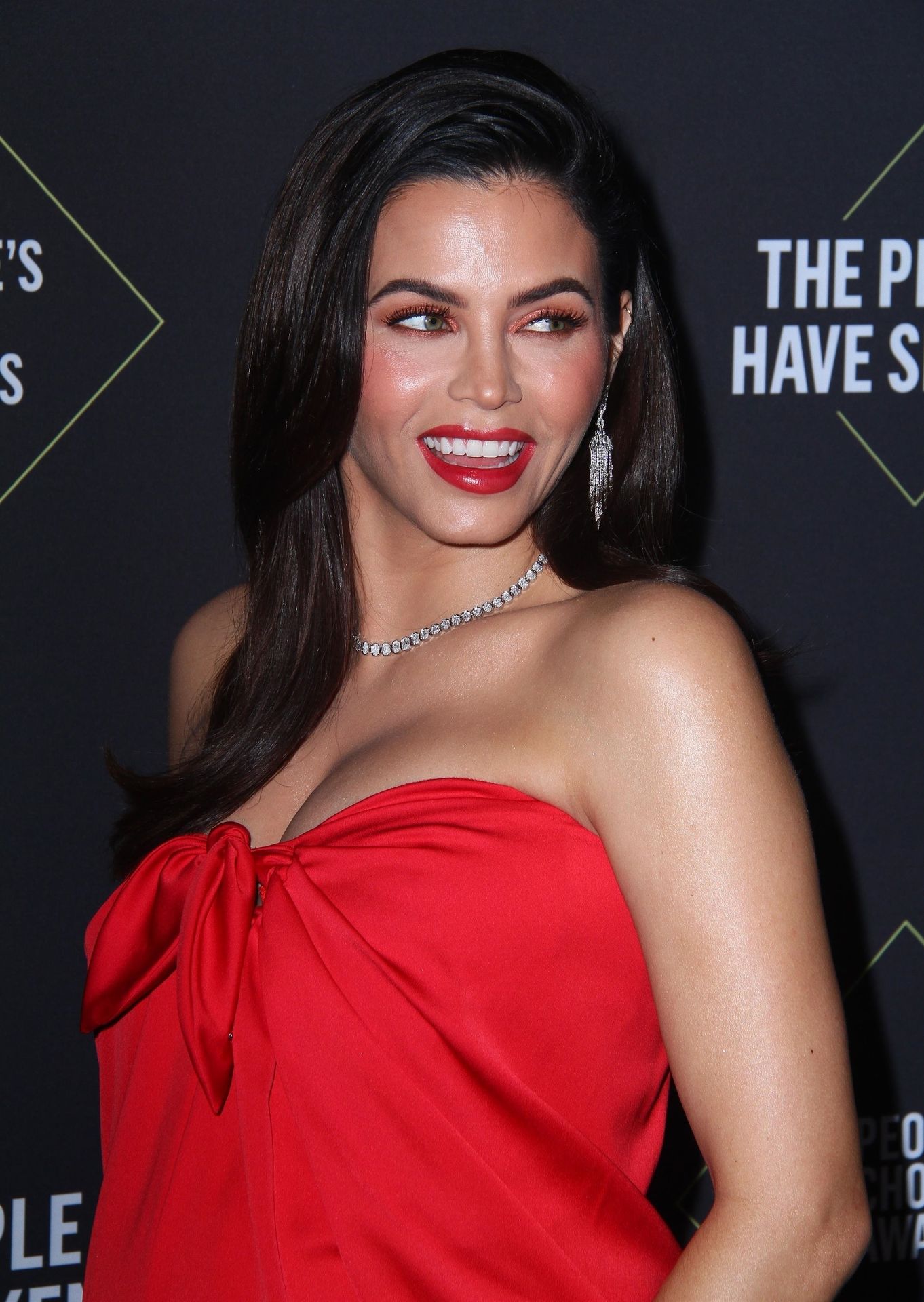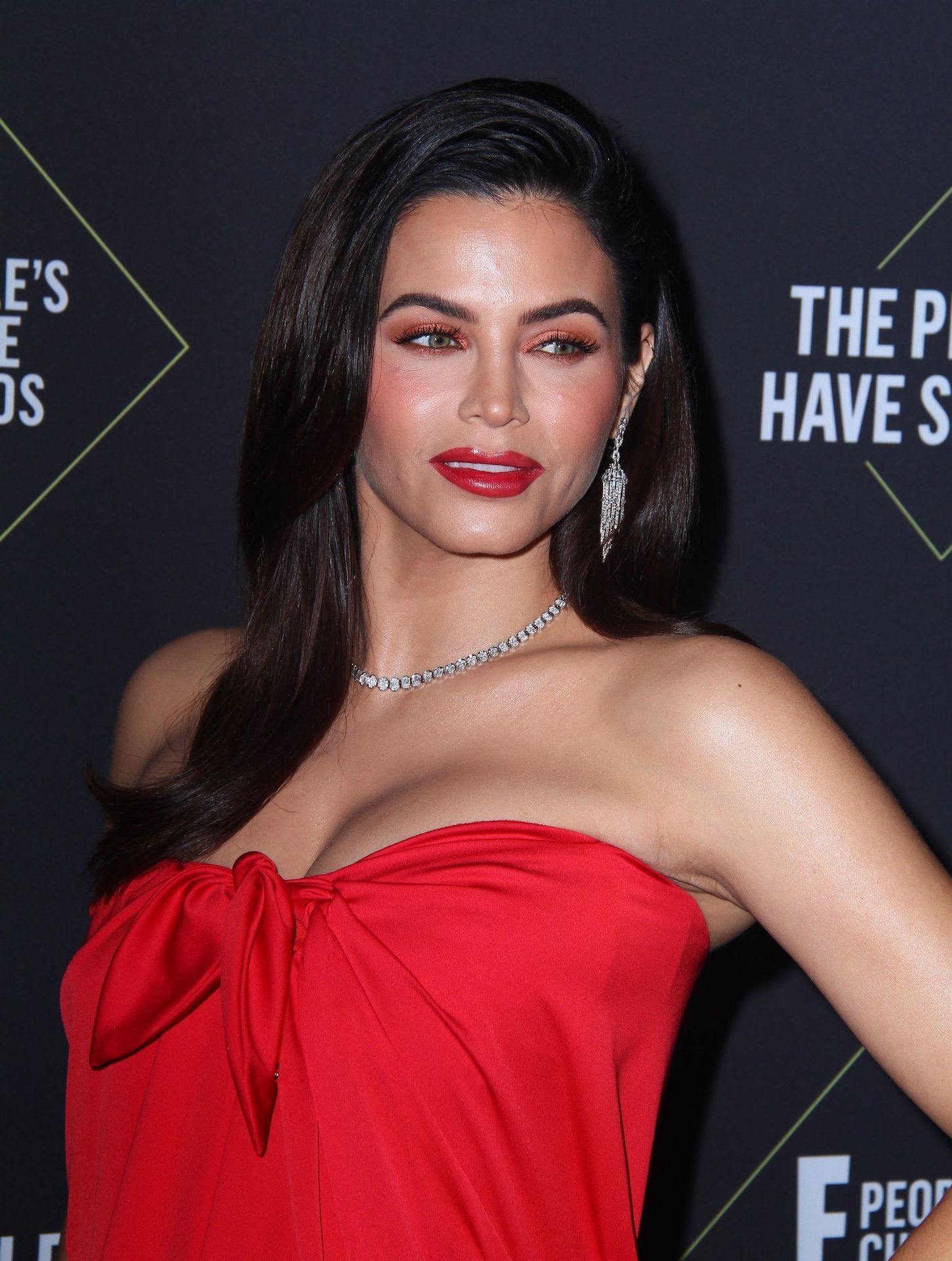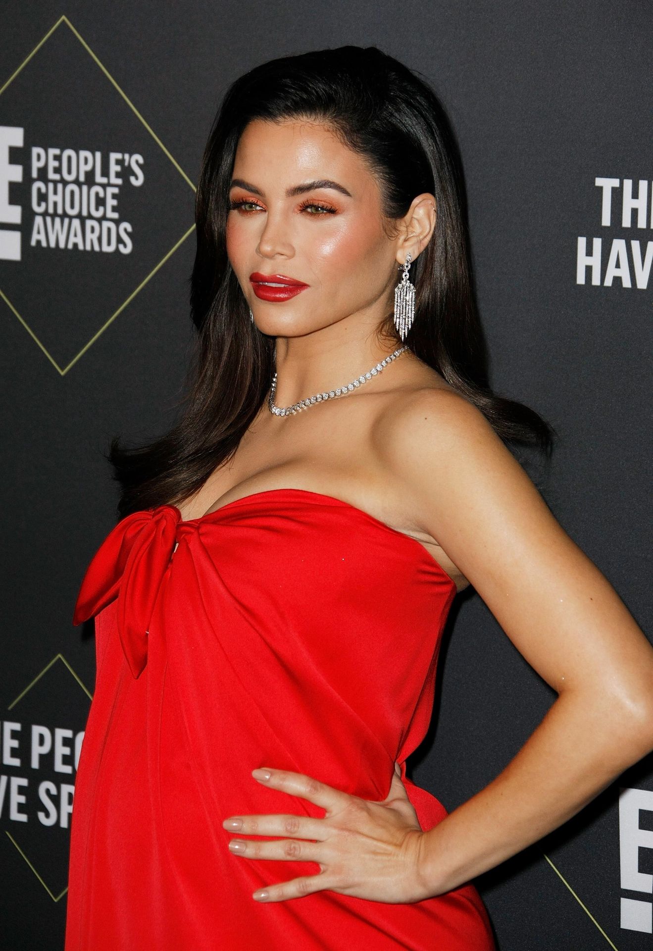 Pregnant Jenna Dewan poses in a red dress in the press room during the 2019 E! People’s Choice Awards at Barker Hangar in Santa Monica, 11/10/2019.