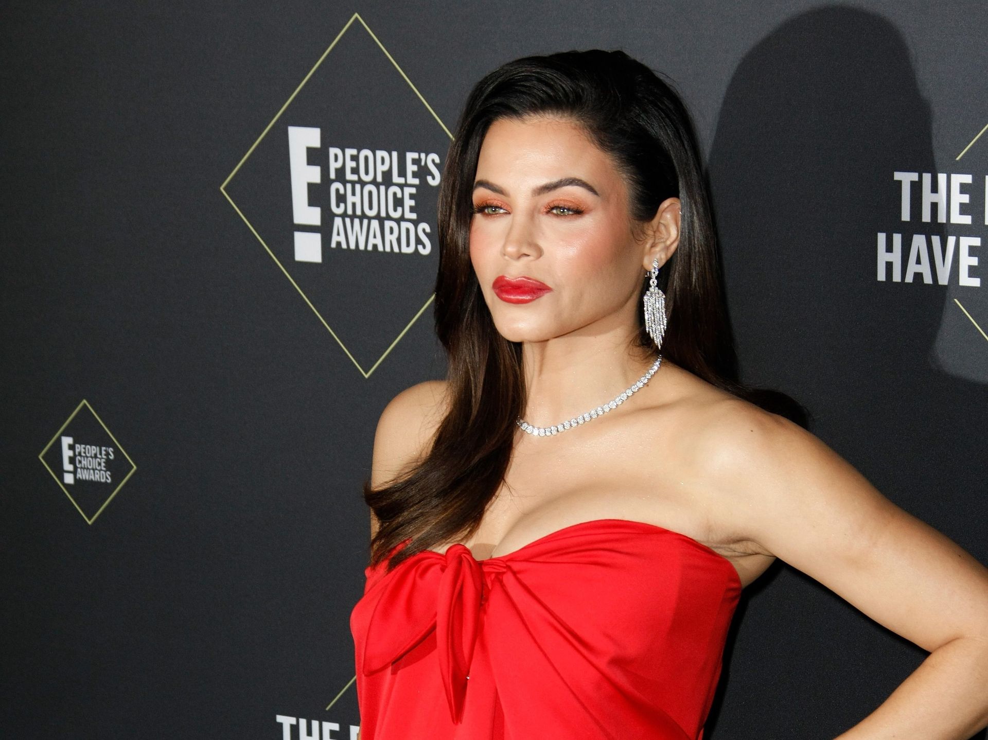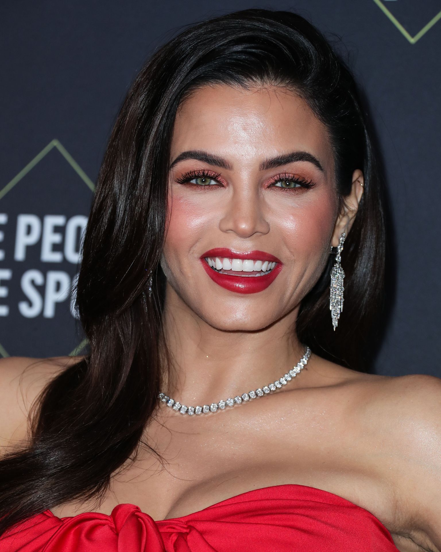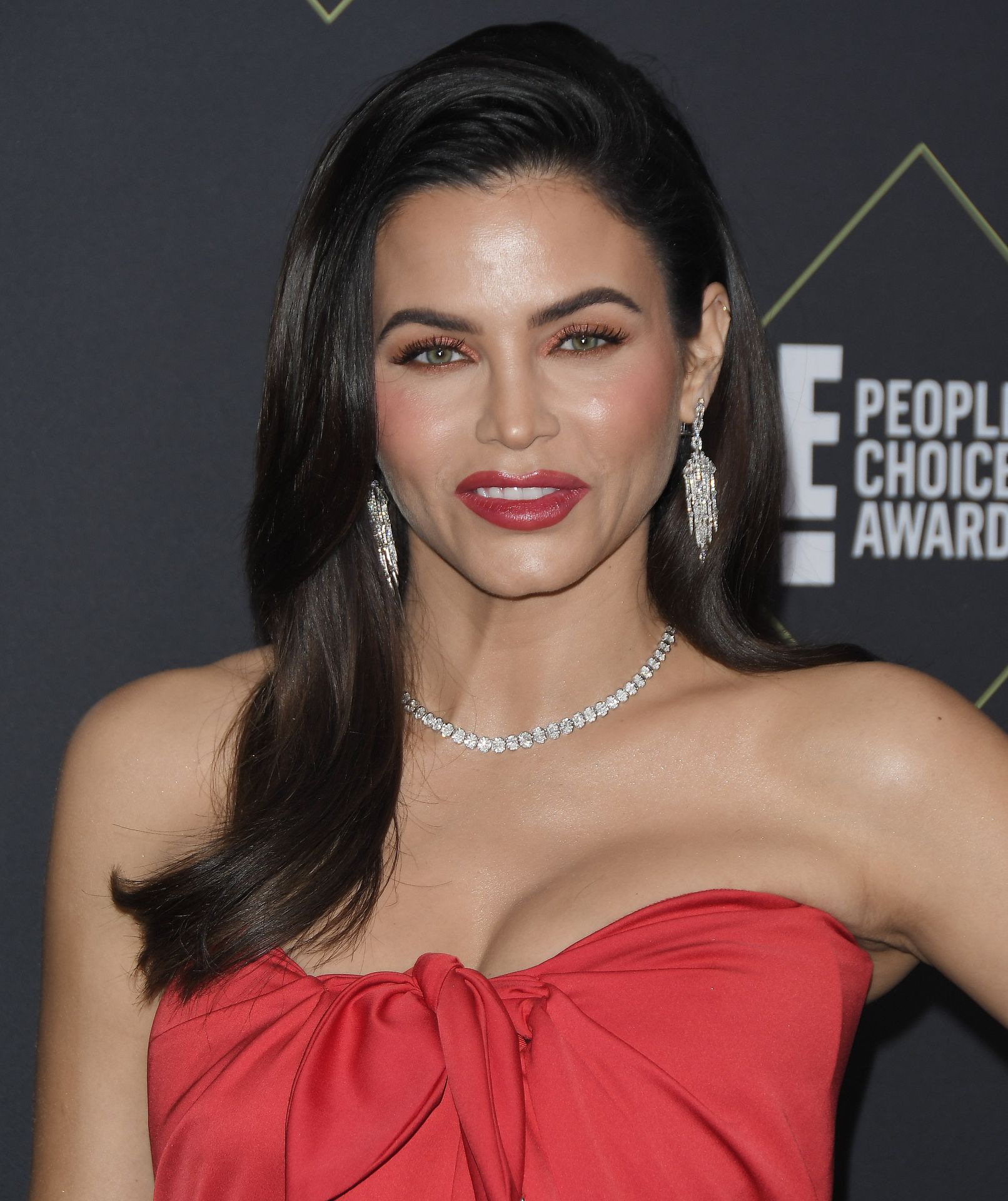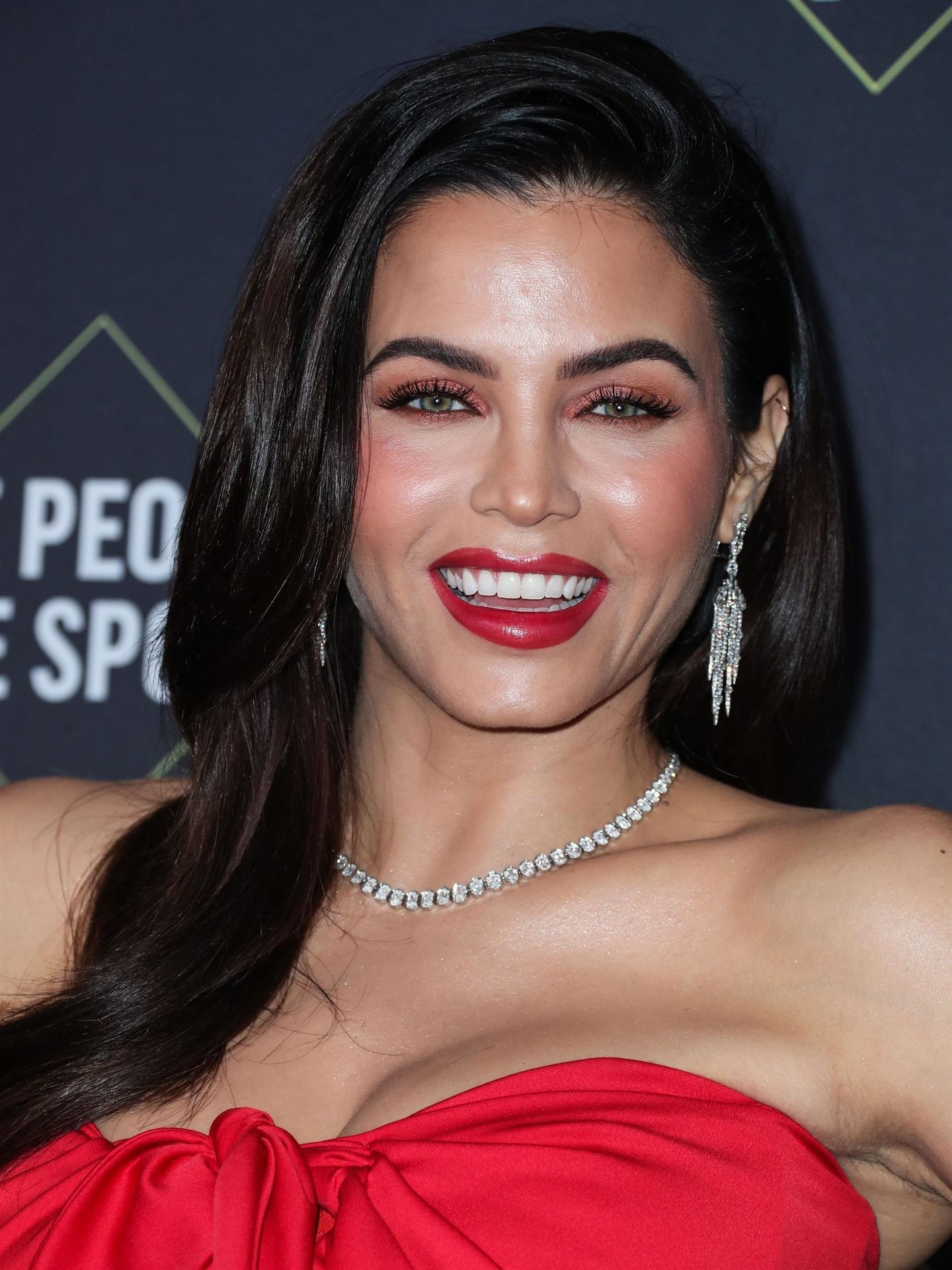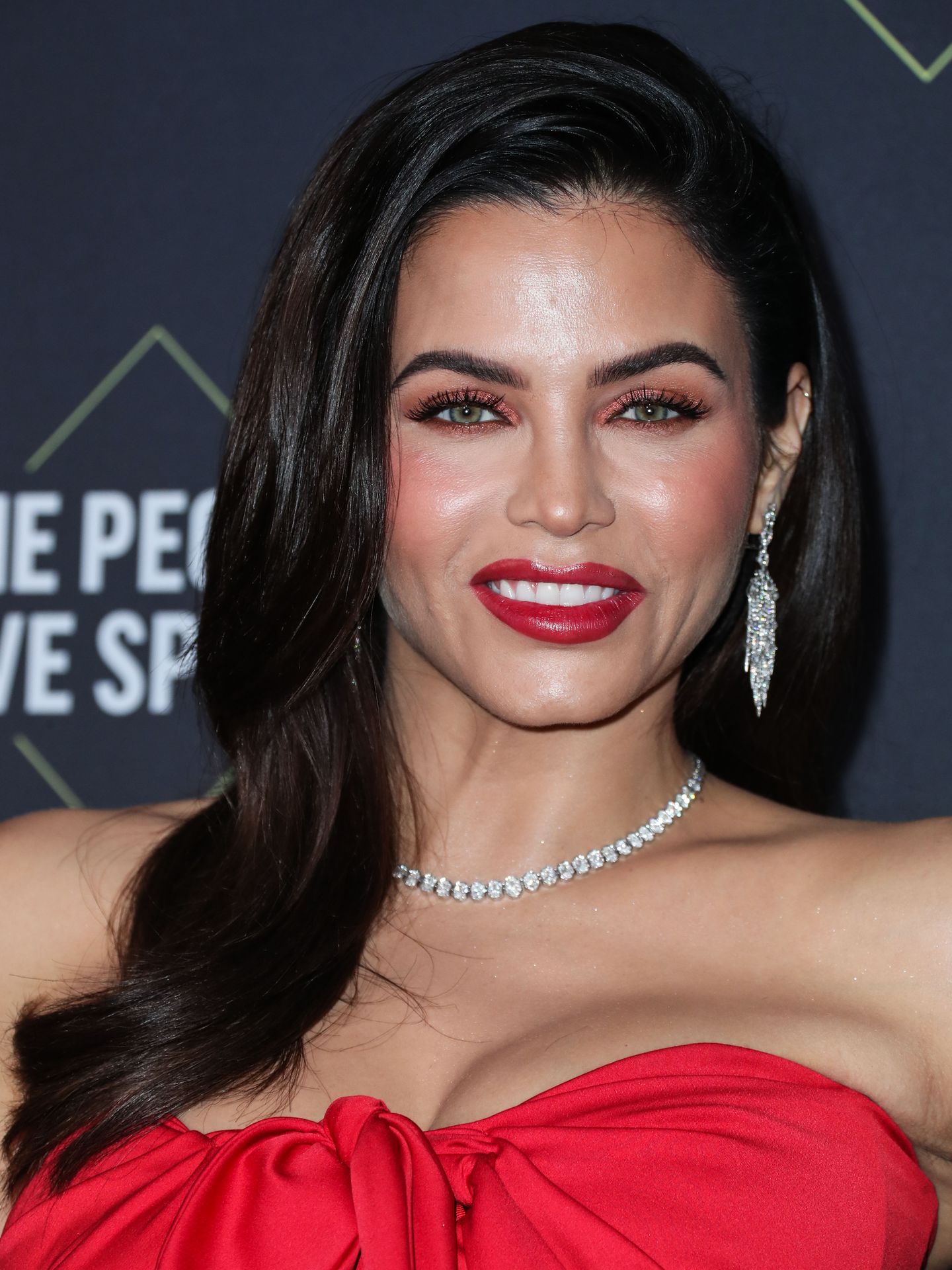Pregnant Jenna Dewan poses in a red dress in the press room during the 2019 E! People’s Choice Awards at Barker Hangar in Santa Monica, 11/10/2019.