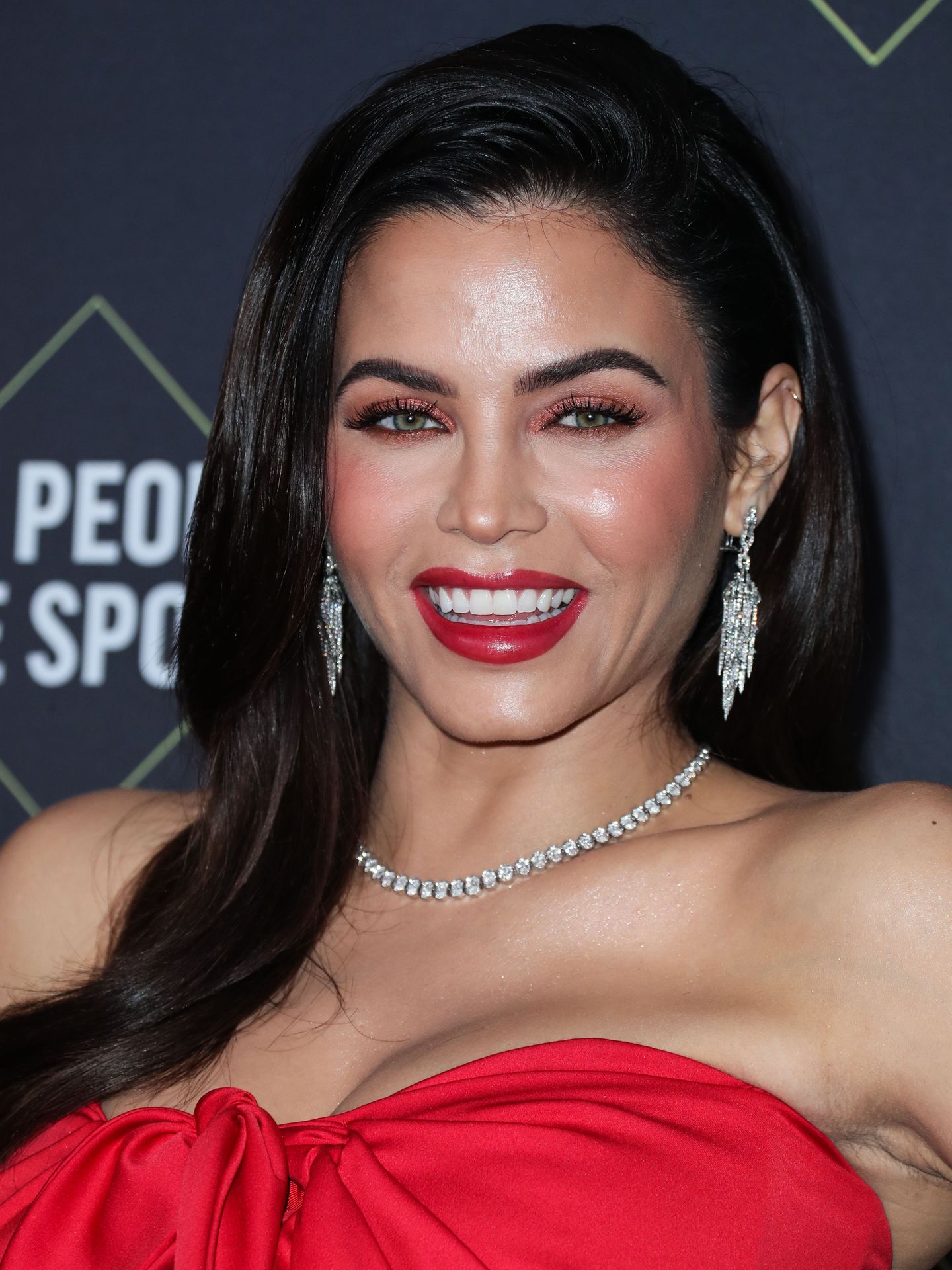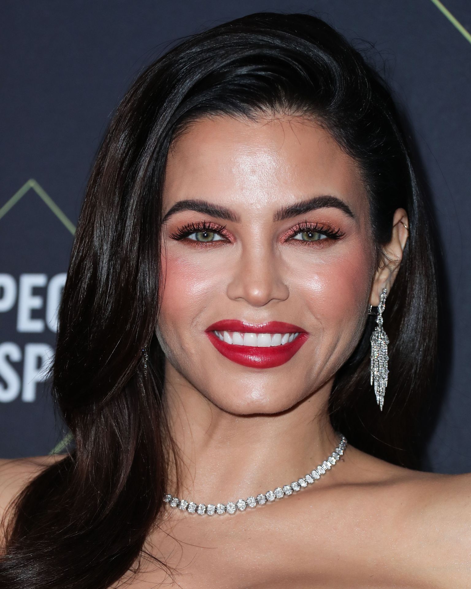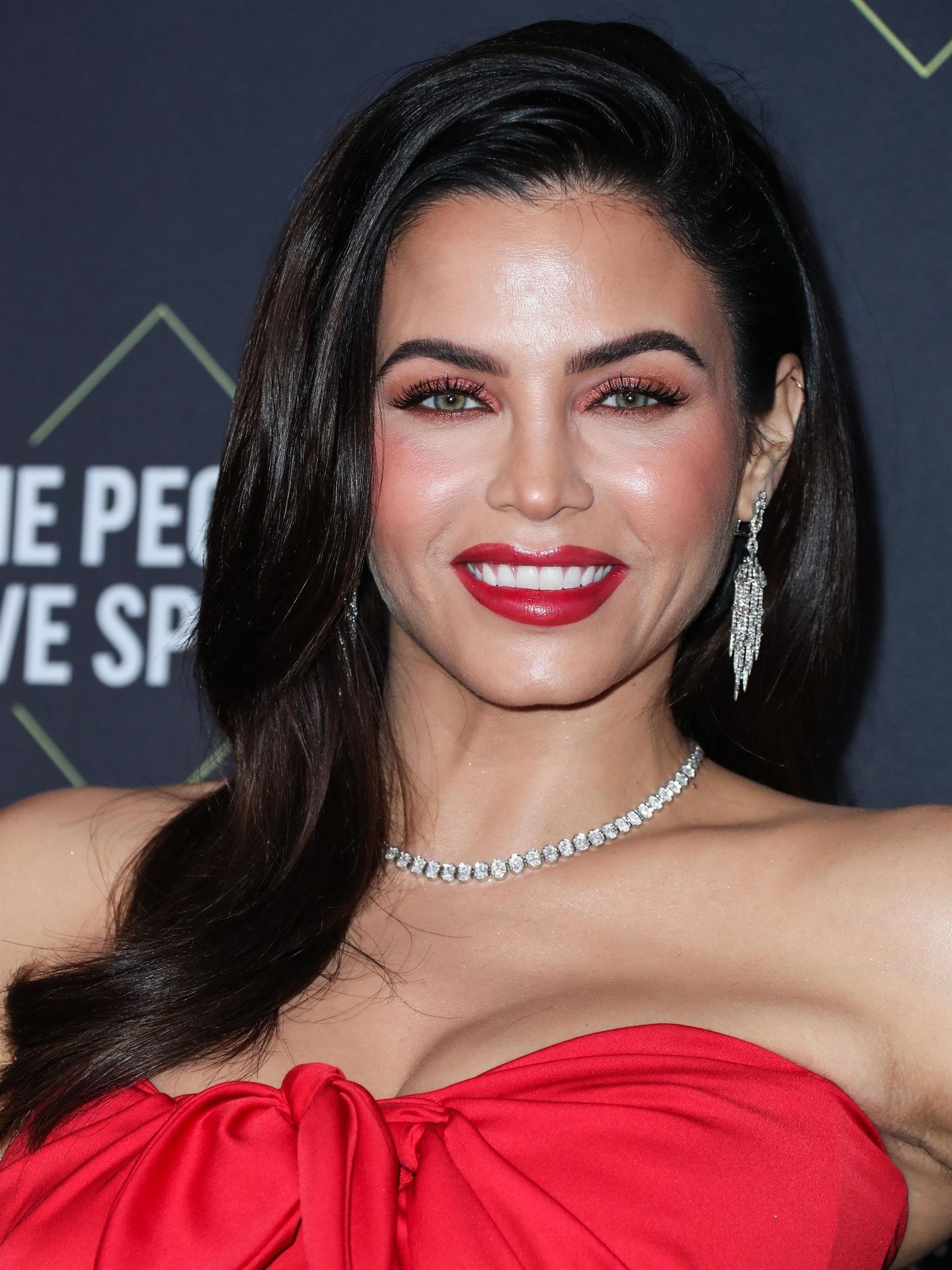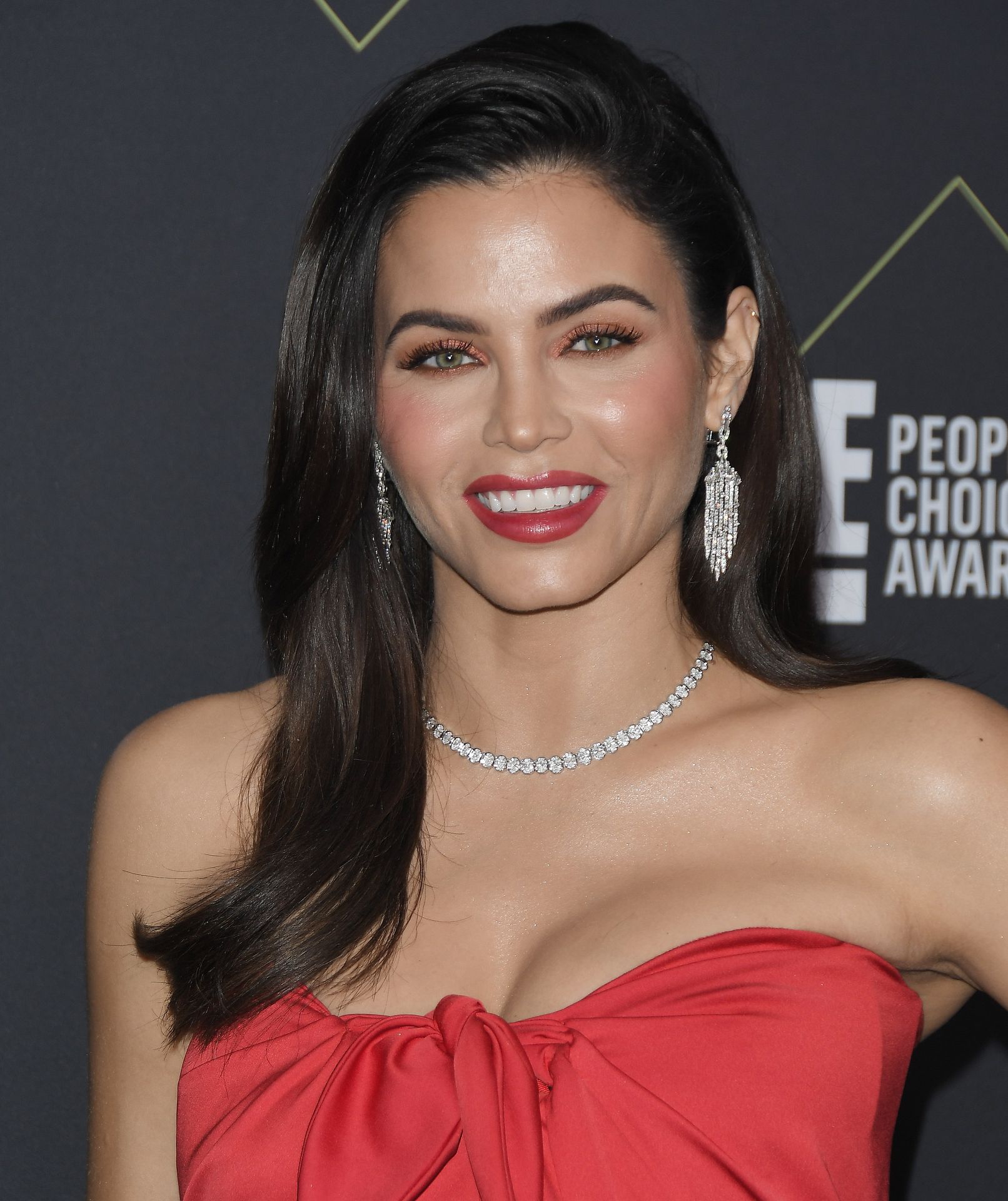 Pregnant Jenna Dewan poses in a red dress in the press room during the 2019 E! People’s Choice Awards at Barker Hangar in Santa Monica, 11/10/2019.