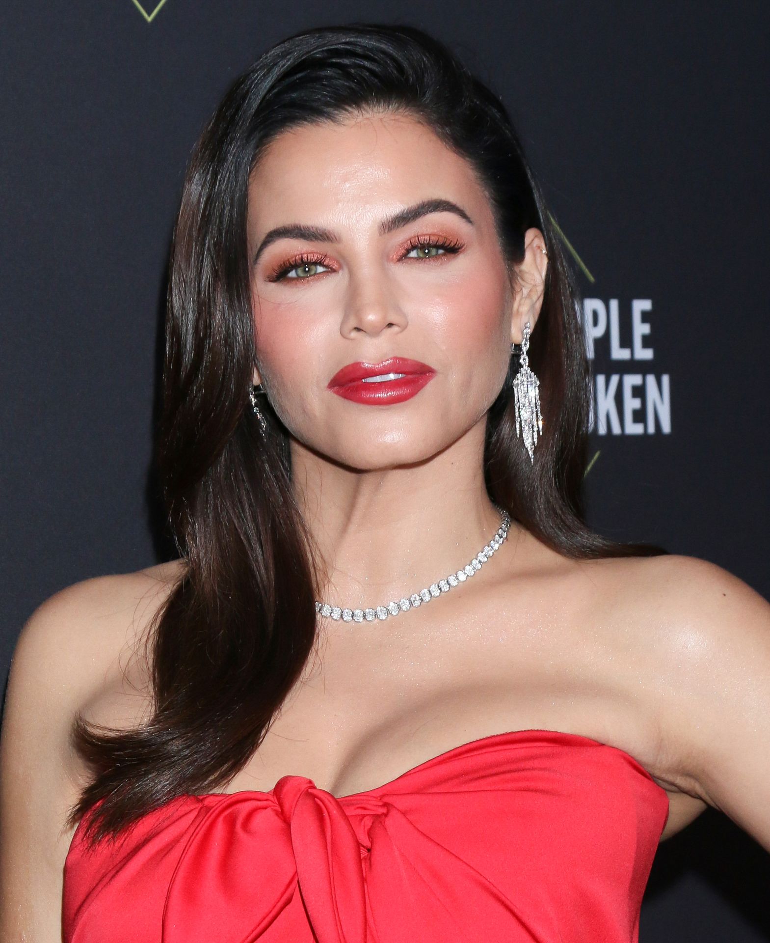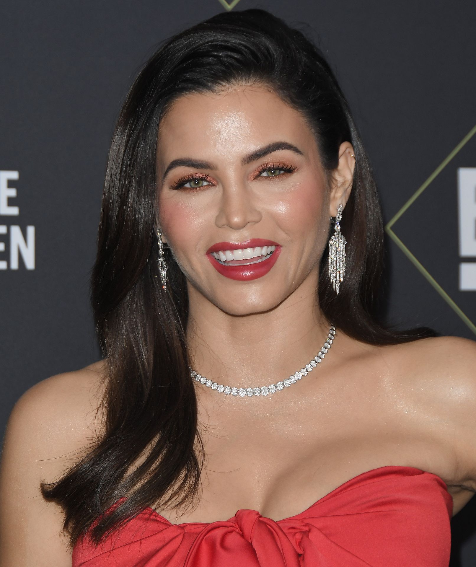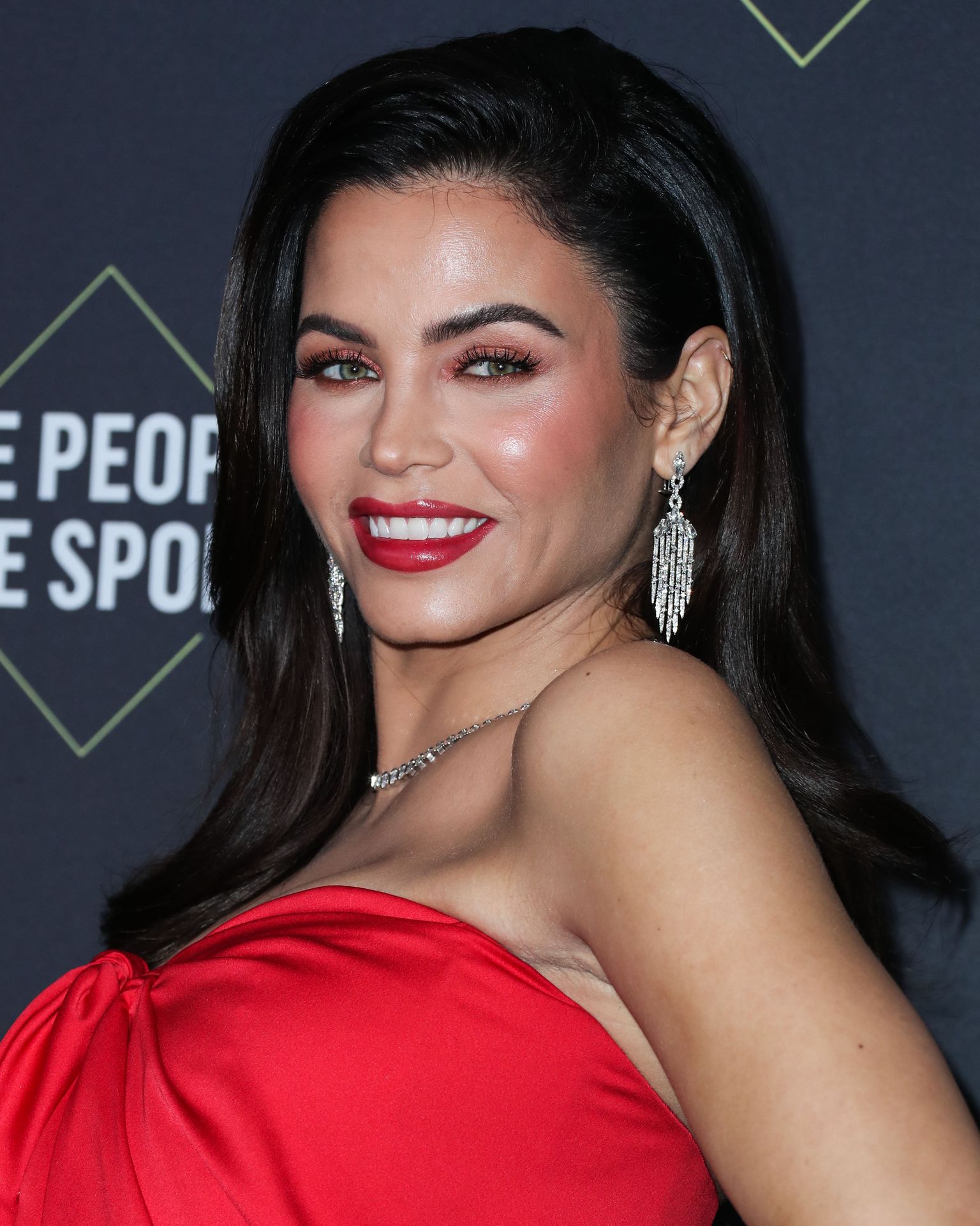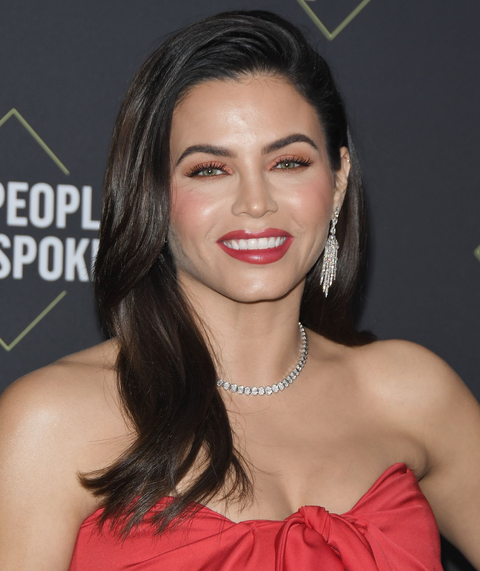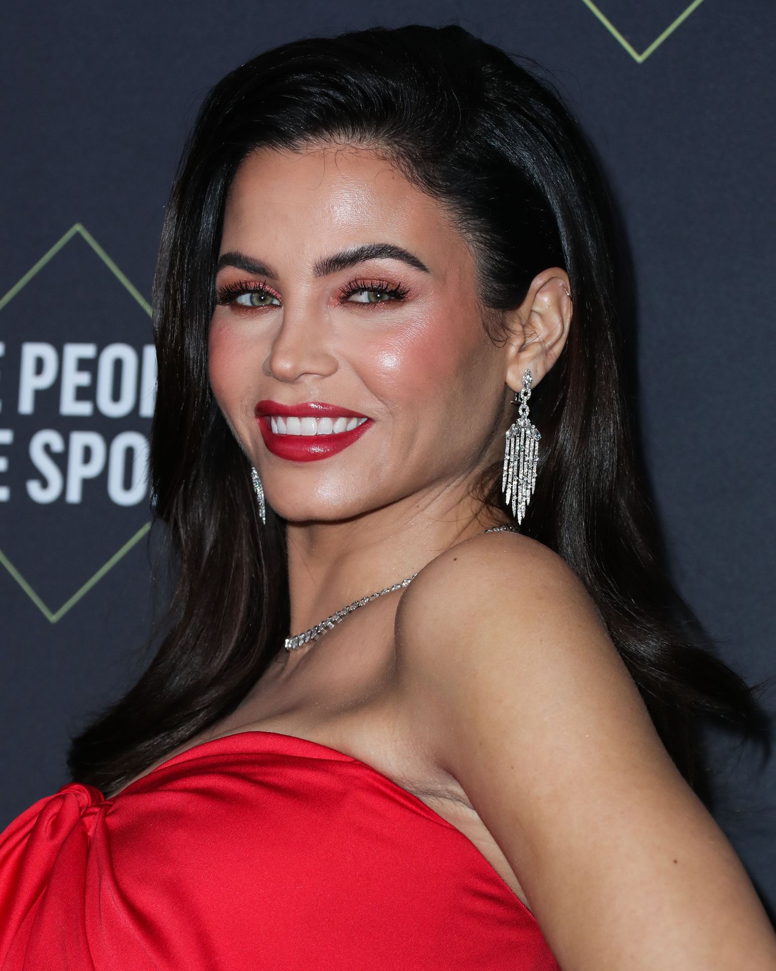 Pregnant Jenna Dewan poses in a red dress in the press room during the 2019 E! People’s Choice Awards at Barker Hangar in Santa Monica, 11/10/2019.