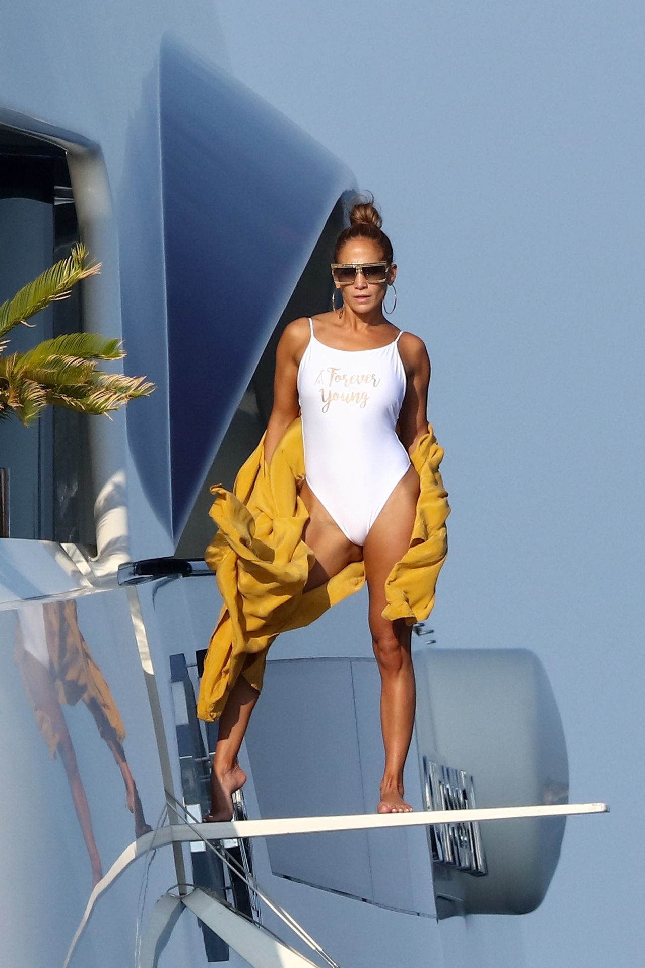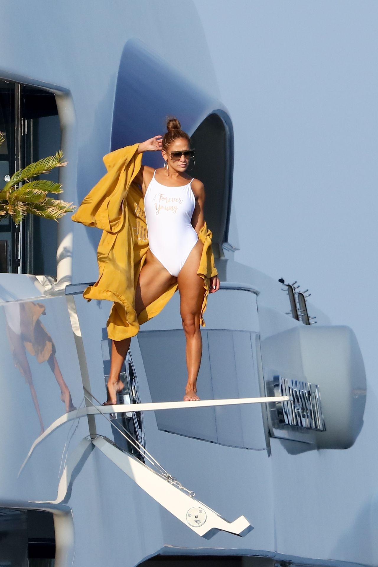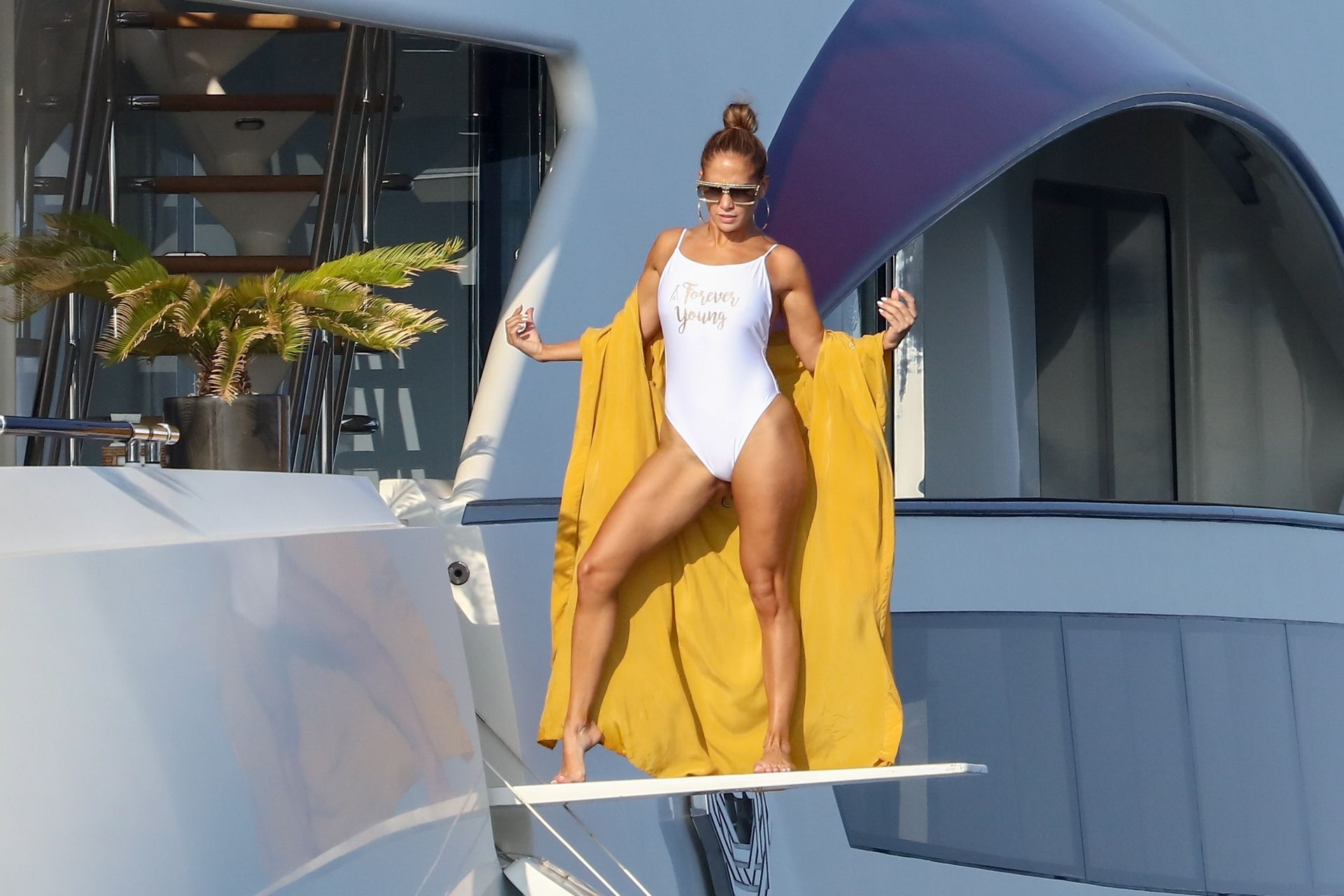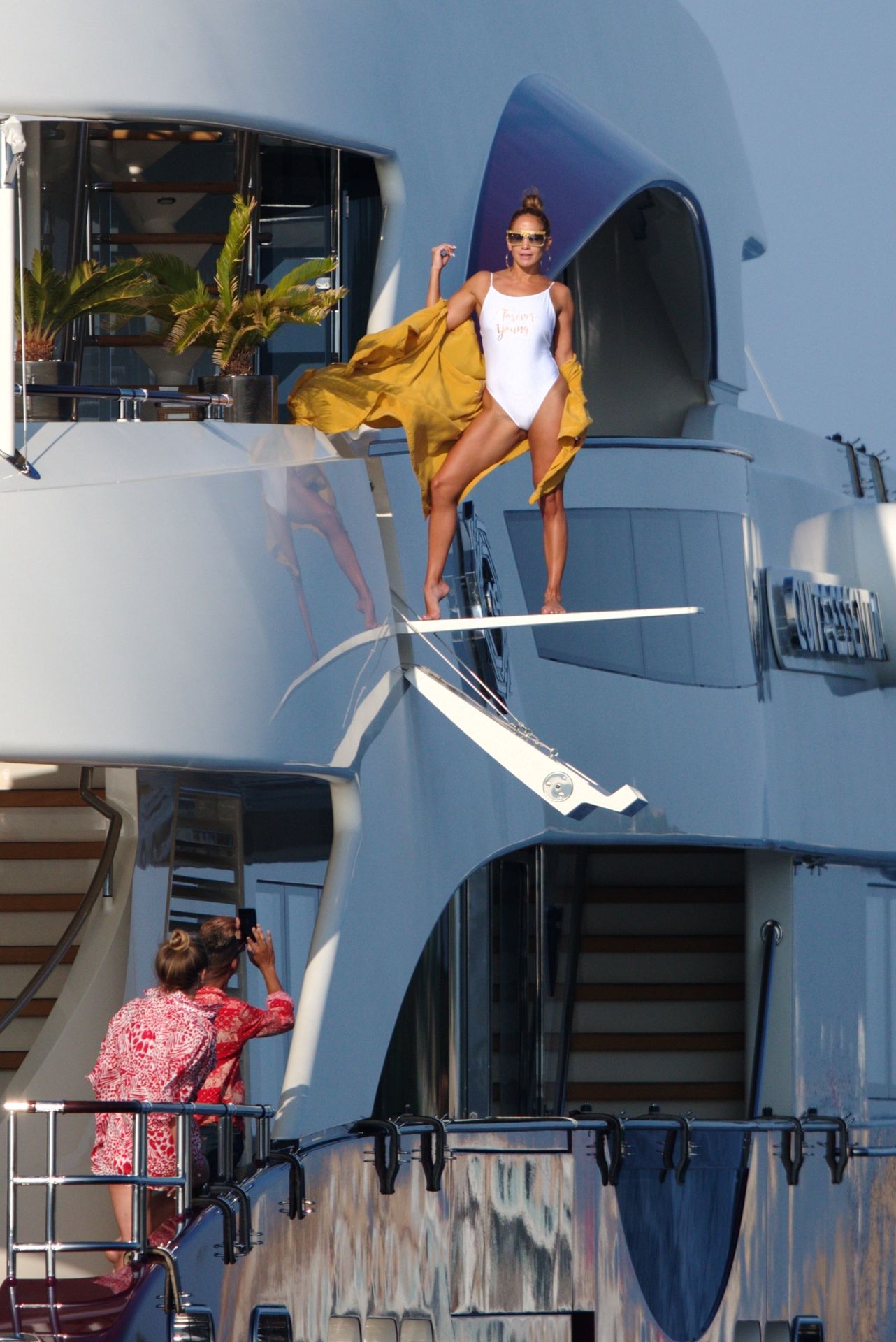 Jennifer Lopez poses for a photo shoot overhead on a diving board on the deck of her yacht off St. Tropez, 09/03/2019.