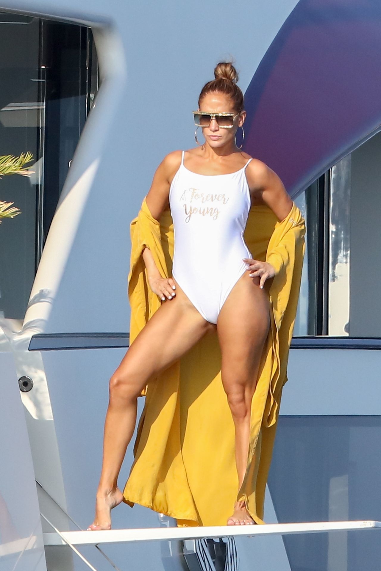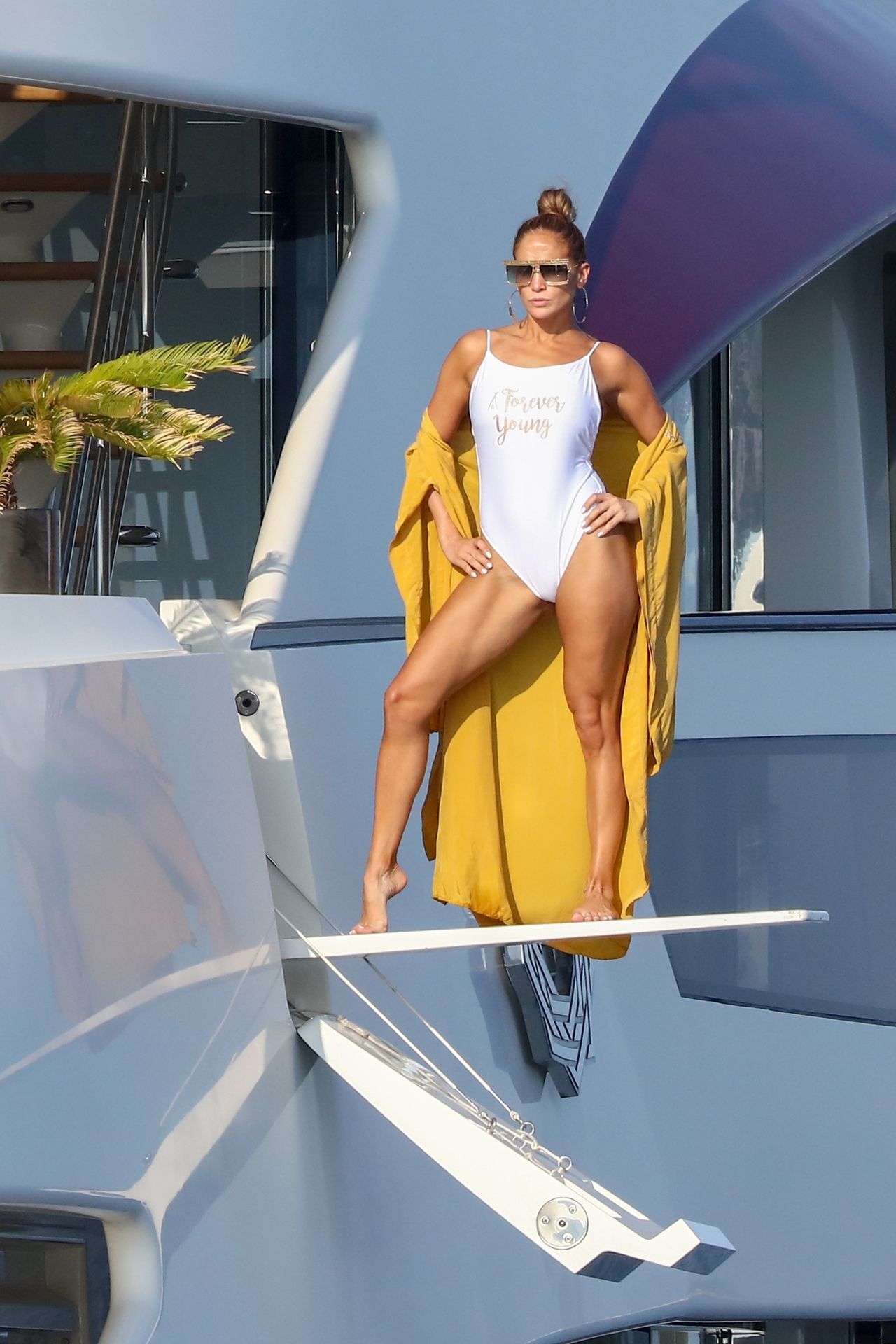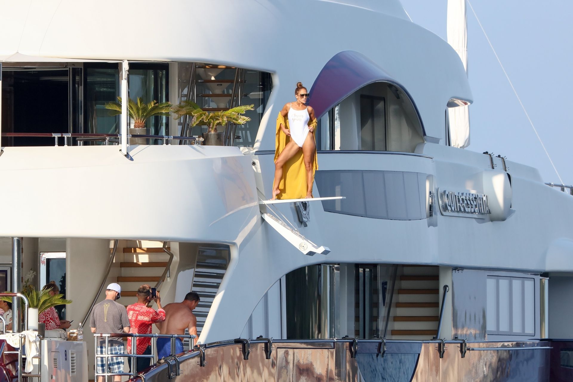 Jennifer Lopez poses for a photo shoot overhead on a diving board on the deck of her yacht off St. Tropez, 09/03/2019.