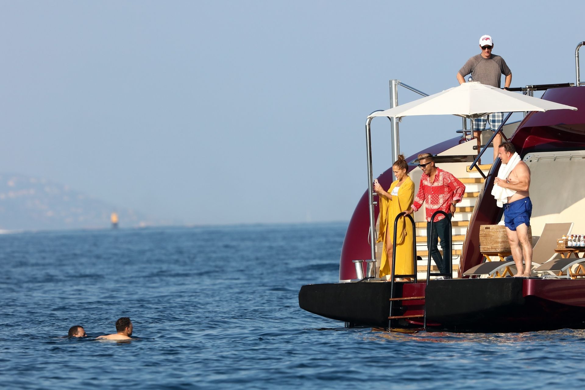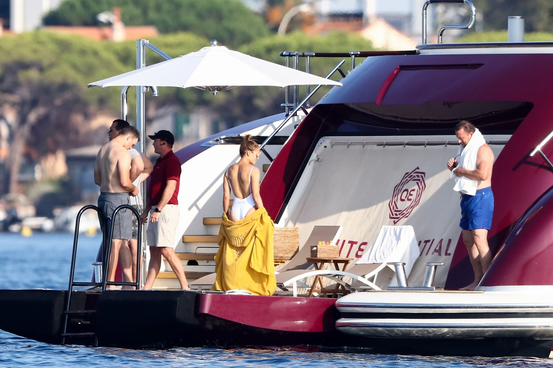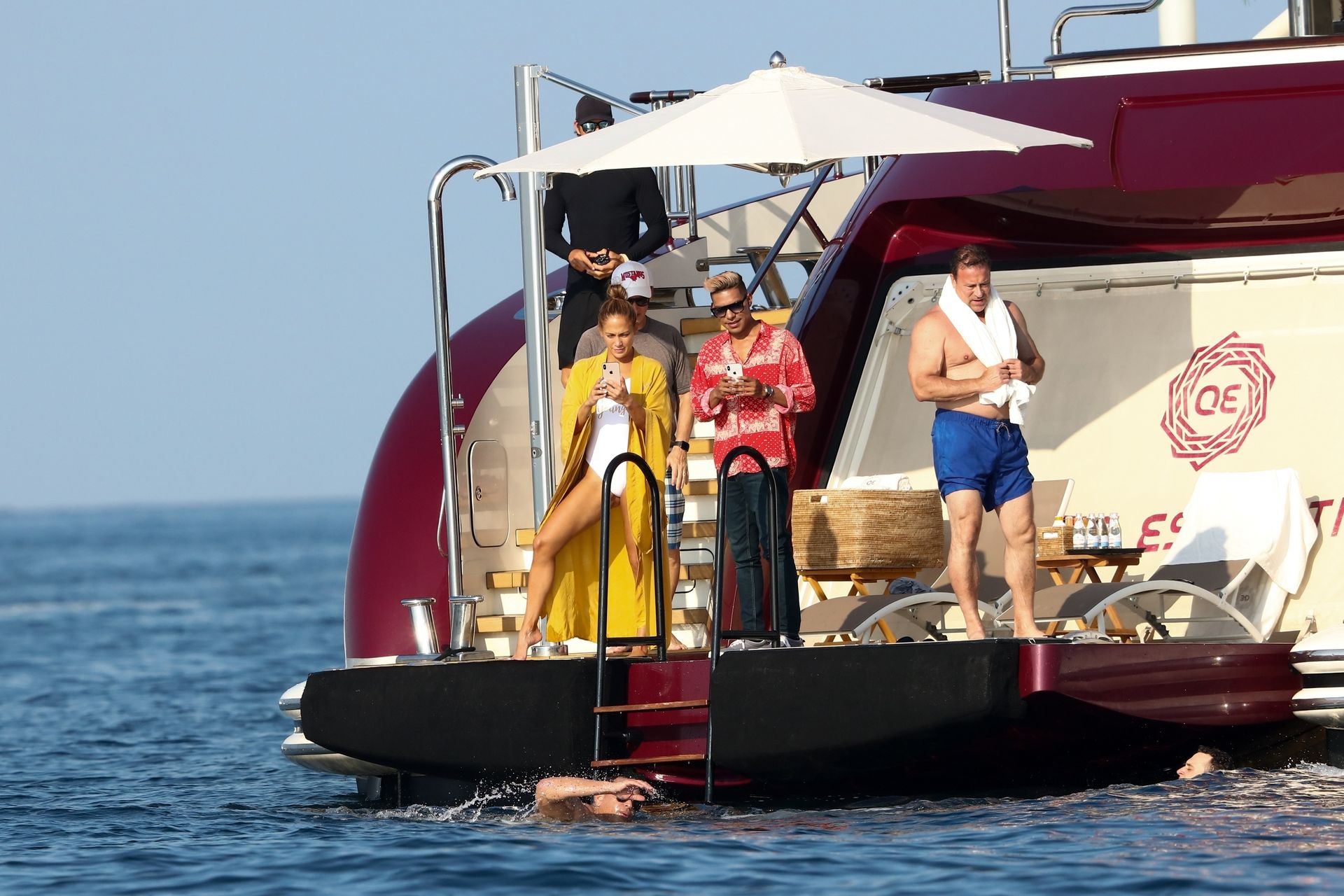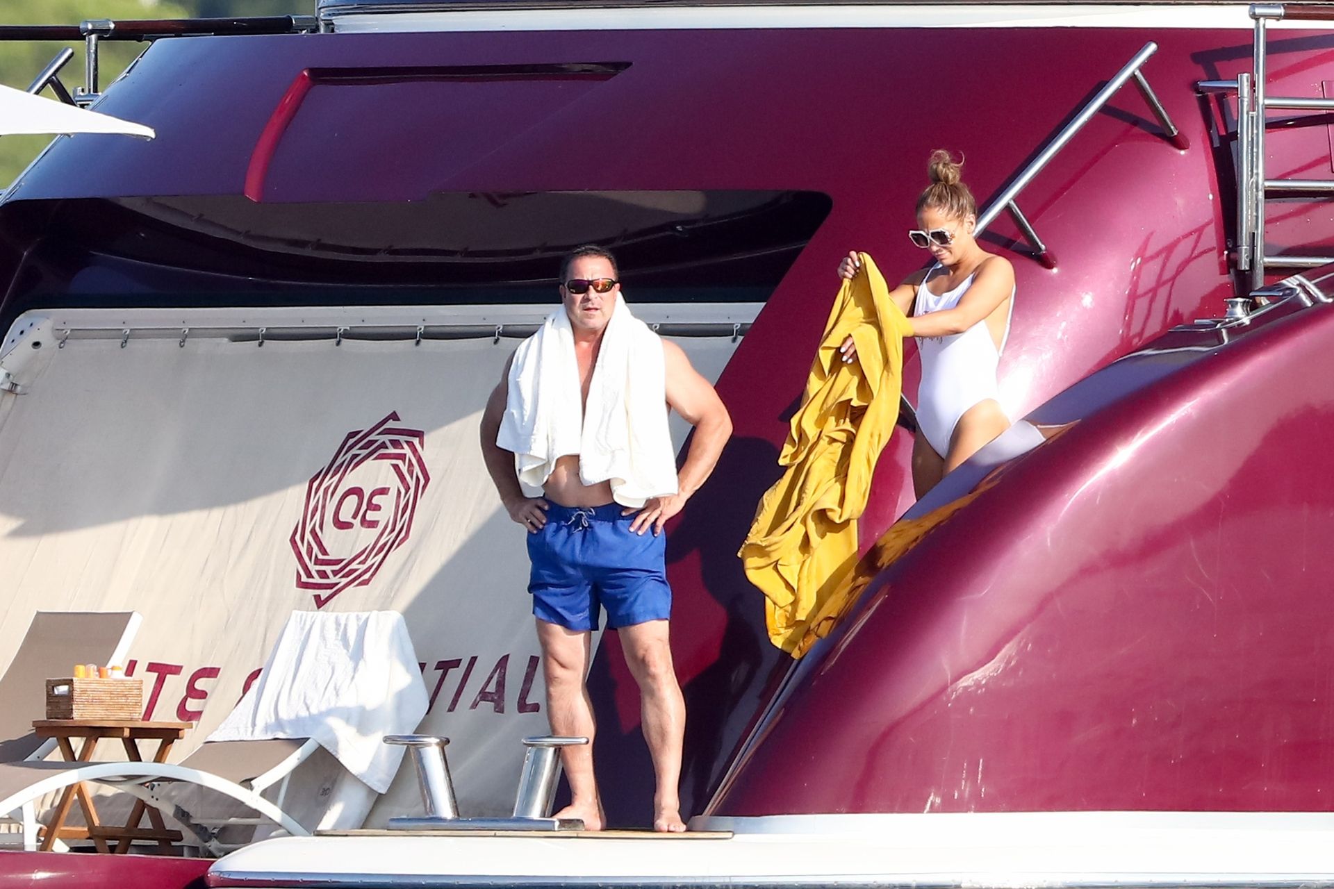 Jennifer Lopez poses for a photo shoot overhead on a diving board on the deck of her yacht off St. Tropez, 09/03/2019.