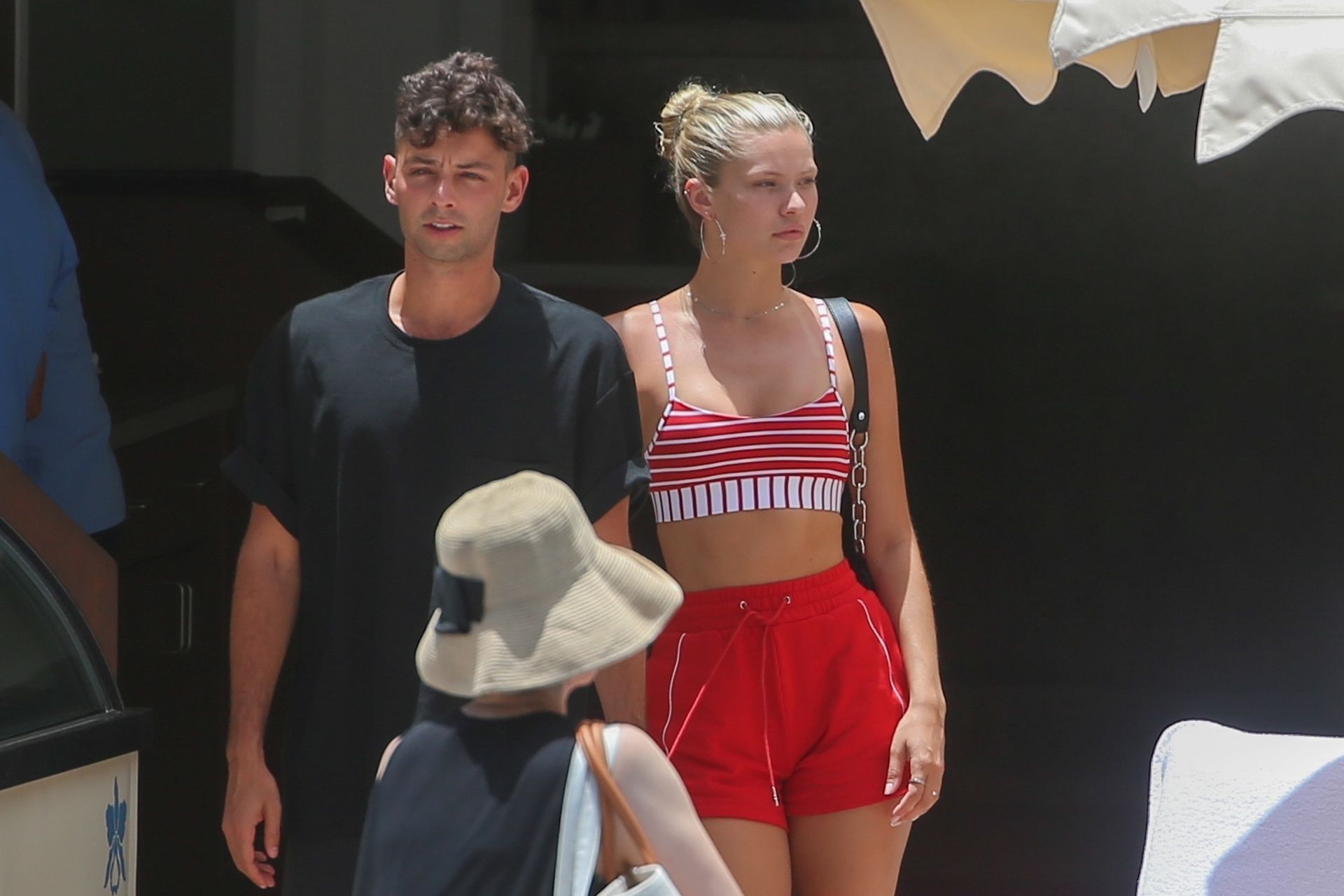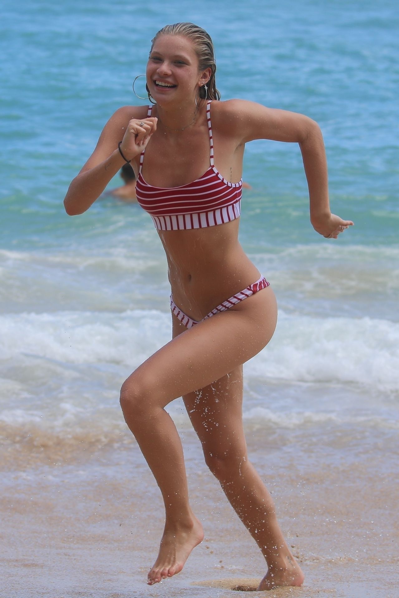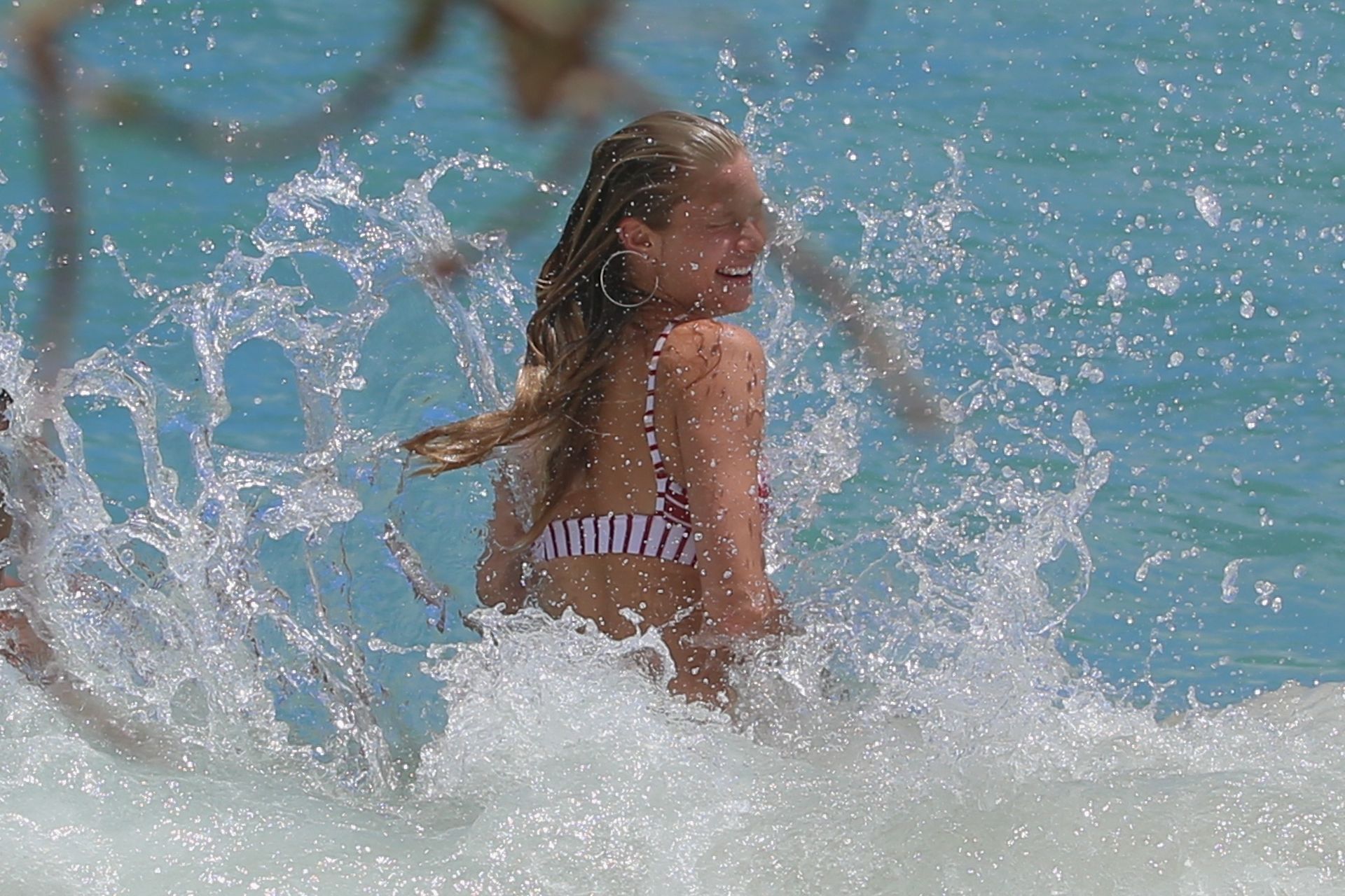 Model Josie Canseco scorches the Hawaiian sand in a tiny striped bikini, 08/02/2019. The model almost suffers a wardrobe malfunction while playing in the crashing waves! She certainly proves why she was chosen as a Victoria’s Secret Angel.