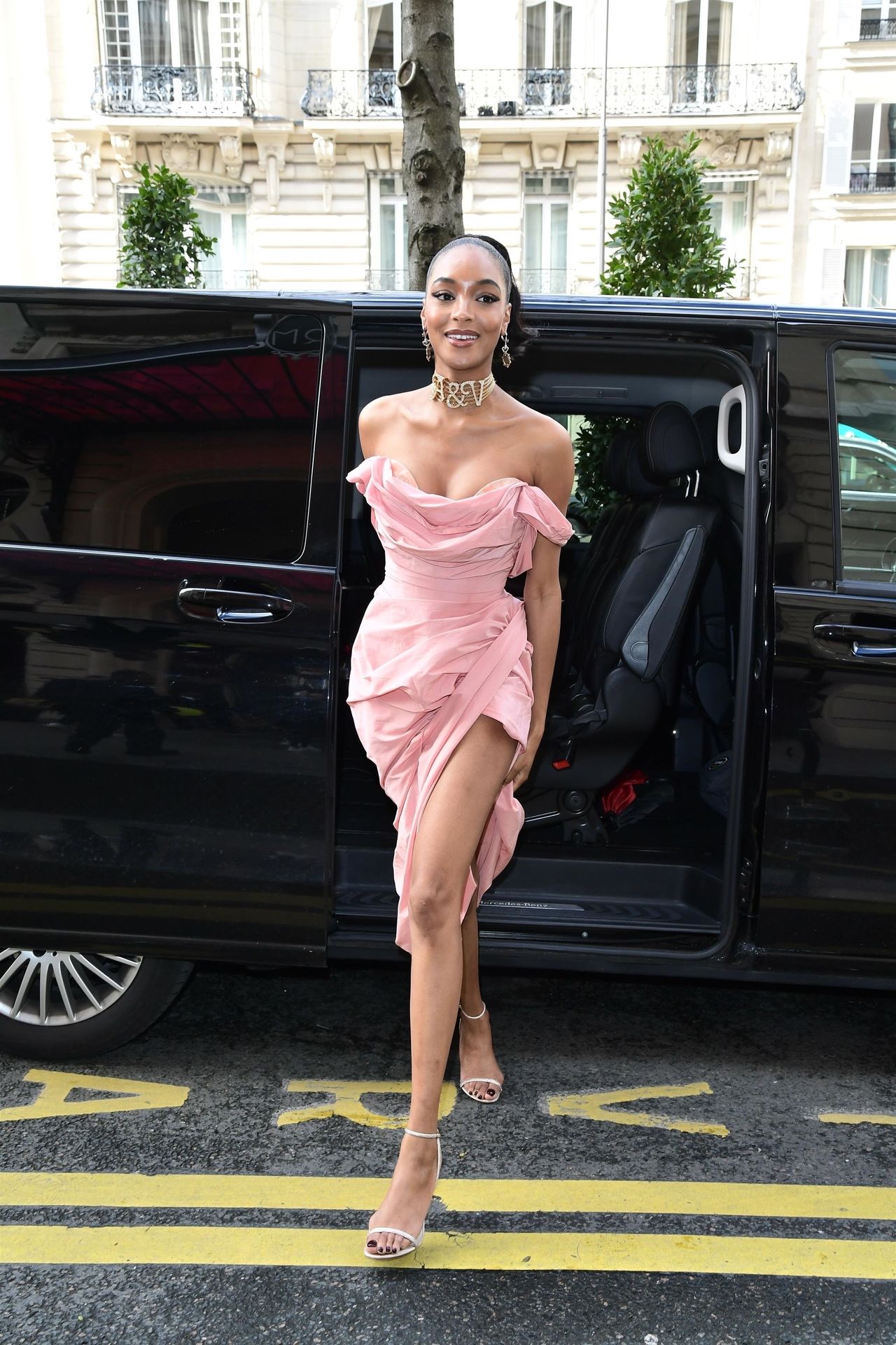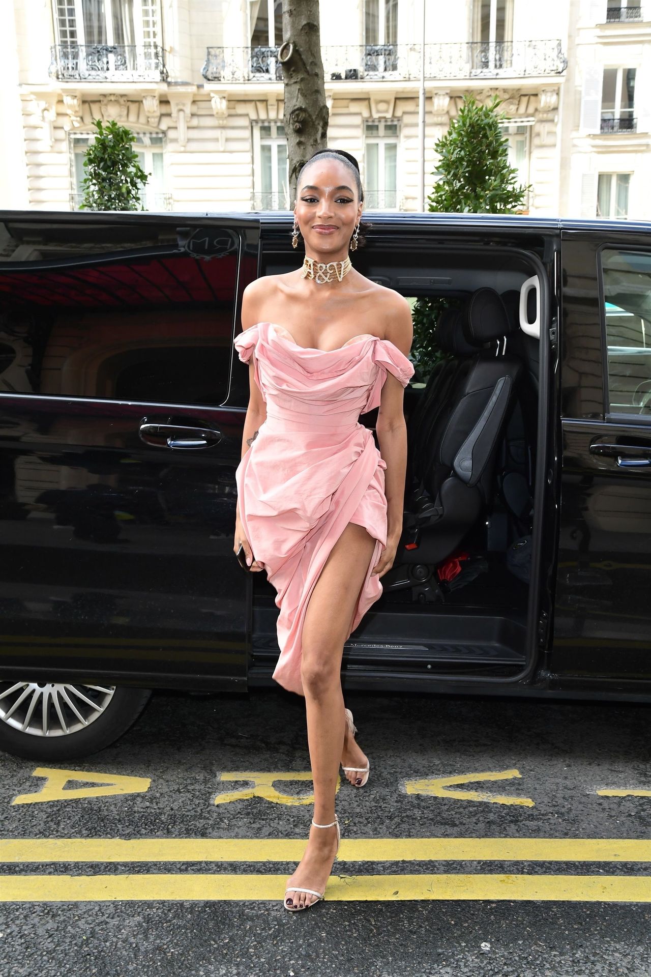 Model Jourdan Dunn was seen in a pink dress at the Royal Monceau hotel during Paris Fashion Week, 02/29/2020.