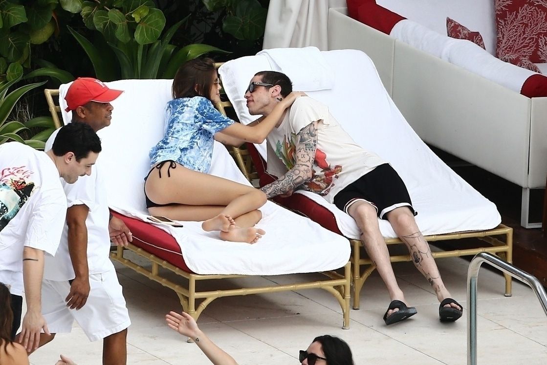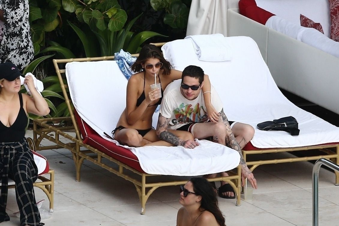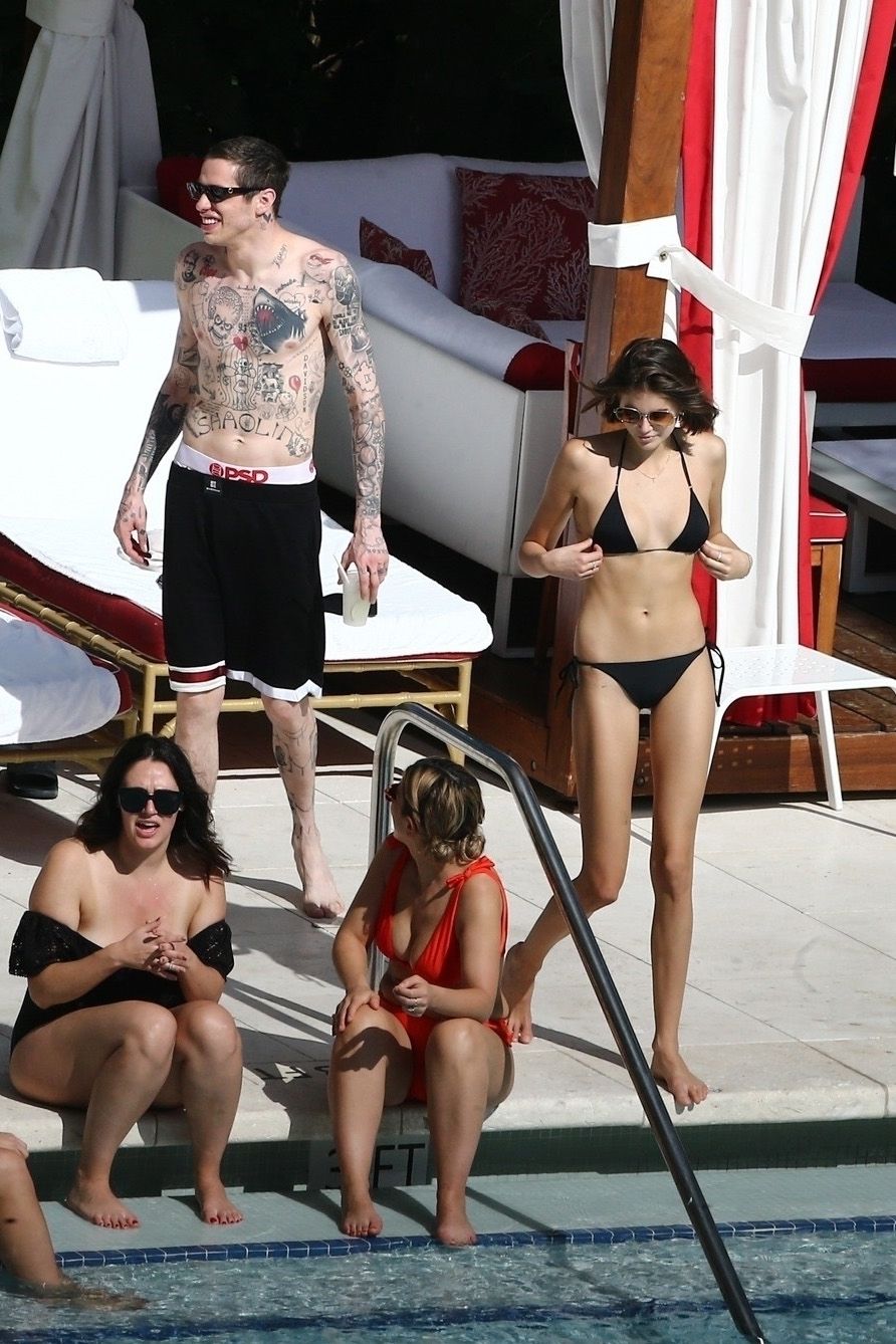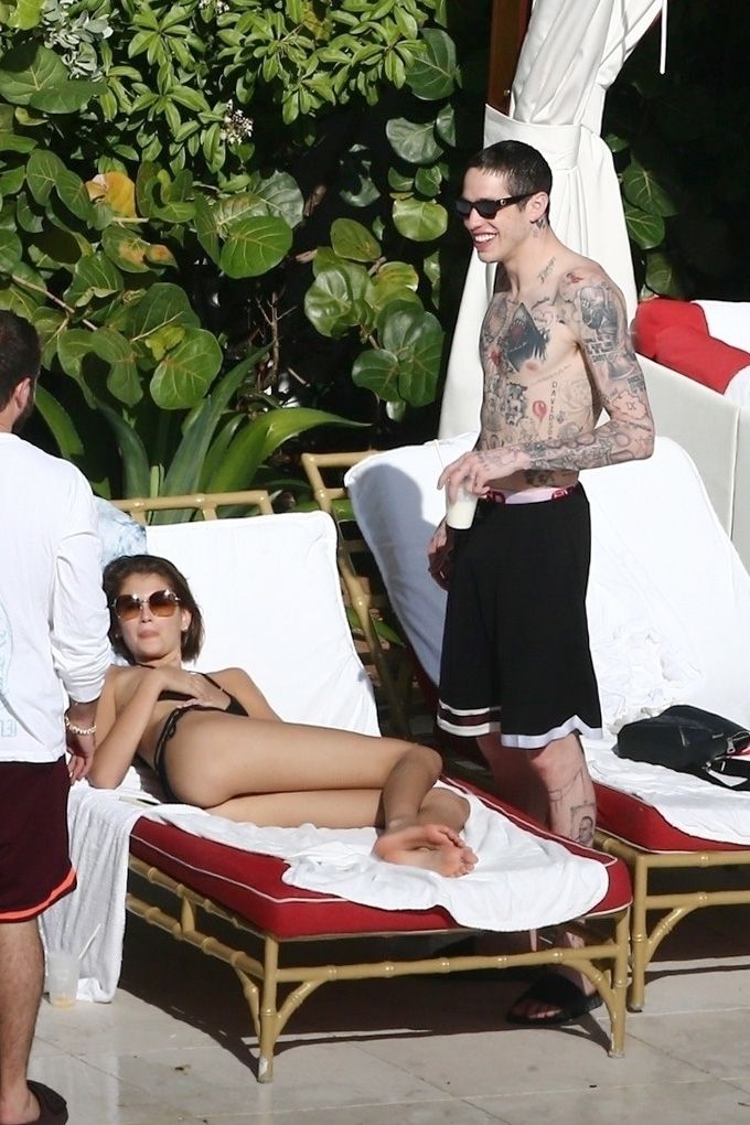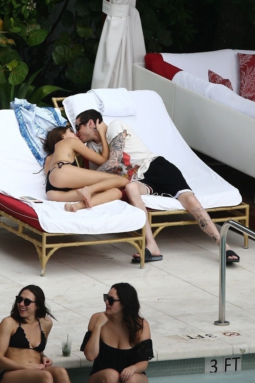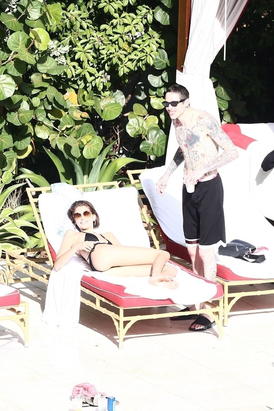 Pete Davidson and Kaia Gerber make out while vacationing together, 11/23/2019. The duo can’t seem to keep their hands off of each other as they confirm some kind of relationship. They are seen heavily kissing and holding hands poolside as they enjoy the Miami trip with friends.