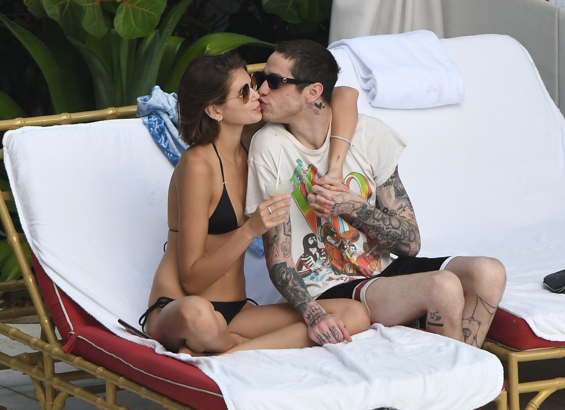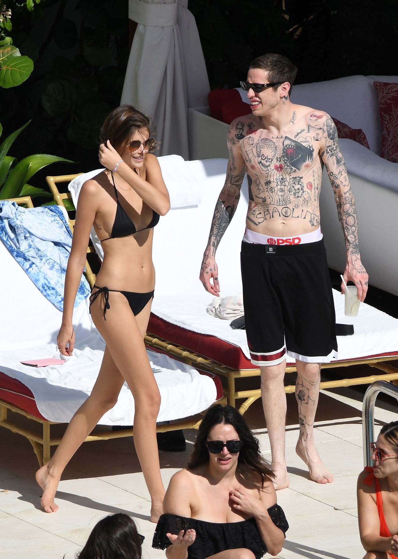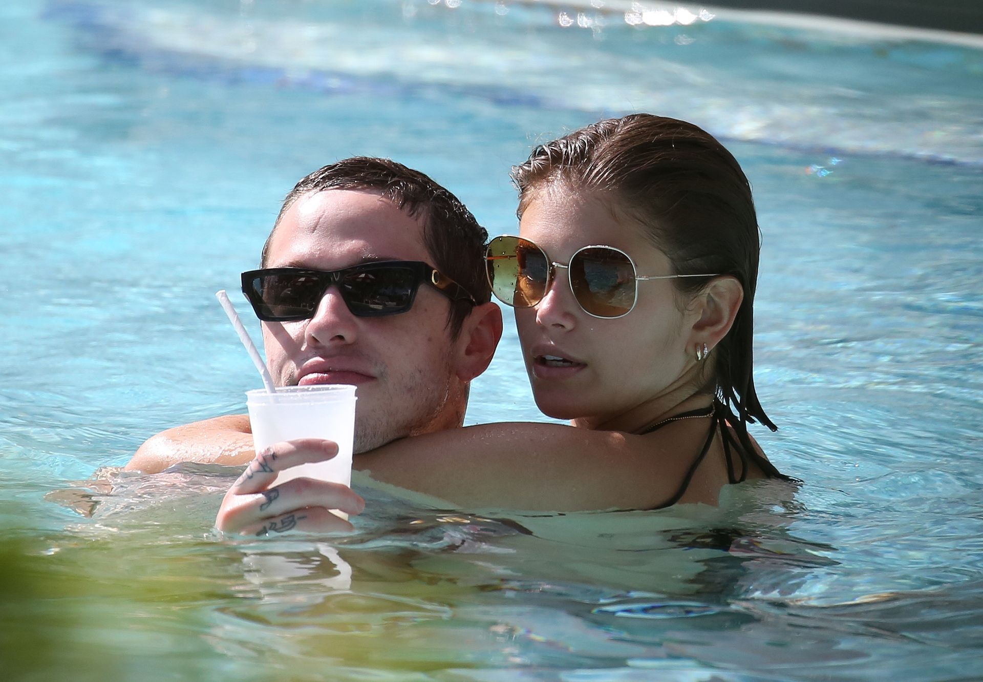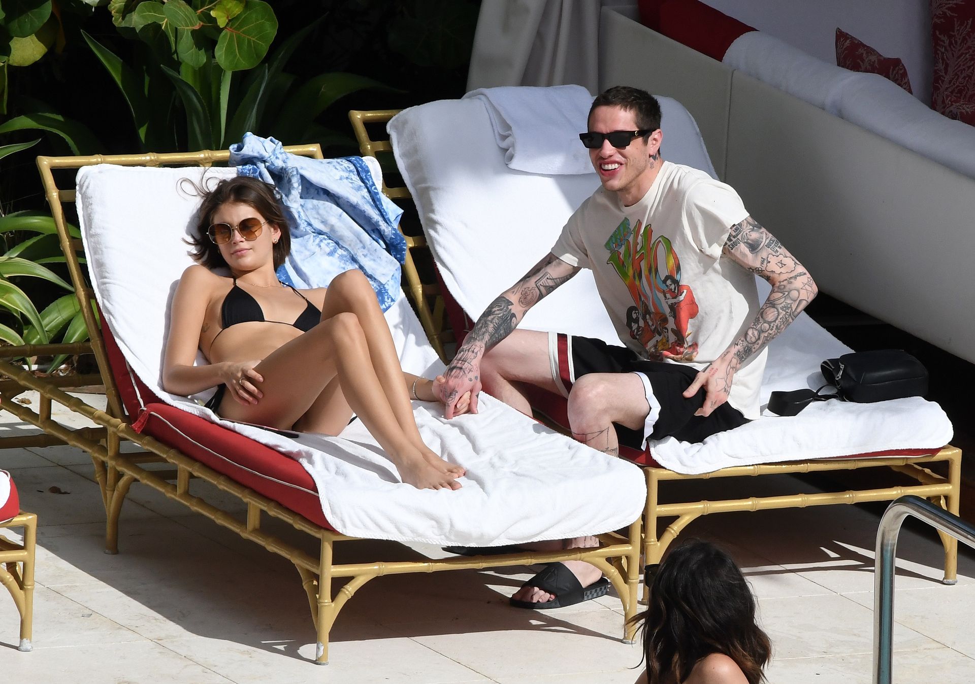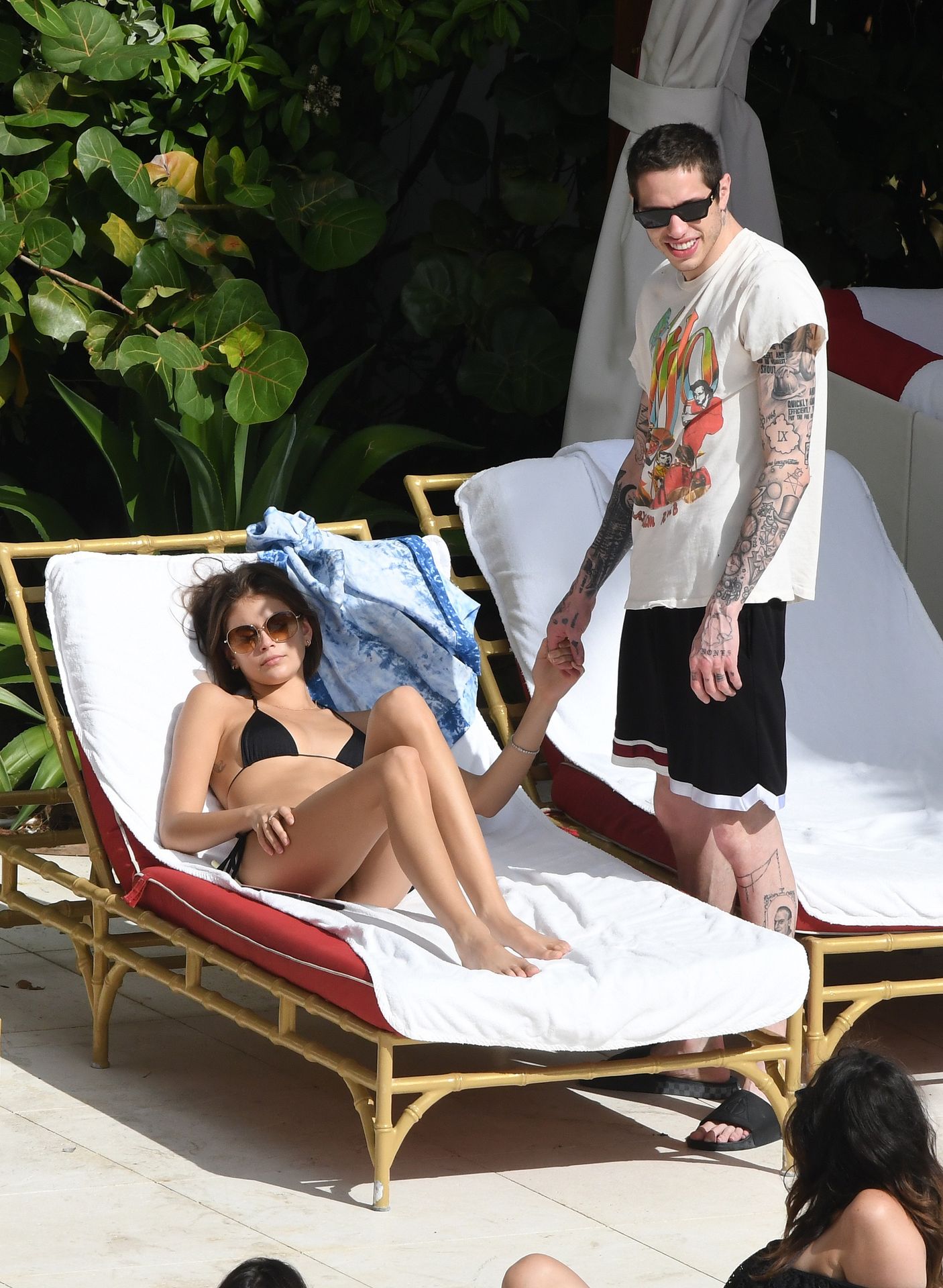 Cindy Crawford’s daughter, model Kaia Gerber wears a black bikini as she kisses boyfriend Pete Davidson by the pool in Miami, 11/23/2019.