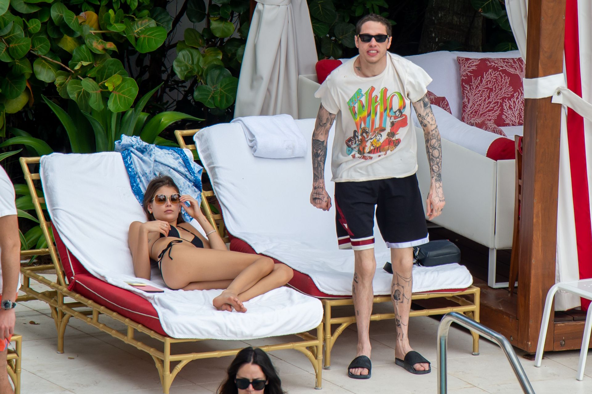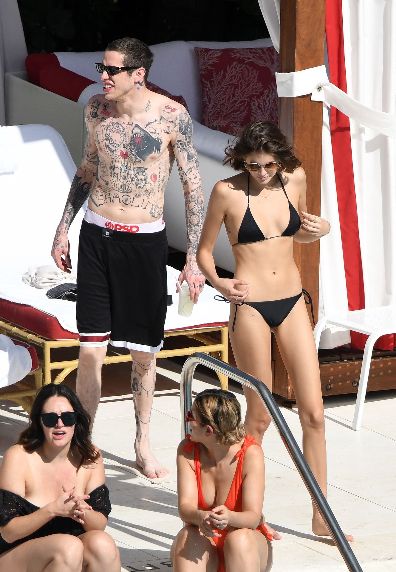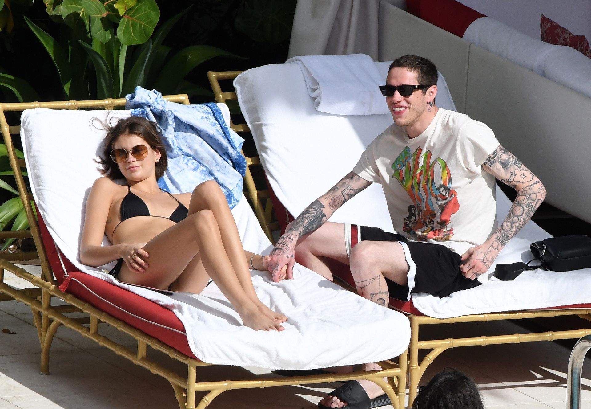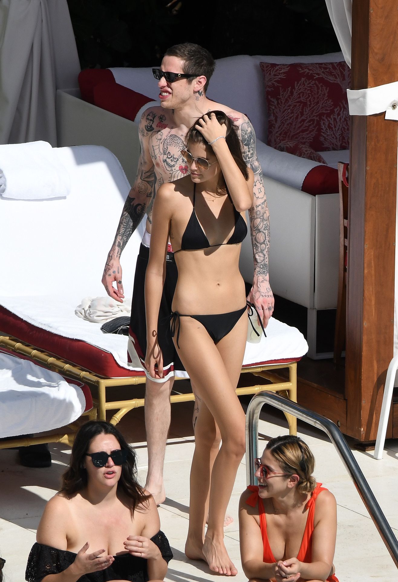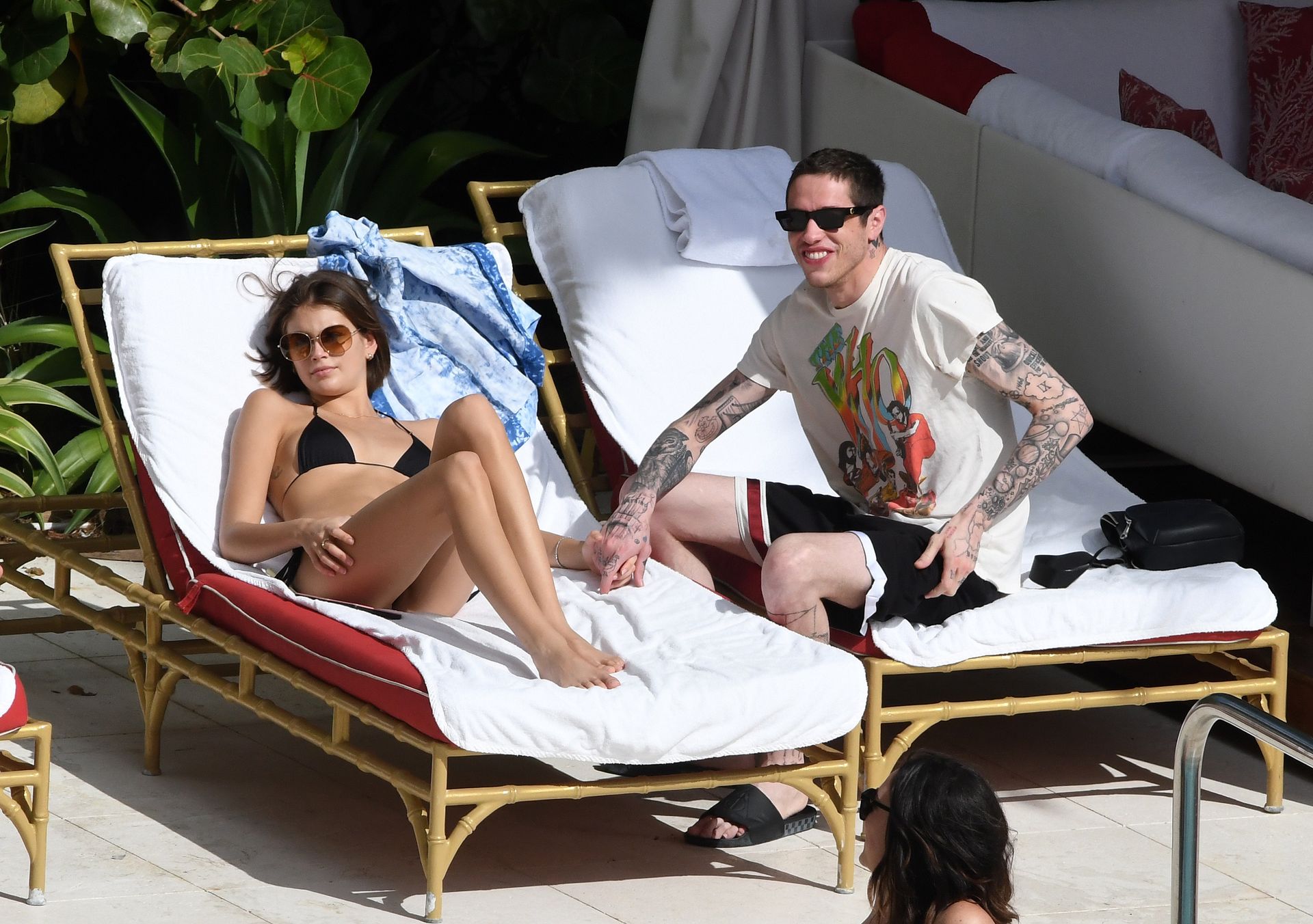 Cindy Crawford’s daughter, model Kaia Gerber wears a black bikini as she kisses boyfriend Pete Davidson by the pool in Miami, 11/23/2019.