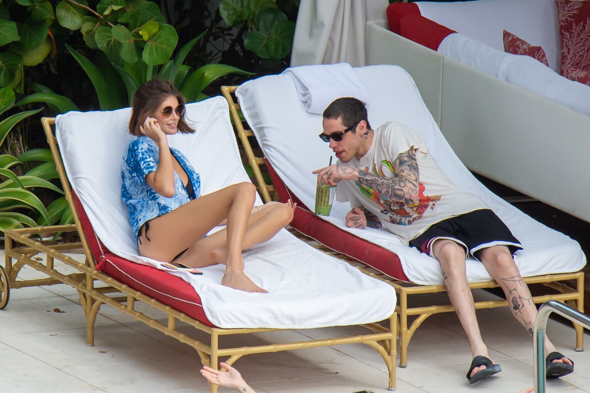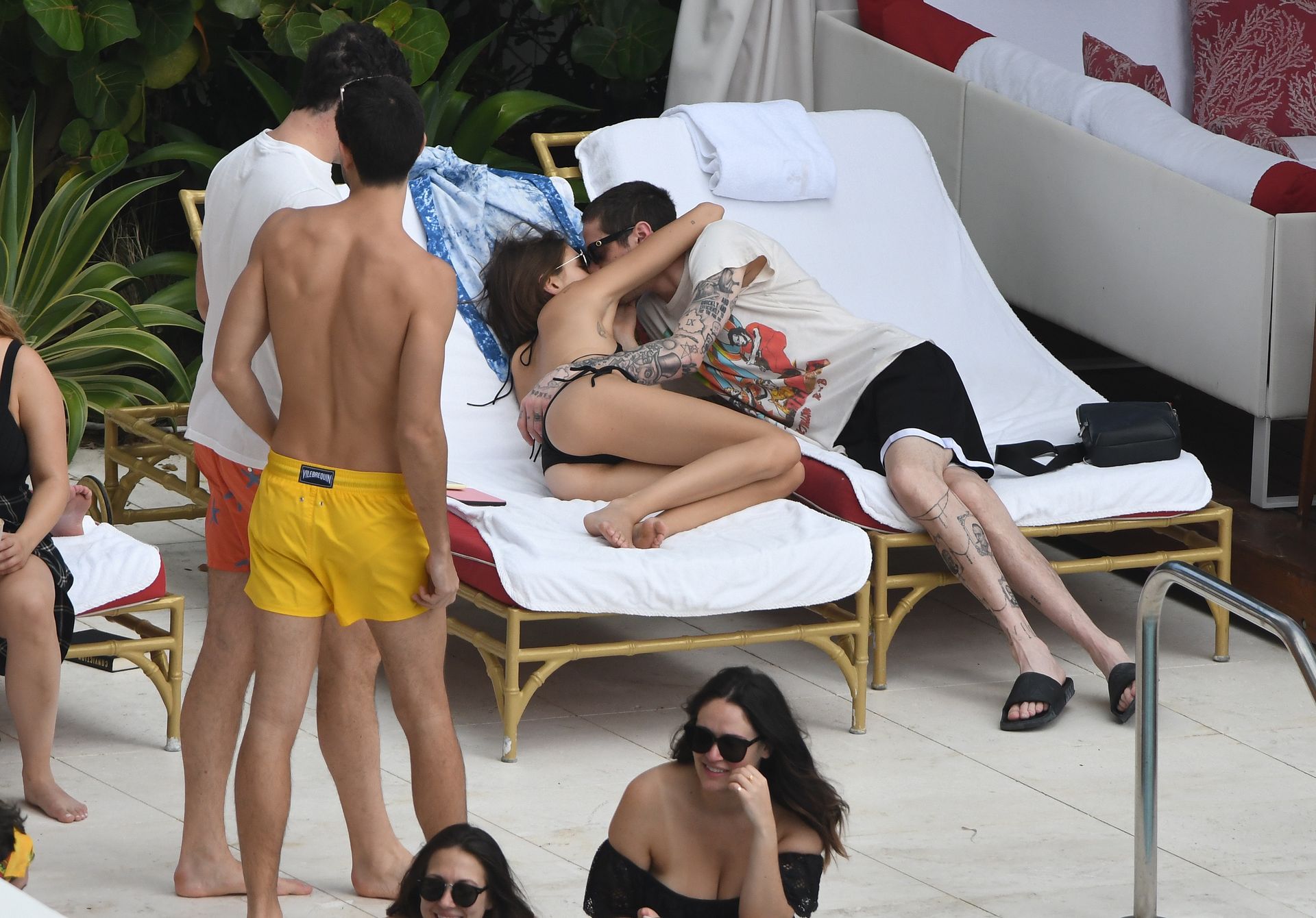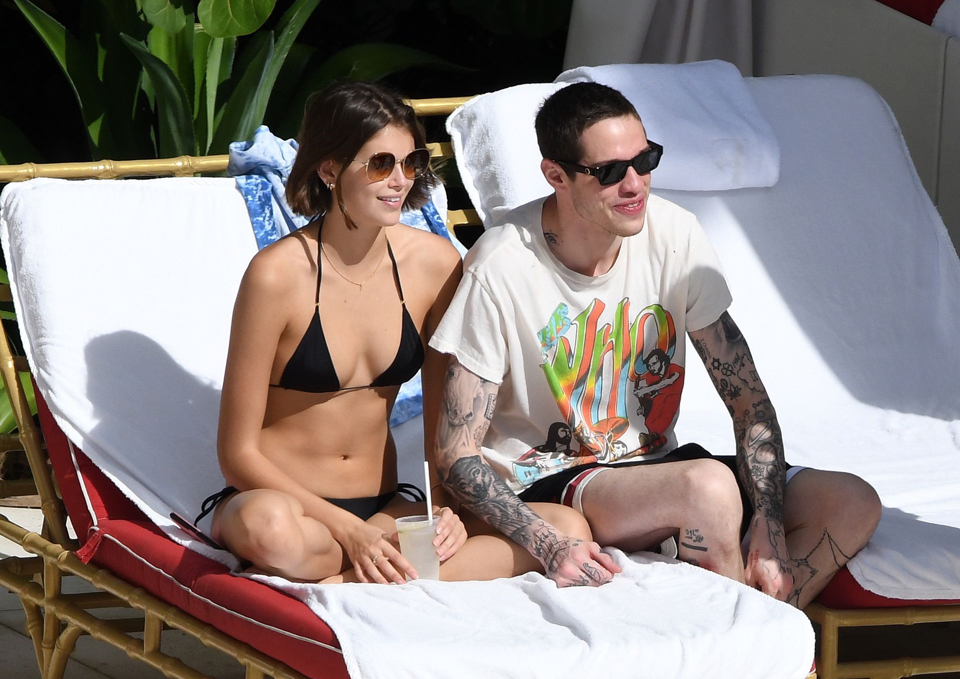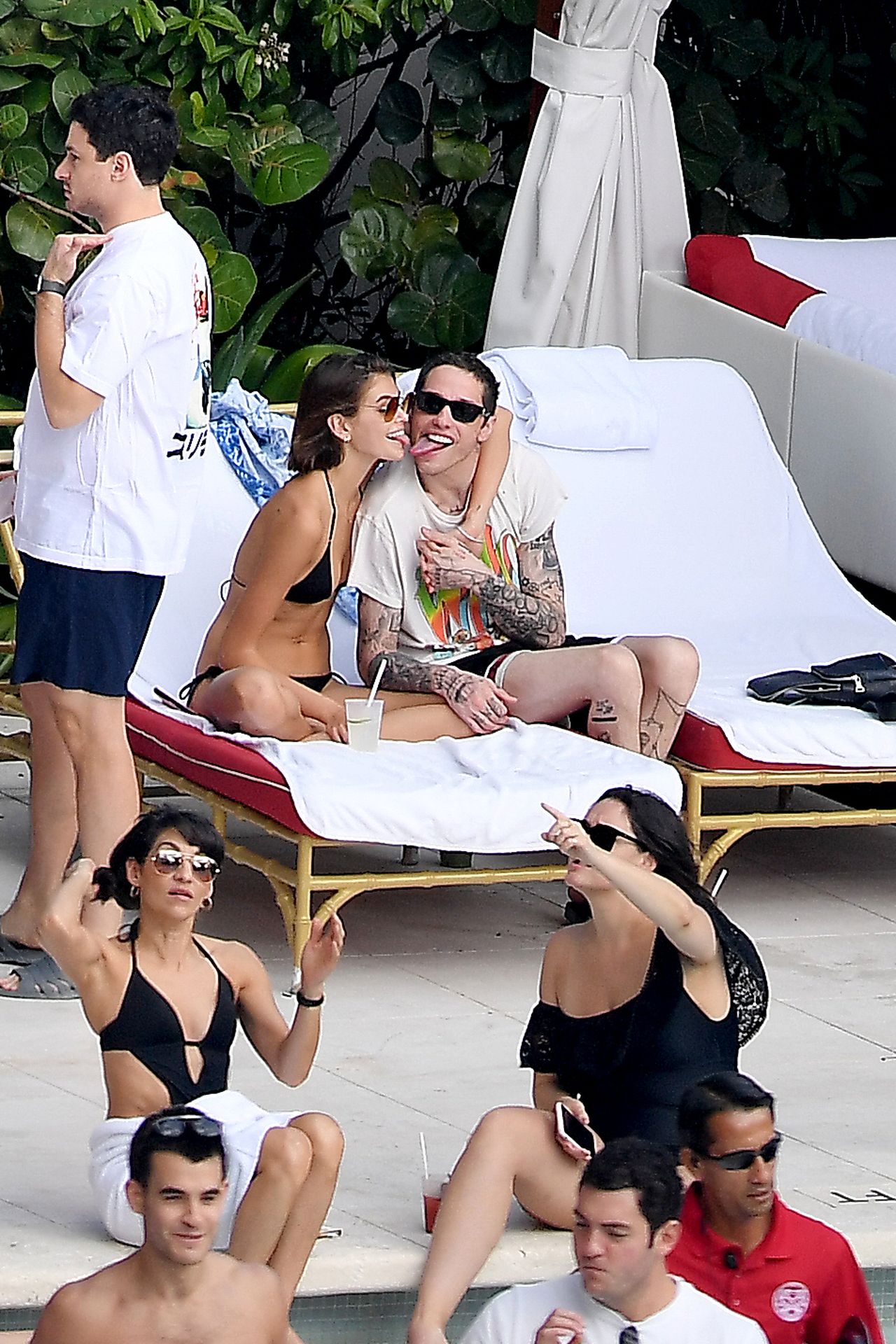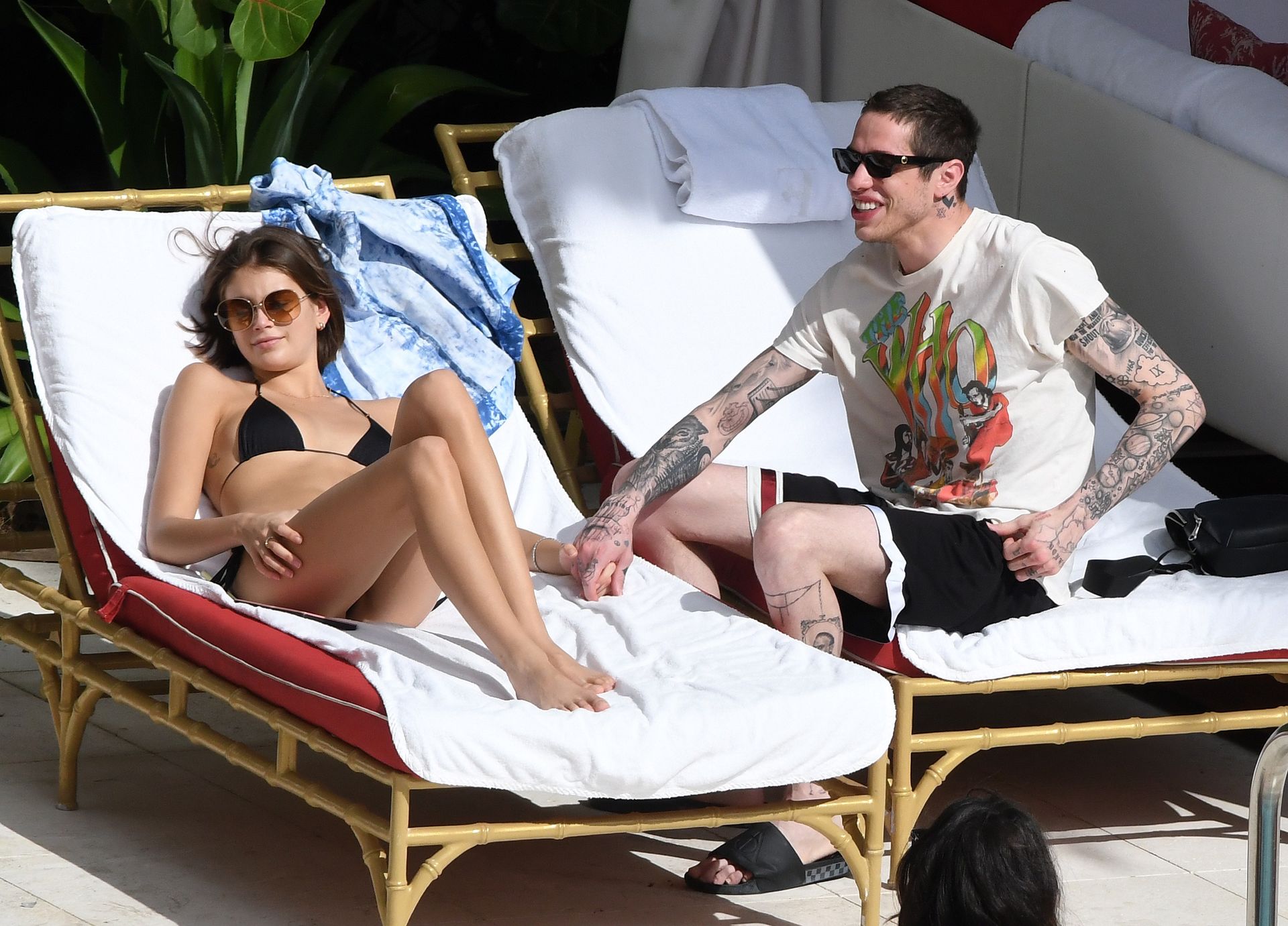 Cindy Crawford’s daughter, model Kaia Gerber wears a black bikini as she kisses boyfriend Pete Davidson by the pool in Miami, 11/23/2019.