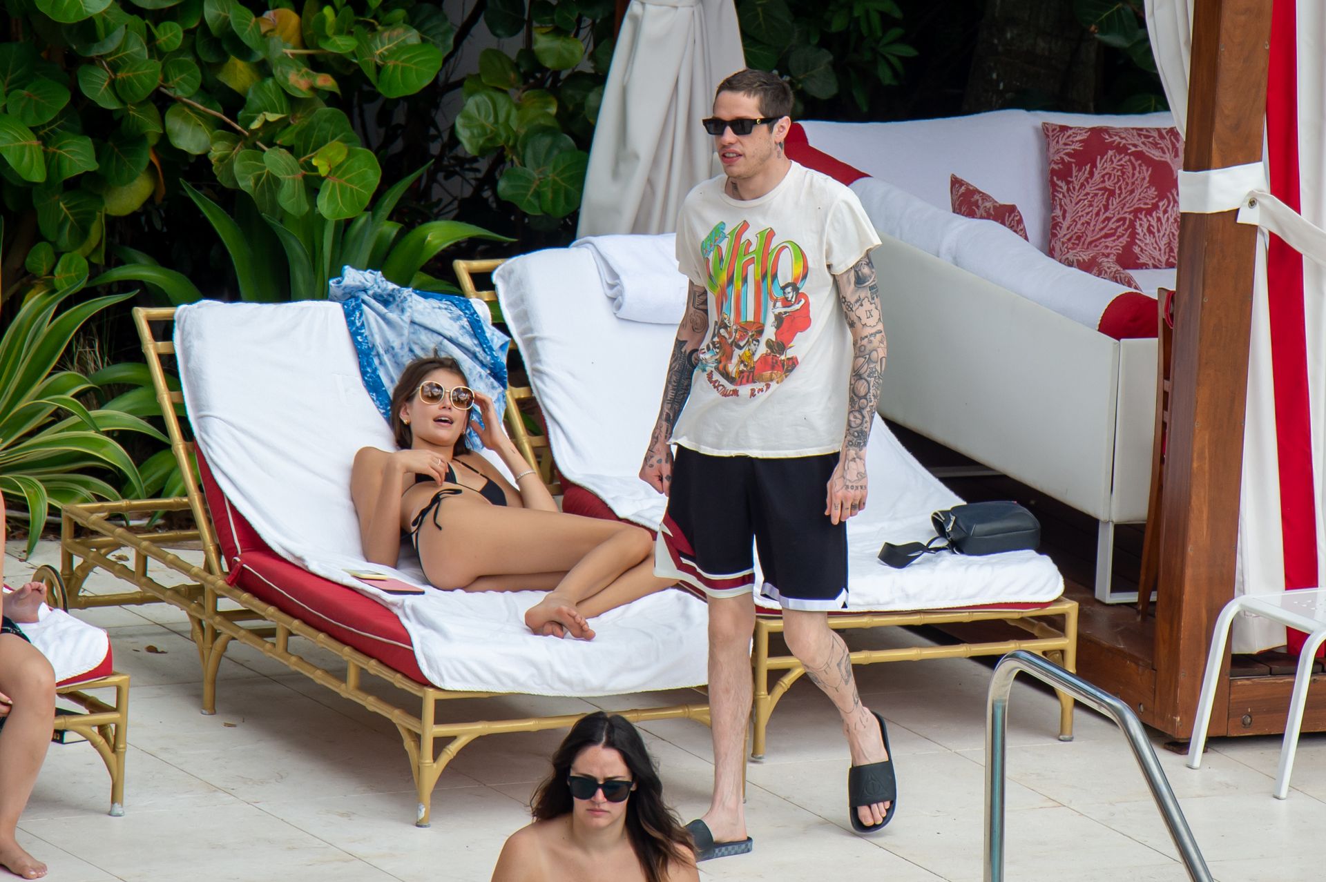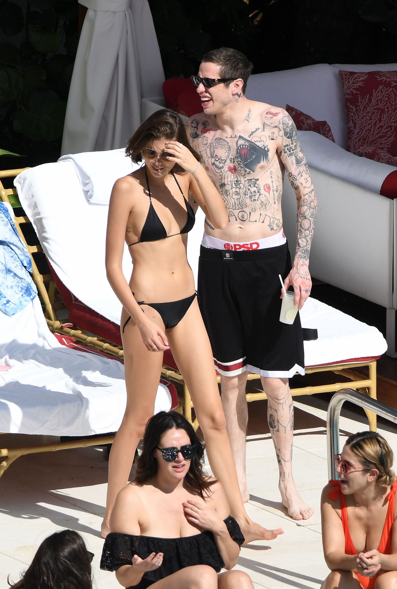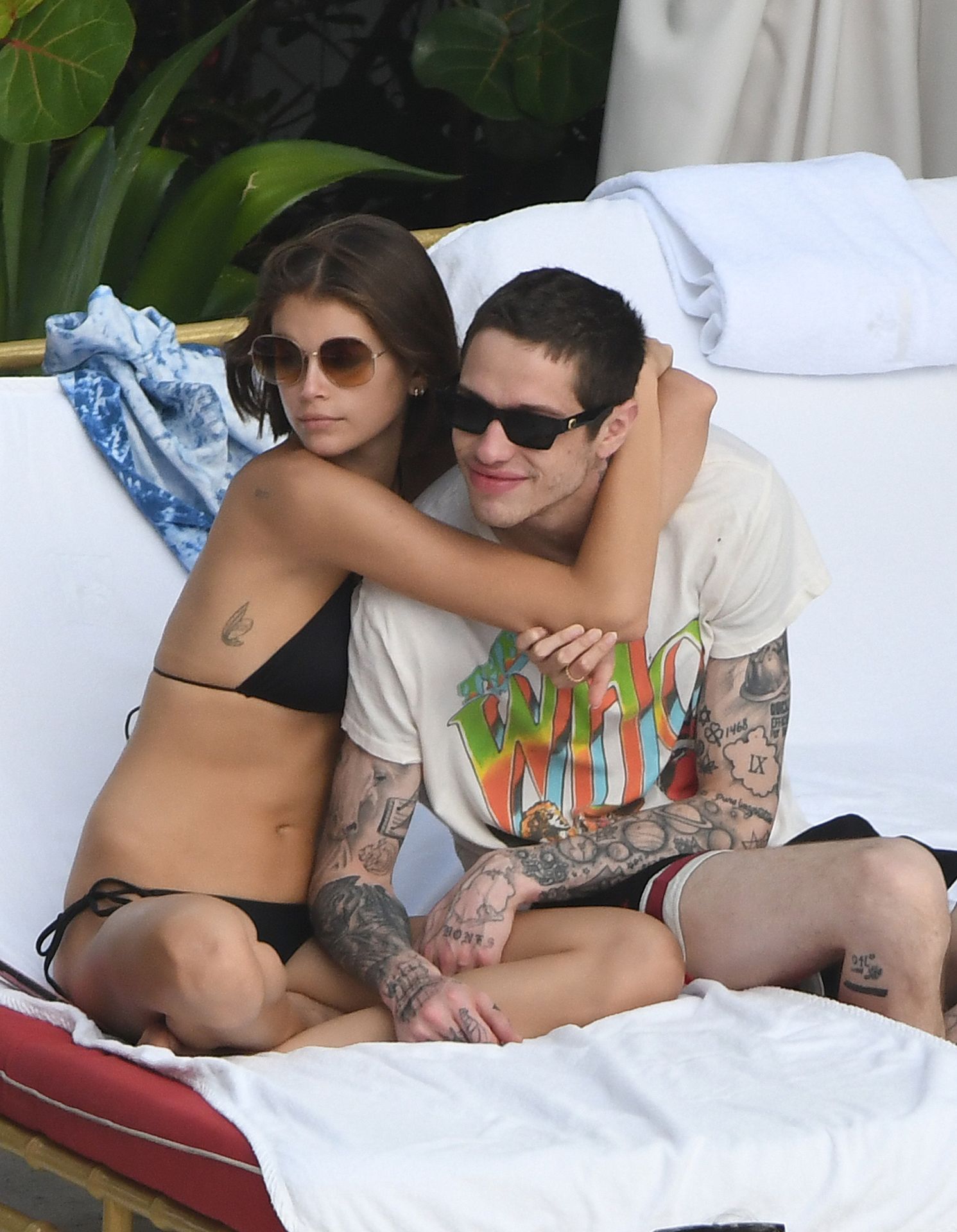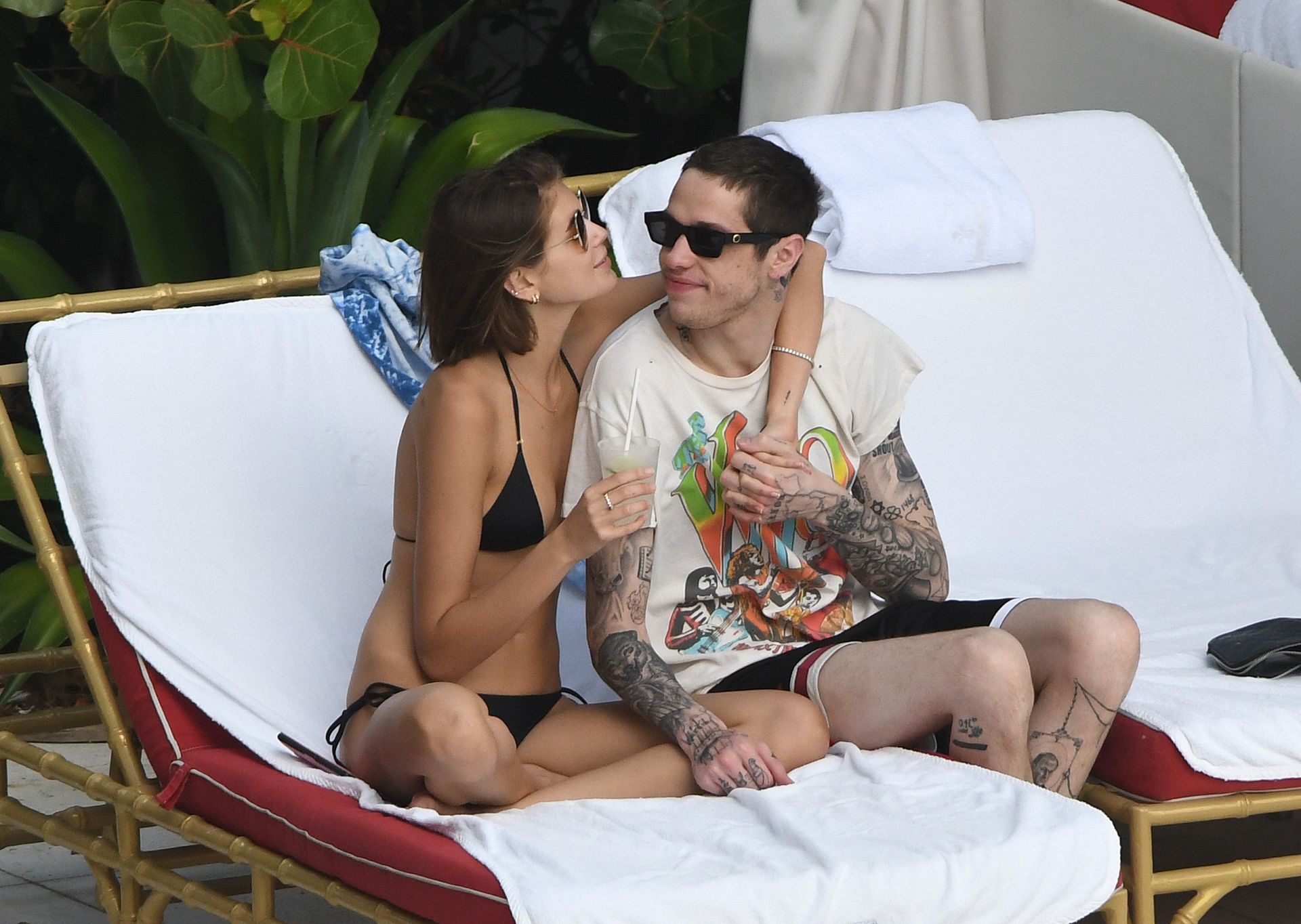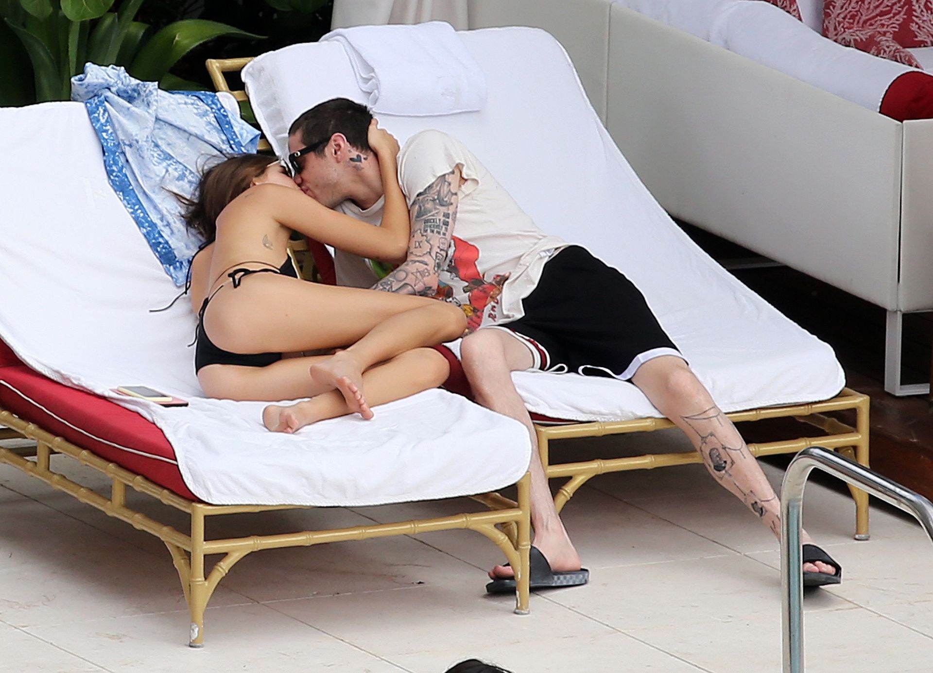 Cindy Crawford’s daughter, model Kaia Gerber wears a black bikini as she kisses boyfriend Pete Davidson by the pool in Miami, 11/23/2019.