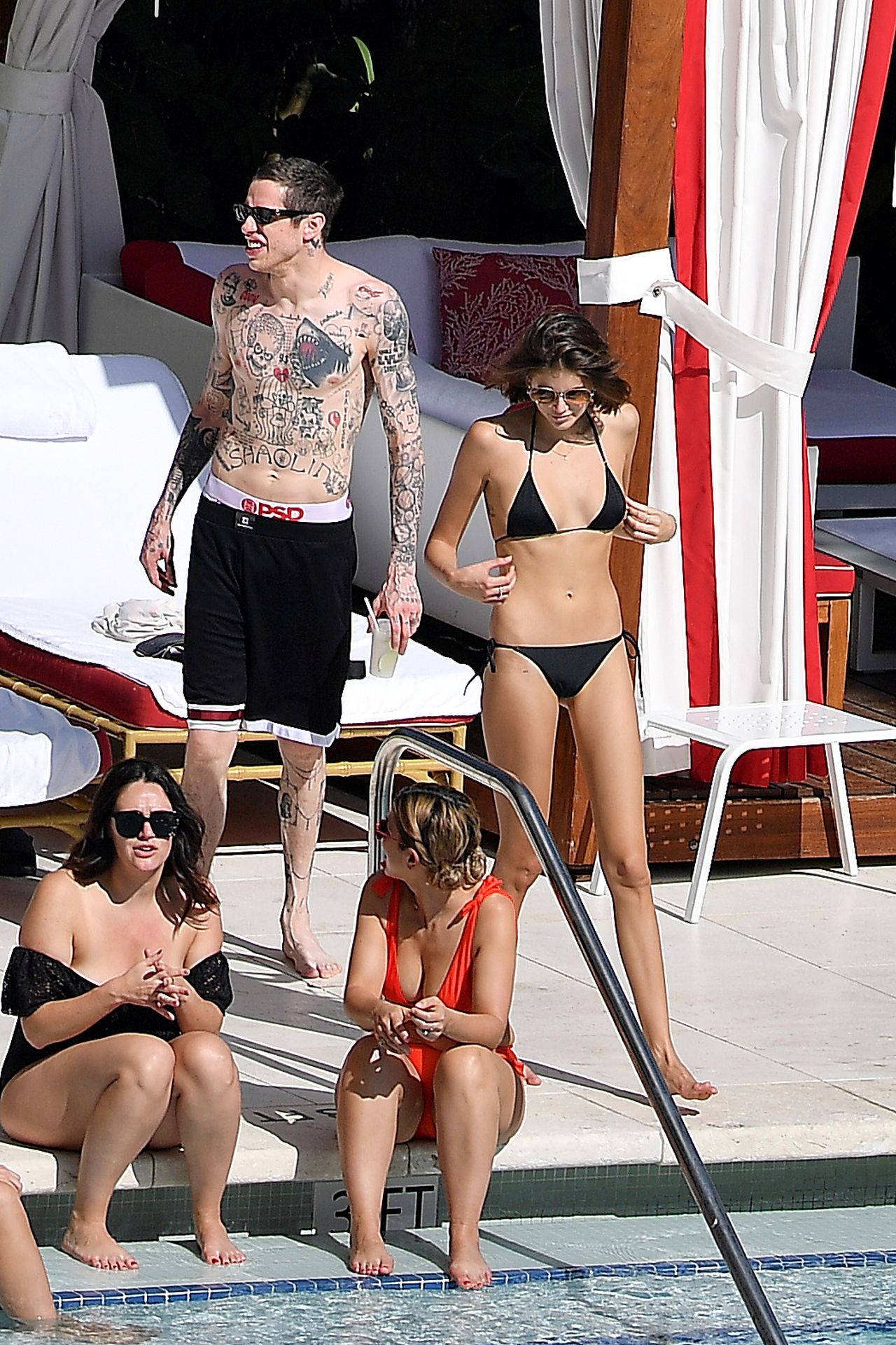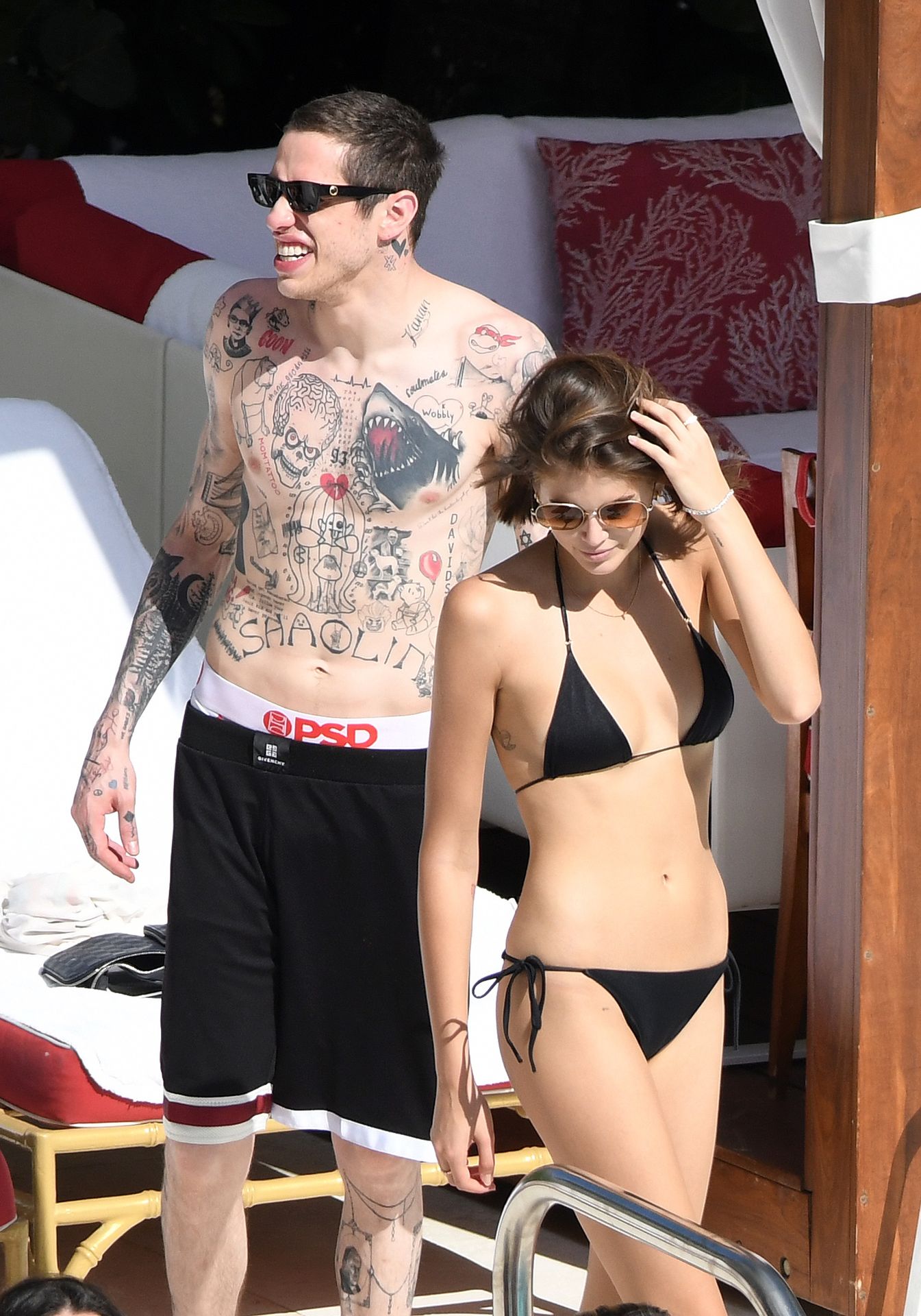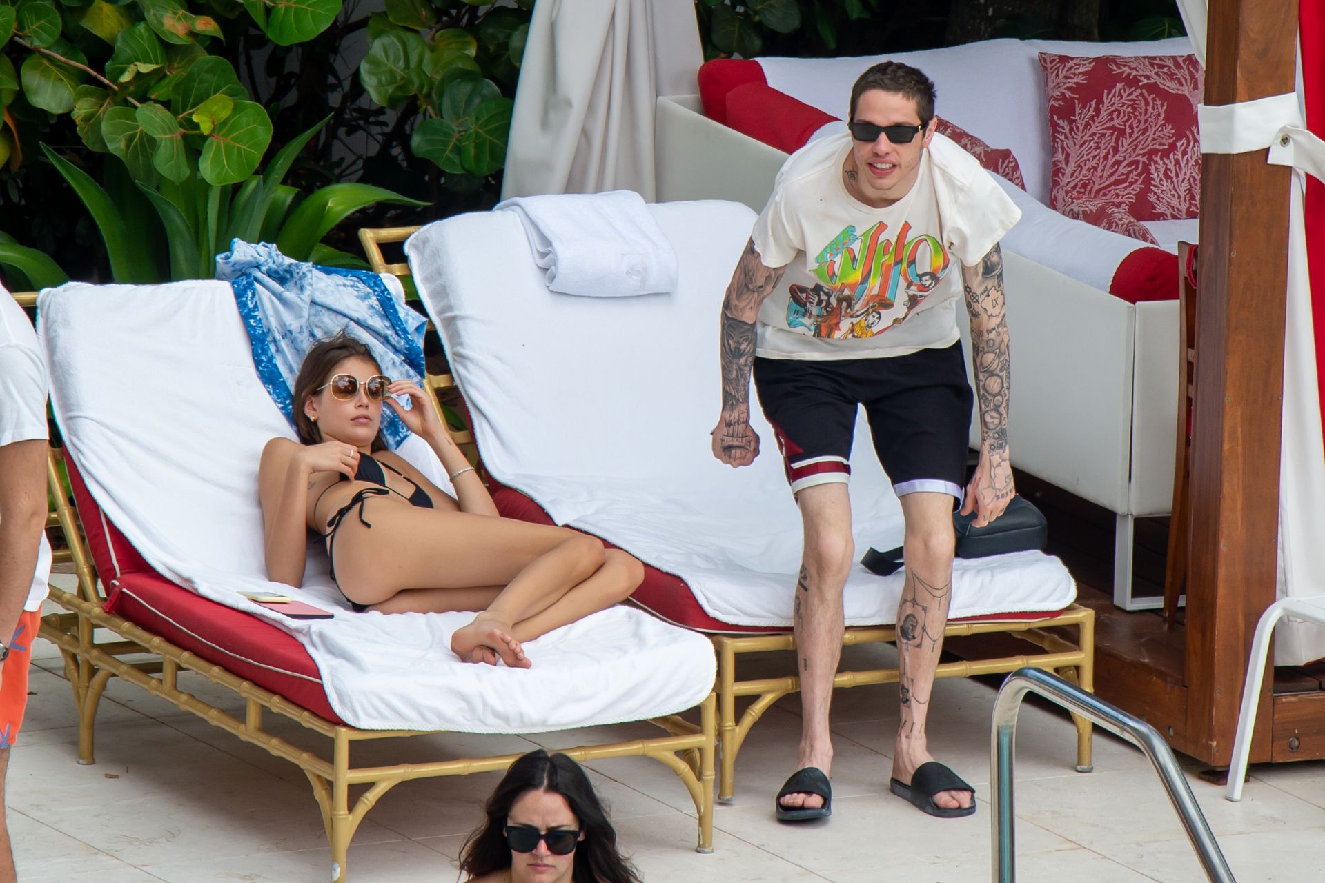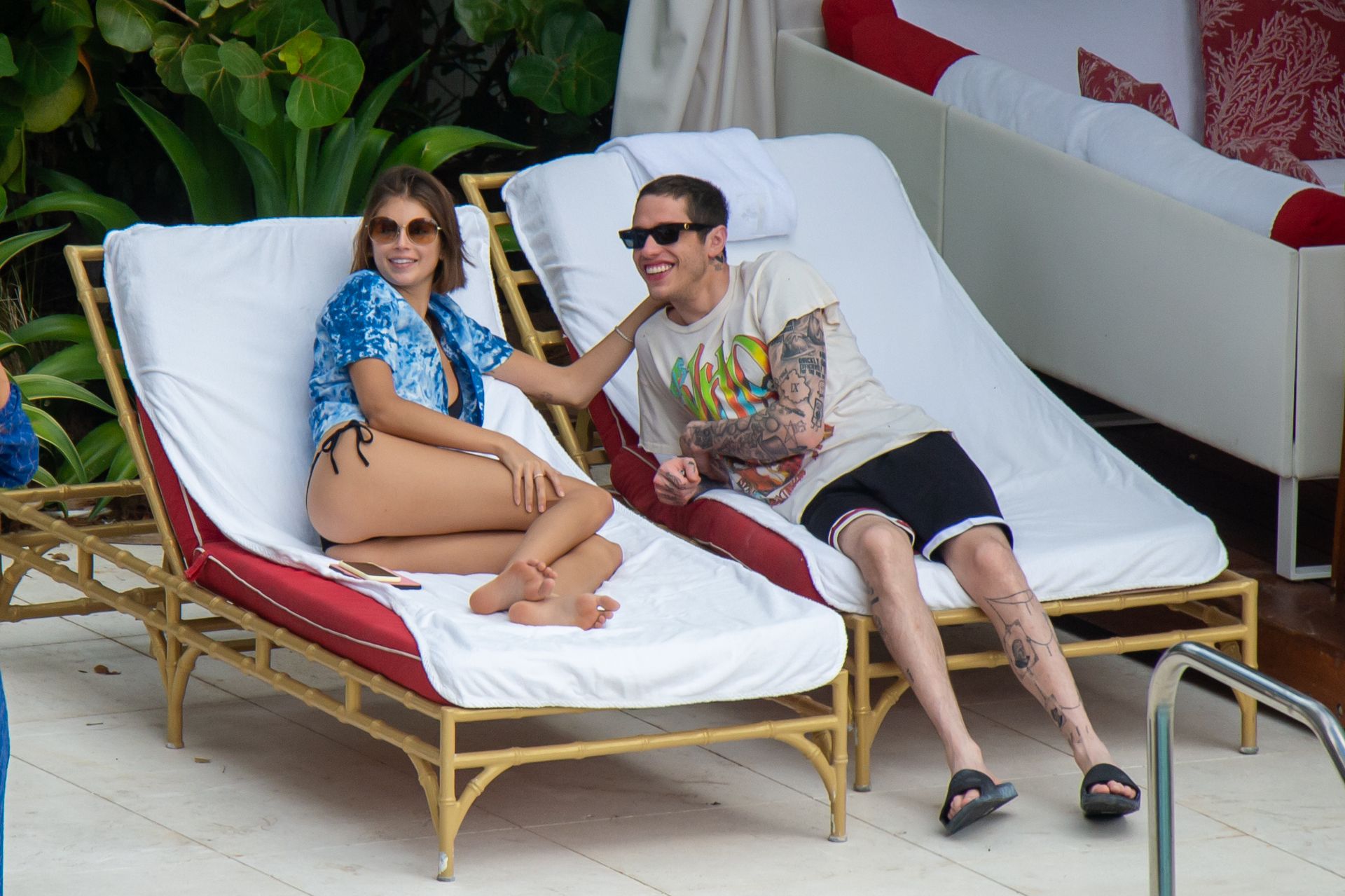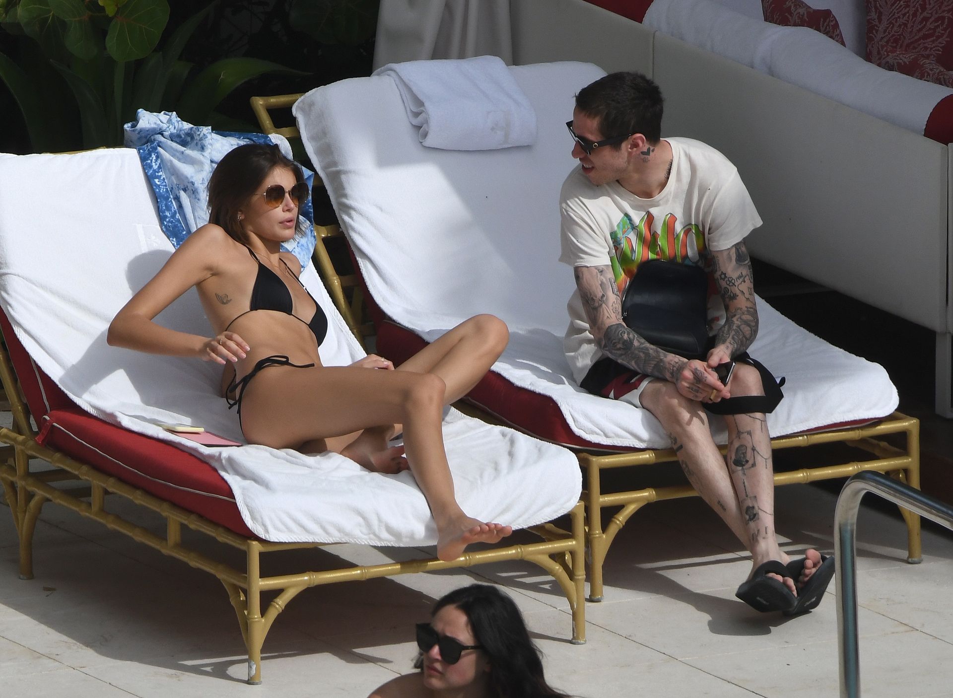 Cindy Crawford’s daughter, model Kaia Gerber wears a black bikini as she kisses boyfriend Pete Davidson by the pool in Miami, 11/23/2019.