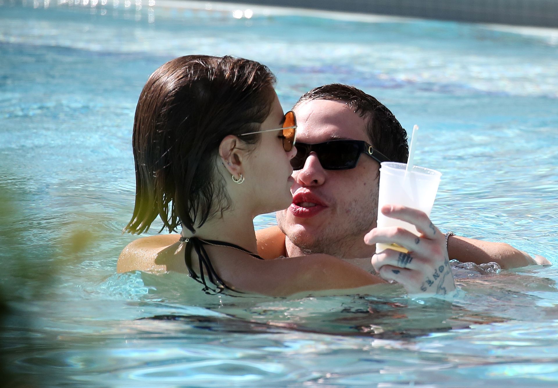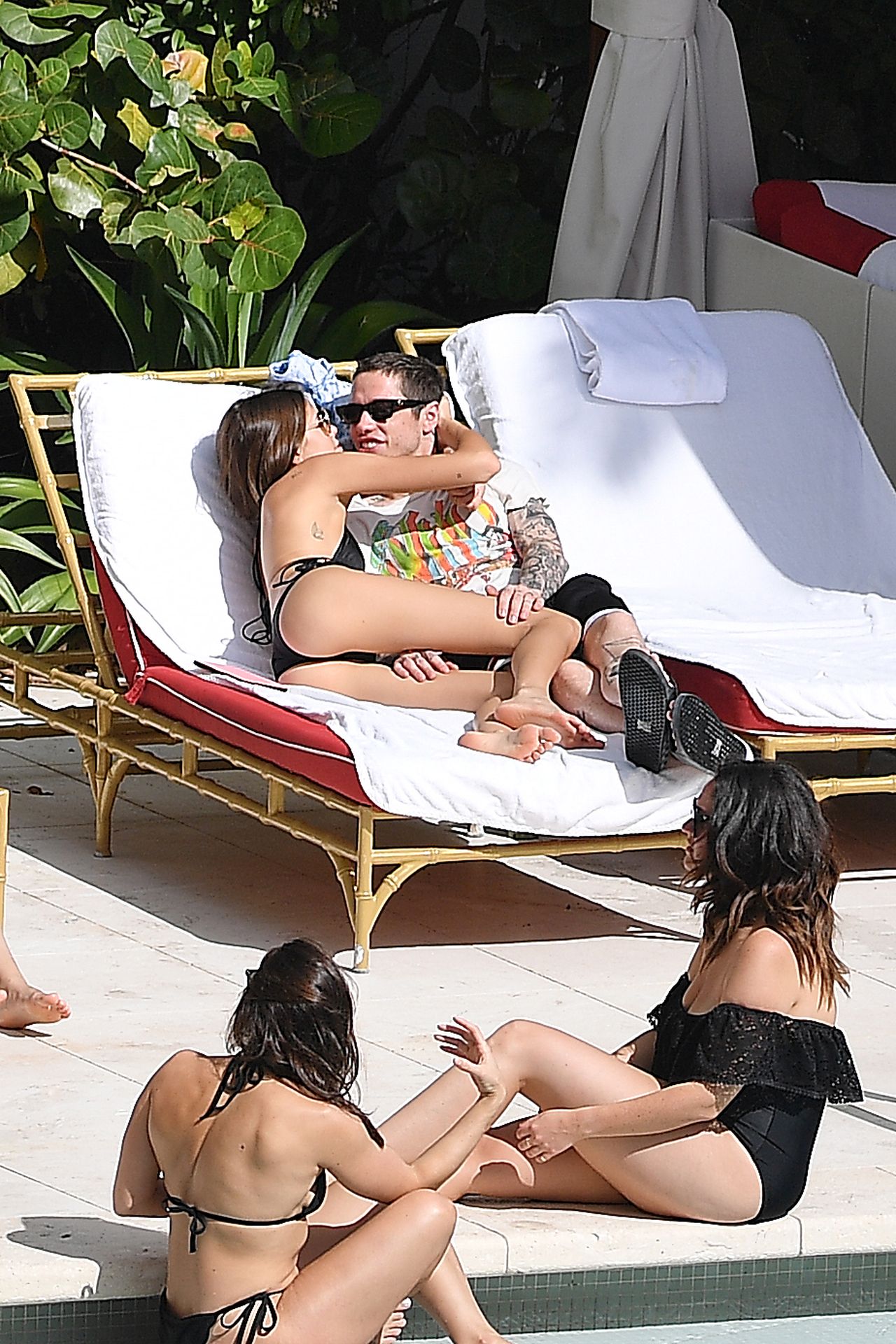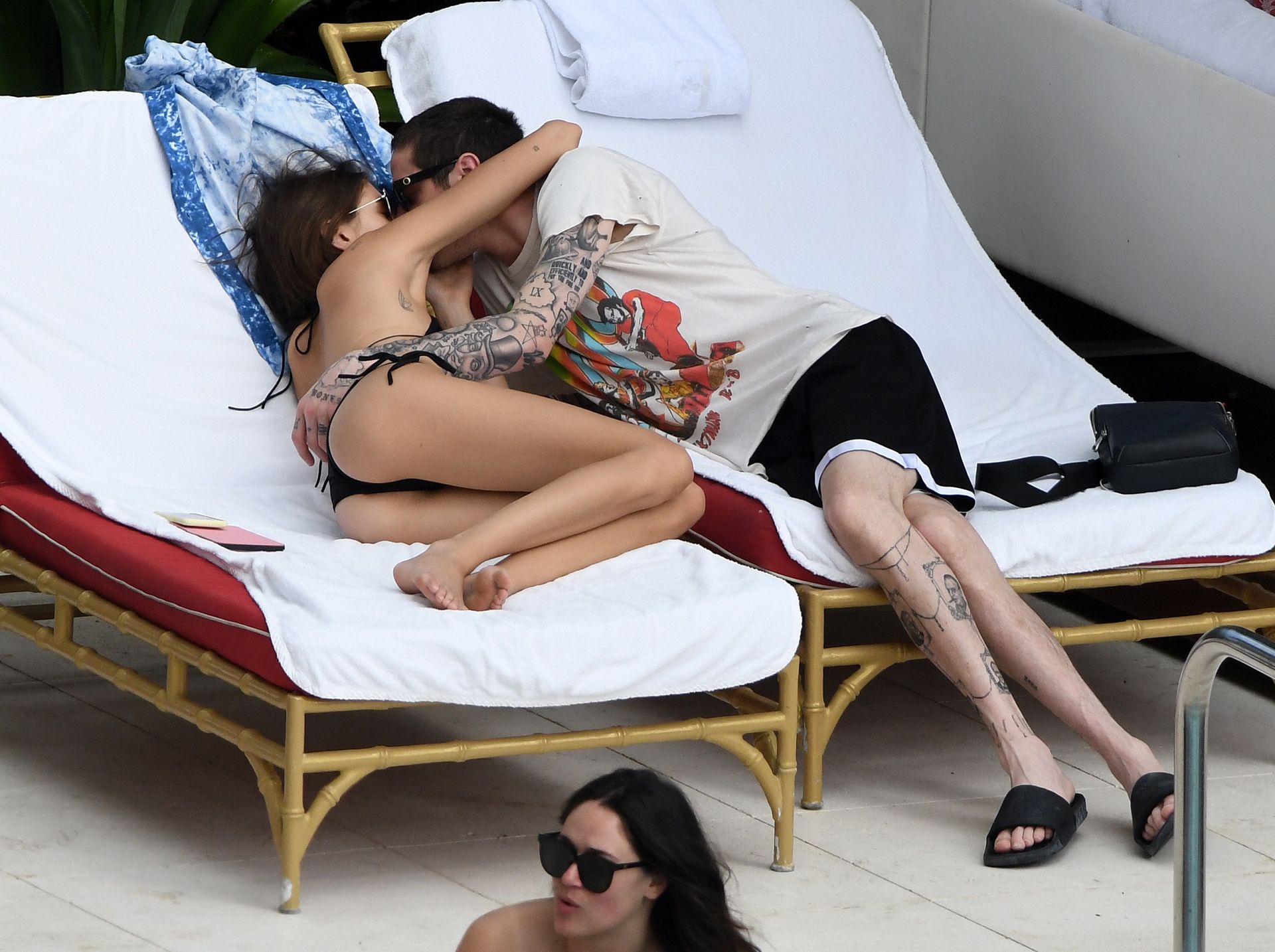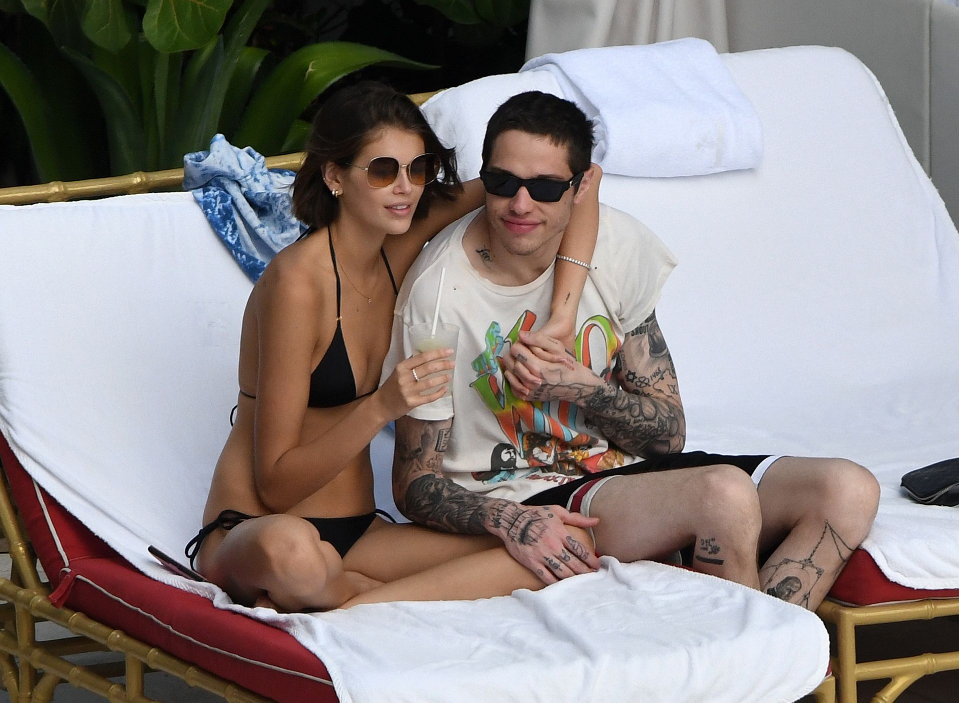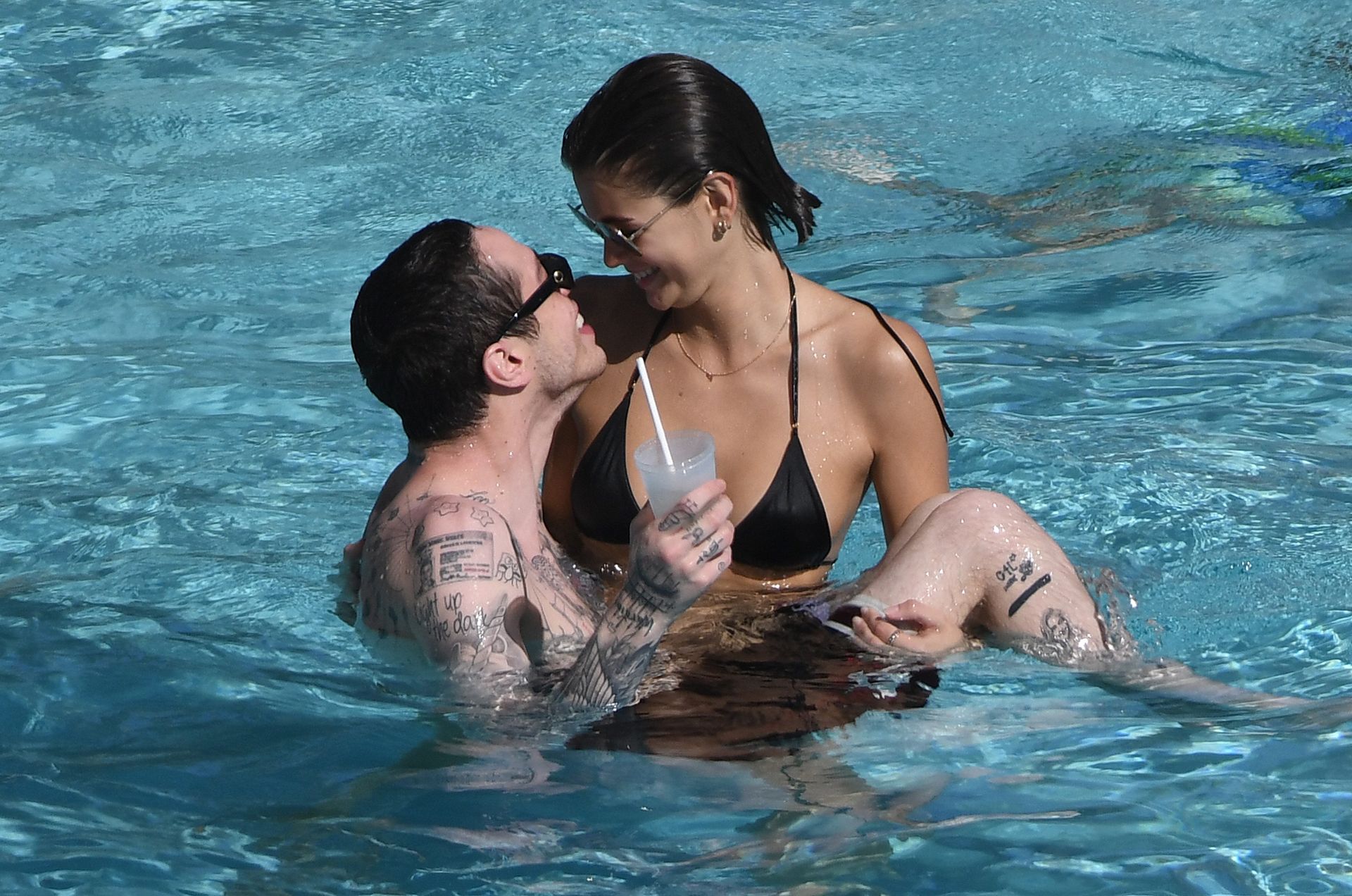 Cindy Crawford’s daughter, model Kaia Gerber wears a black bikini as she kisses boyfriend Pete Davidson by the pool in Miami, 11/23/2019.
