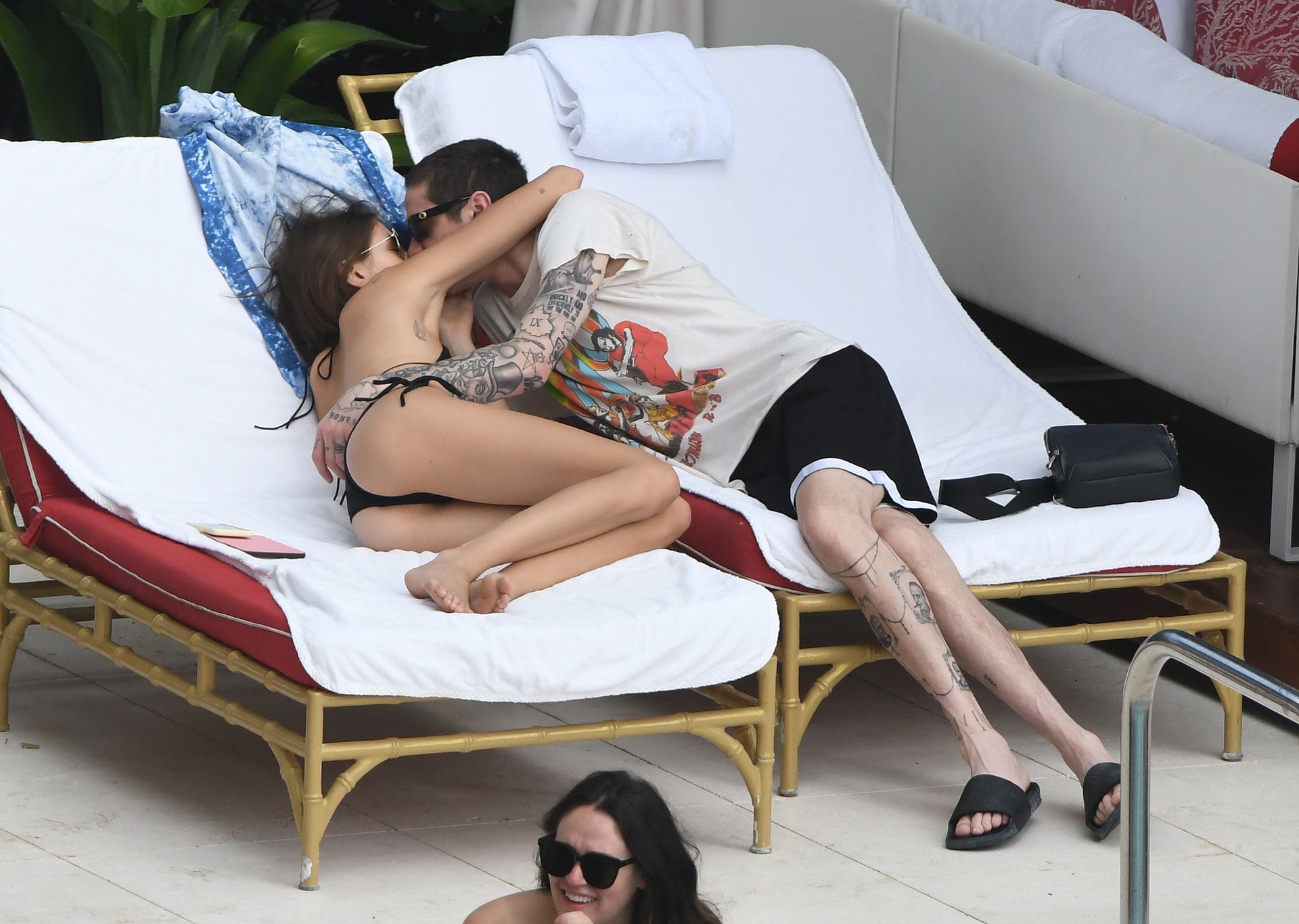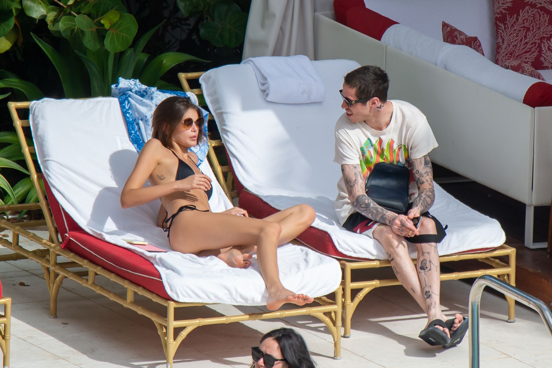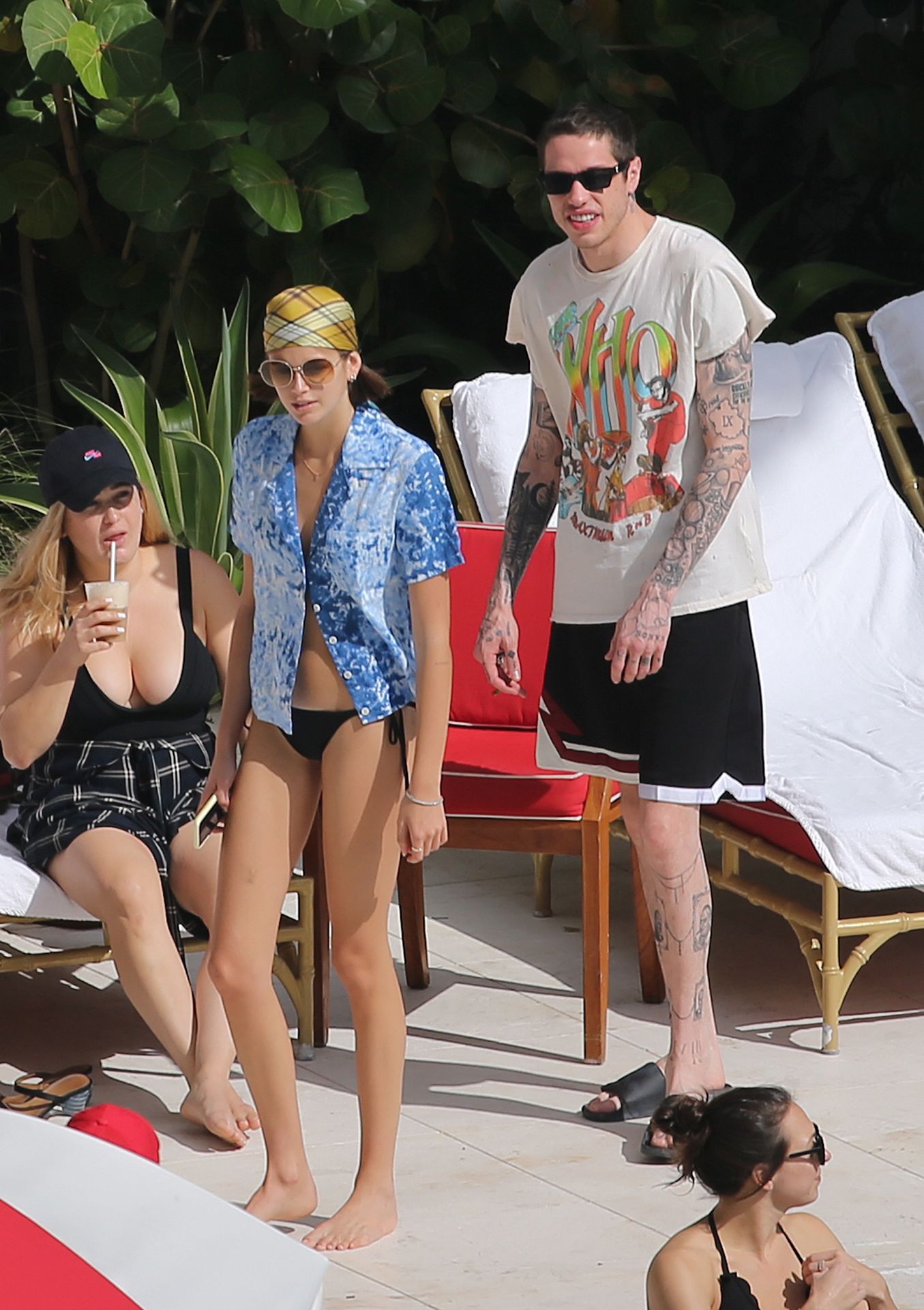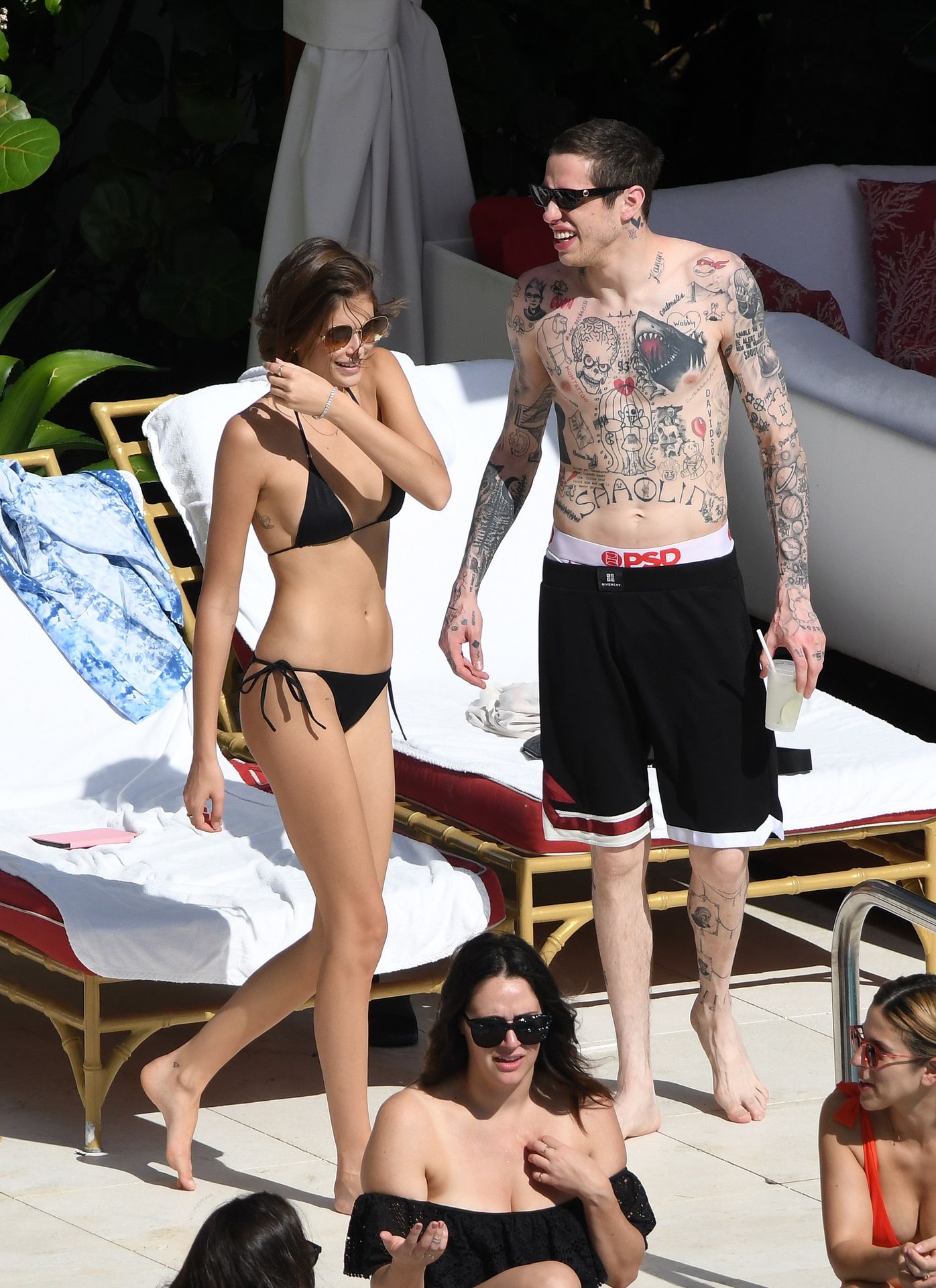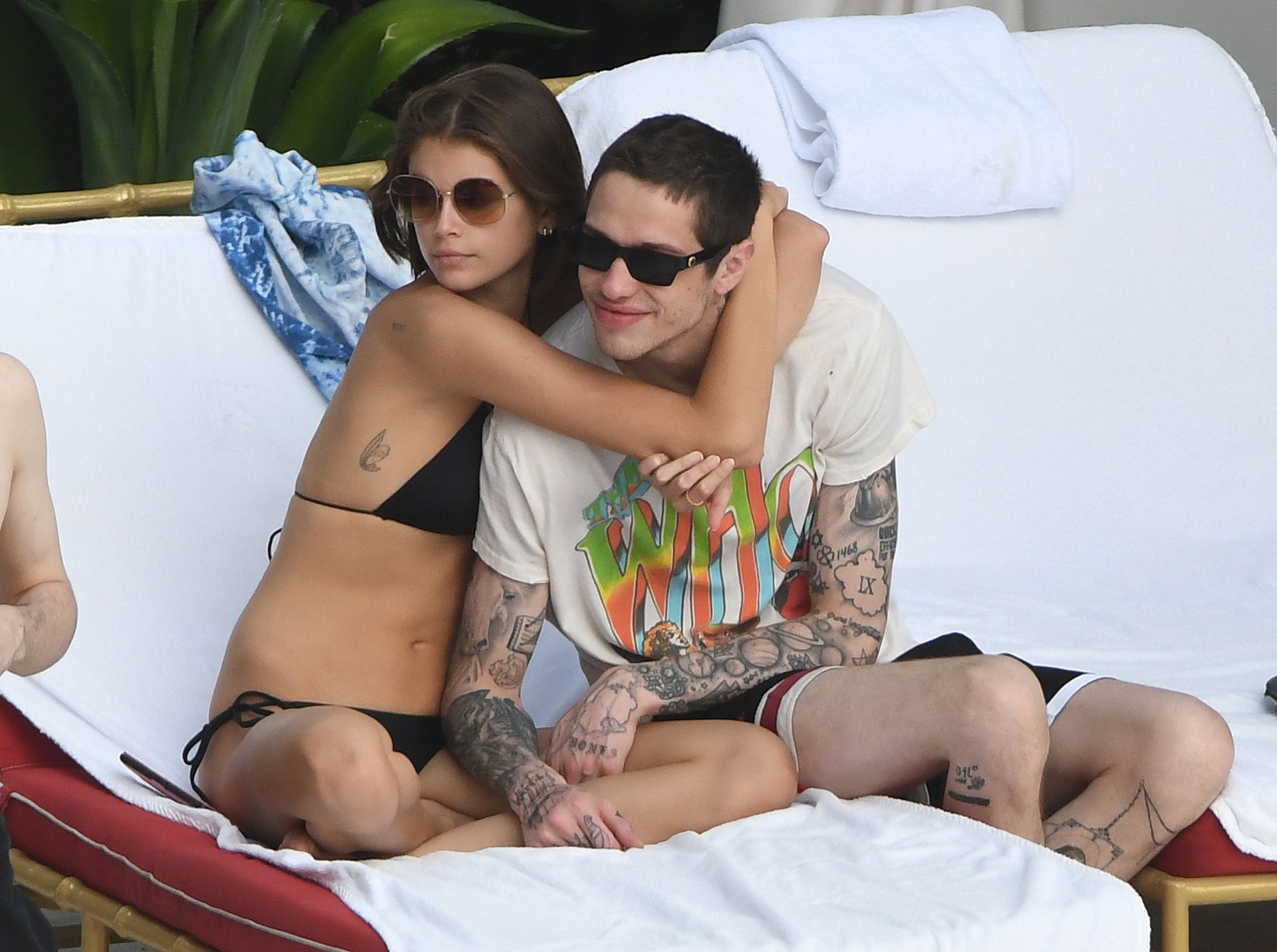 Cindy Crawford’s daughter, model Kaia Gerber wears a black bikini as she kisses boyfriend Pete Davidson by the pool in Miami, 11/23/2019.