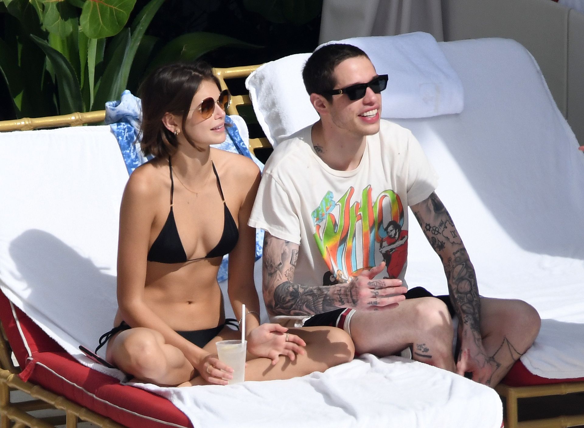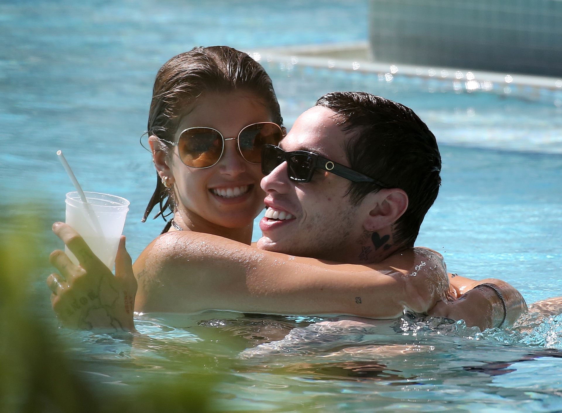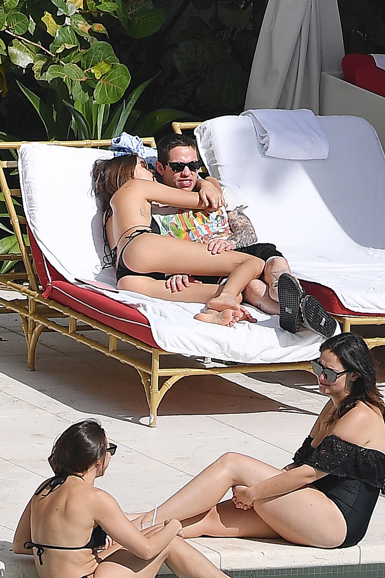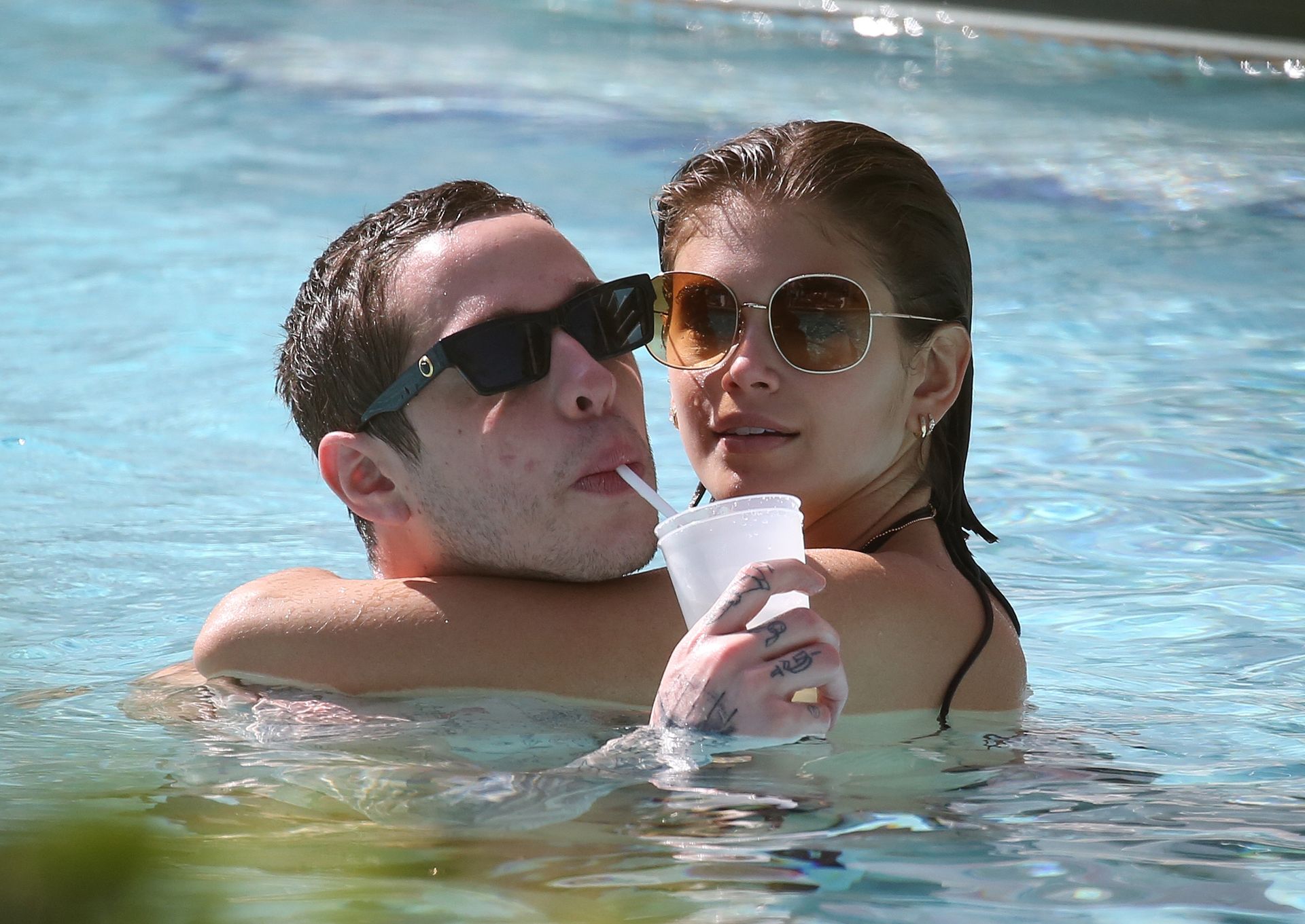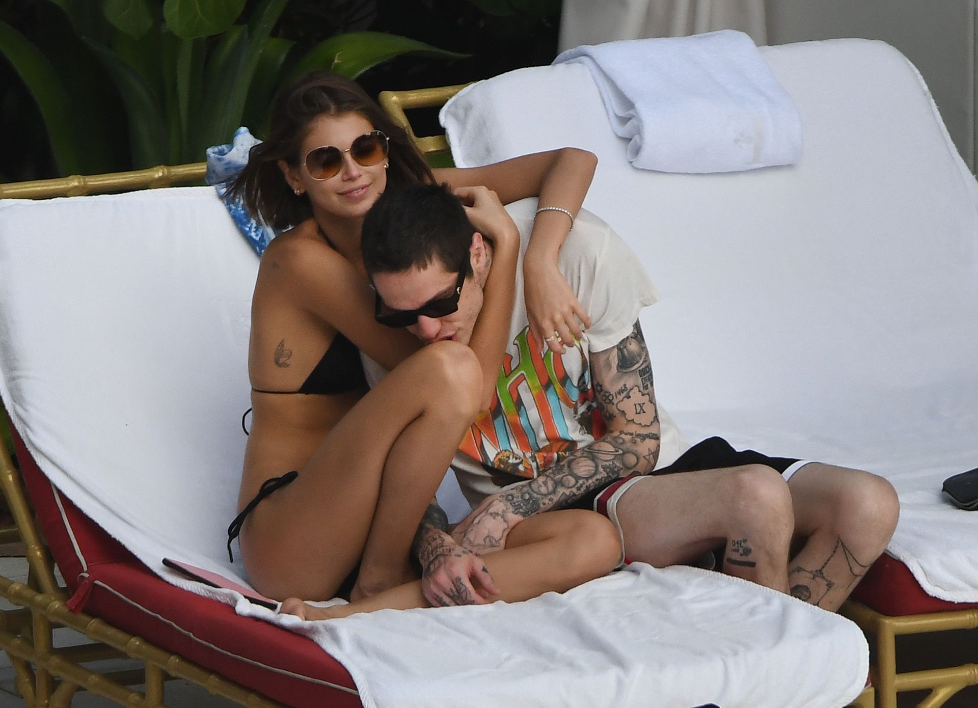Cindy Crawford’s daughter, model Kaia Gerber wears a black bikini as she kisses boyfriend Pete Davidson by the pool in Miami, 11/23/2019.