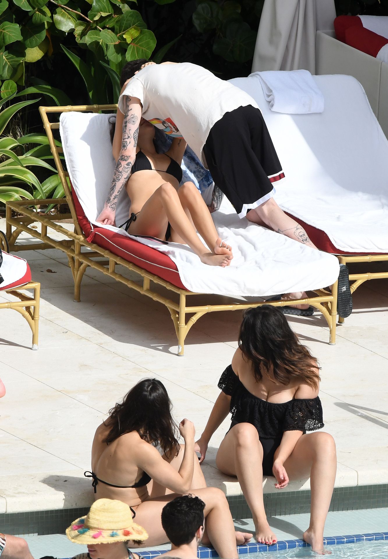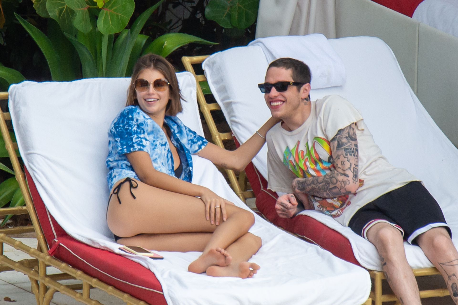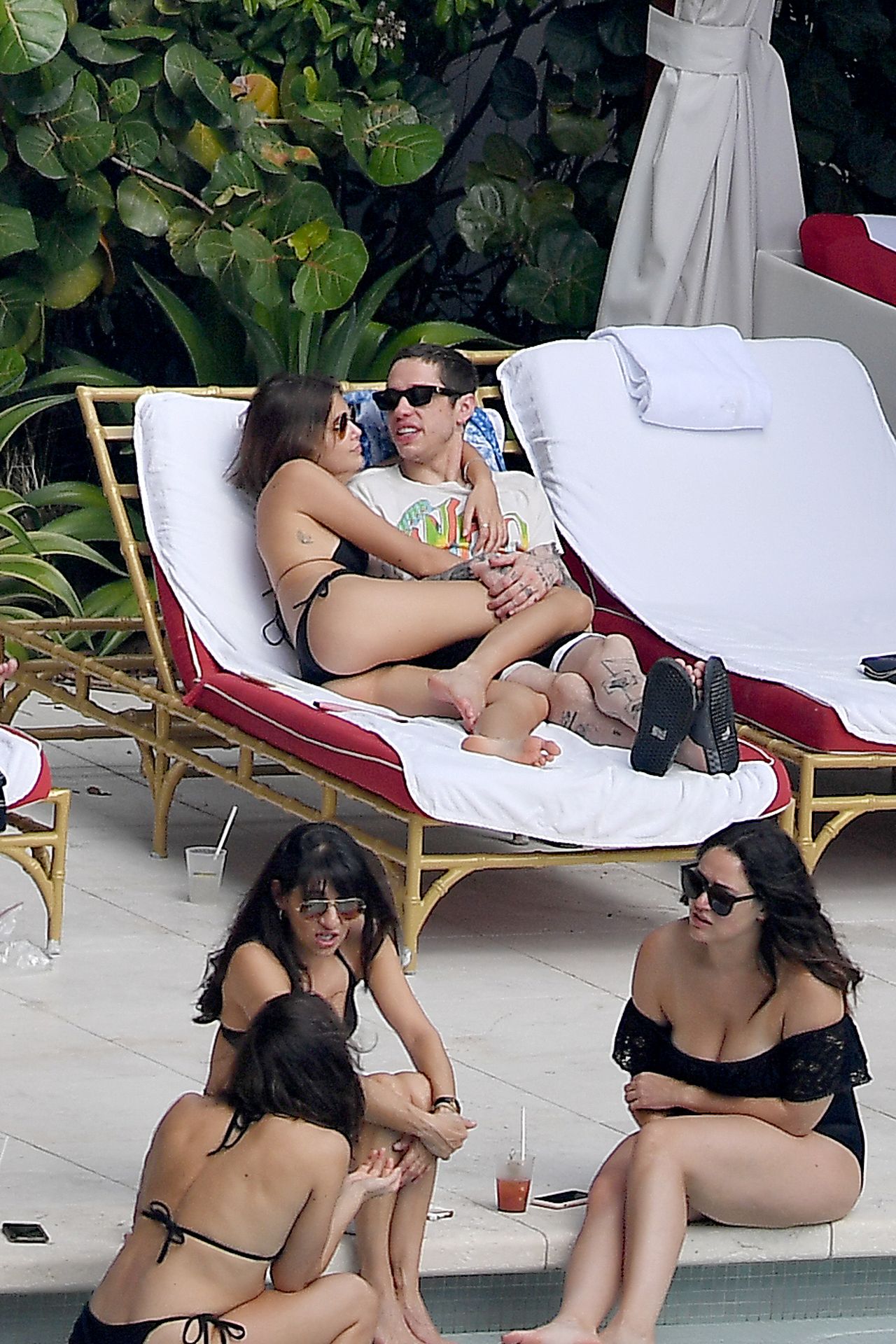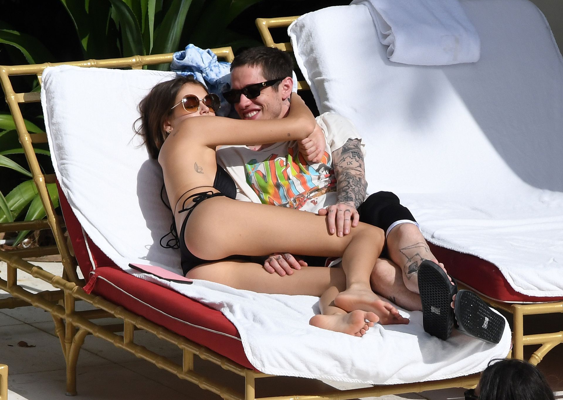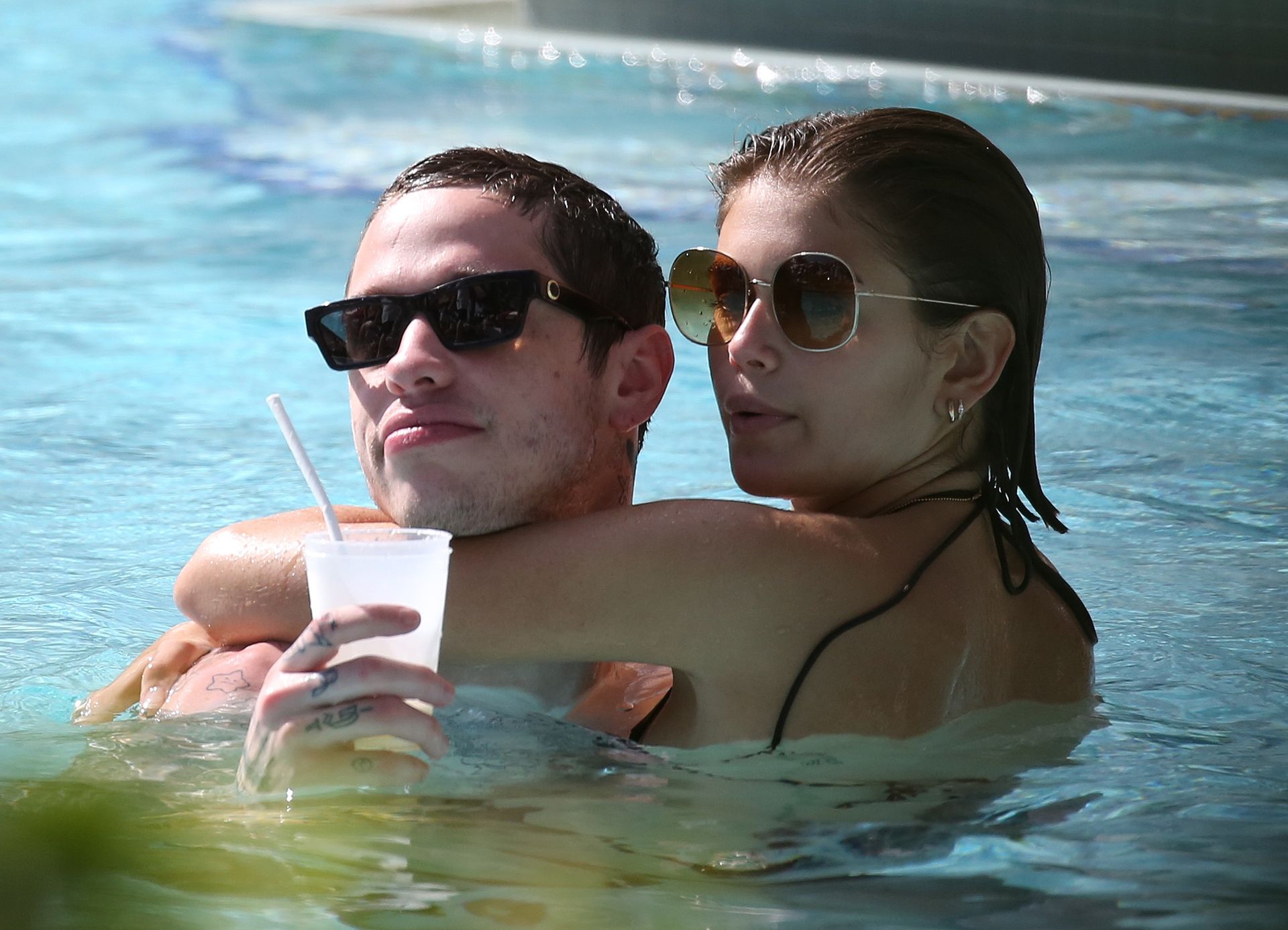 Cindy Crawford’s daughter, model Kaia Gerber wears a black bikini as she kisses boyfriend Pete Davidson by the pool in Miami, 11/23/2019.
