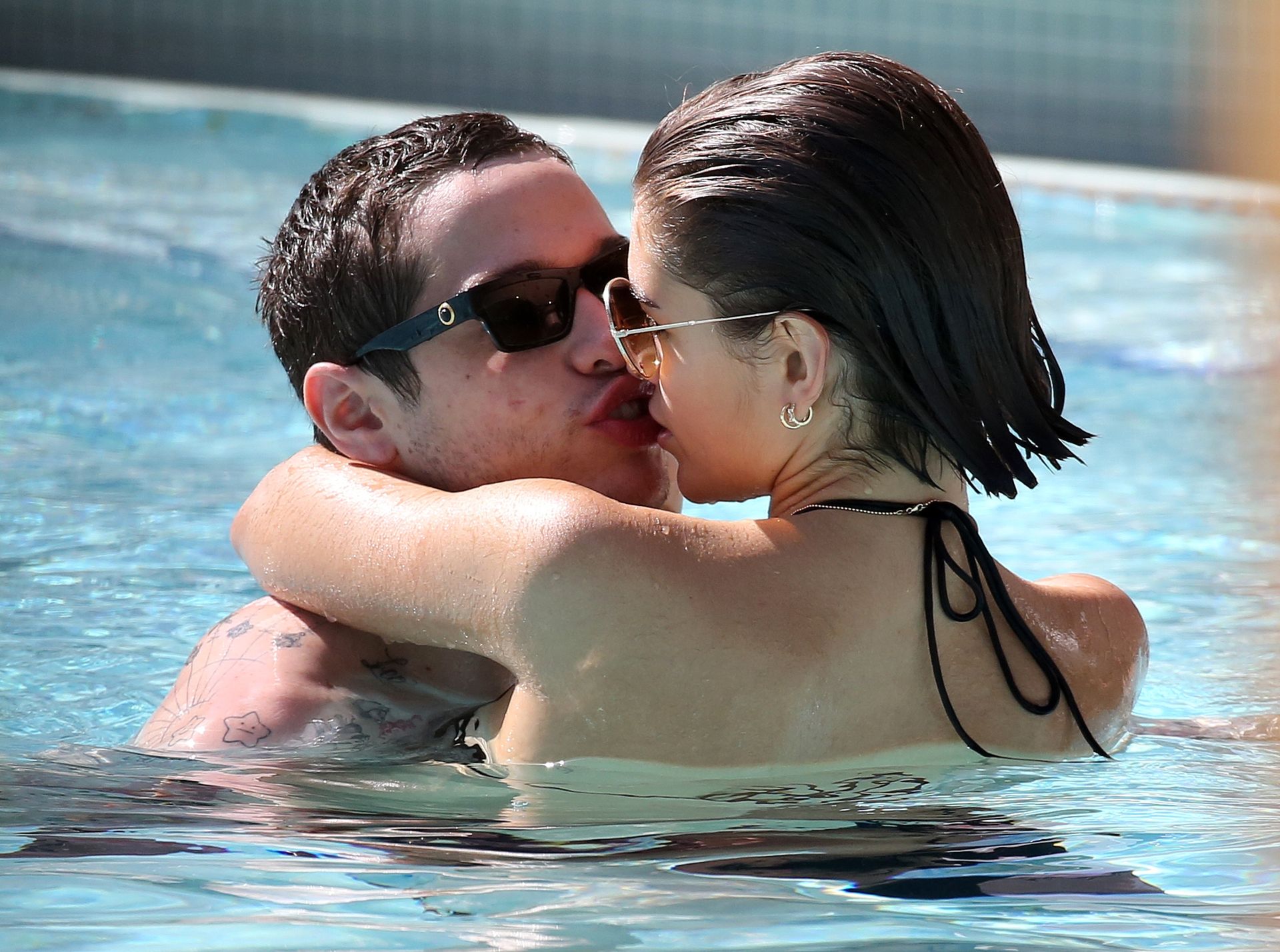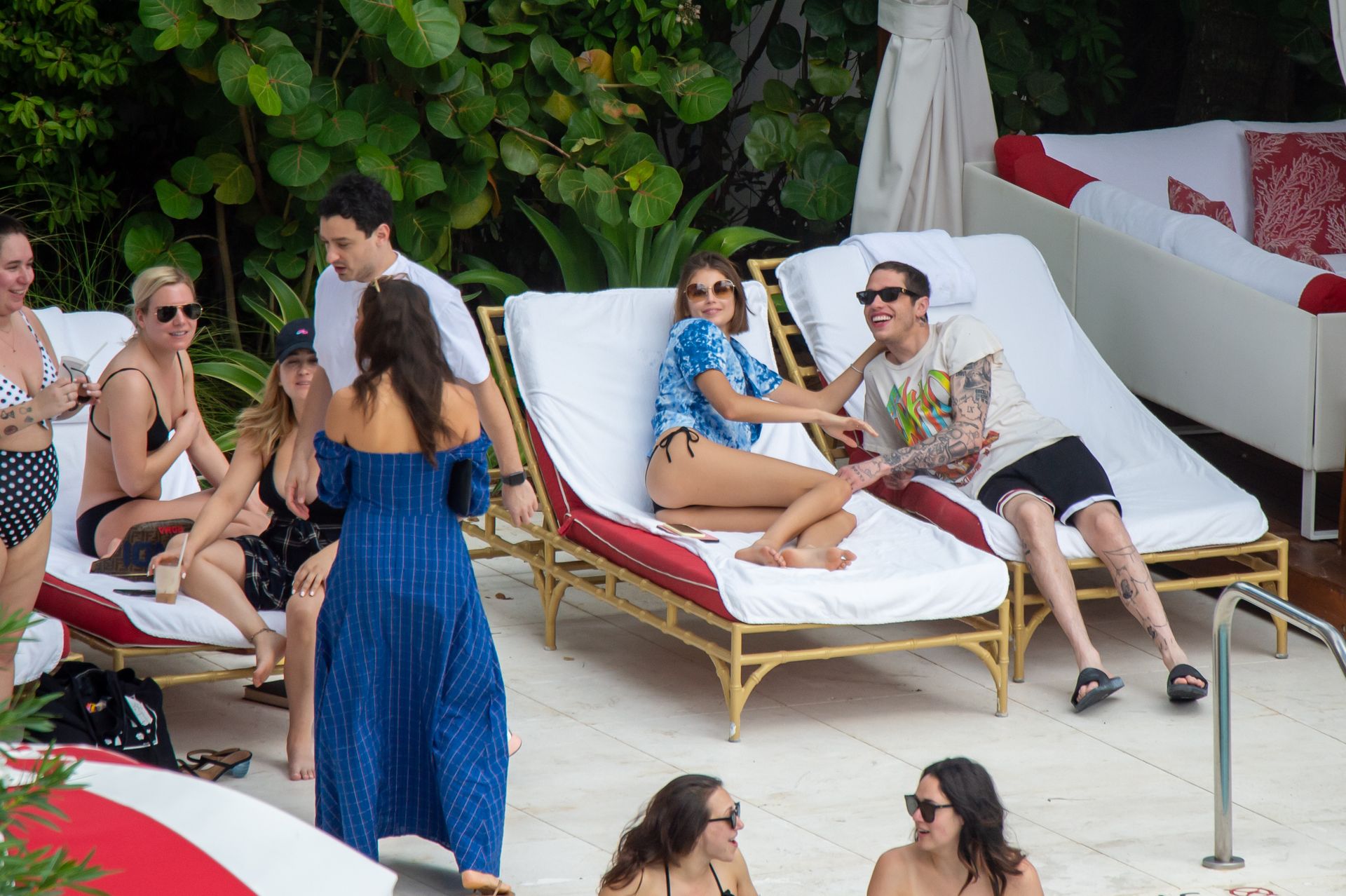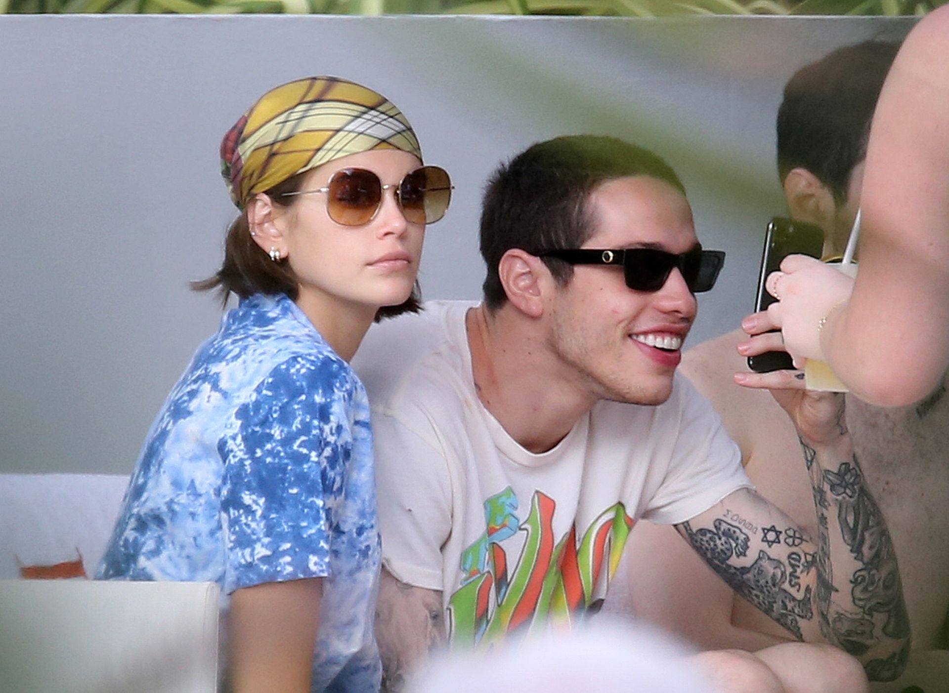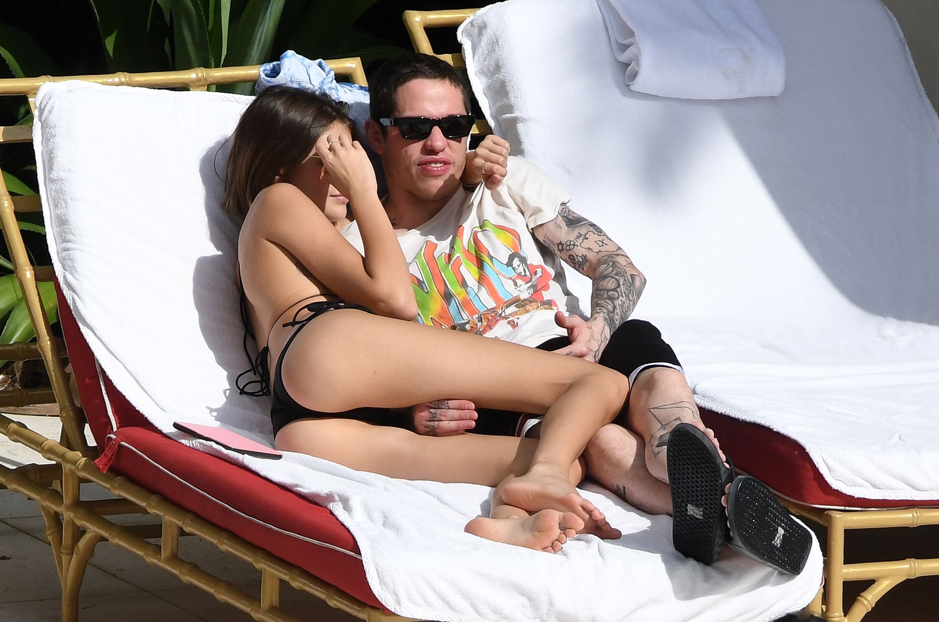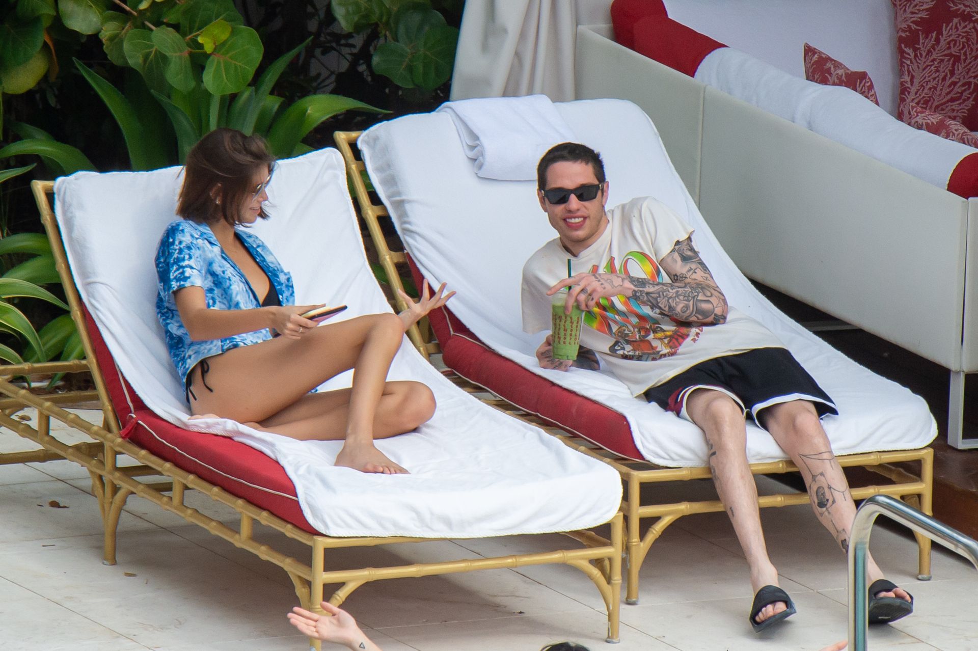Cindy Crawford’s daughter, model Kaia Gerber wears a black bikini as she kisses boyfriend Pete Davidson by the pool in Miami, 11/23/2019.