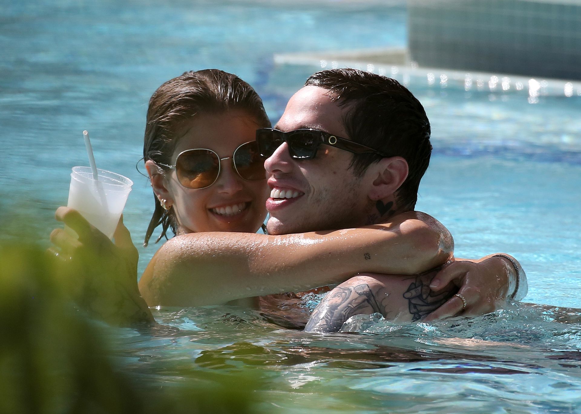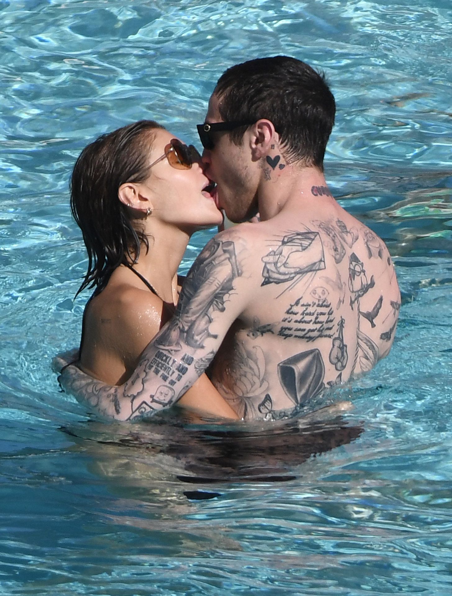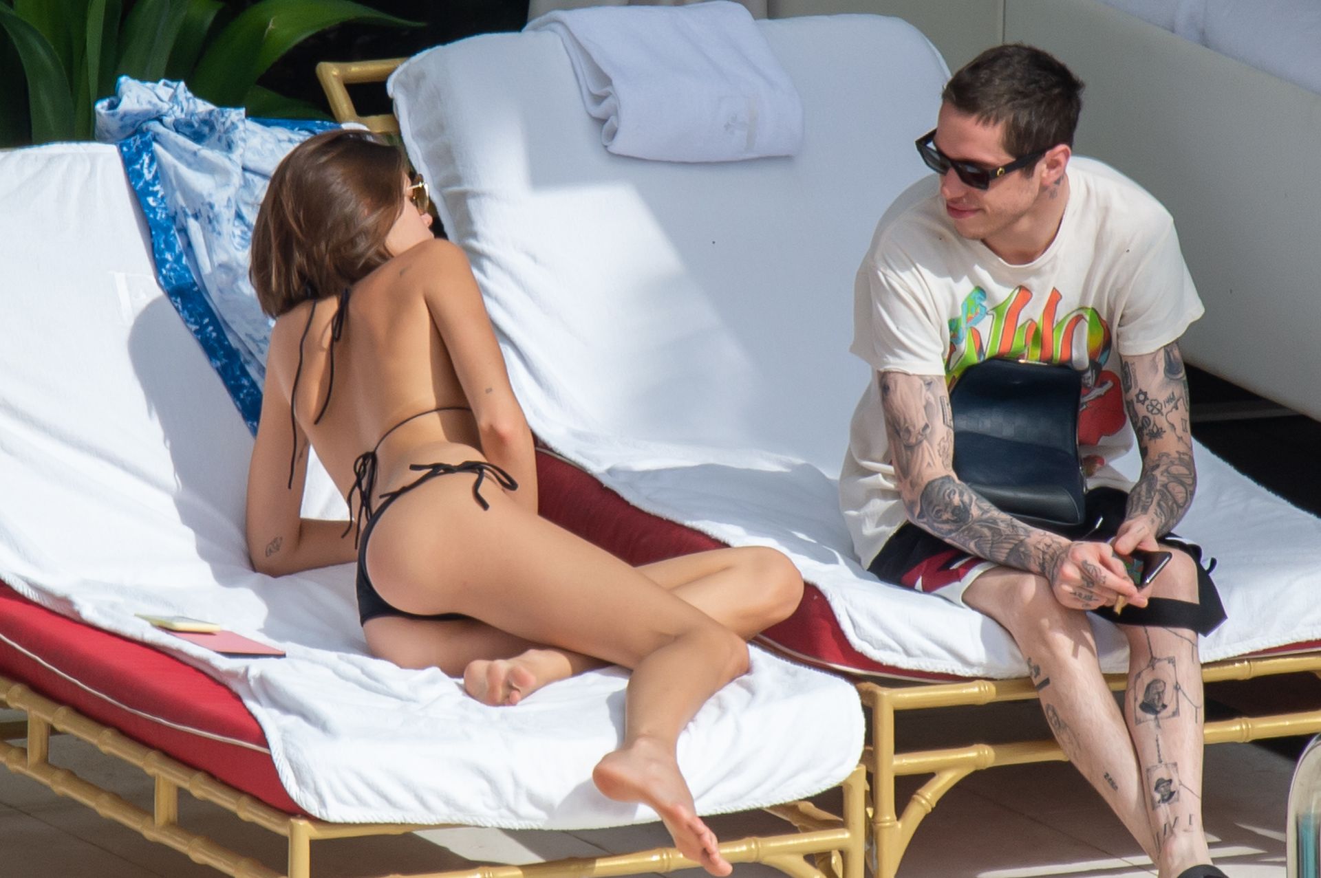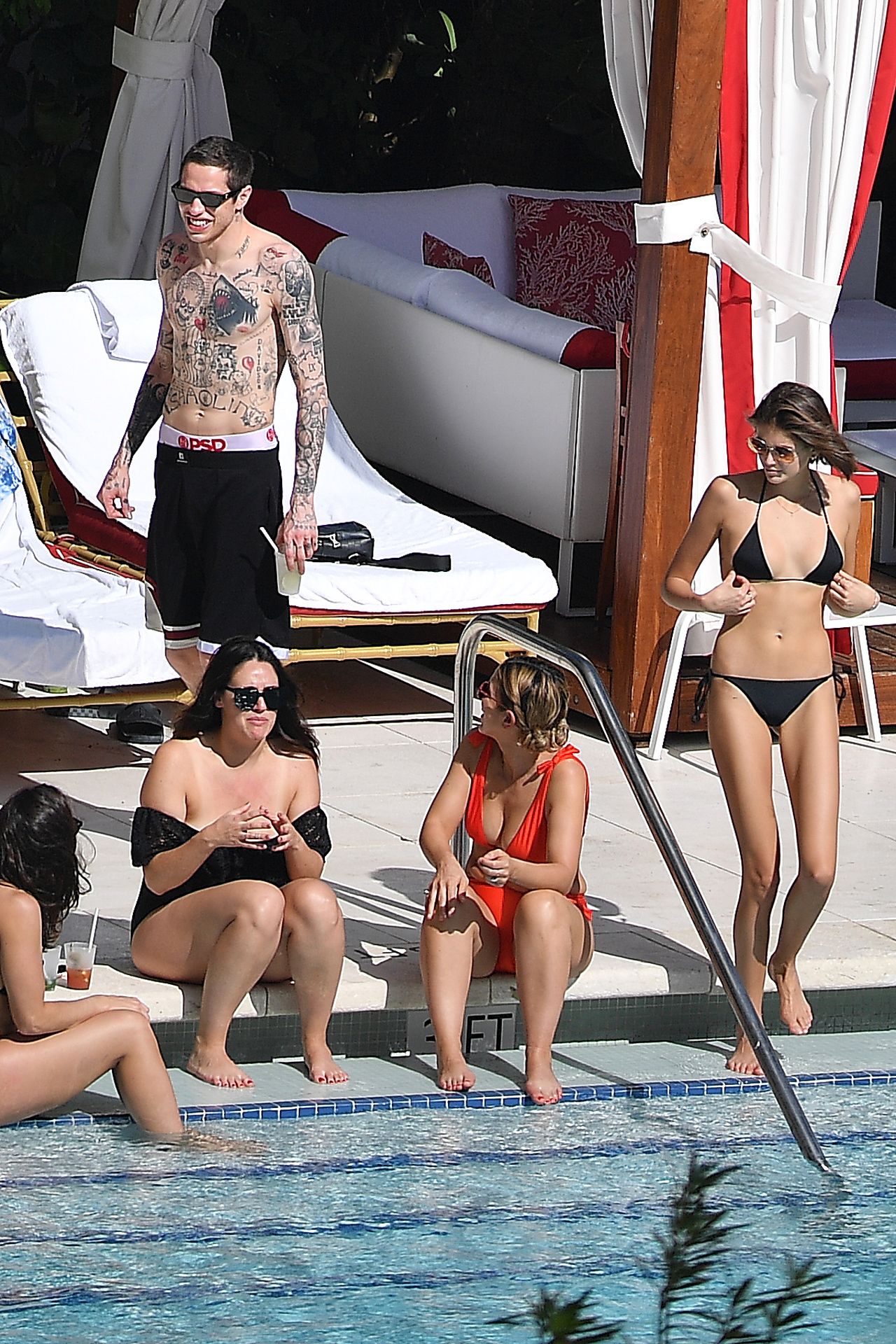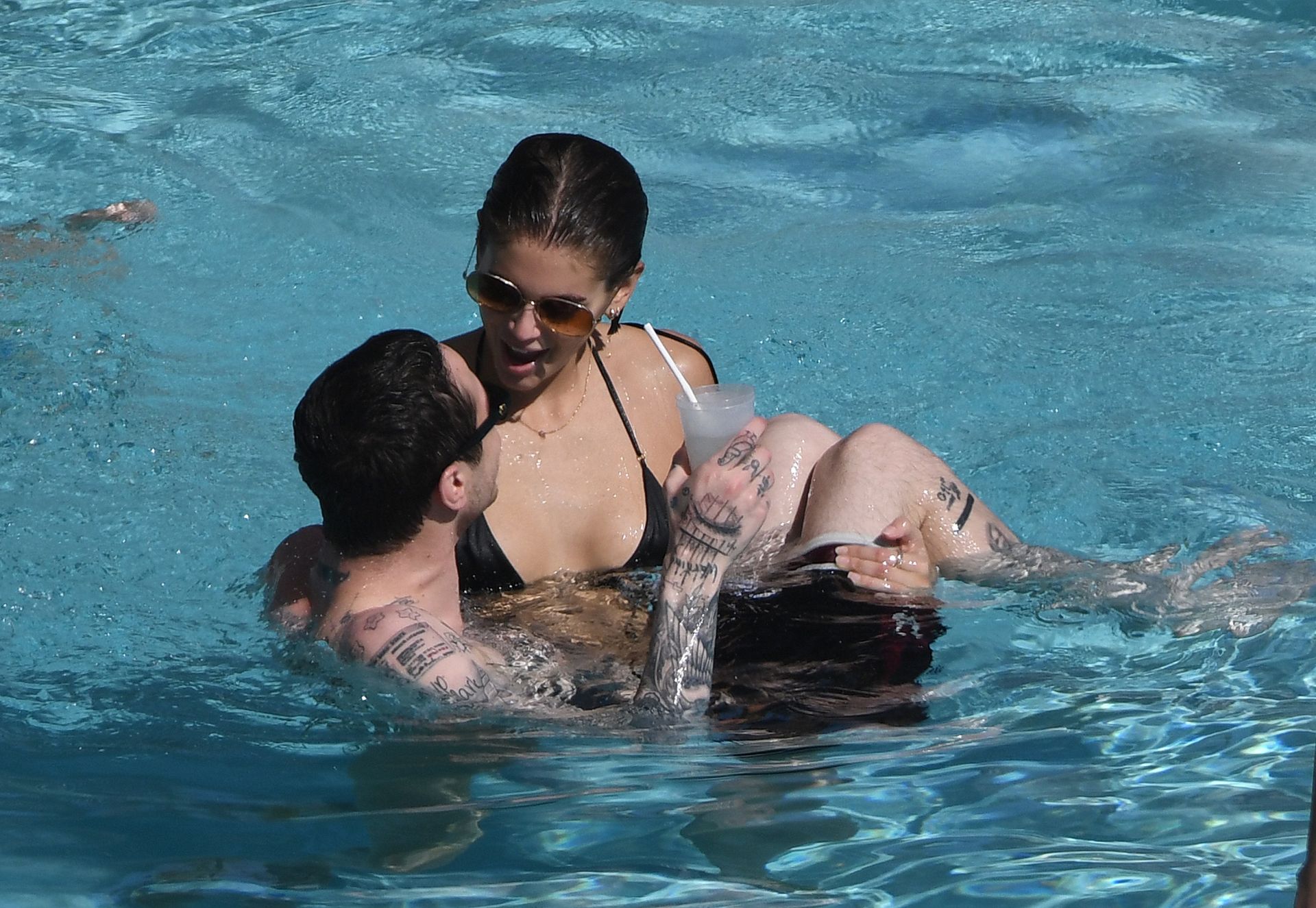 Cindy Crawford’s daughter, model Kaia Gerber wears a black bikini as she kisses boyfriend Pete Davidson by the pool in Miami, 11/23/2019.