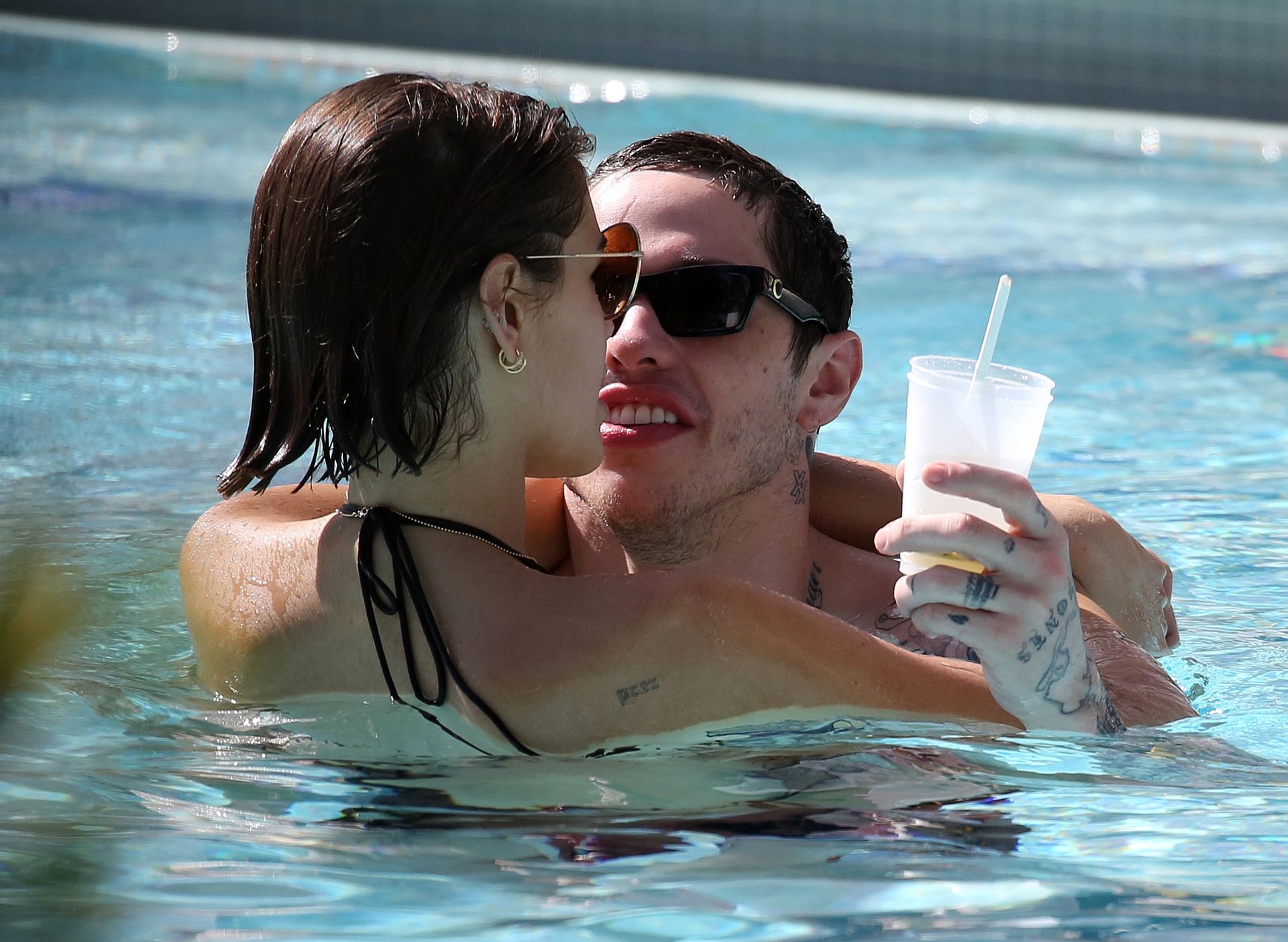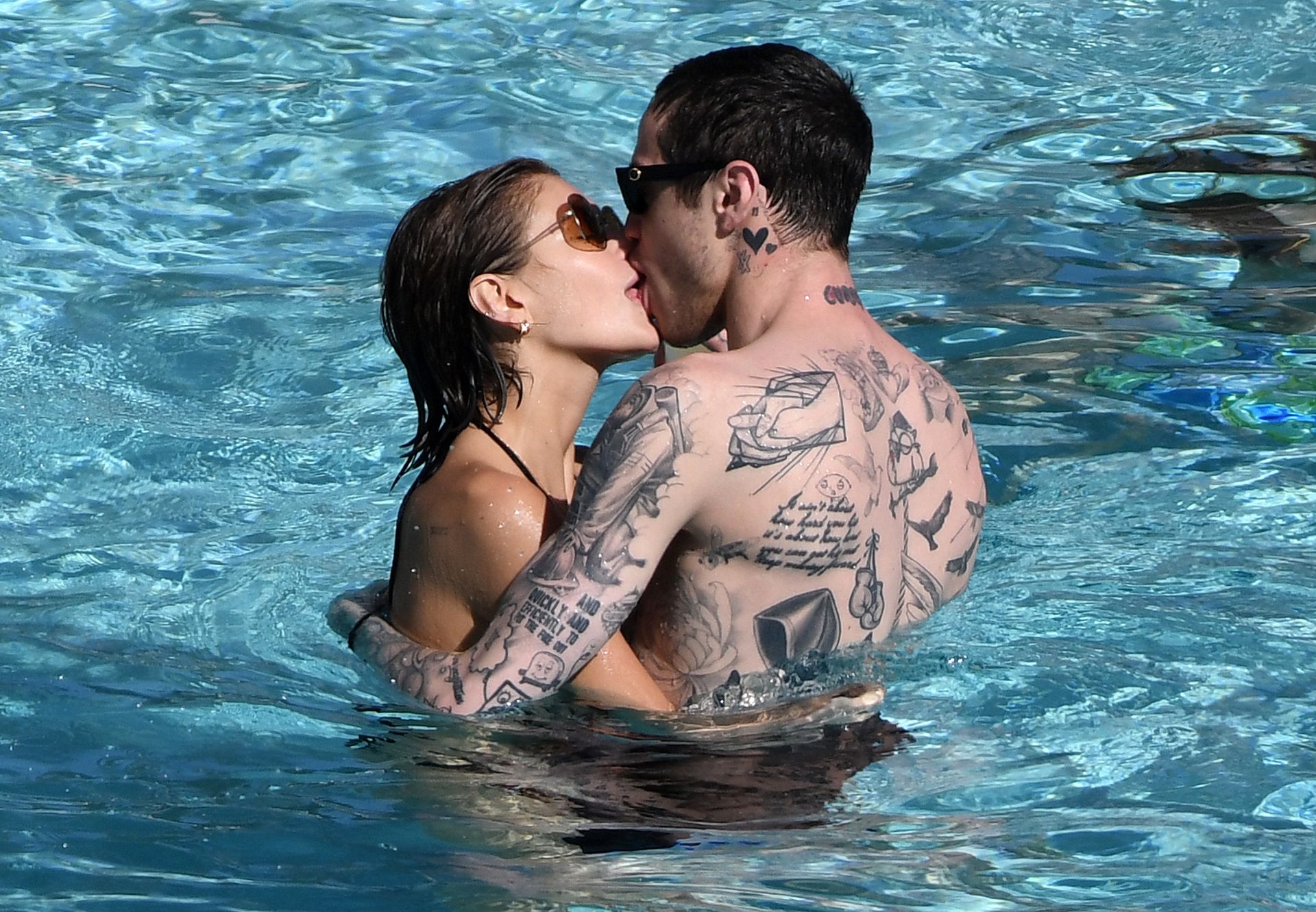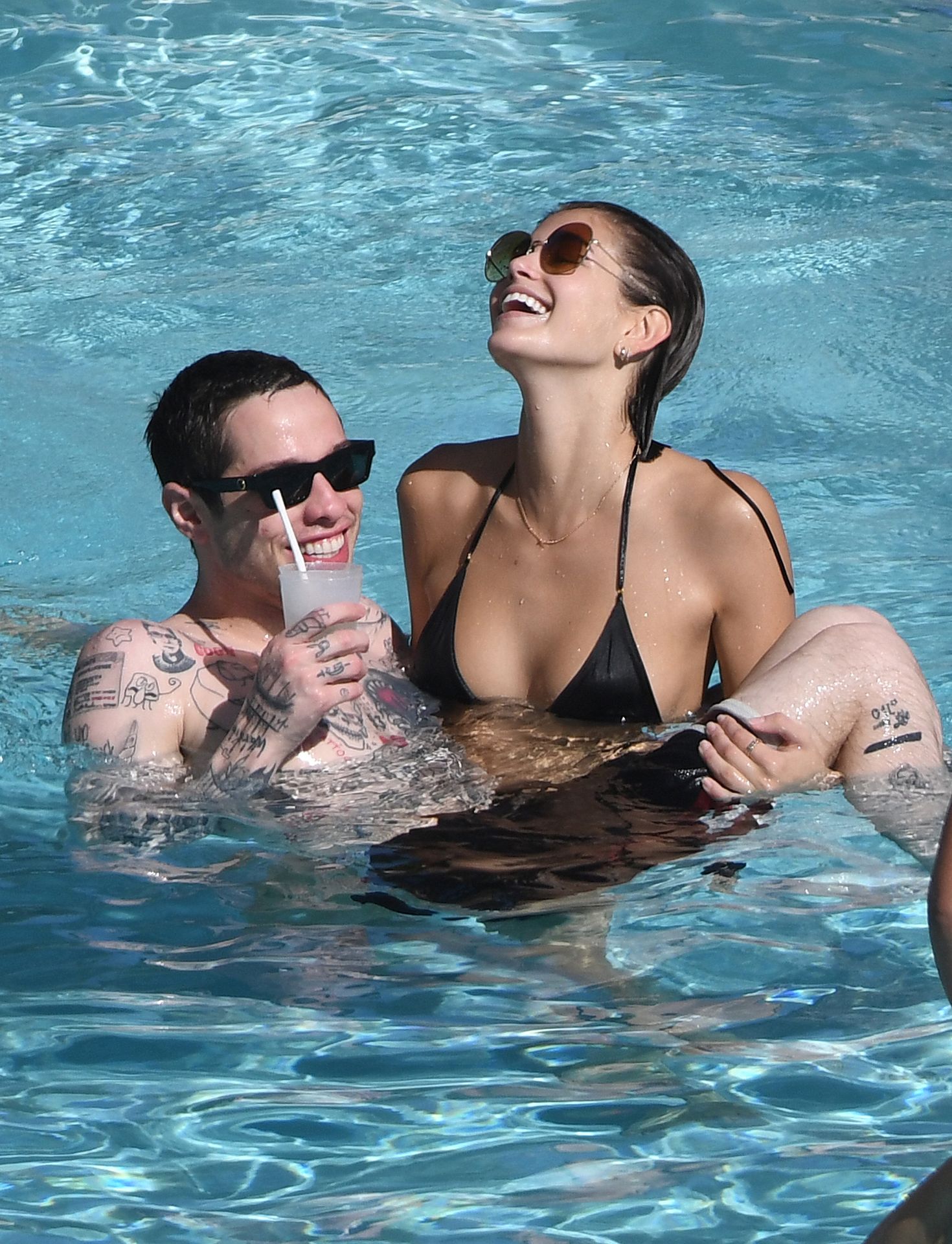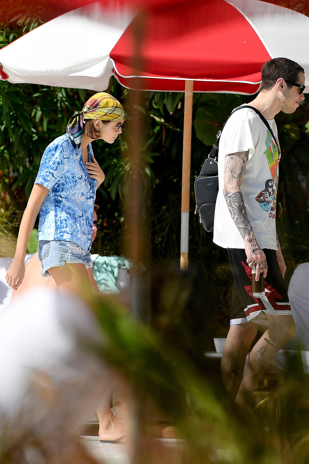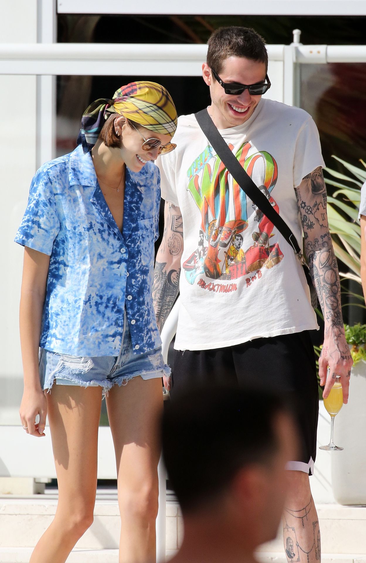 Cindy Crawford’s daughter, model Kaia Gerber wears a black bikini as she kisses boyfriend Pete Davidson by the pool in Miami, 11/23/2019.