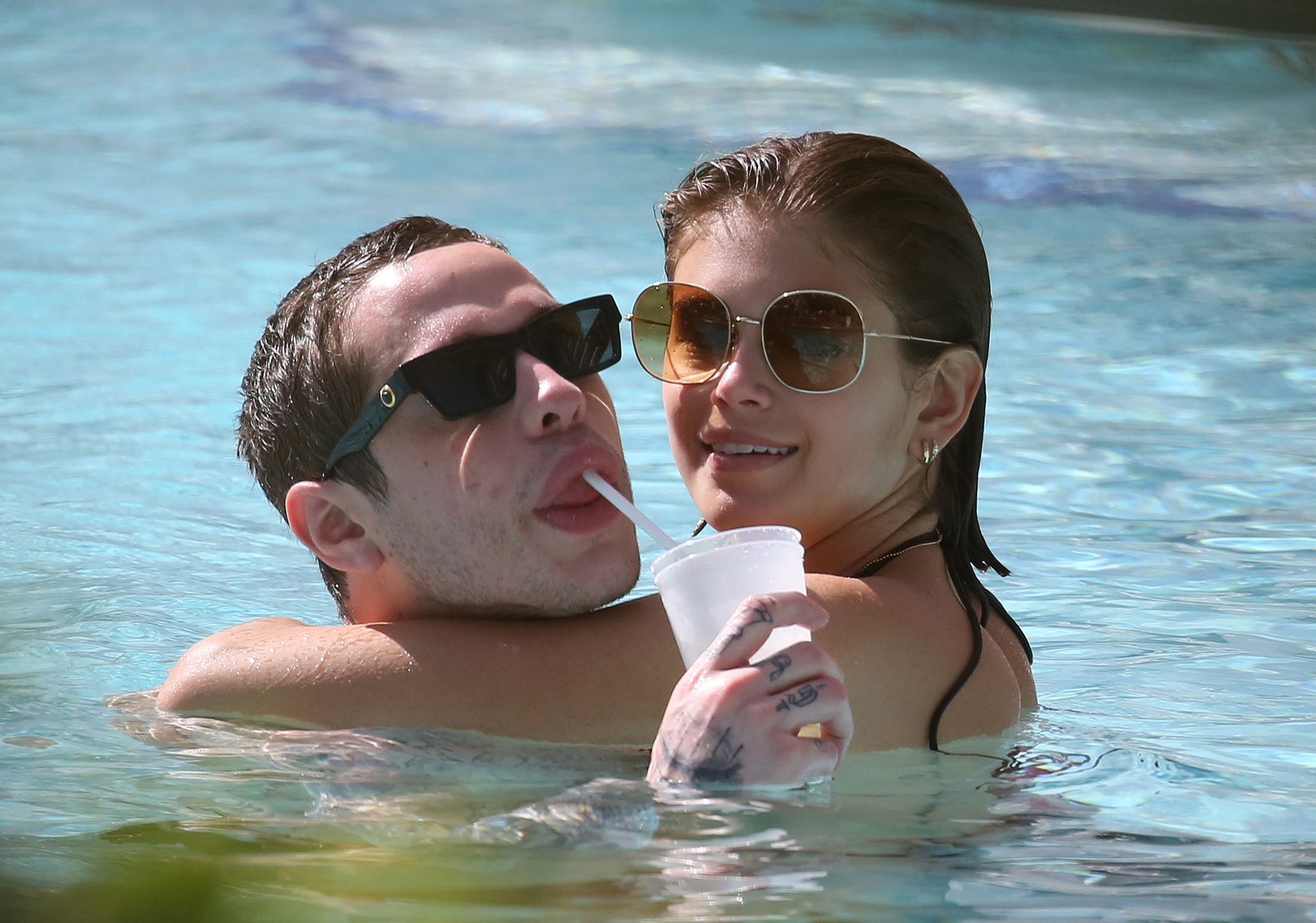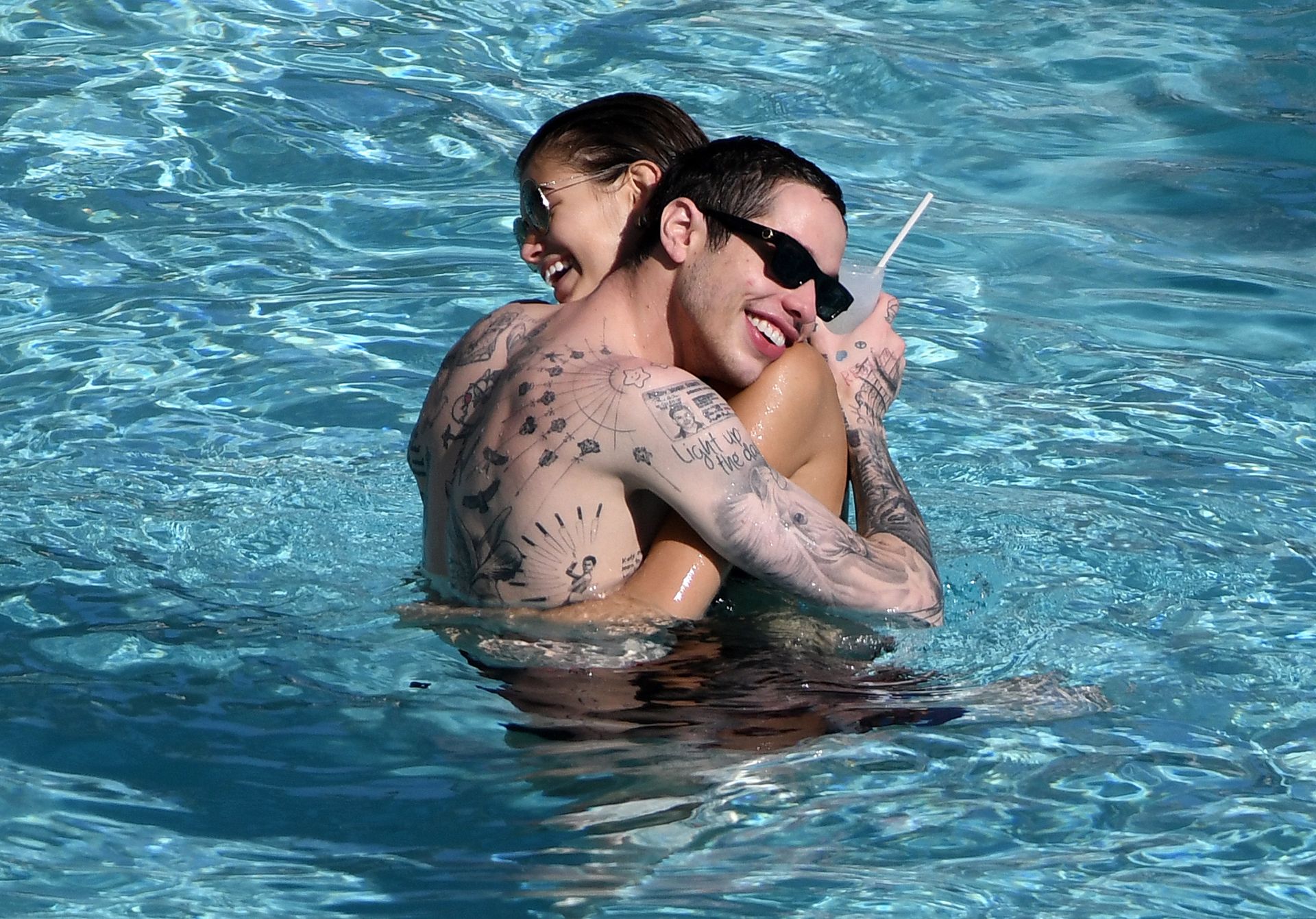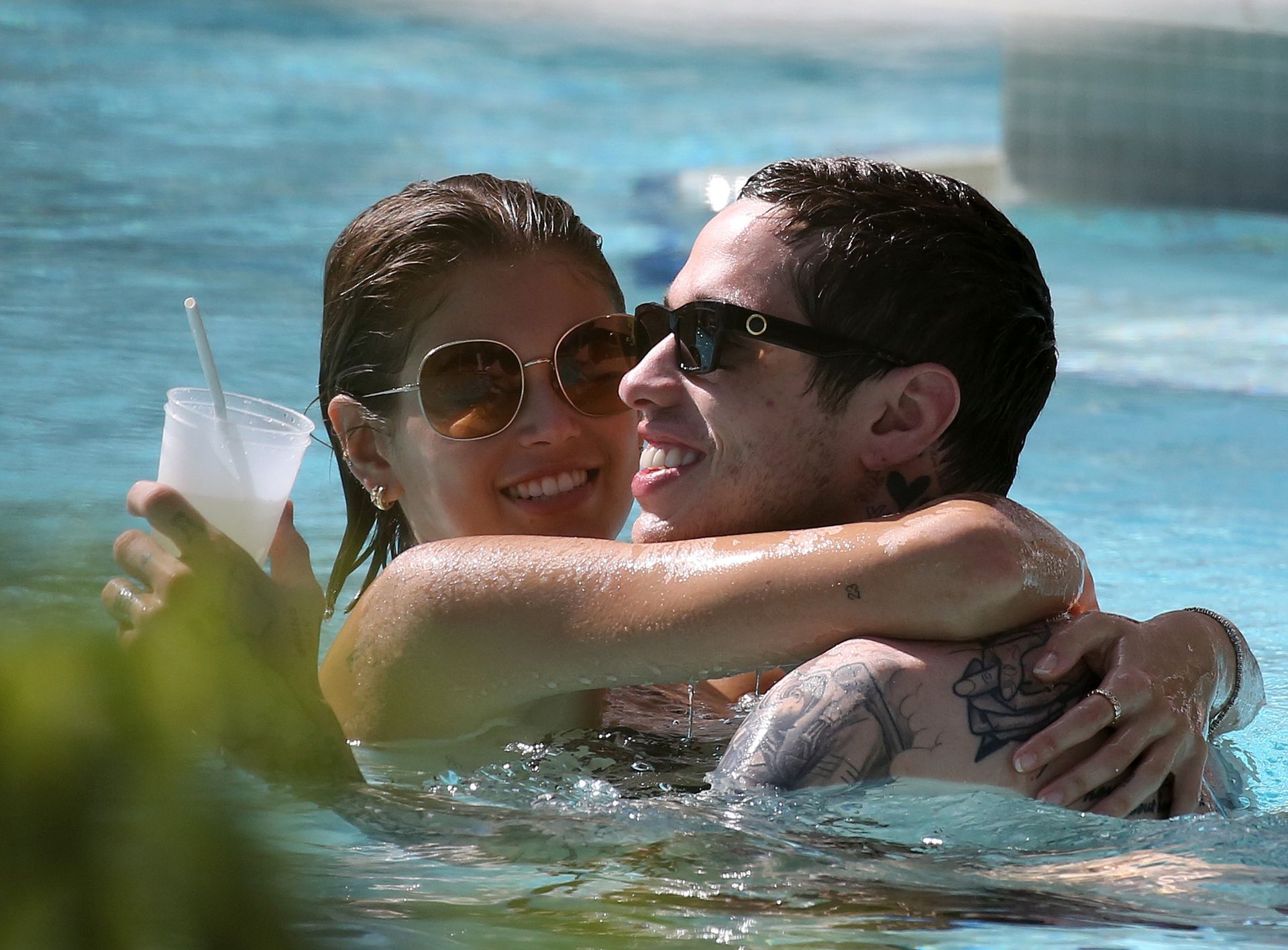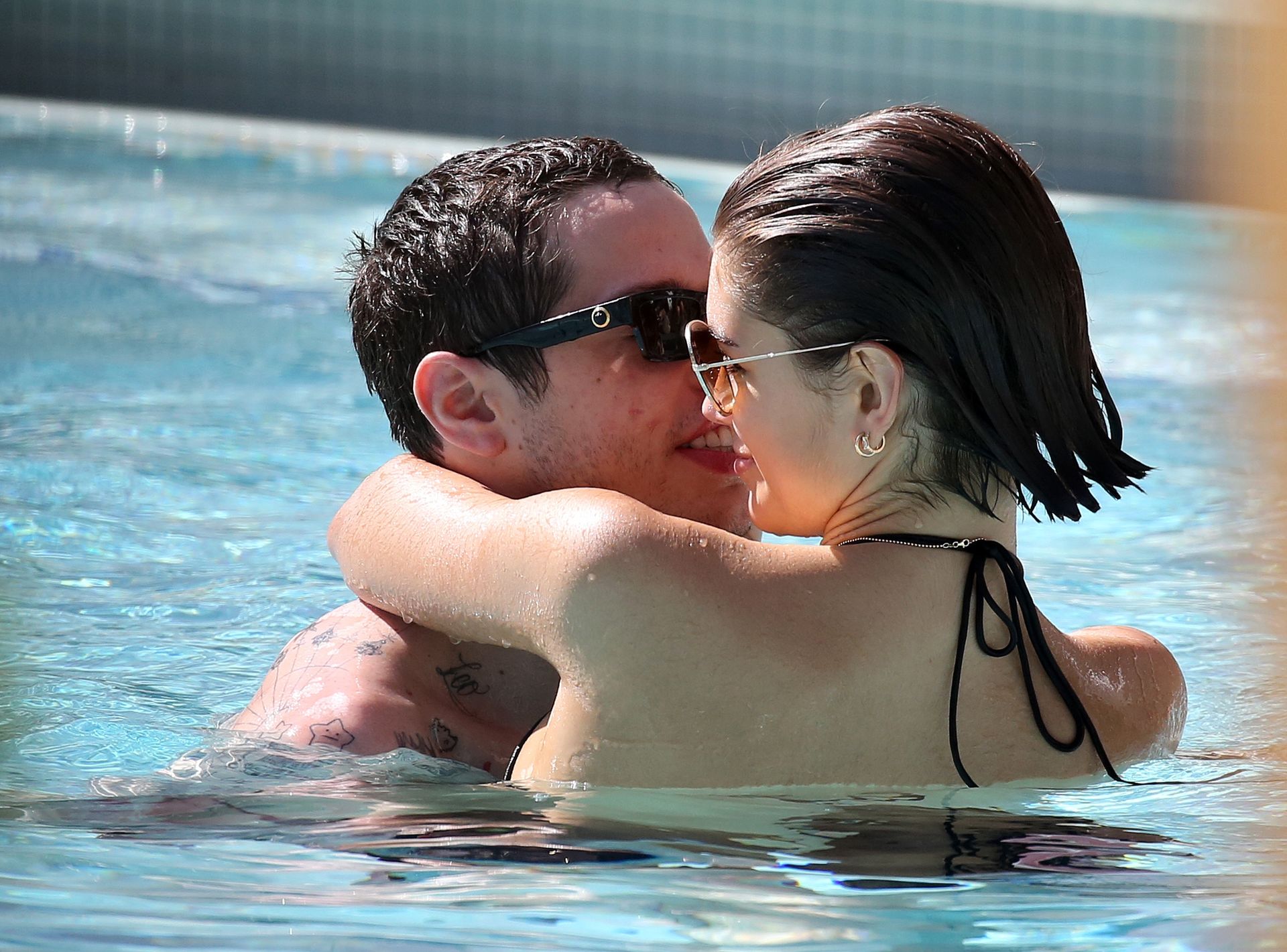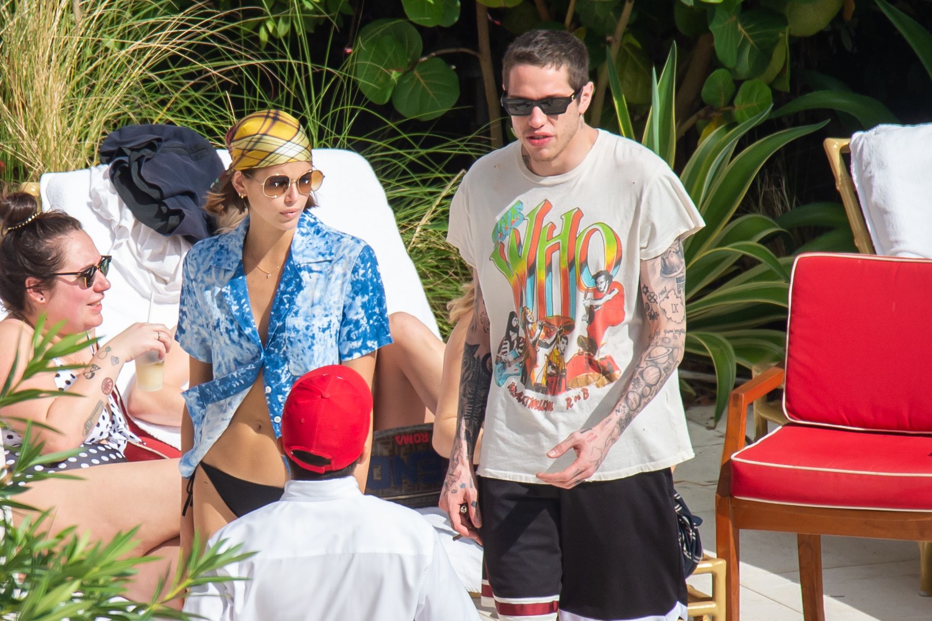 Cindy Crawford’s daughter, model Kaia Gerber wears a black bikini as she kisses boyfriend Pete Davidson by the pool in Miami, 11/23/2019.