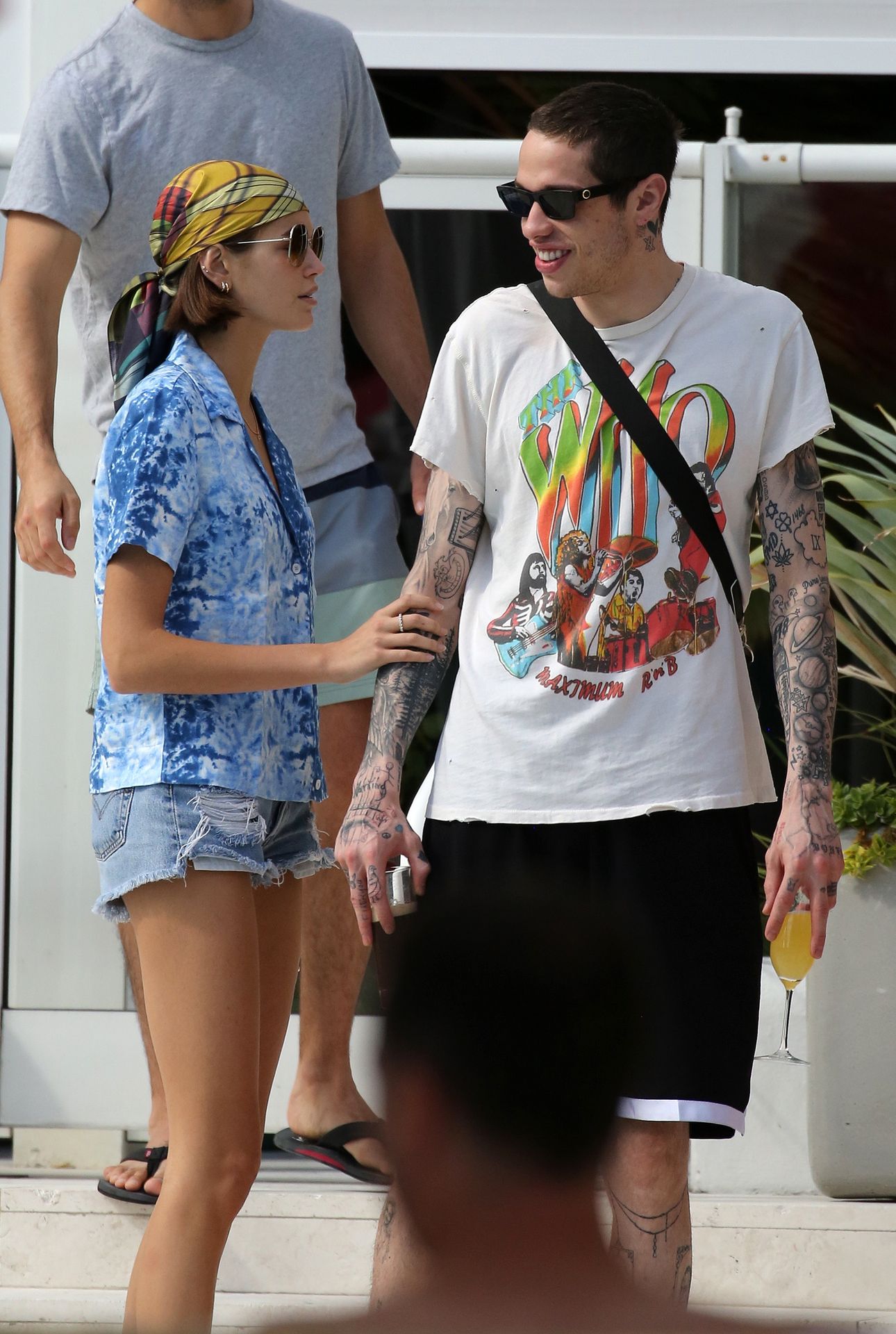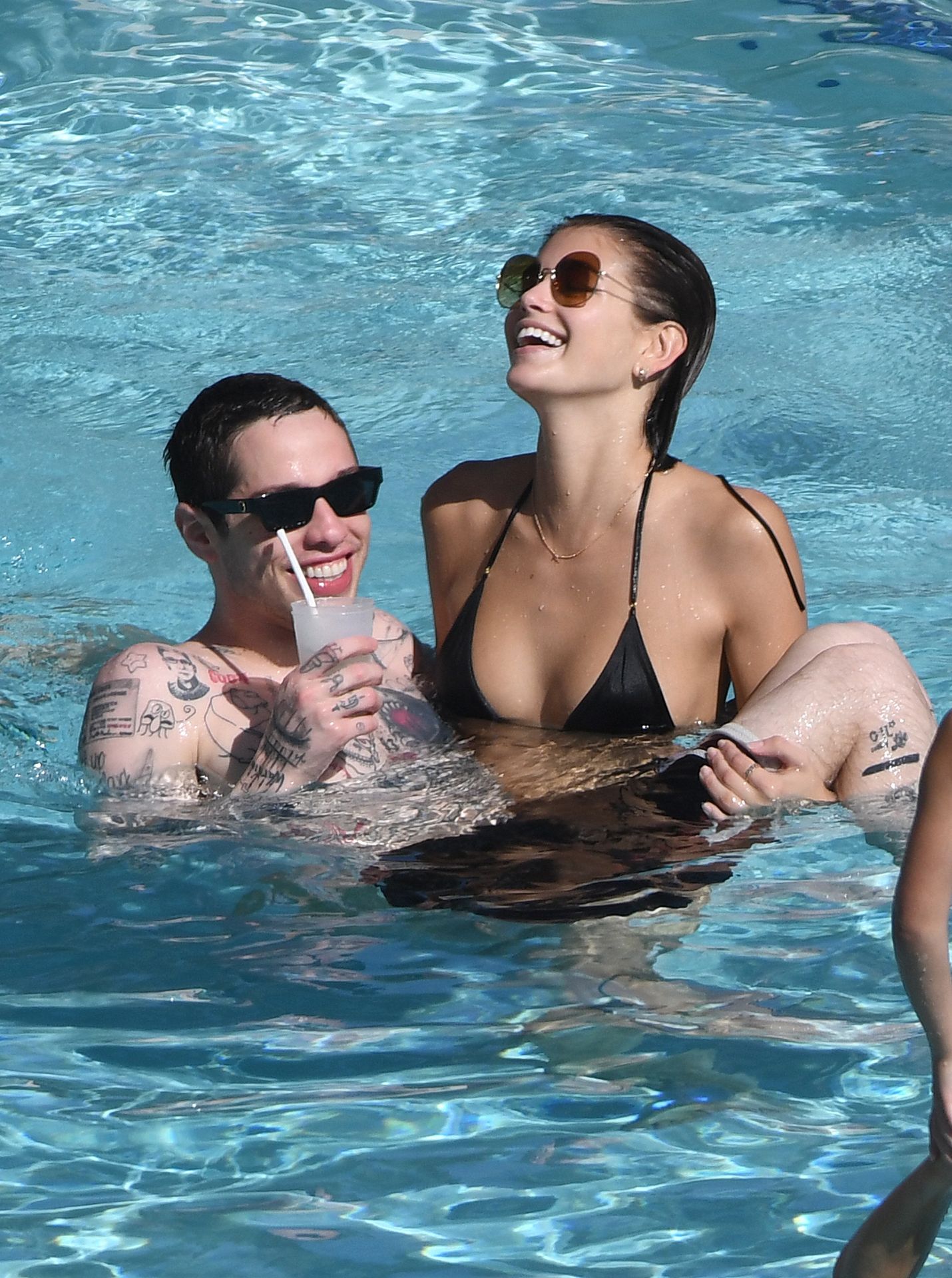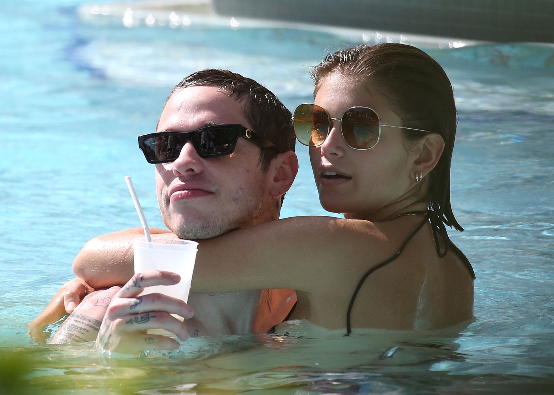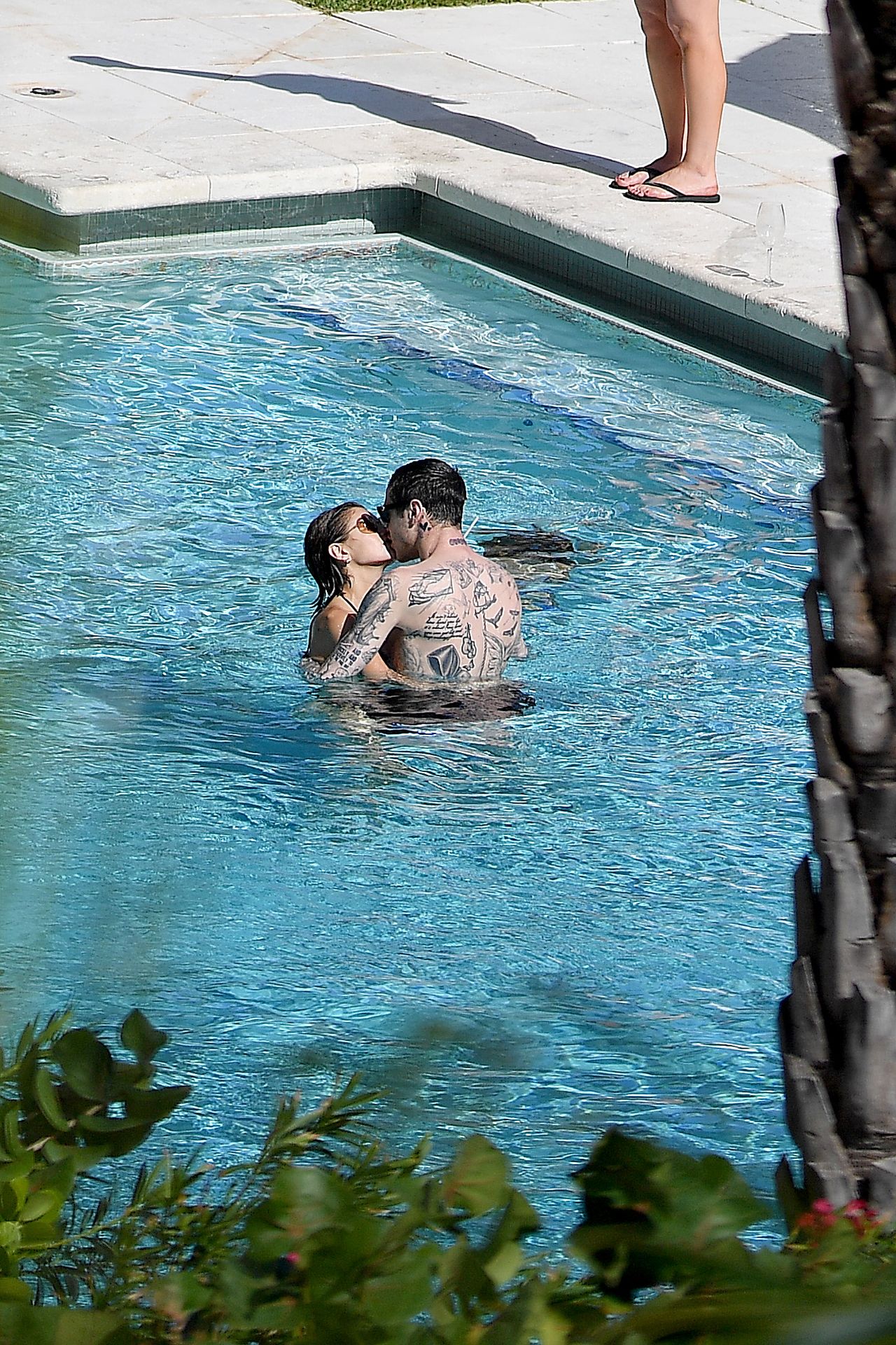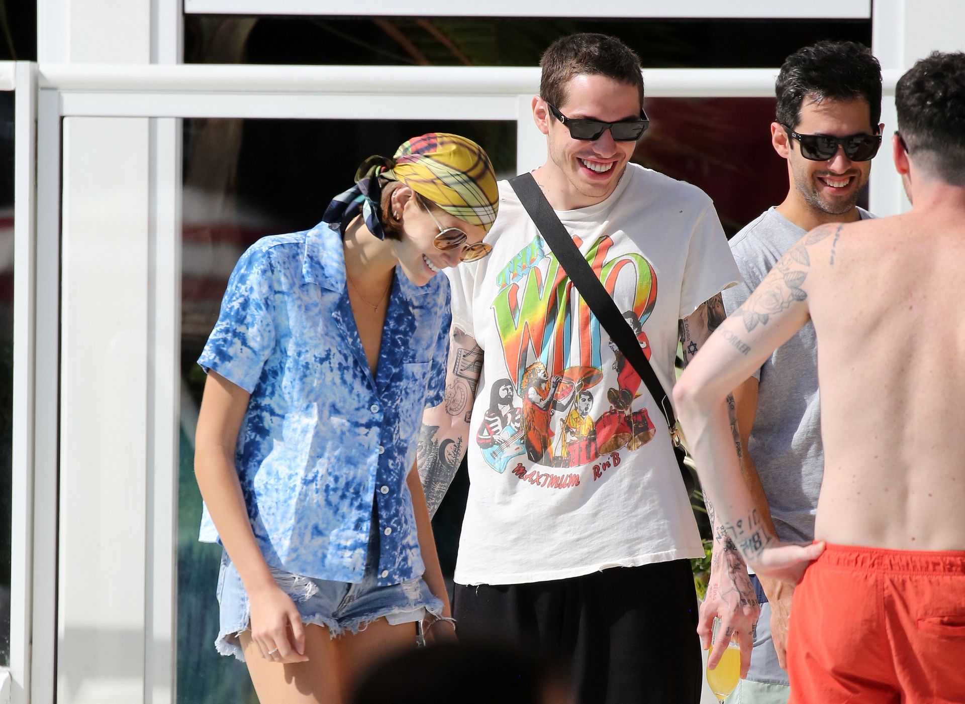 Cindy Crawford’s daughter, model Kaia Gerber wears a black bikini as she kisses boyfriend Pete Davidson by the pool in Miami, 11/23/2019.