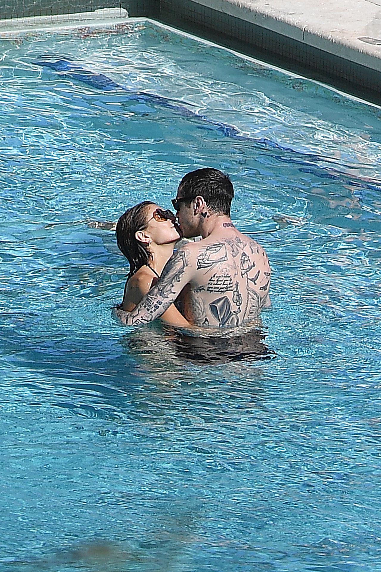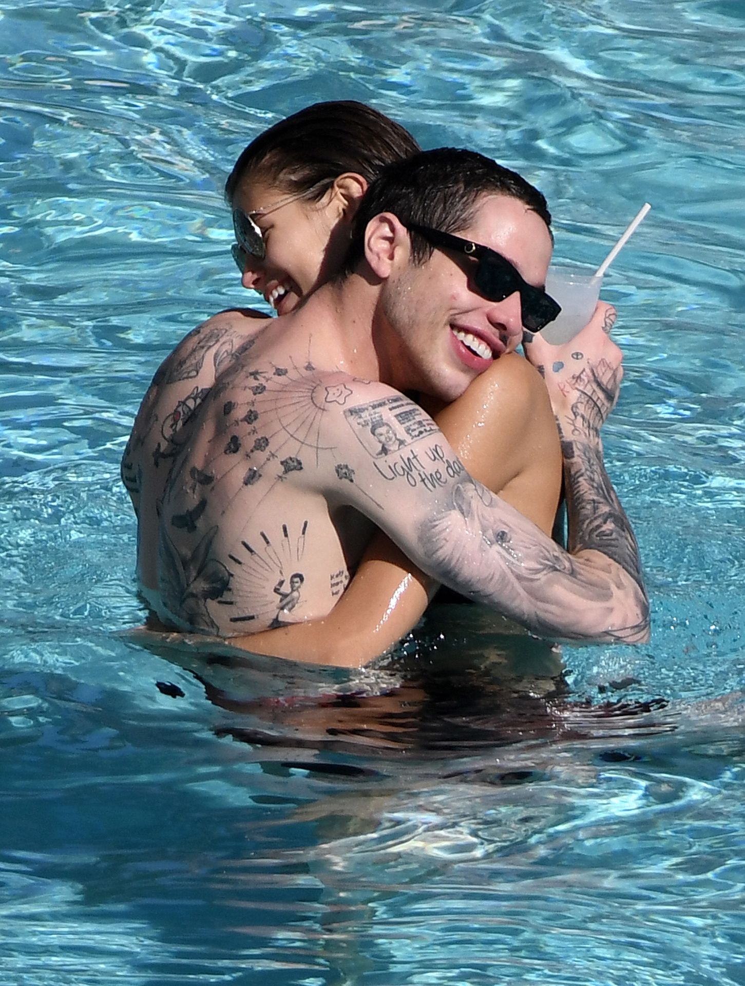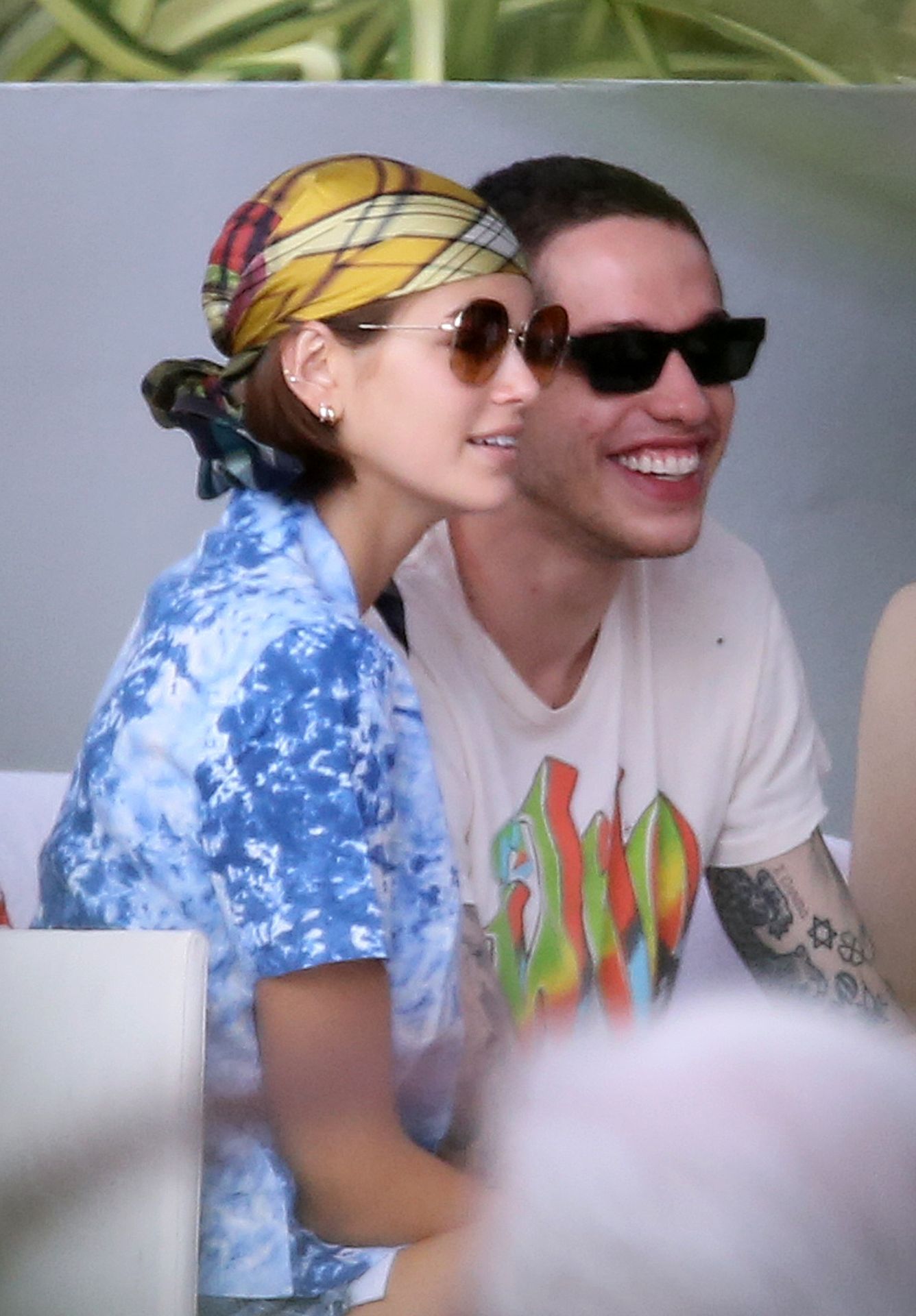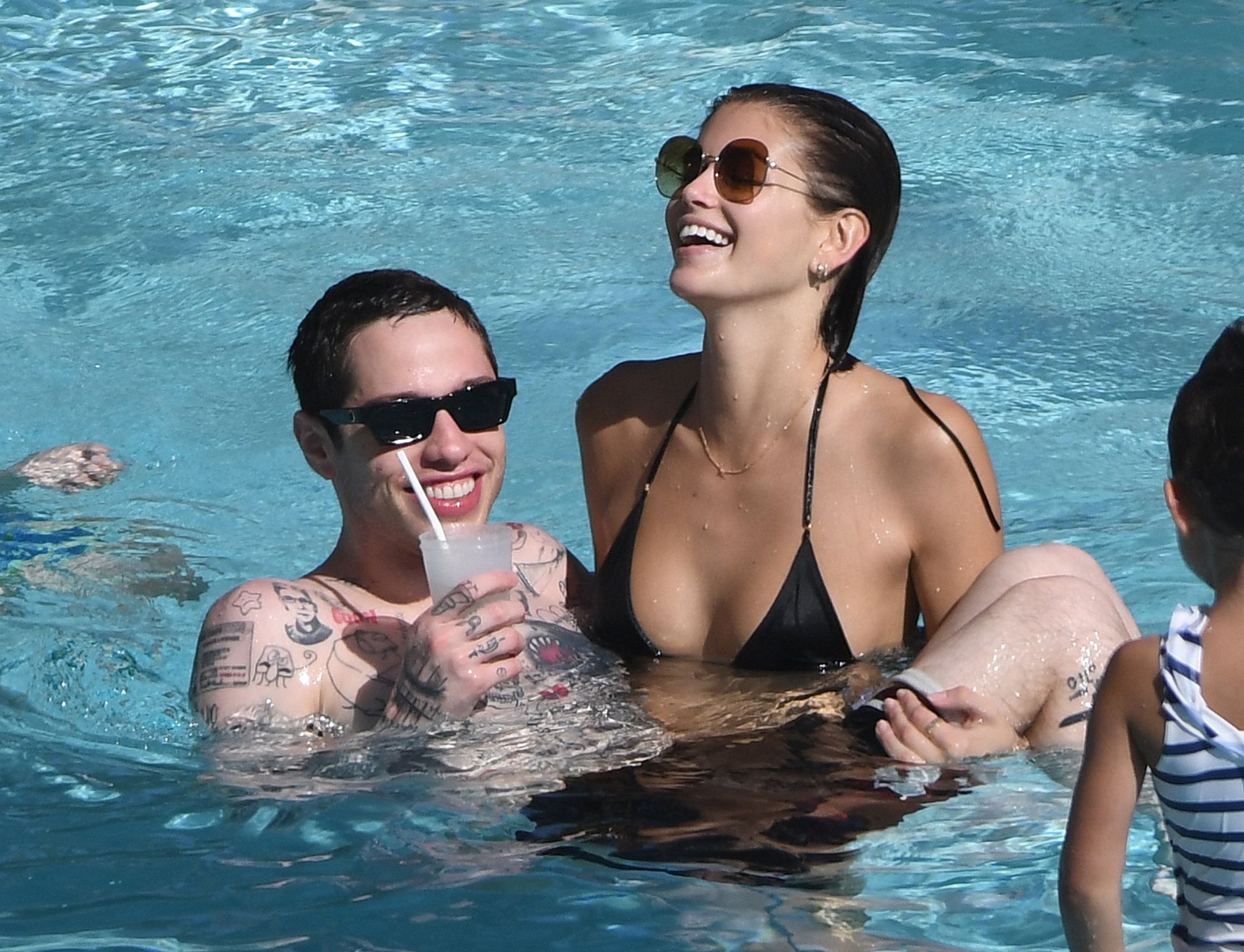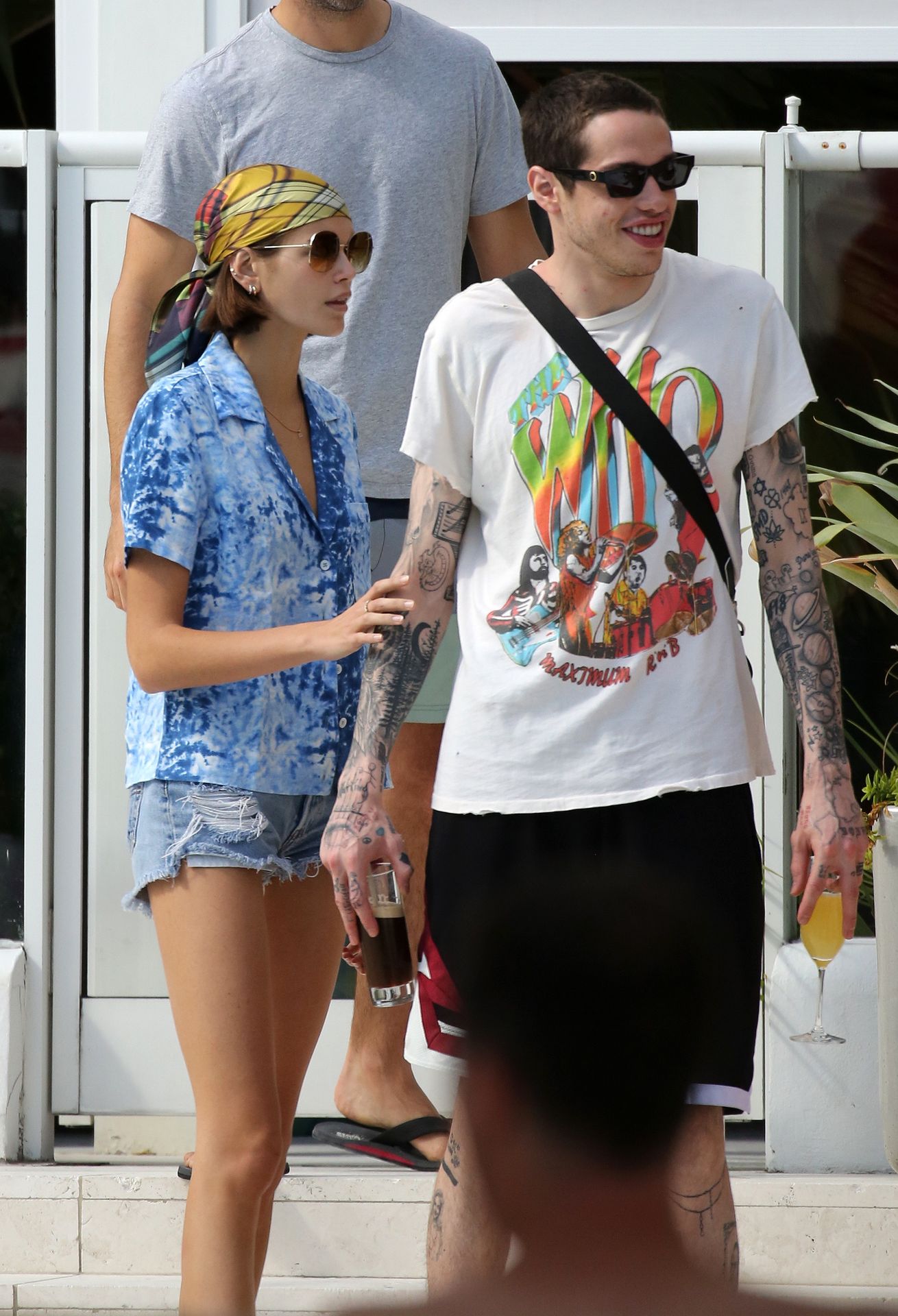 Cindy Crawford’s daughter, model Kaia Gerber wears a black bikini as she kisses boyfriend Pete Davidson by the pool in Miami, 11/23/2019.