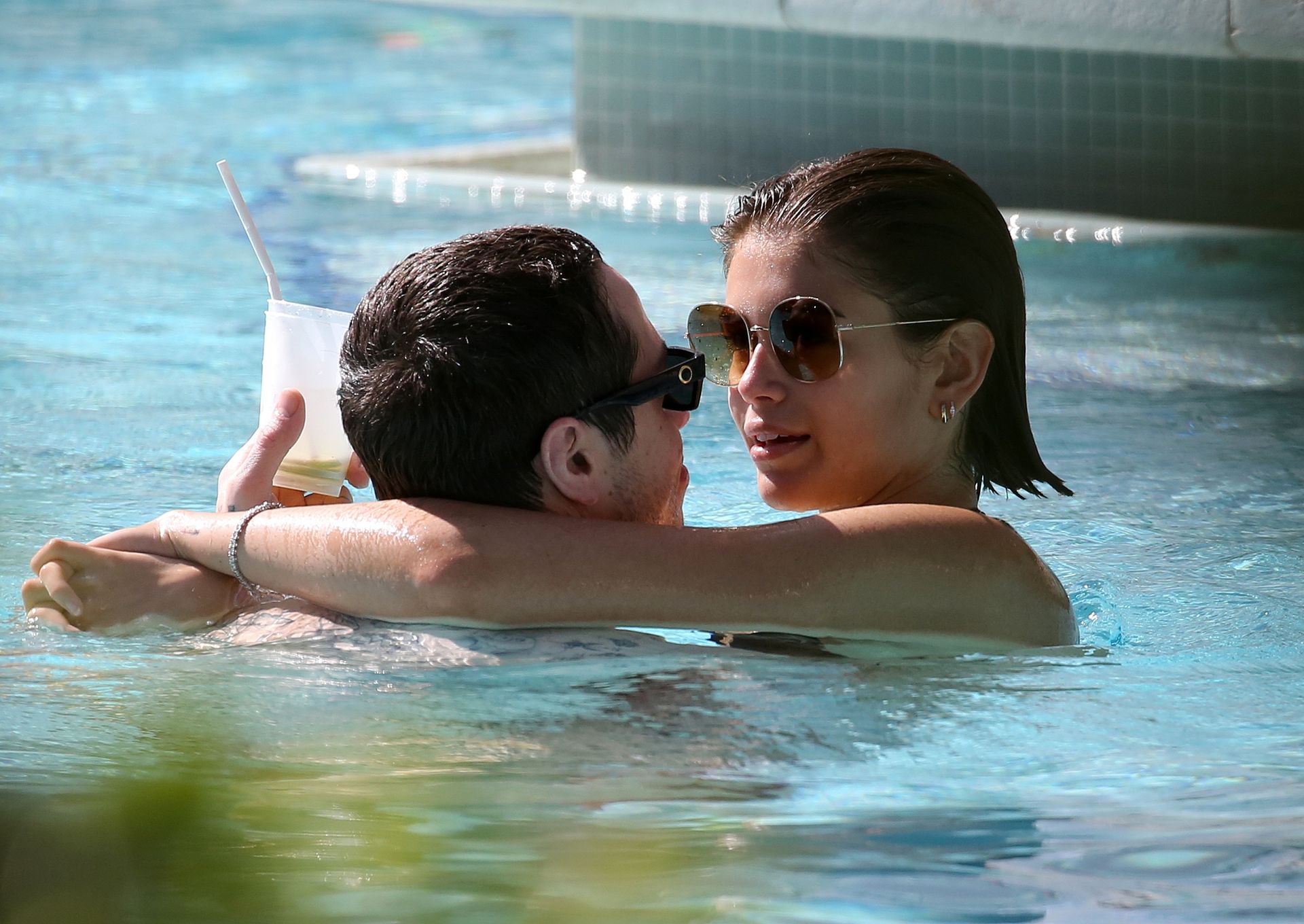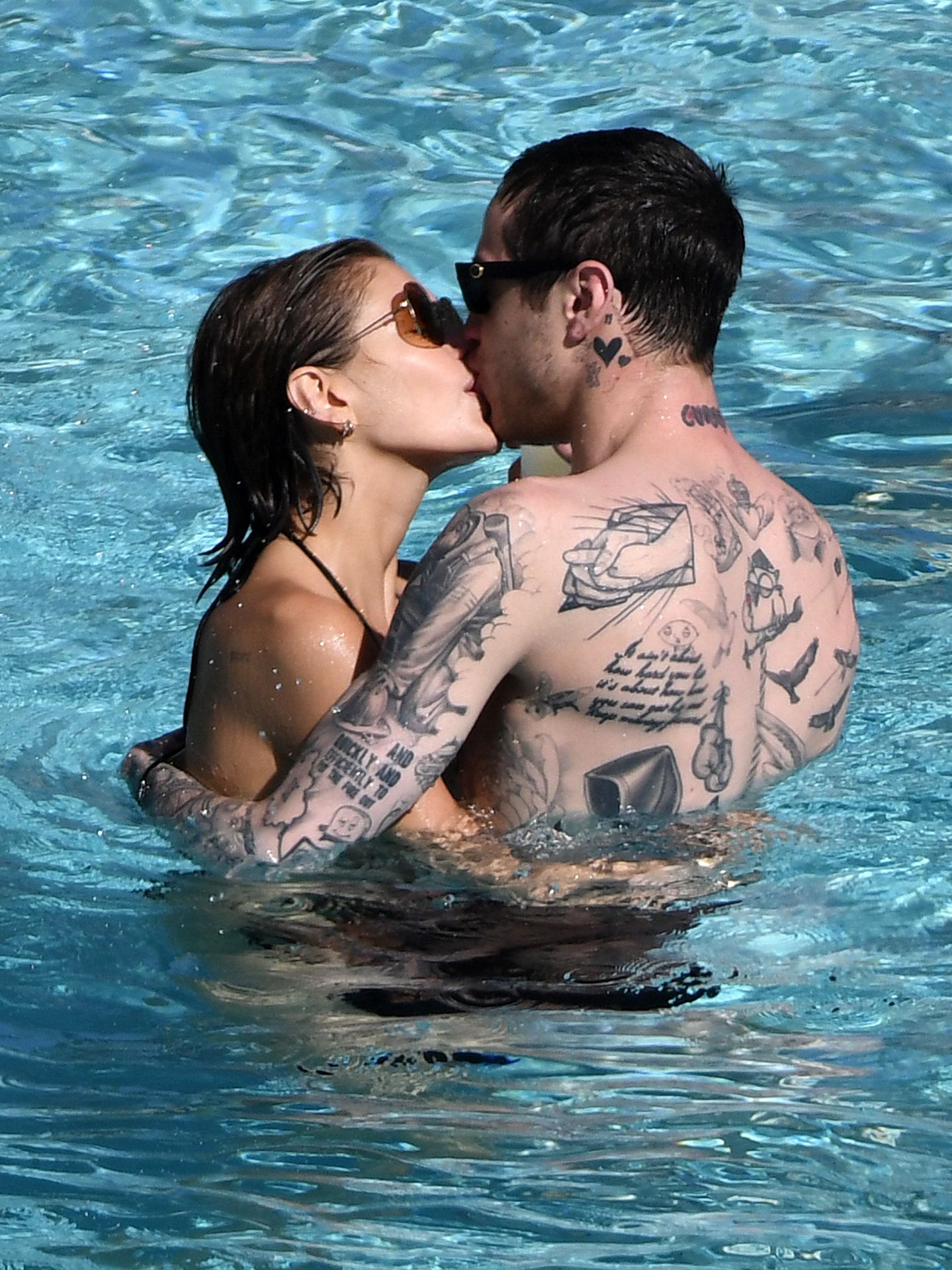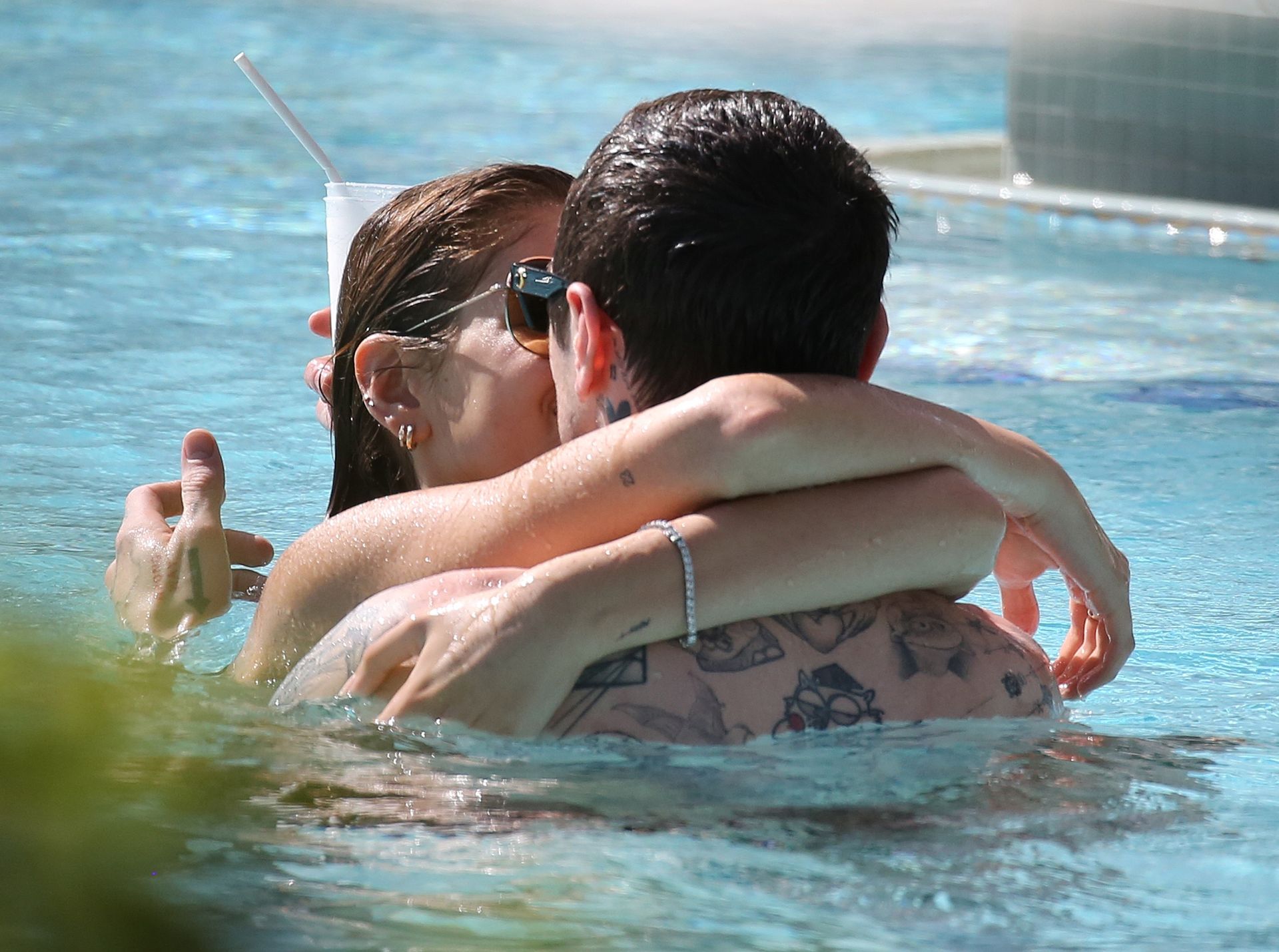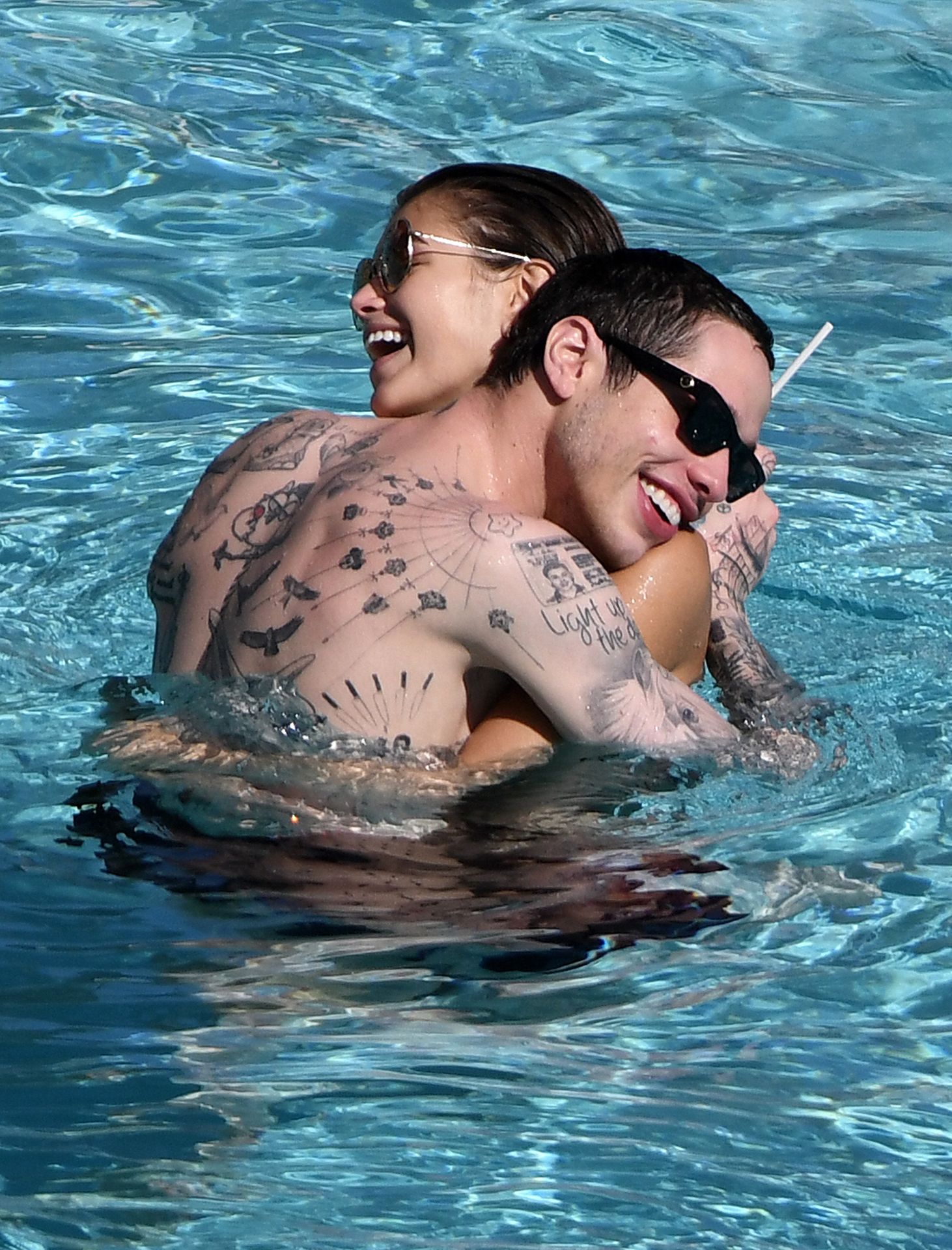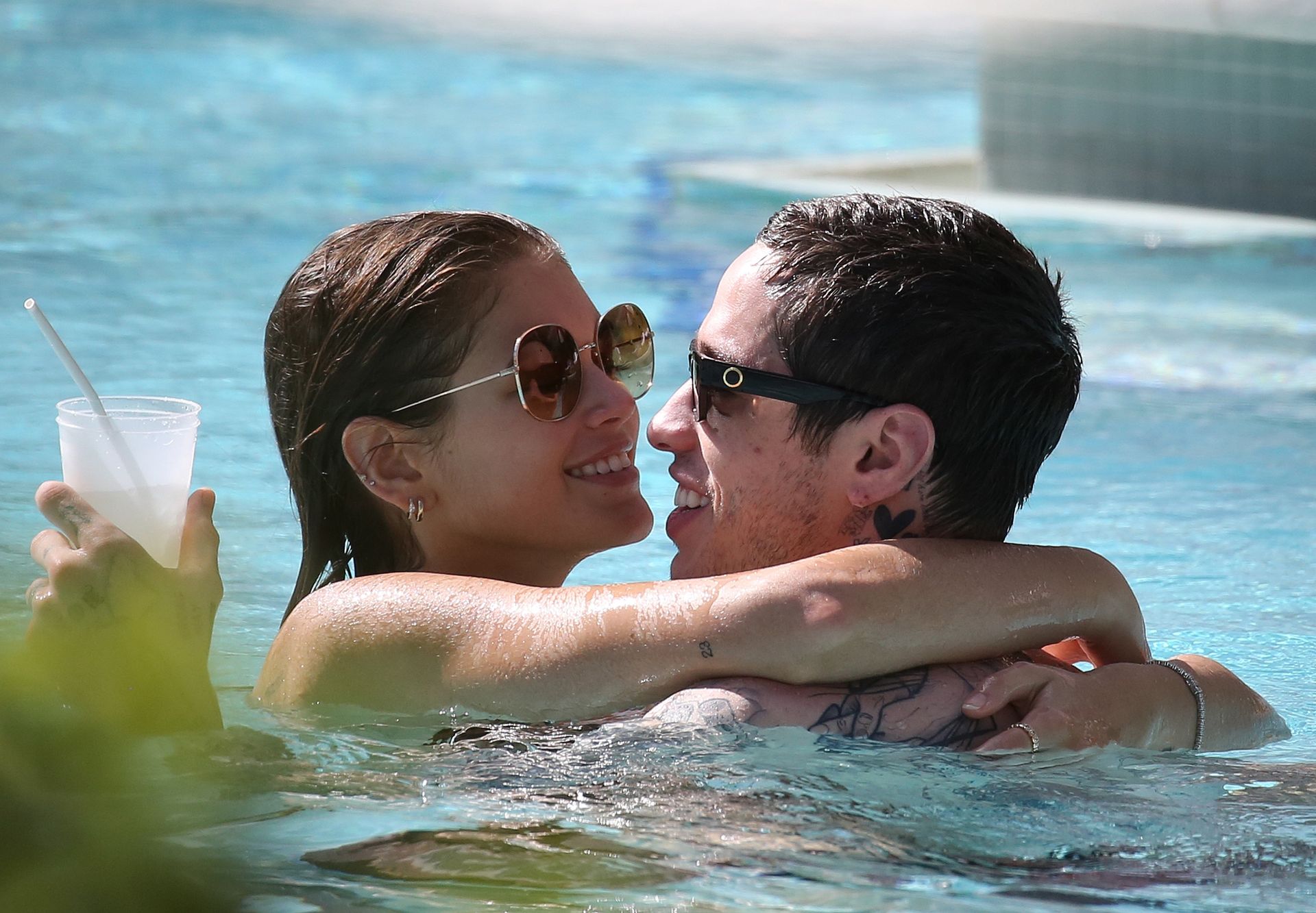 Cindy Crawford’s daughter, model Kaia Gerber wears a black bikini as she kisses boyfriend Pete Davidson by the pool in Miami, 11/23/2019.