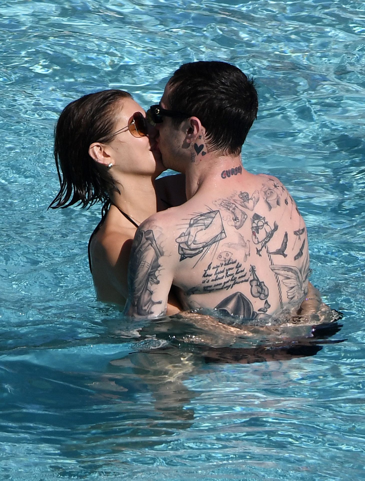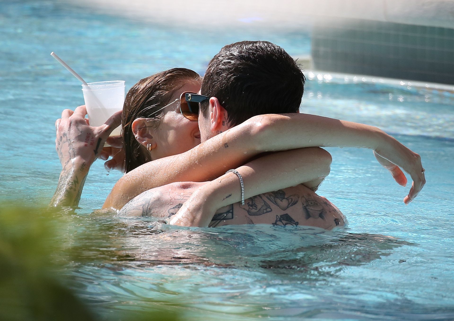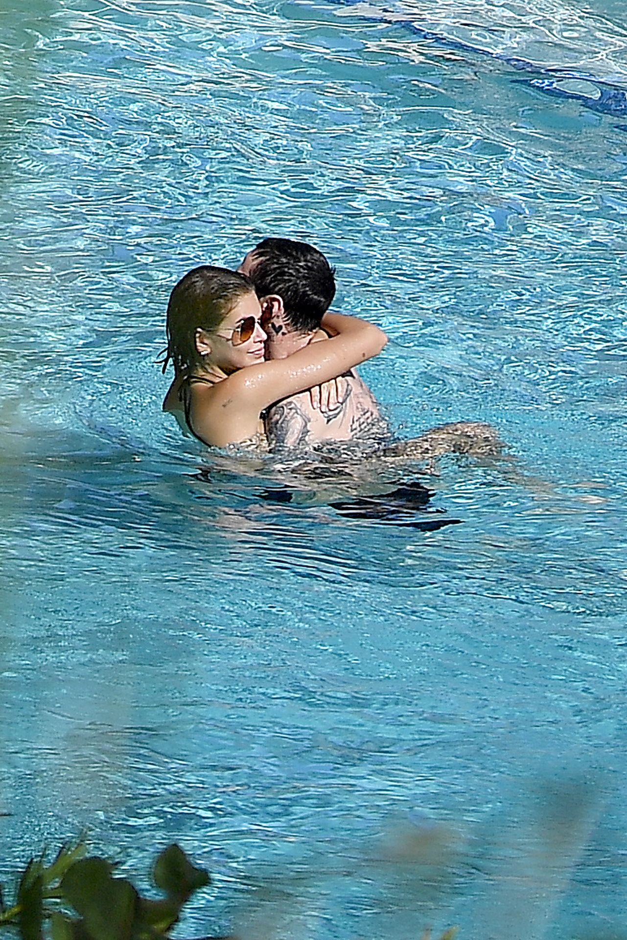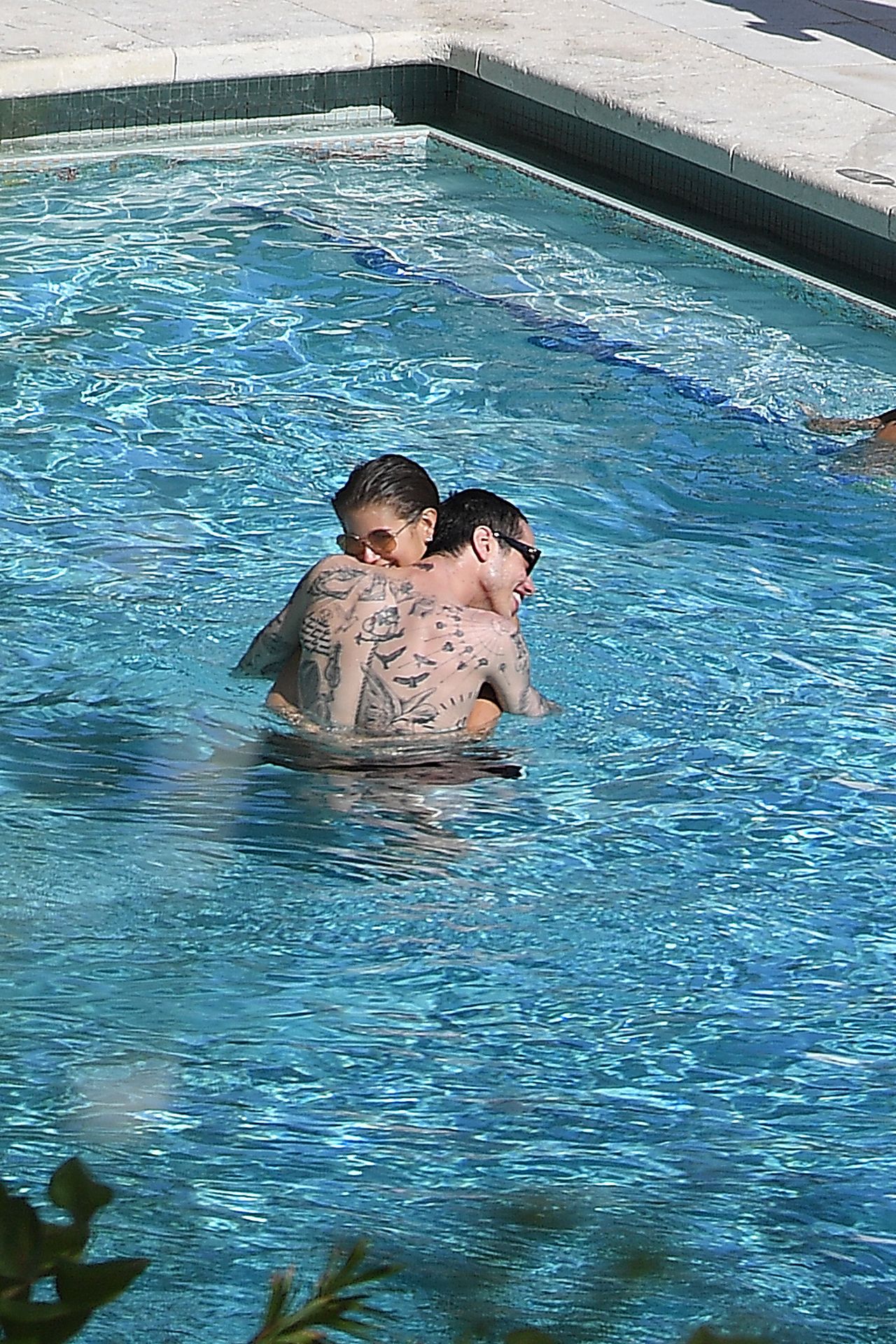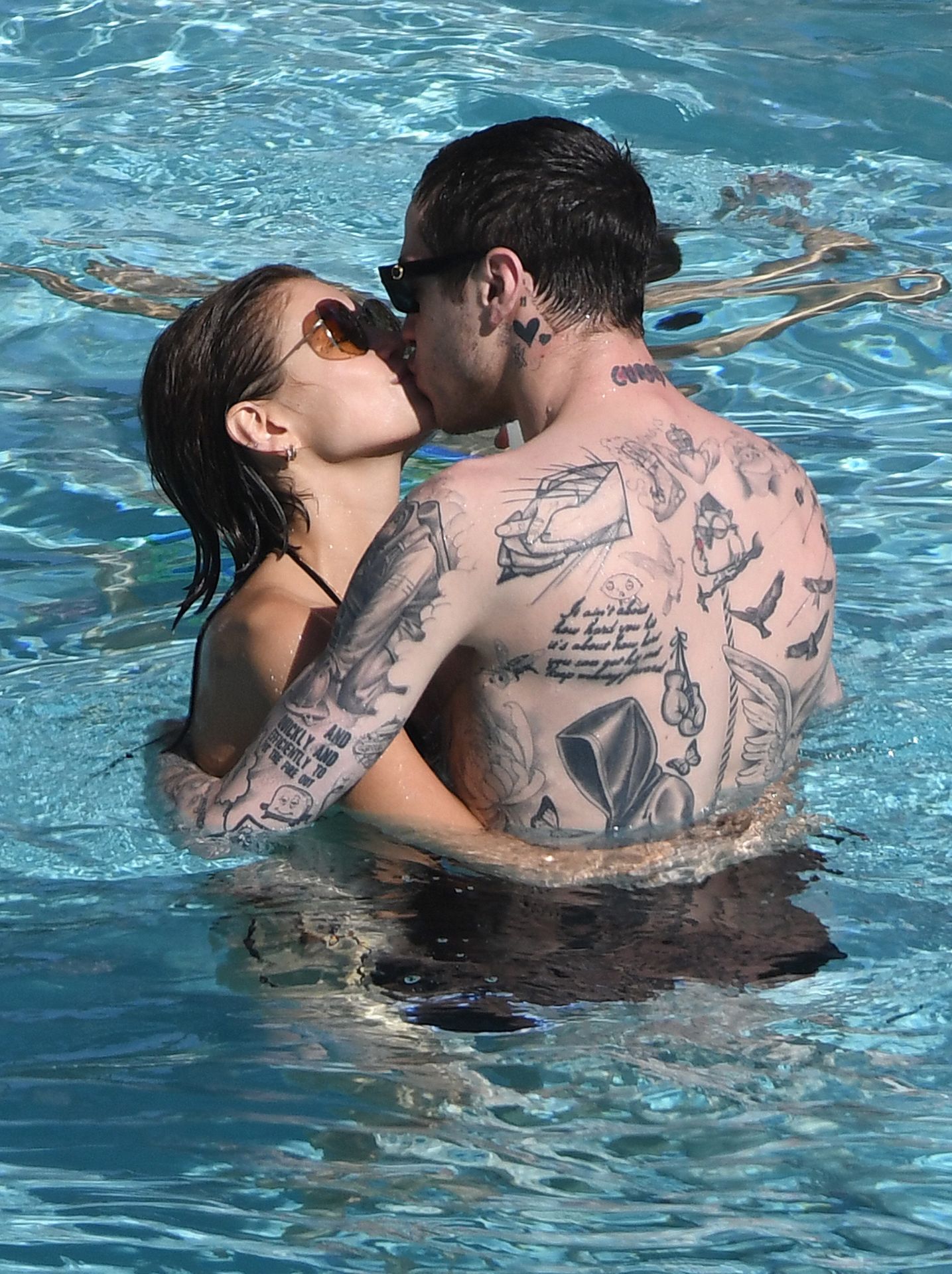 Cindy Crawford’s daughter, model Kaia Gerber wears a black bikini as she kisses boyfriend Pete Davidson by the pool in Miami, 11/23/2019.