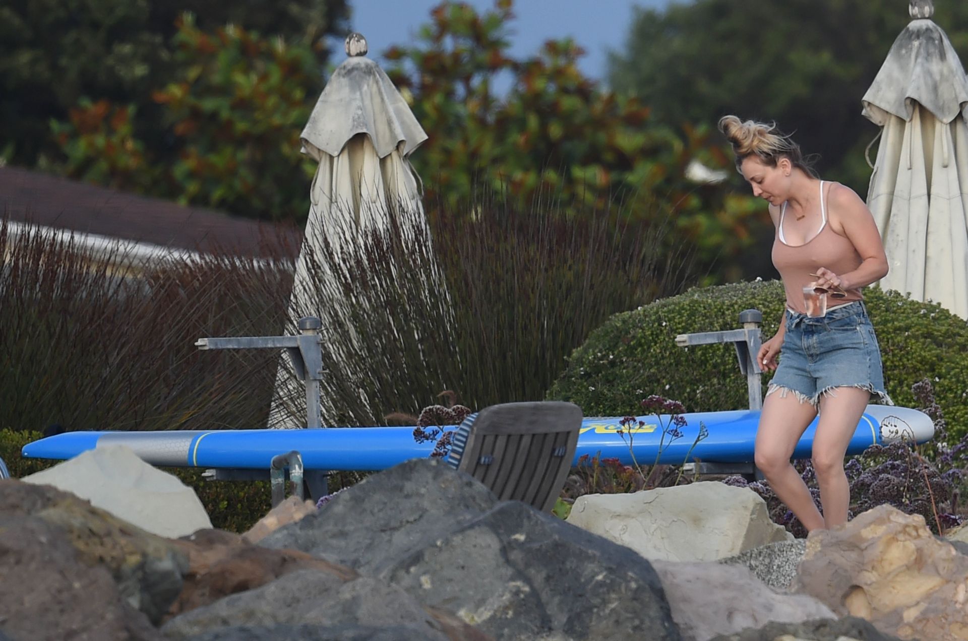 Kaley Cuoco goes barefoot in cutoff jean shorts while playing games with friends at a a beach party at a Santa Barbara beach Saturday, 09/07/2019.