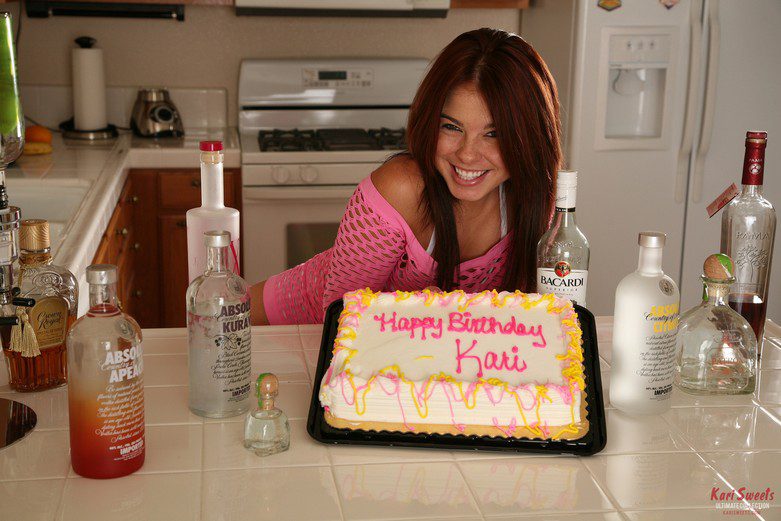 Ok, first she is wearing her favorite tiny thong, but that thong comes flying off fast and Kari shows off her freshly shaved birthday pussy.
