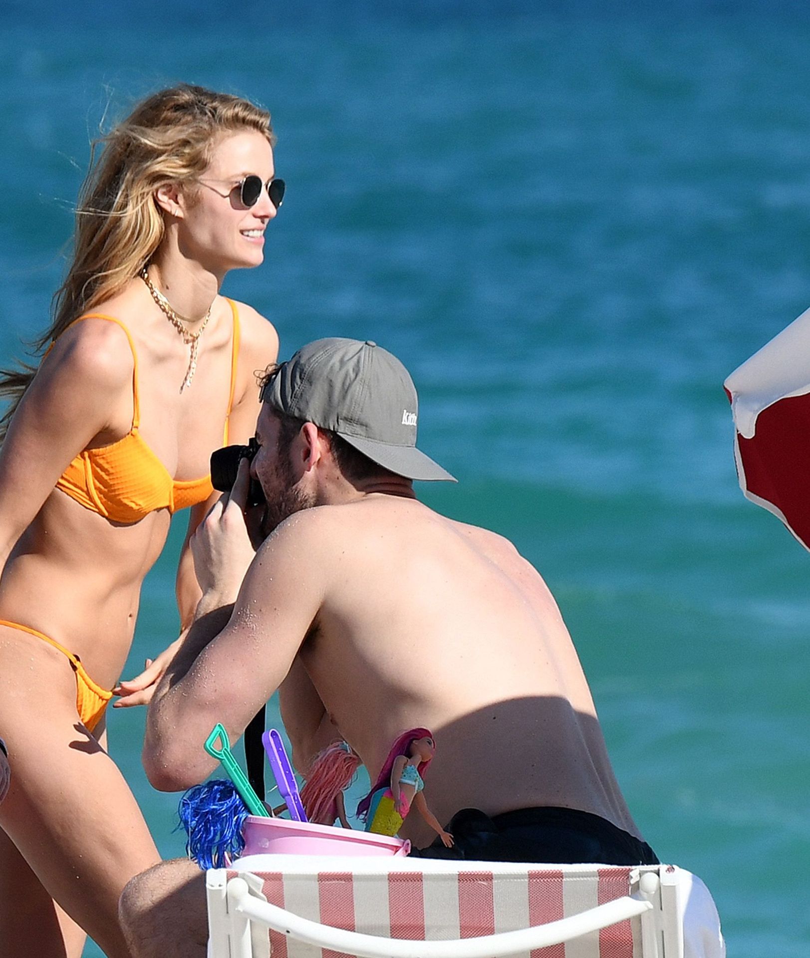 Model and Maxim cover girl Kate Bock wears an orange bikini as she relaxes with NBA boyfriend Kevin Love on the beach in Miami, 02/17/2020.