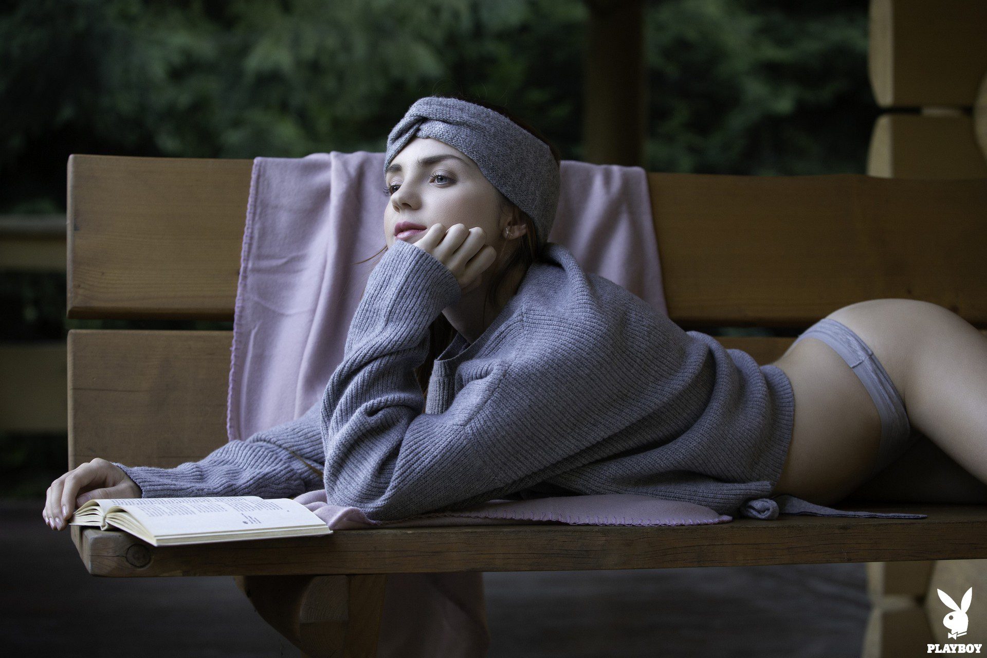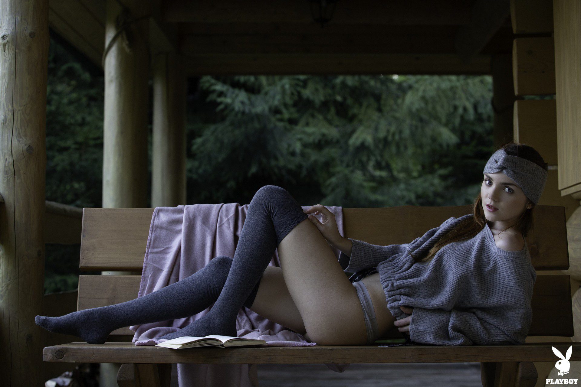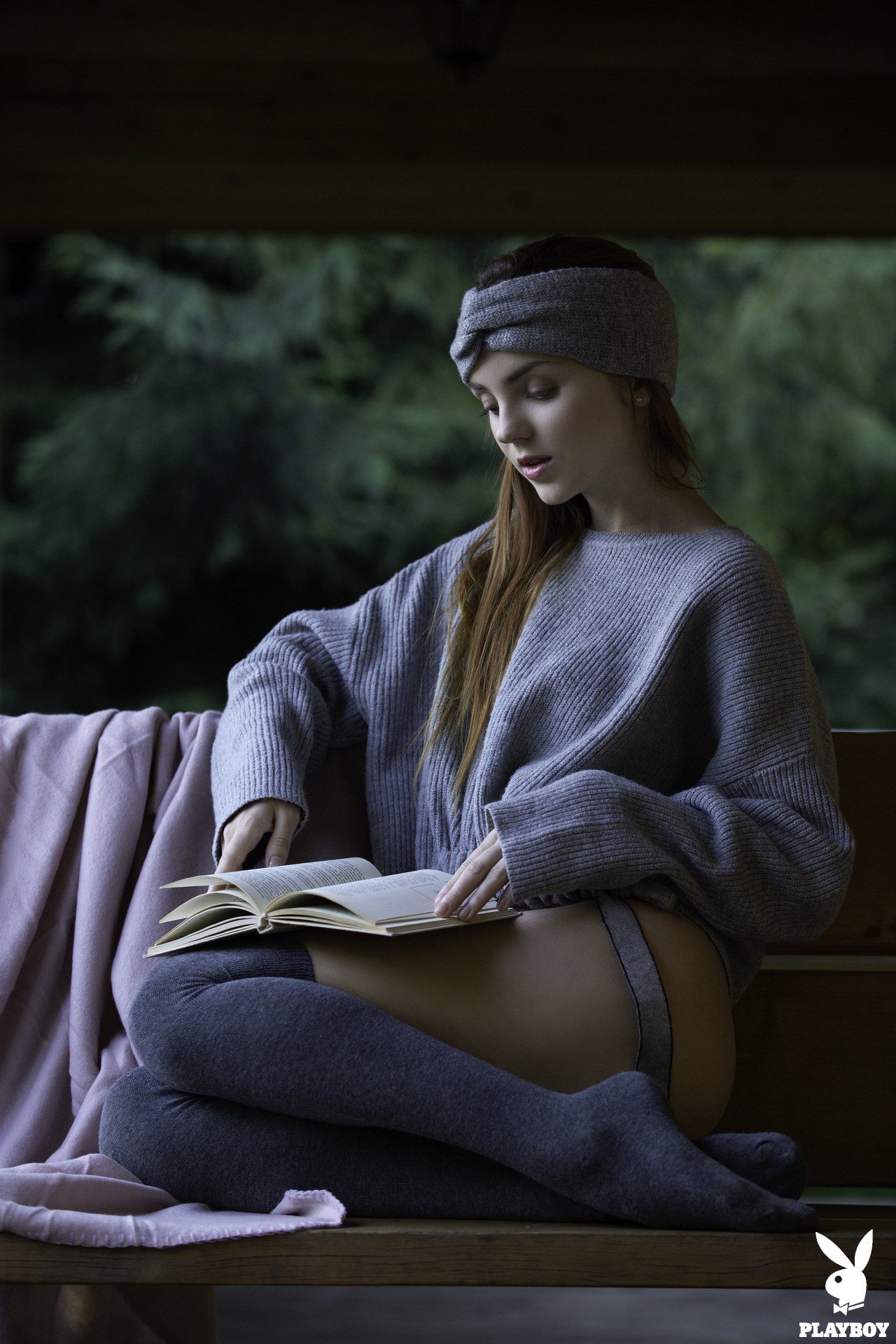 Curl up with a great book with the beautiful Newcomer, Kate Great. Looking sexy and totally comfortable, Kate is dressed in knee-high socks, an oversized sweater, and gray panties as the photographer, David Merenyi captures her elegant beauty. Looking sweet and so sultry, Kate indulges in her naughty read, only to take a little break for all of her new Playboy Plus fans. An intellectual, this is something Kate would be doing even if she weren’t in front of the camera. “In my spare time I enjoy dancing, reading and going to museums,” she says. Slowly losing pieces of her casual outfit, Kate looks out to the forest while giving the camera a beautiful glimpse of her smile. “What I love most about my body are my legs,” she tells us. “The outfit I feel sexiest in are pajamas!” Easy-going, all-natural, and totally gorgeous, you won’t be able to get enough of the beautiful, Kate Great, right here on Playboy Plus!