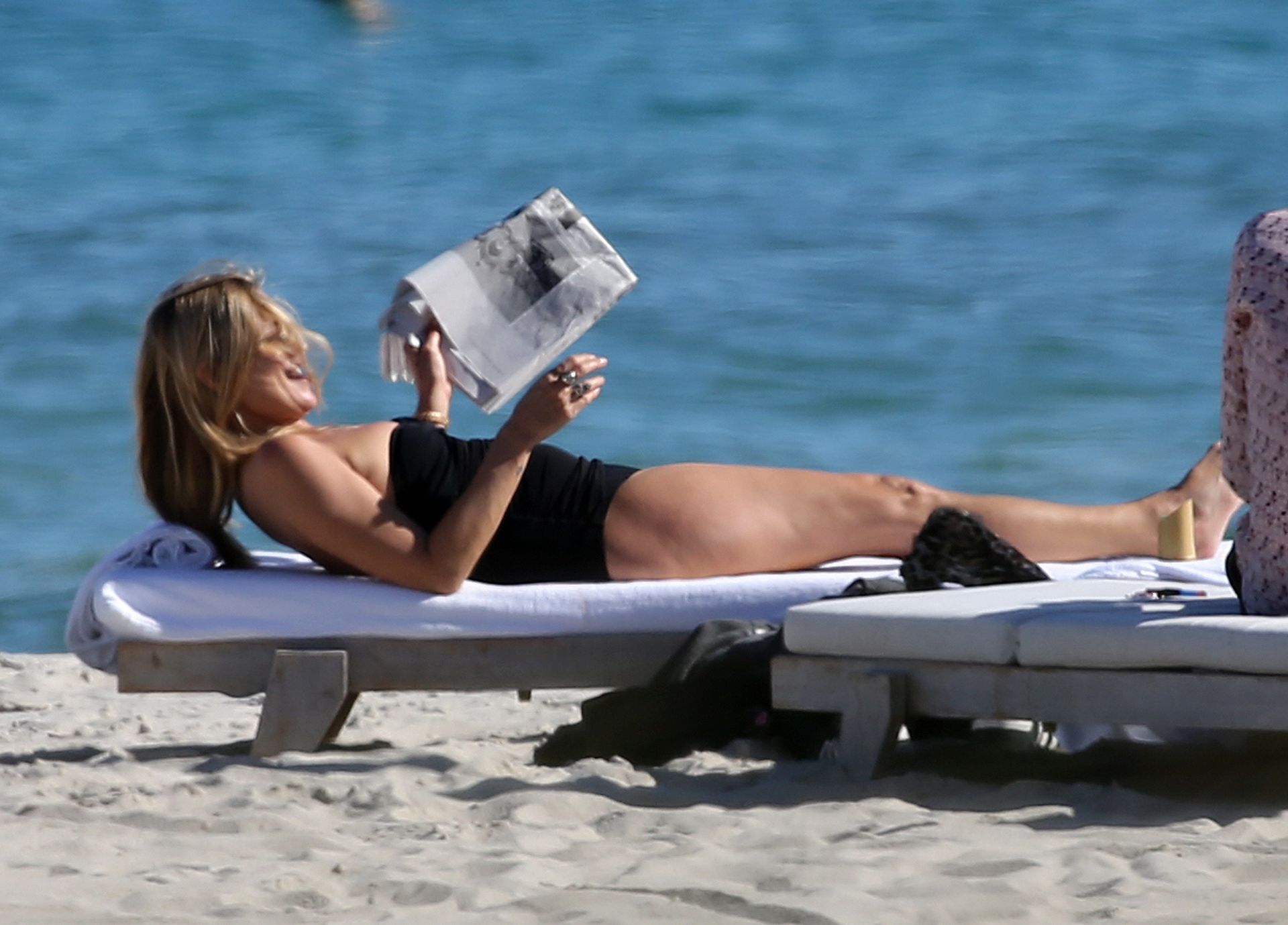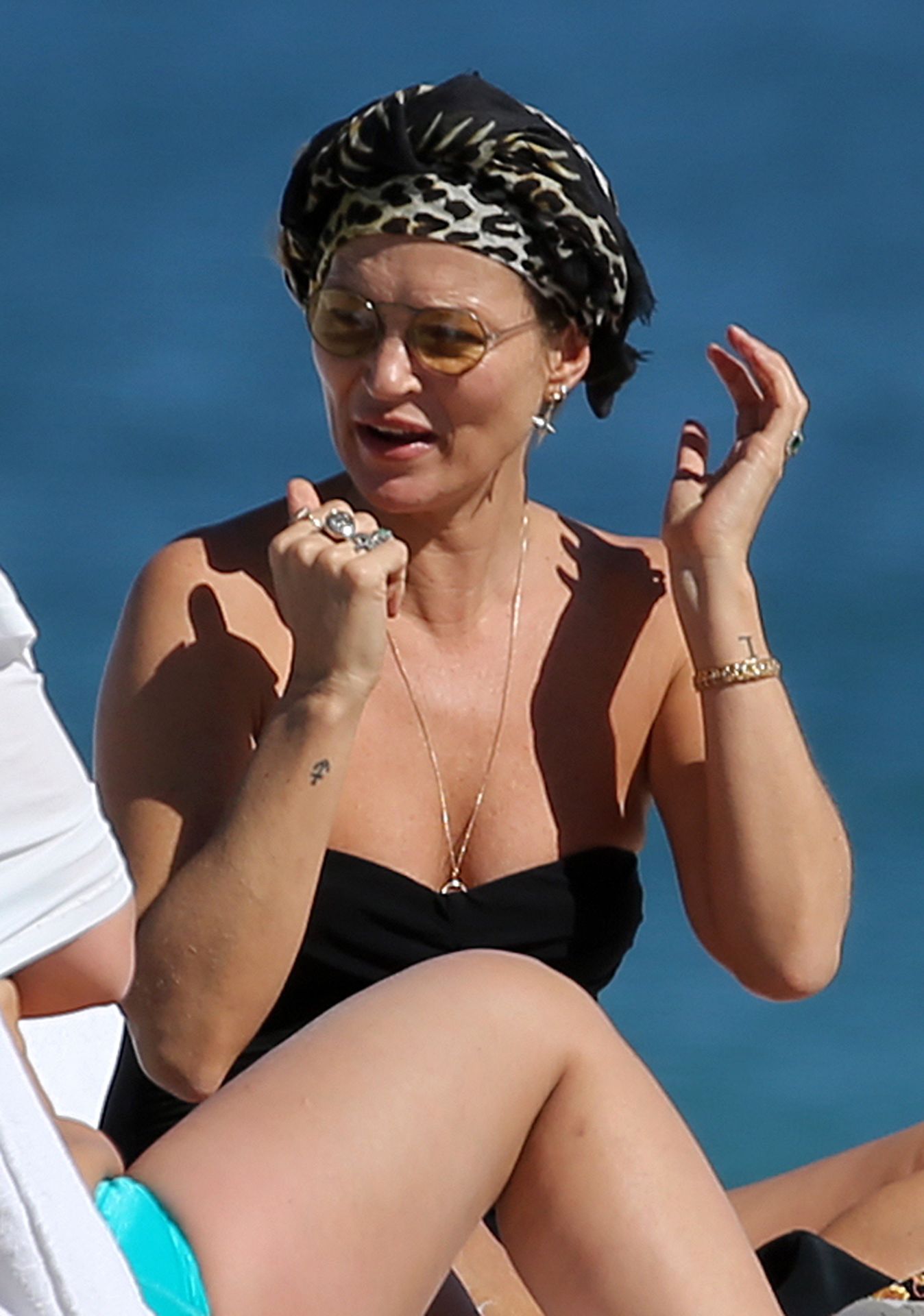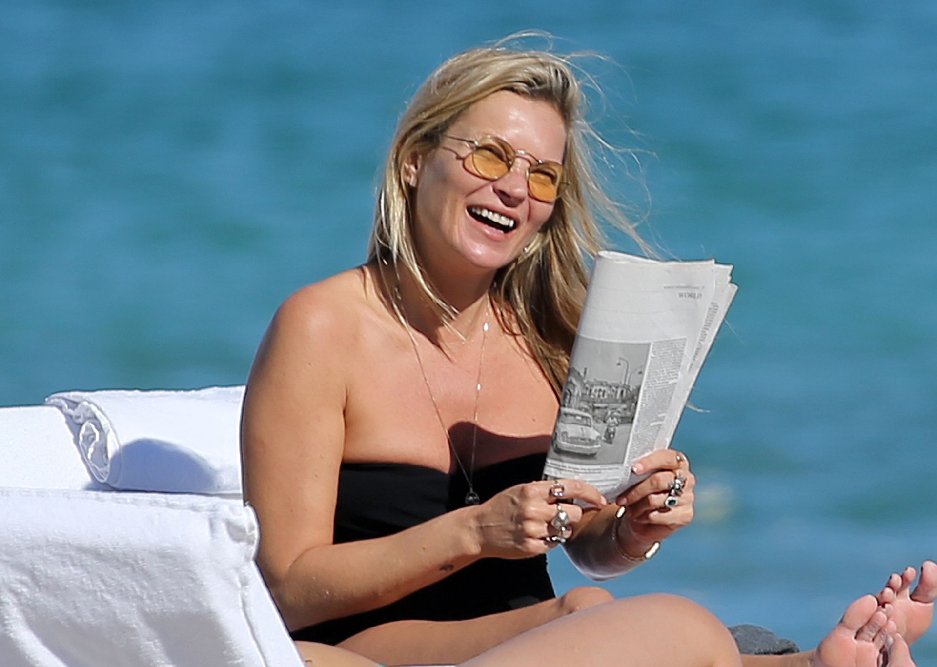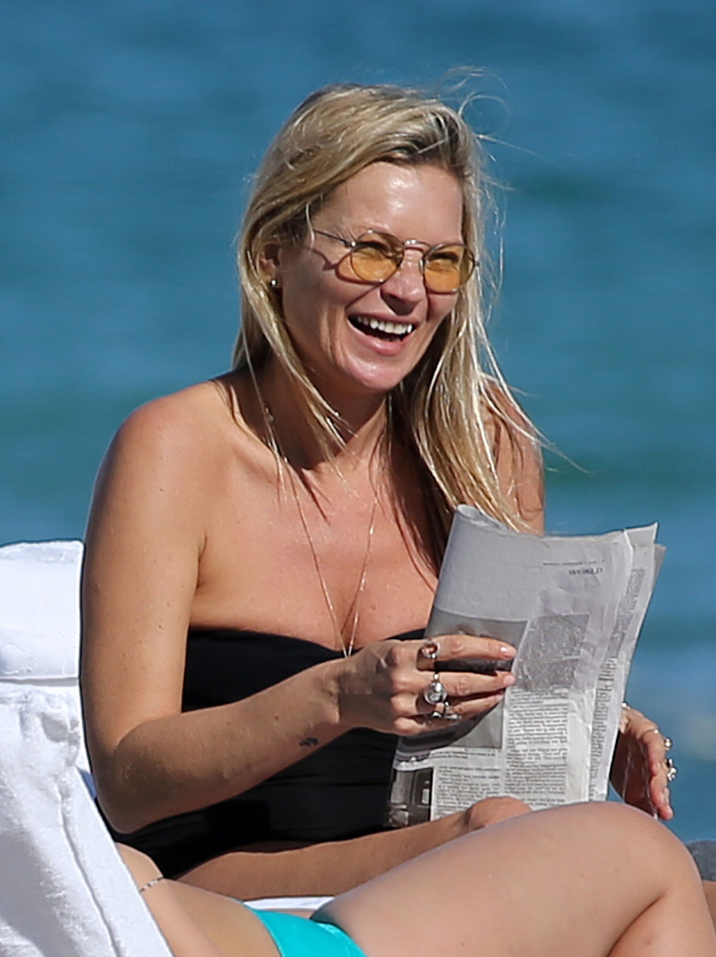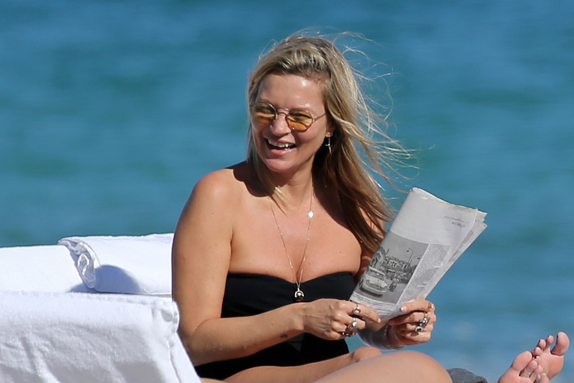 Aged supermodel Kate Moss wears a black swimsuit as she relaxes on the beach in Miami, 12/03/2019.