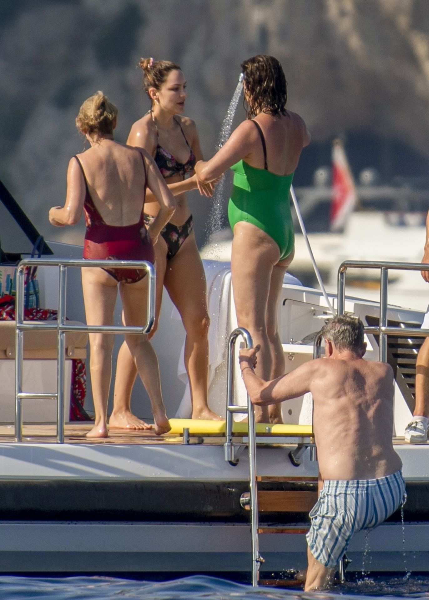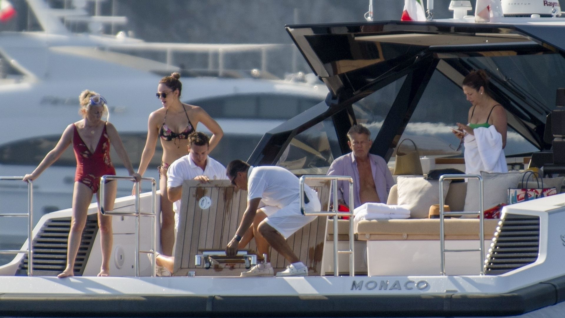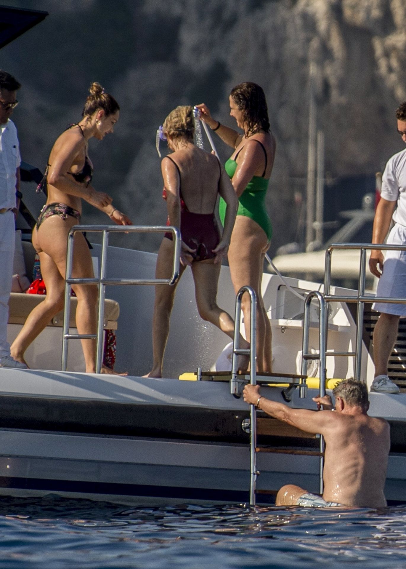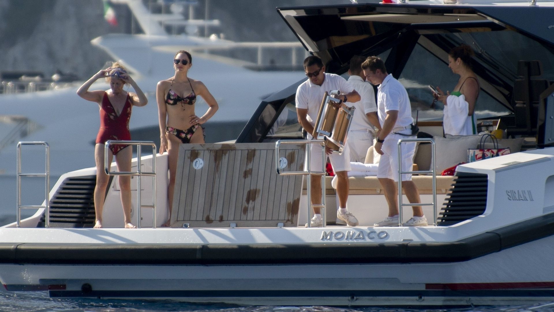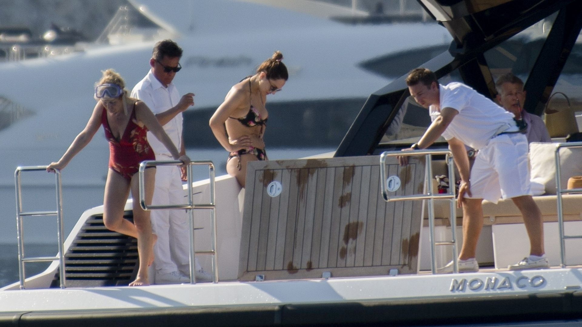 Newlyweds Katharine McPhee and David Foster take a dip in the ocean while relaxing on their yacht during their honeymoon in Capri, 07/03/2019.