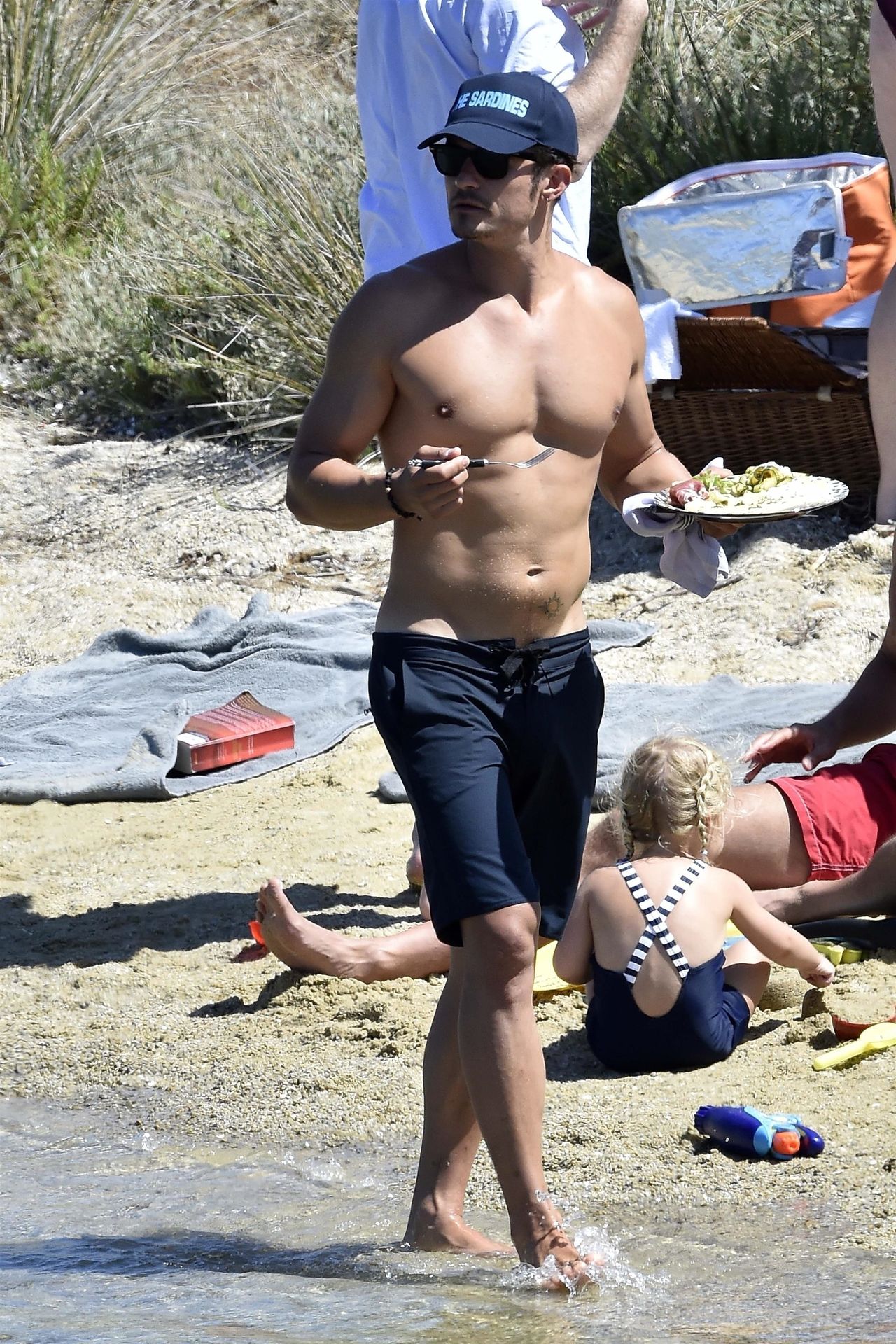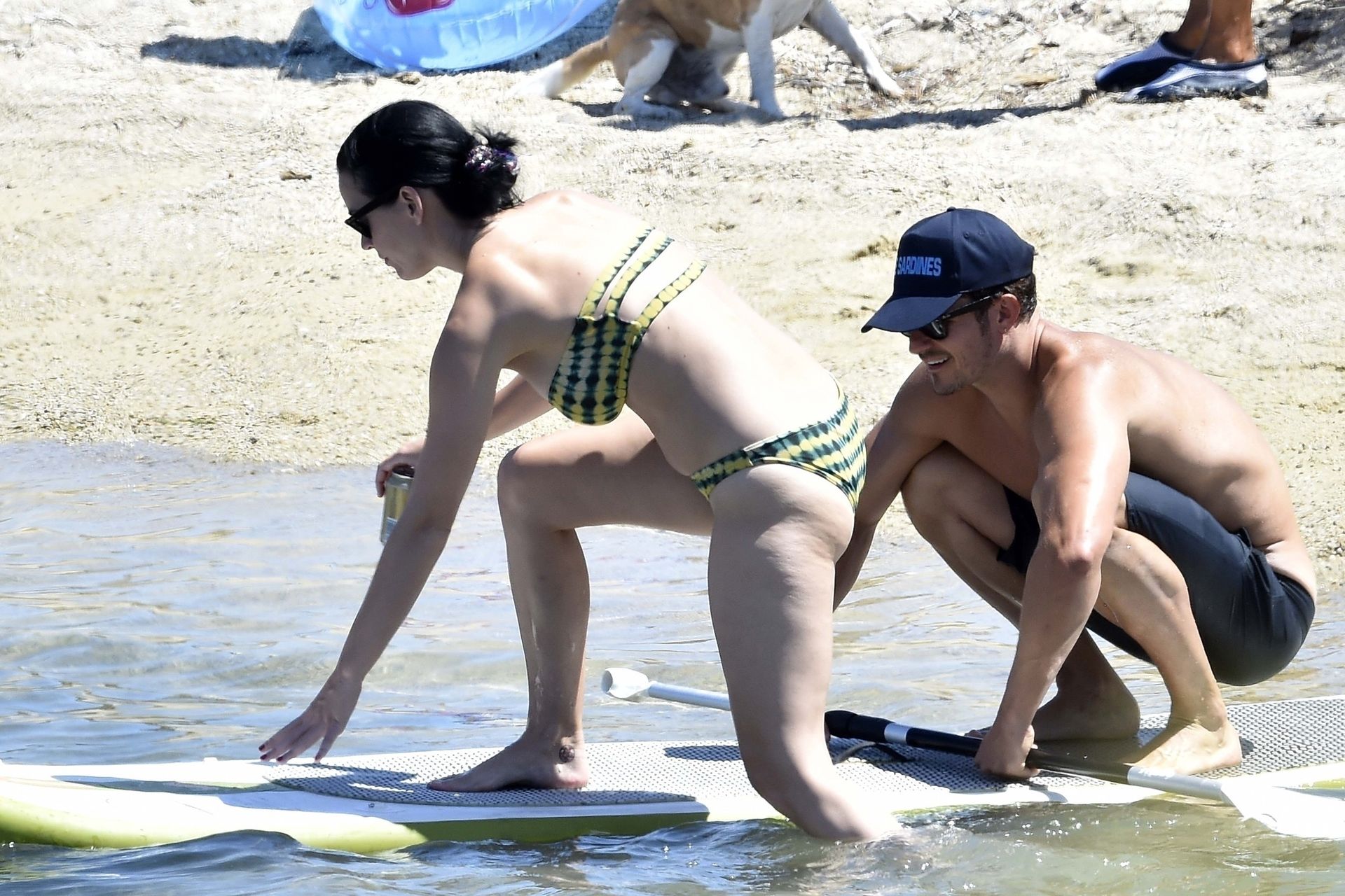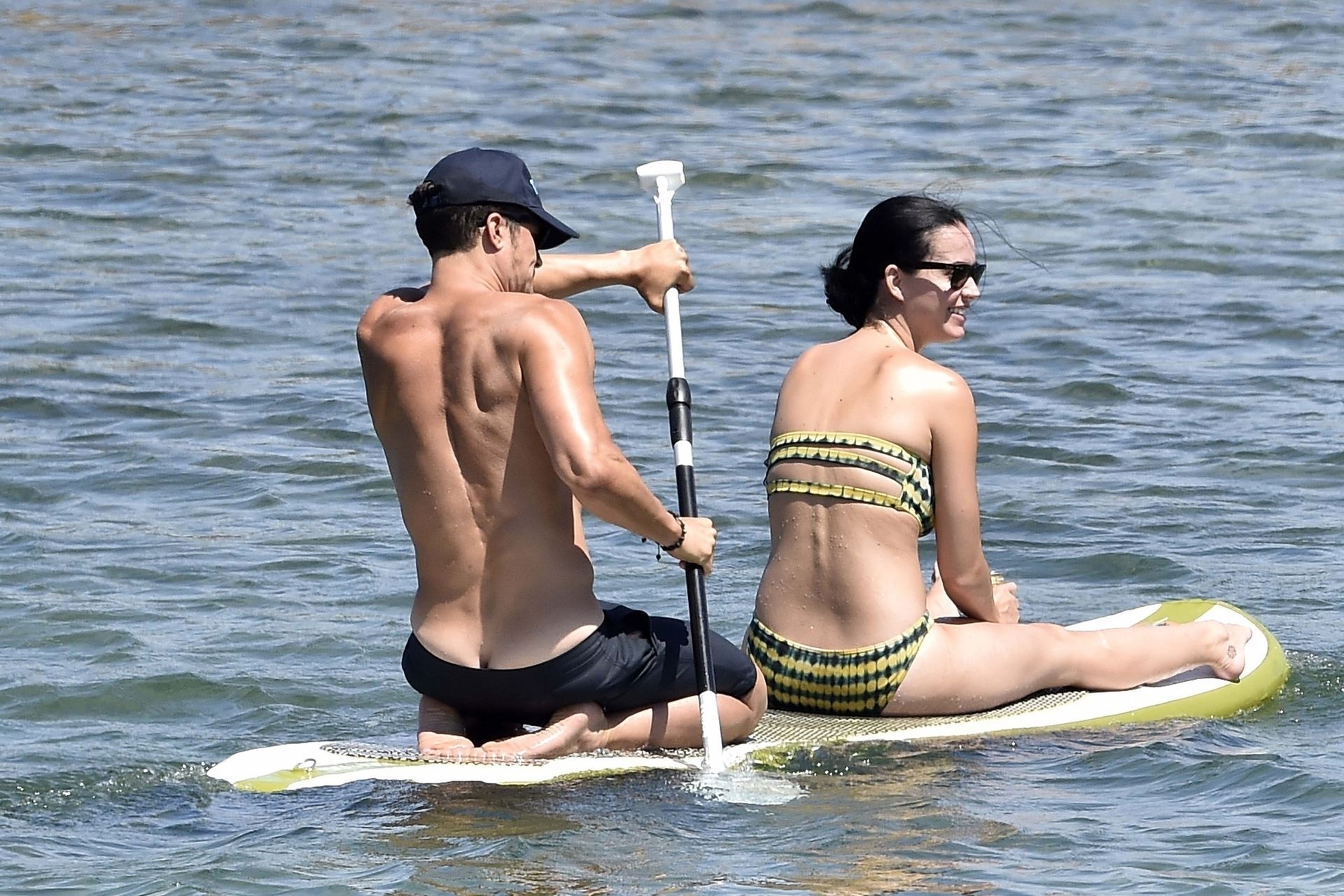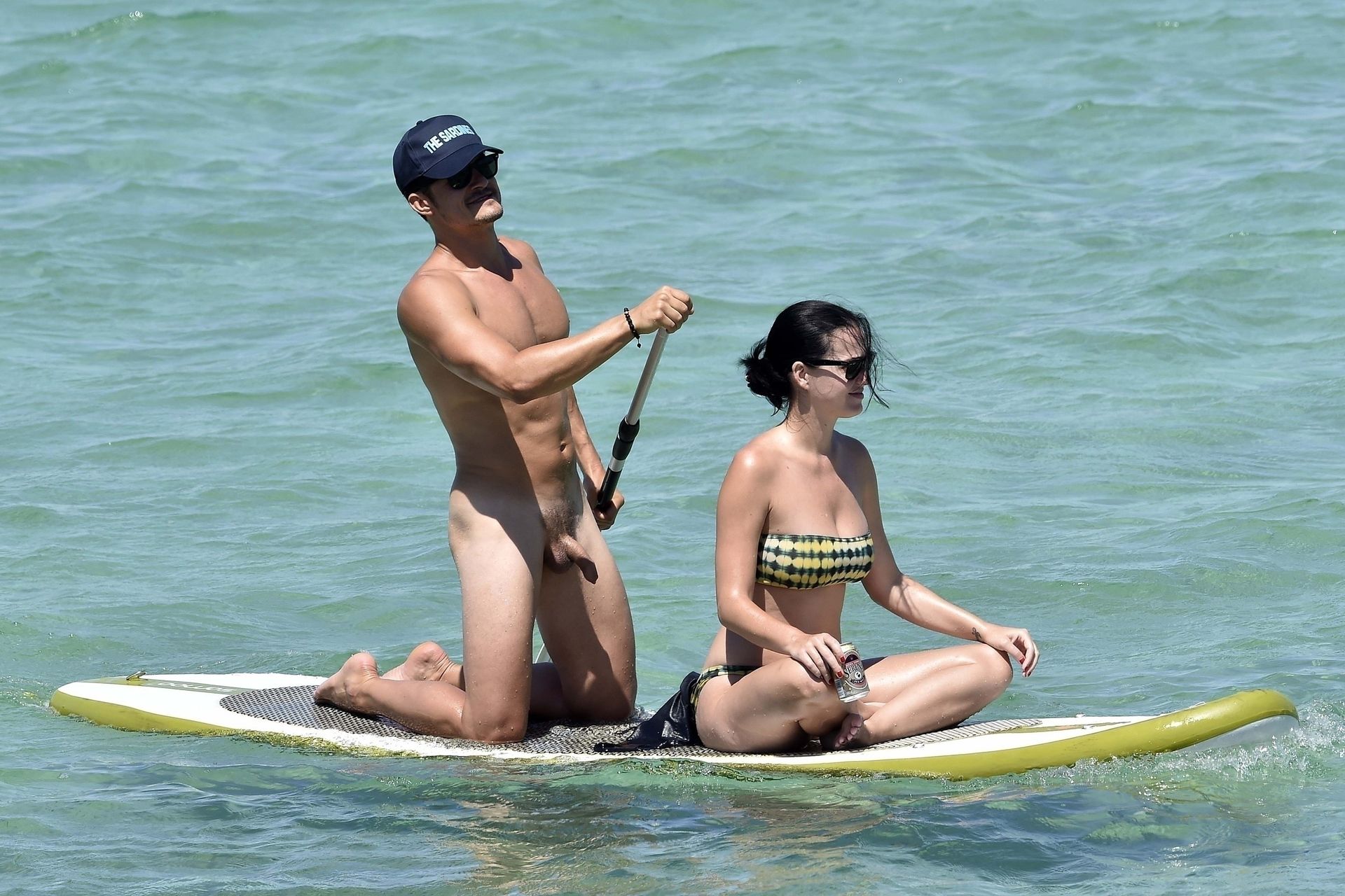 PICTURED HERE: Katy Perry and beau Orlando Bloom have a fun little beach day while vacationing in Italy, 08/02/2019. The hot couple indulged in some water activity like snorkeling and paddle boarding. Orlando was quite the exhibitionist removing his board shorts and letting it all hang out while paddling Katy on their paddleboard. Katy and Orlando had lunch on the beach and can be seen kissing and cuddling under the sun as the two appear to be really in-love.