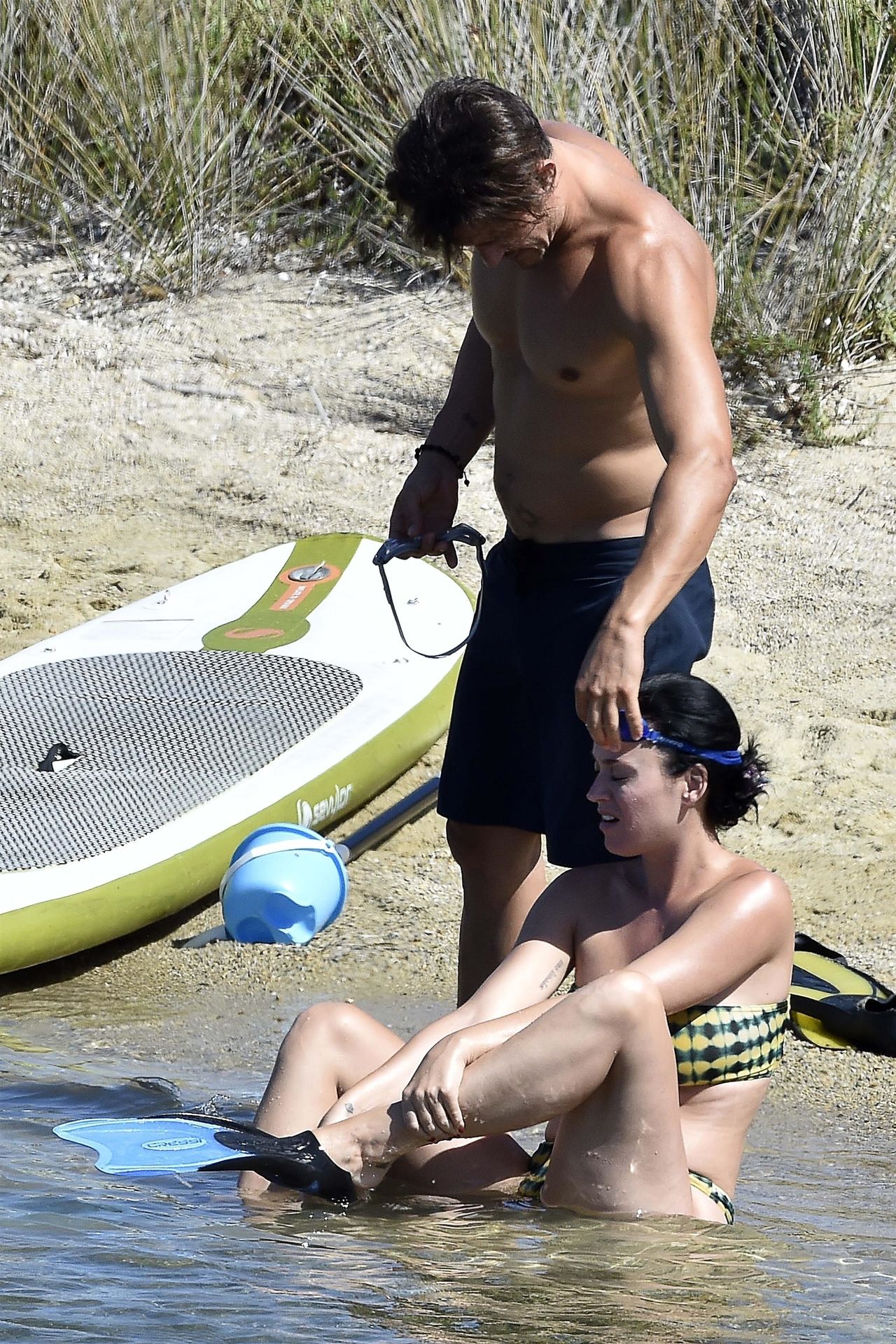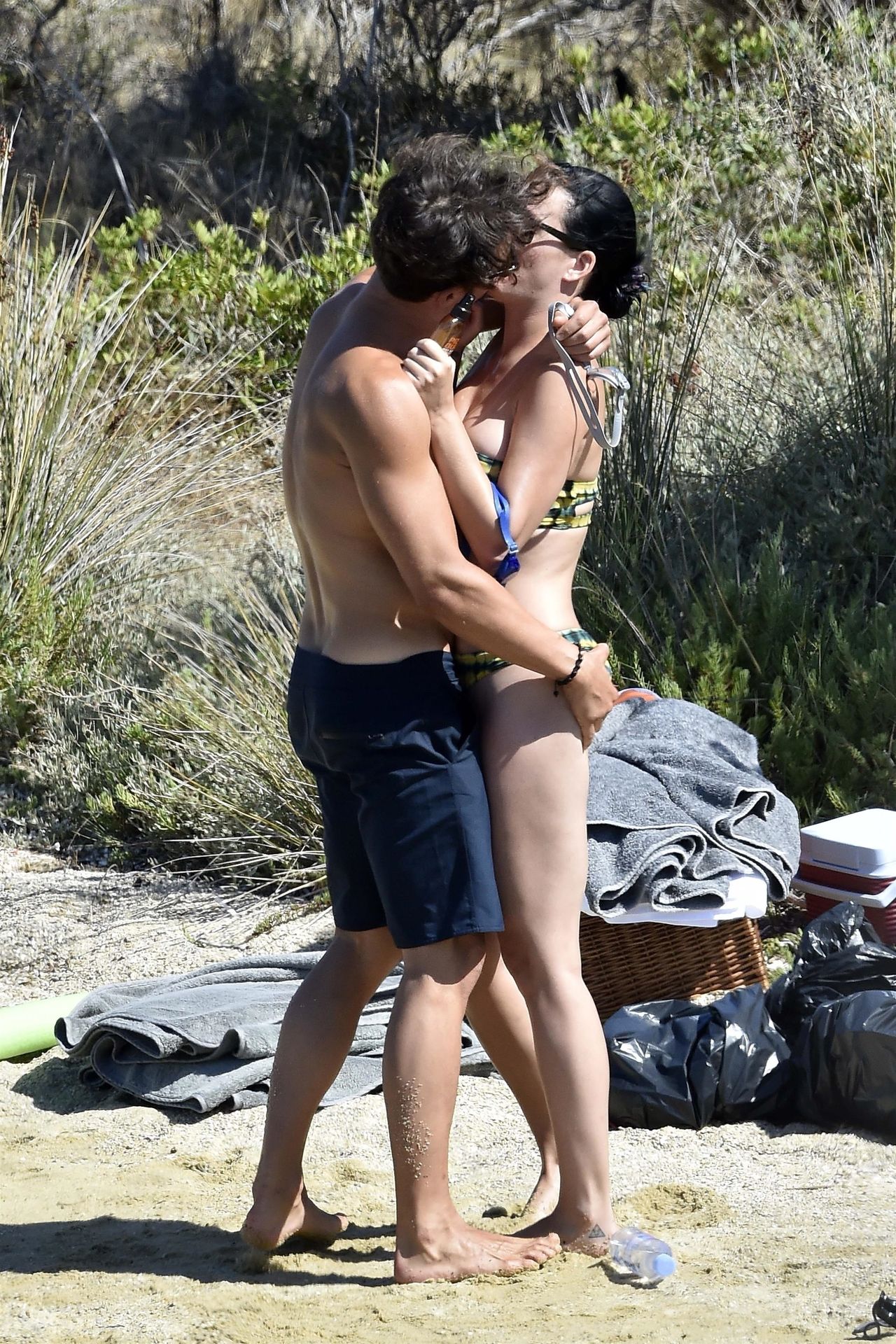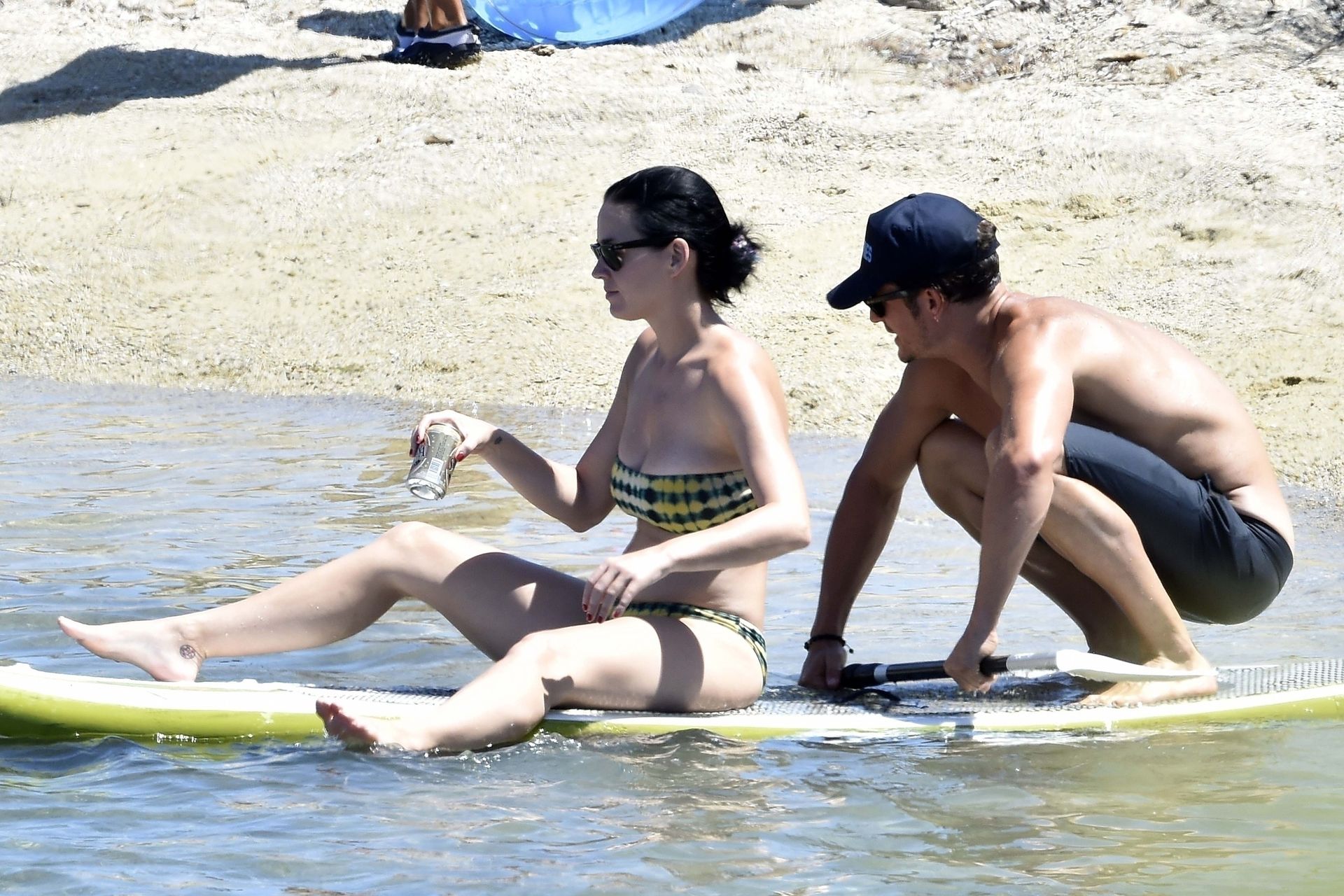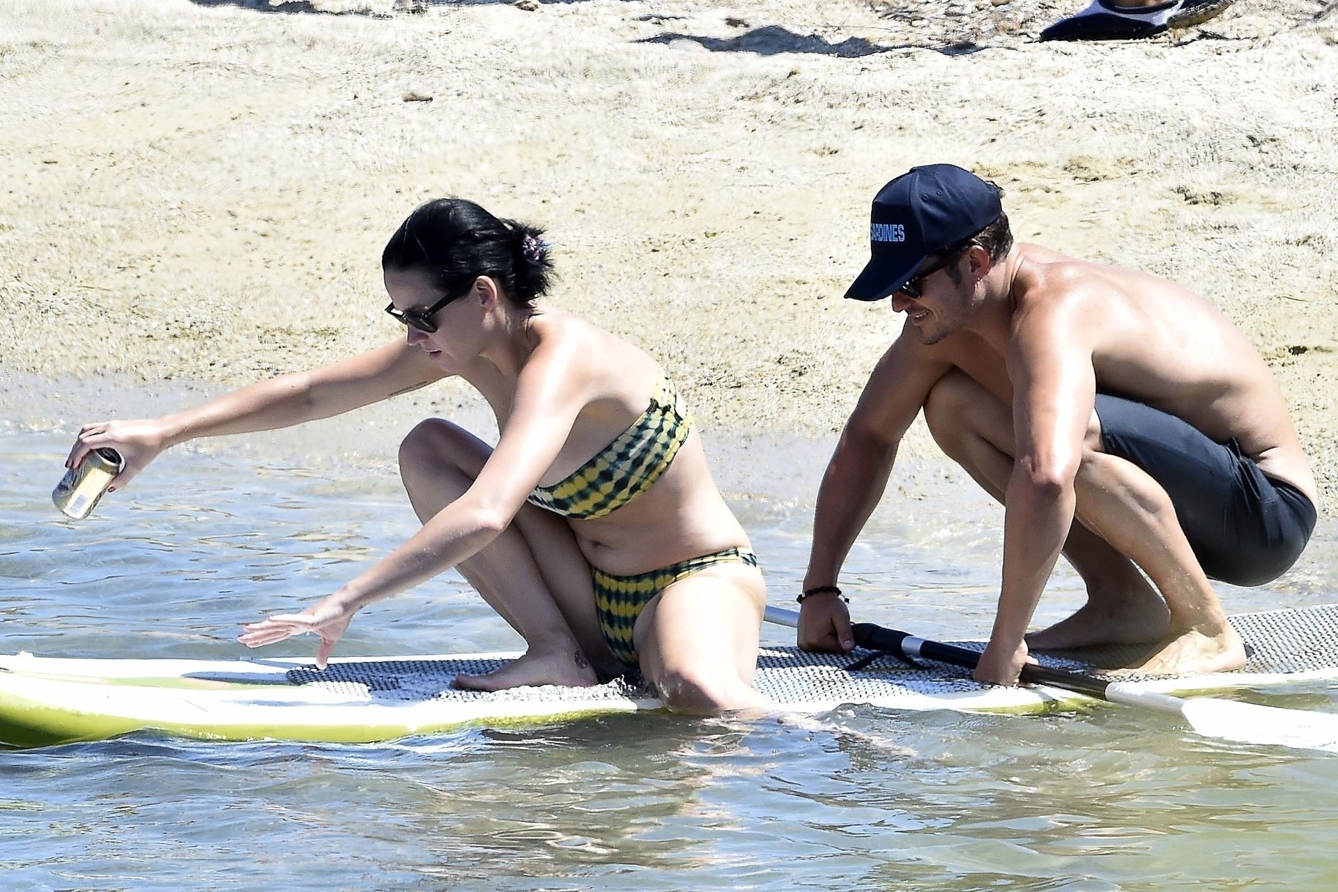 PICTURED HERE: Katy Perry and beau Orlando Bloom have a fun little beach day while vacationing in Italy, 08/02/2019. The hot couple indulged in some water activity like snorkeling and paddle boarding. Orlando was quite the exhibitionist removing his board shorts and letting it all hang out while paddling Katy on their paddleboard. Katy and Orlando had lunch on the beach and can be seen kissing and cuddling under the sun as the two appear to be really in-love.