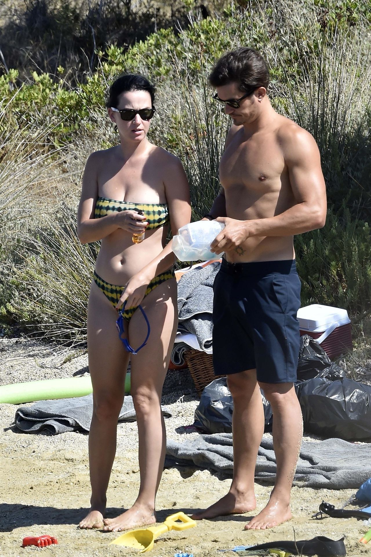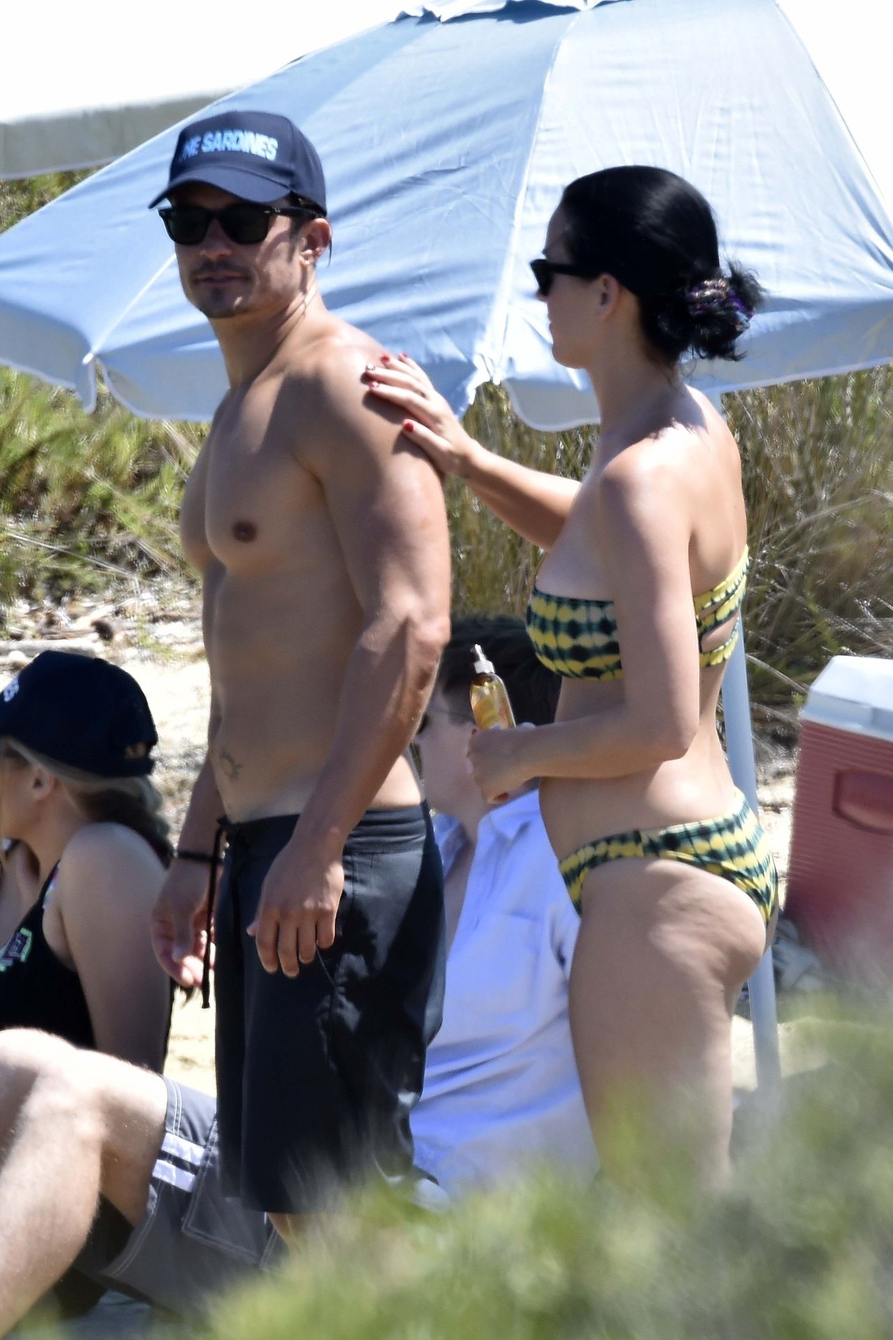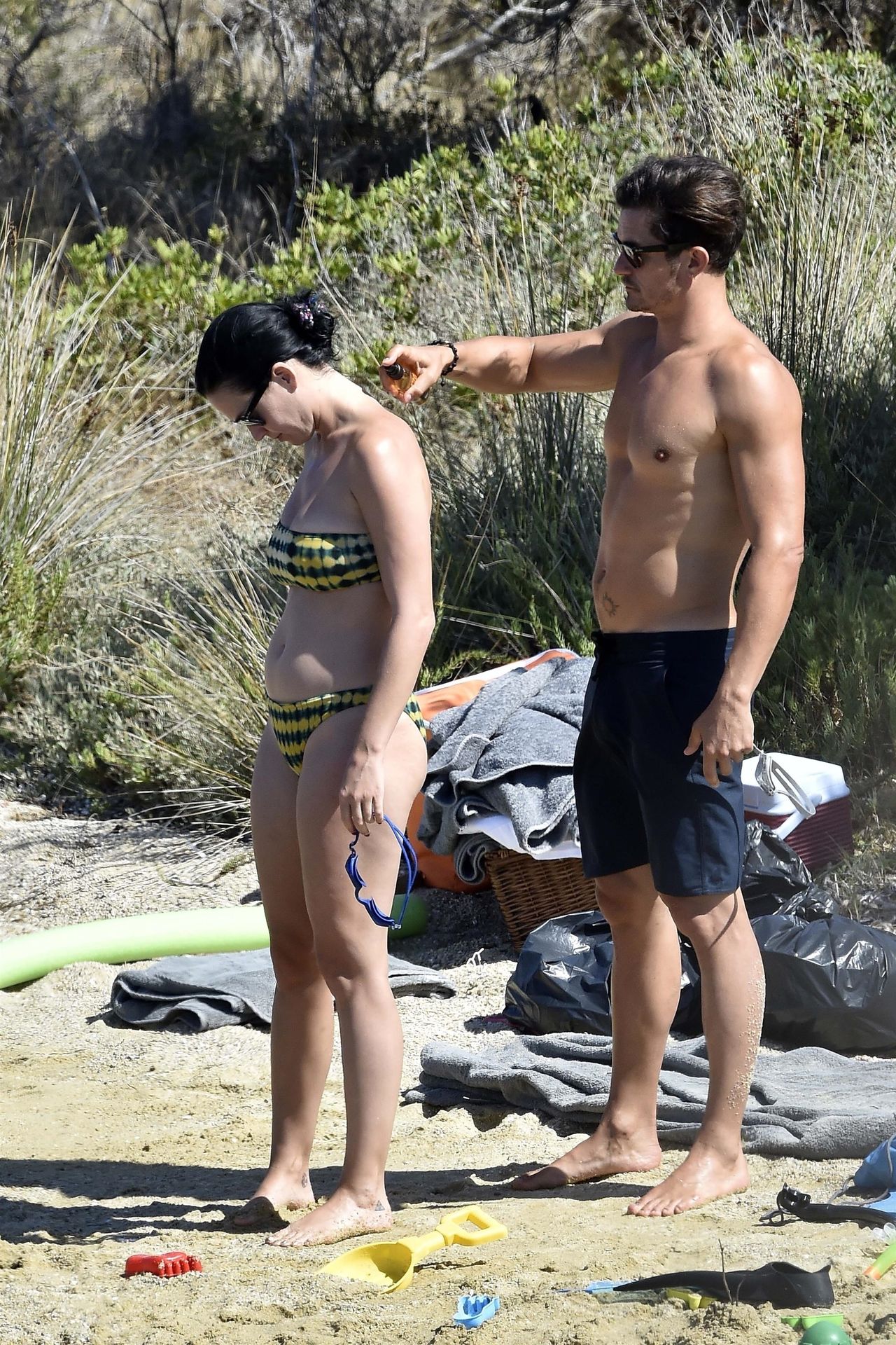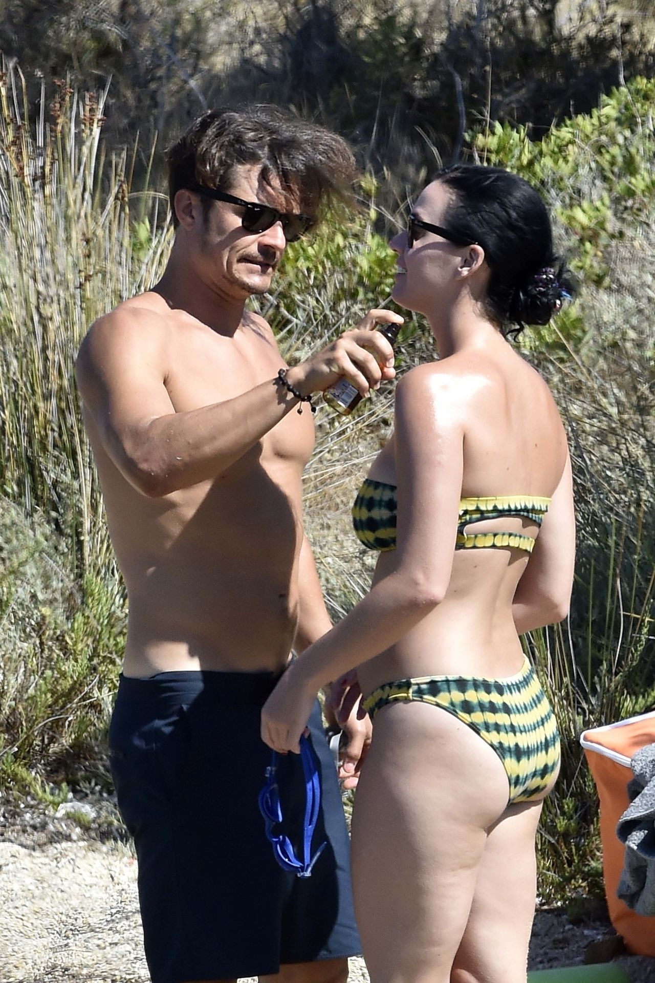 PICTURED HERE: Katy Perry and beau Orlando Bloom have a fun little beach day while vacationing in Italy, 08/02/2019. The hot couple indulged in some water activity like snorkeling and paddle boarding. Orlando was quite the exhibitionist removing his board shorts and letting it all hang out while paddling Katy on their paddleboard. Katy and Orlando had lunch on the beach and can be seen kissing and cuddling under the sun as the two appear to be really in-love.