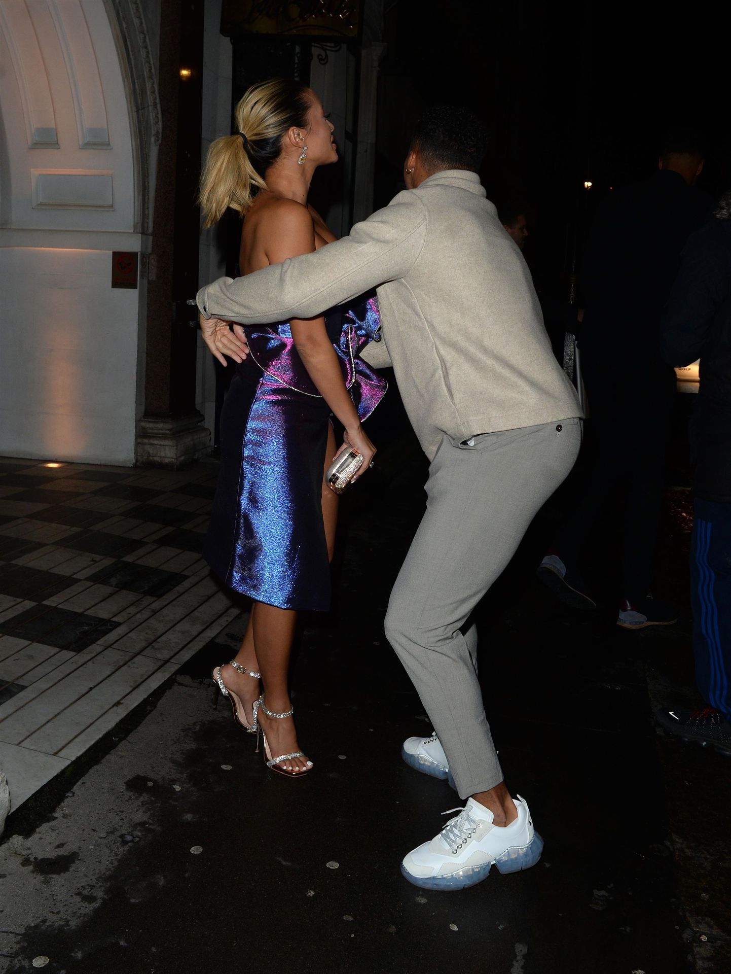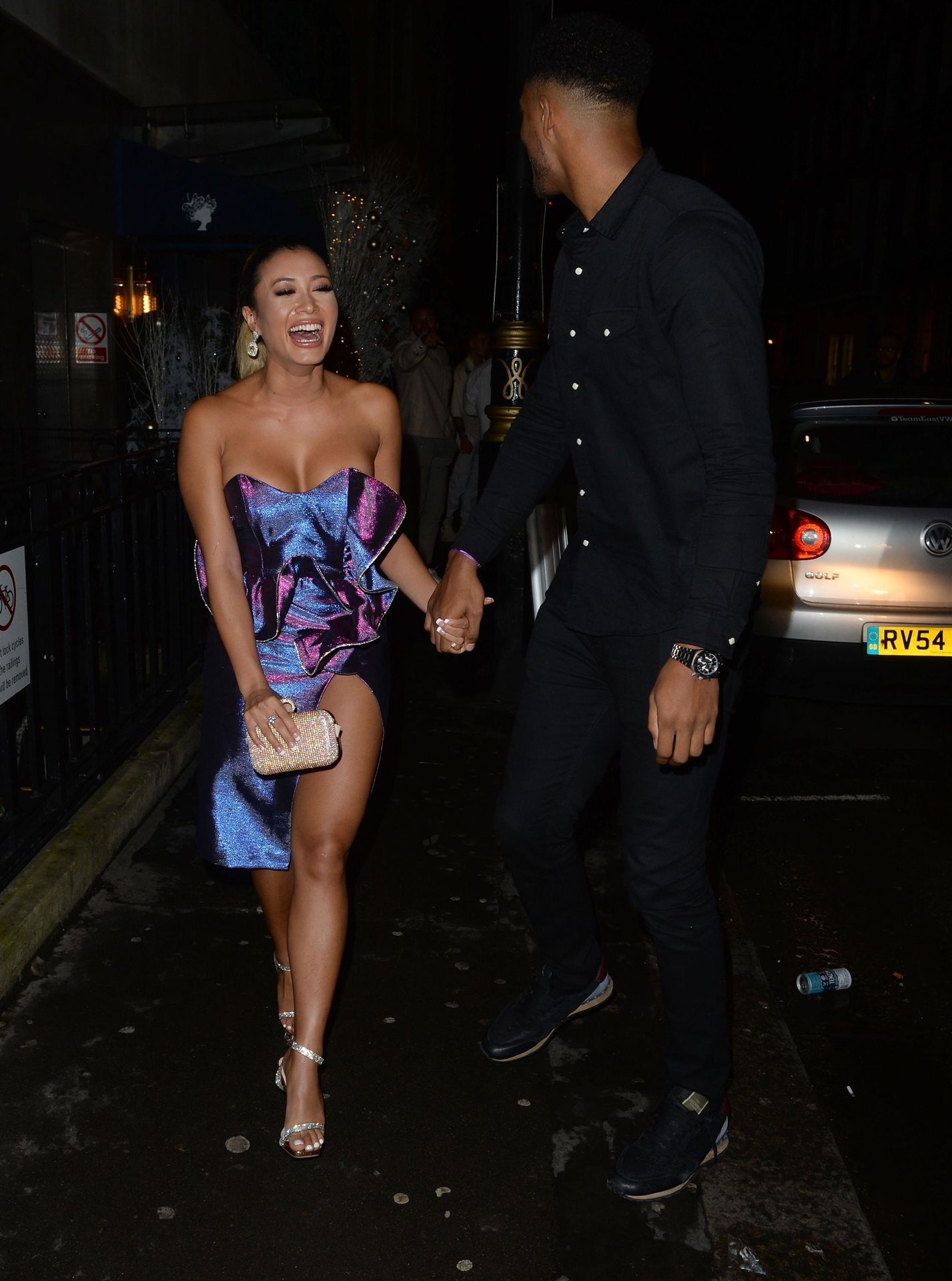 Leggy and busty “Love Island” star Kazimir “Kaz” Crossley was seen in purple dress together with Theo Campbell at the party at Bagatelle in London, 11/27/2019.