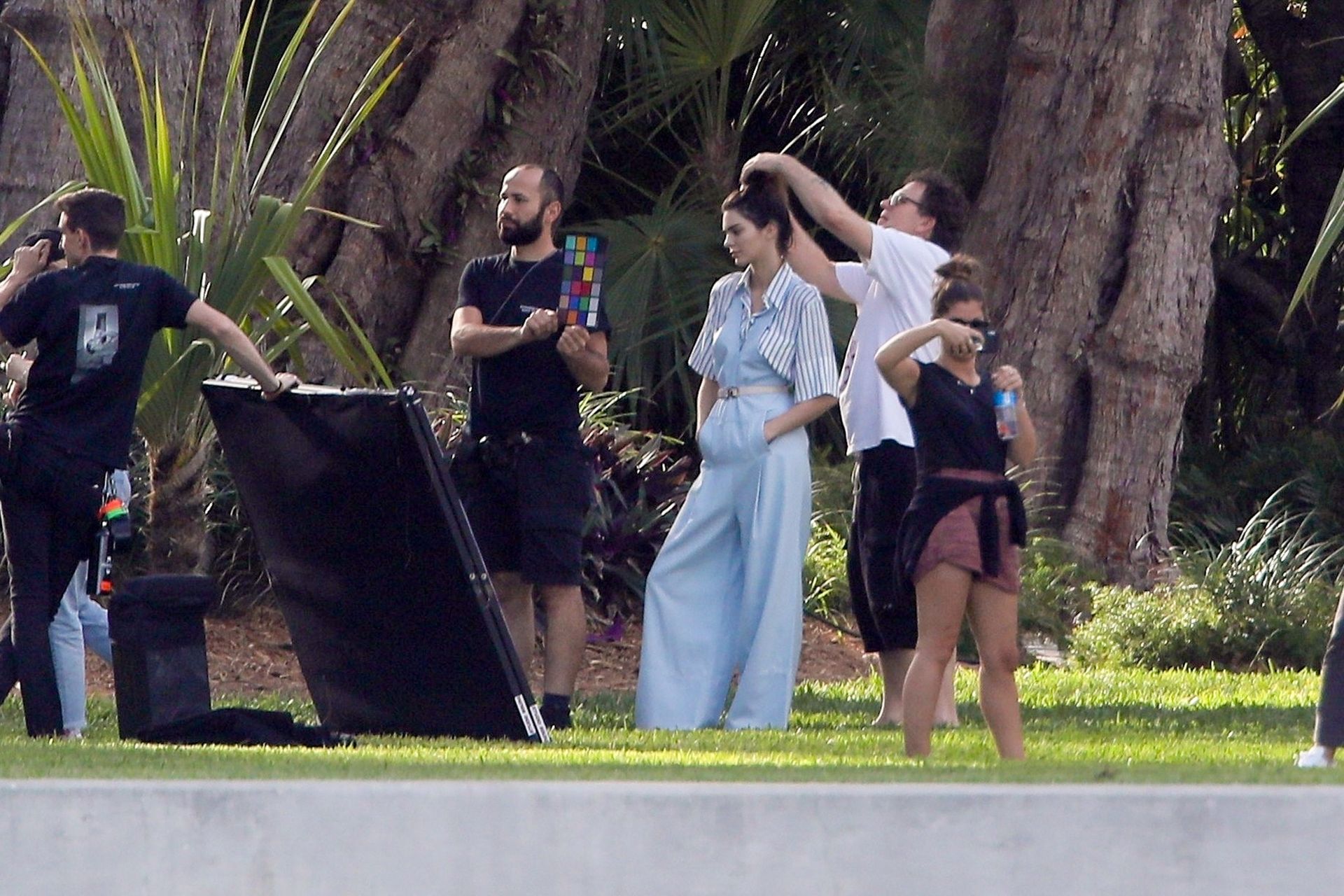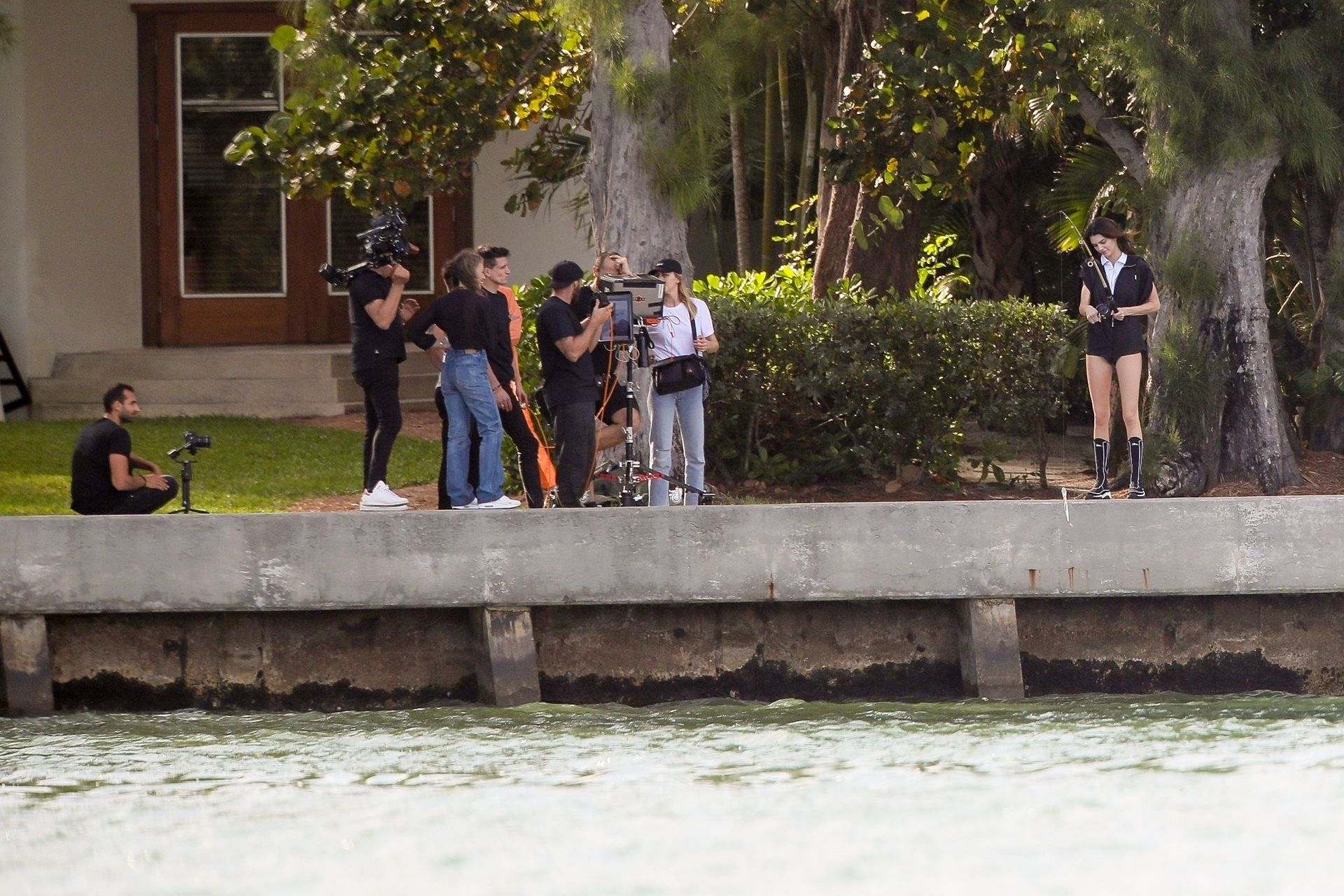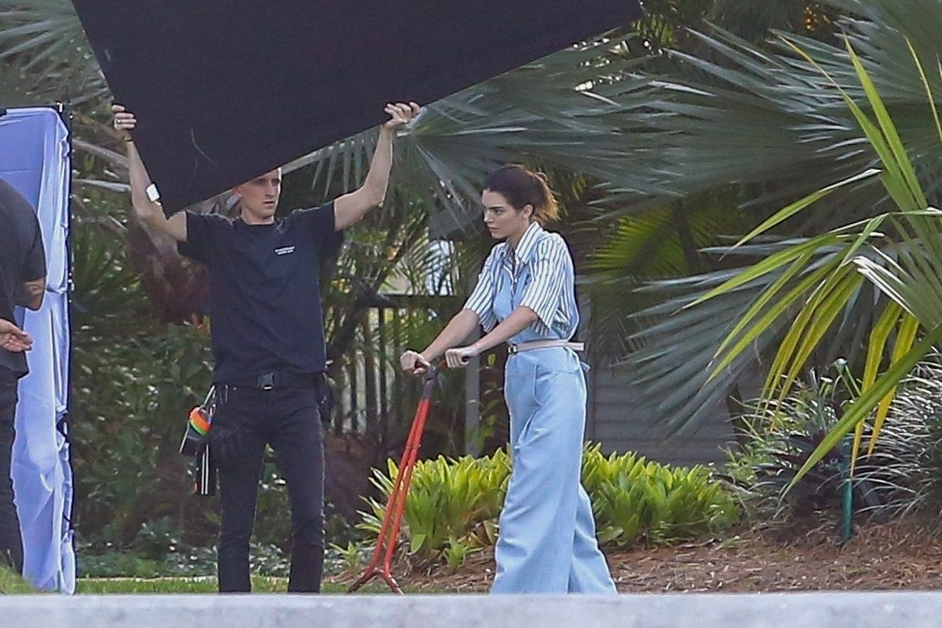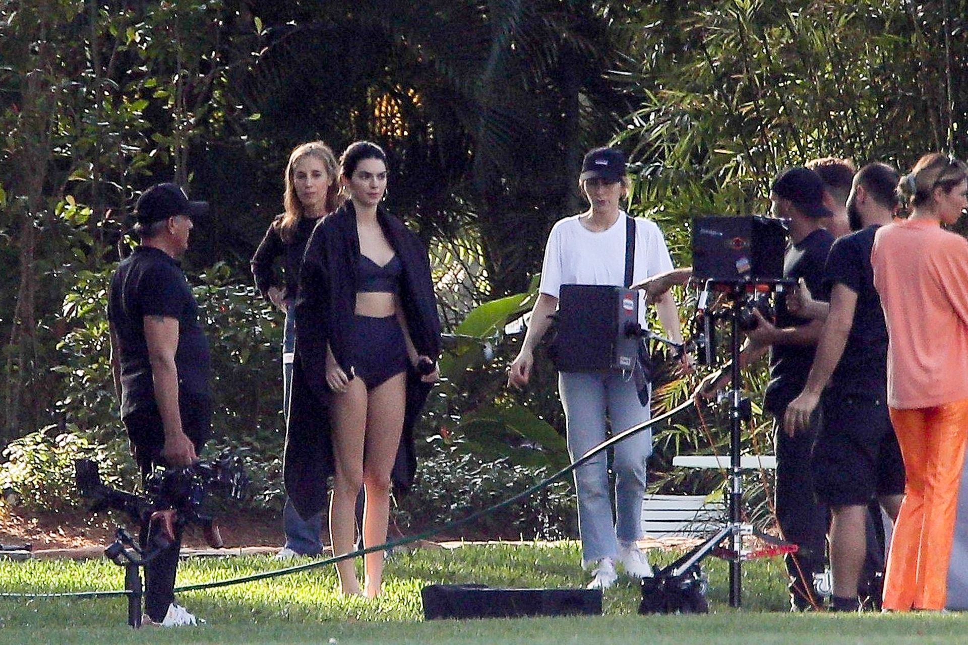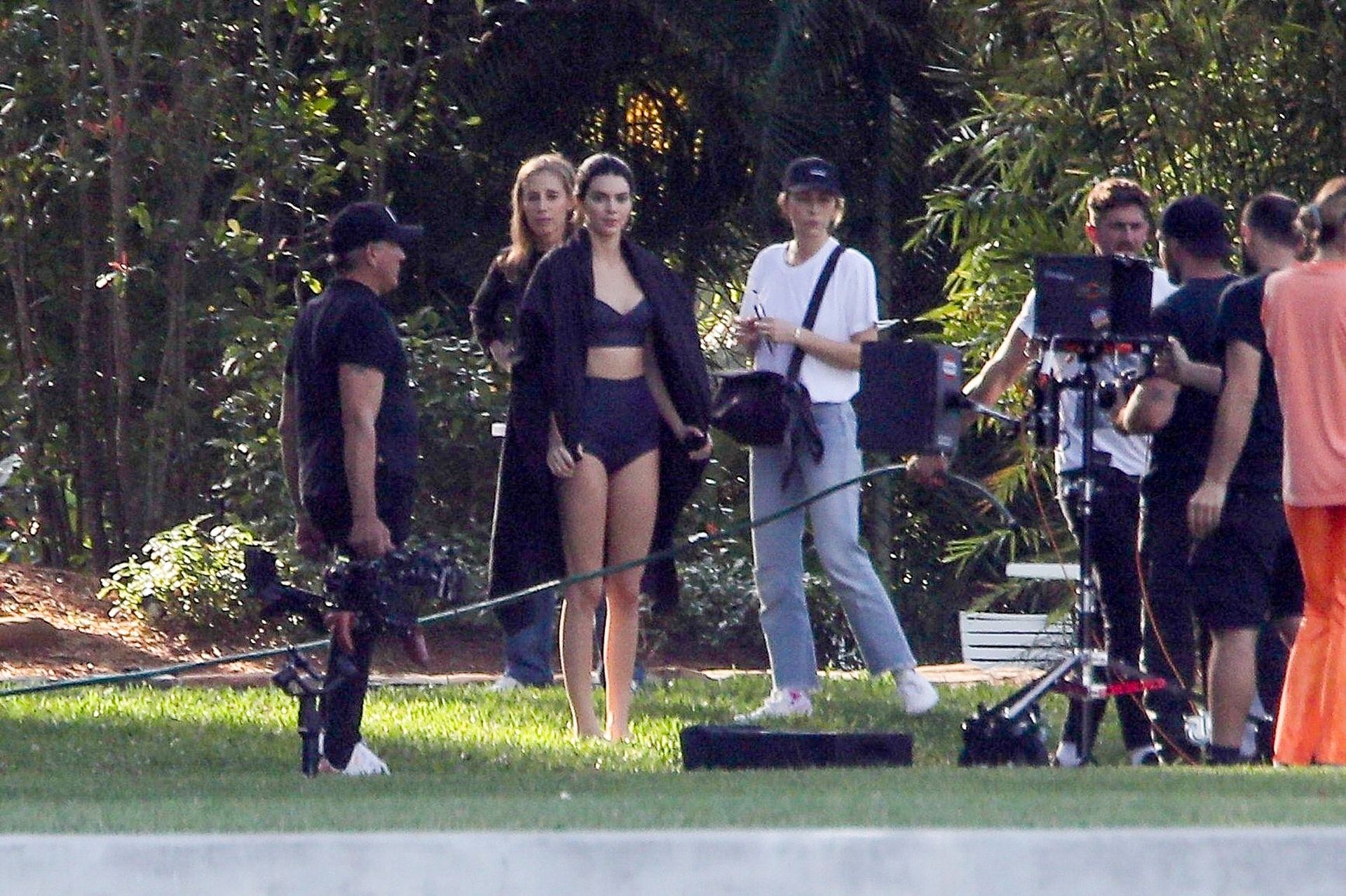 Kendall Jenner slips out of a baby blue outfit and changes into a black ensemble during a photoshoot. Kendall Jenner was wearing a bikini and spraying water out of a hose in Miami, 02/05/2020.