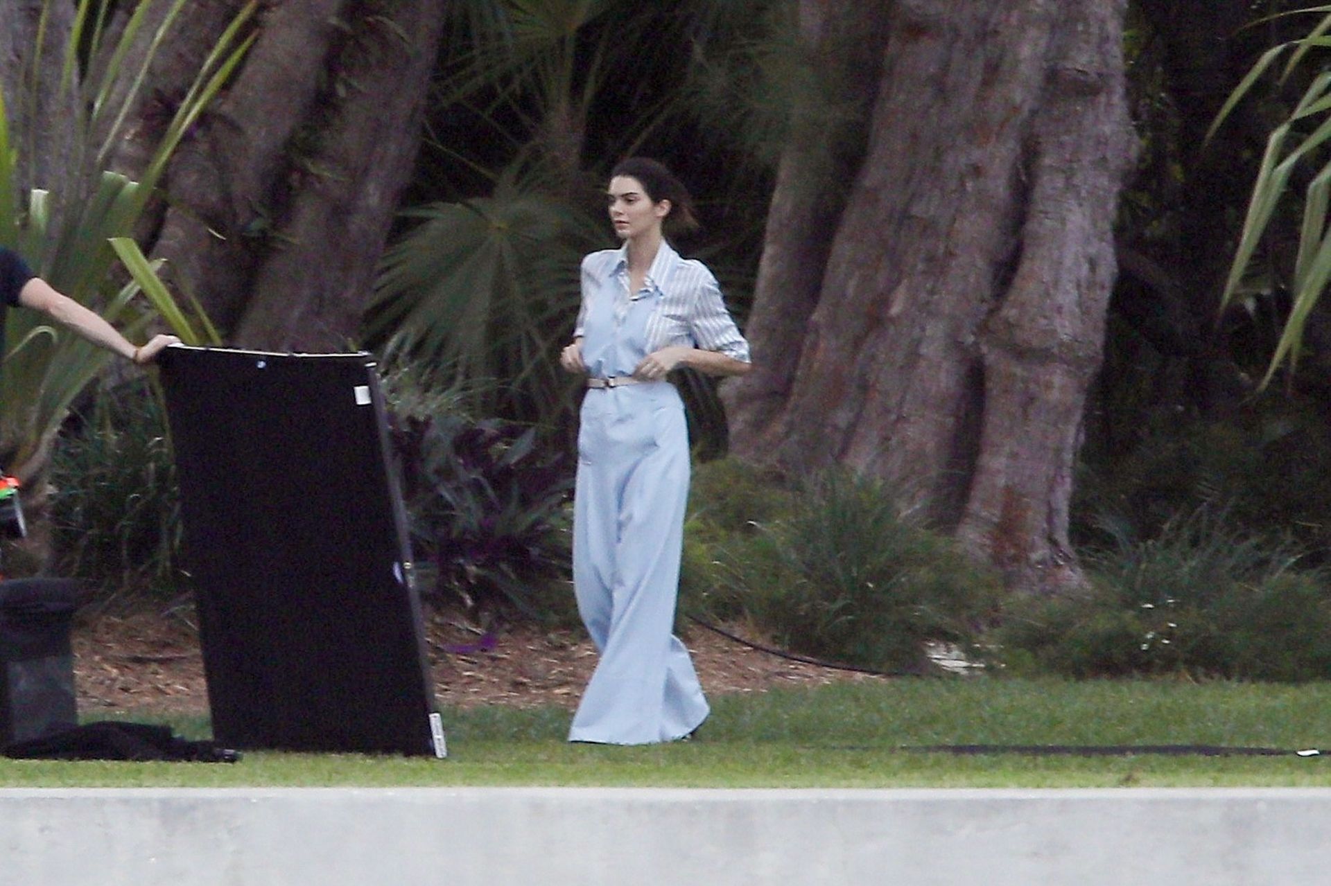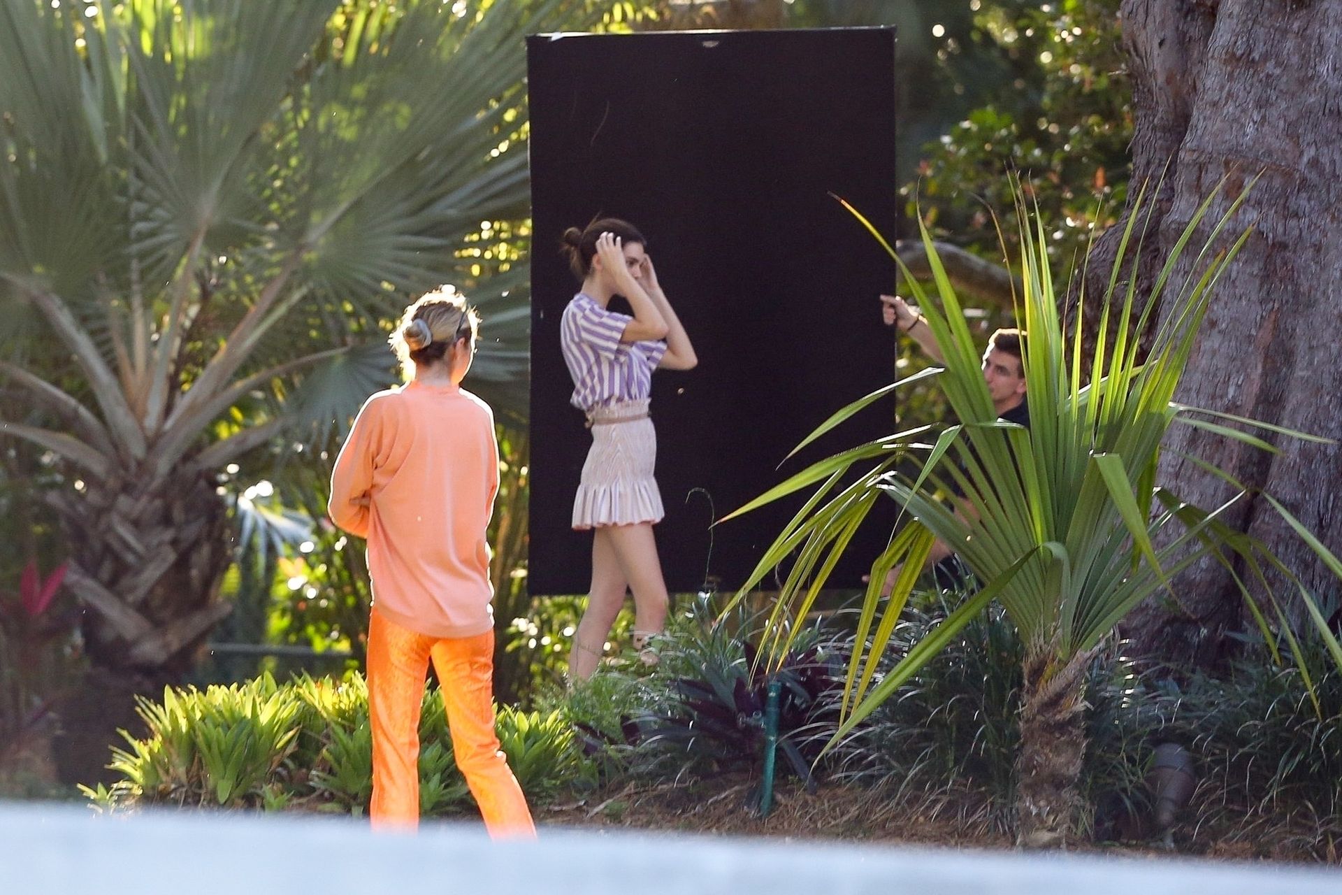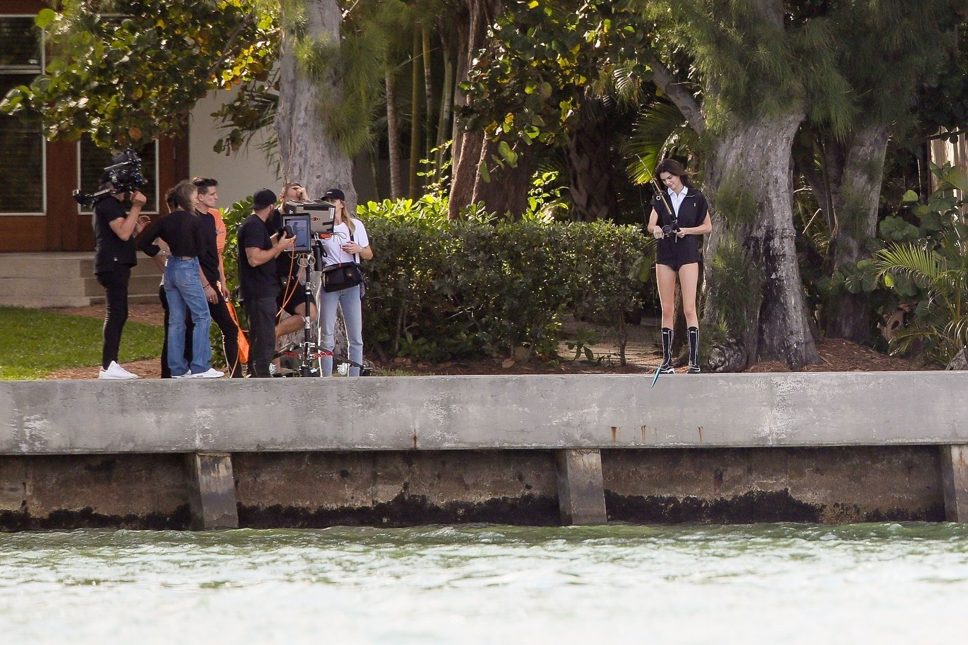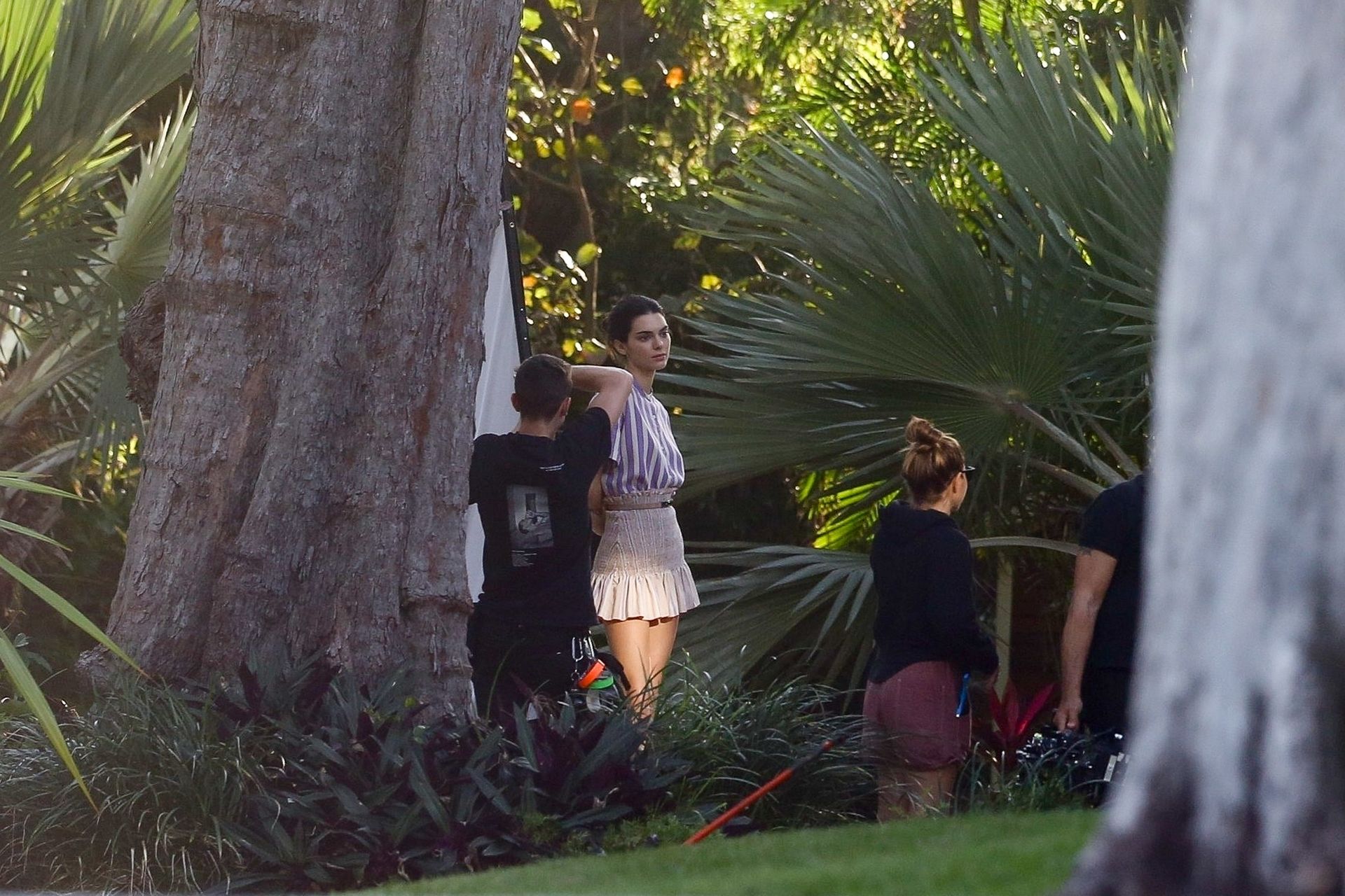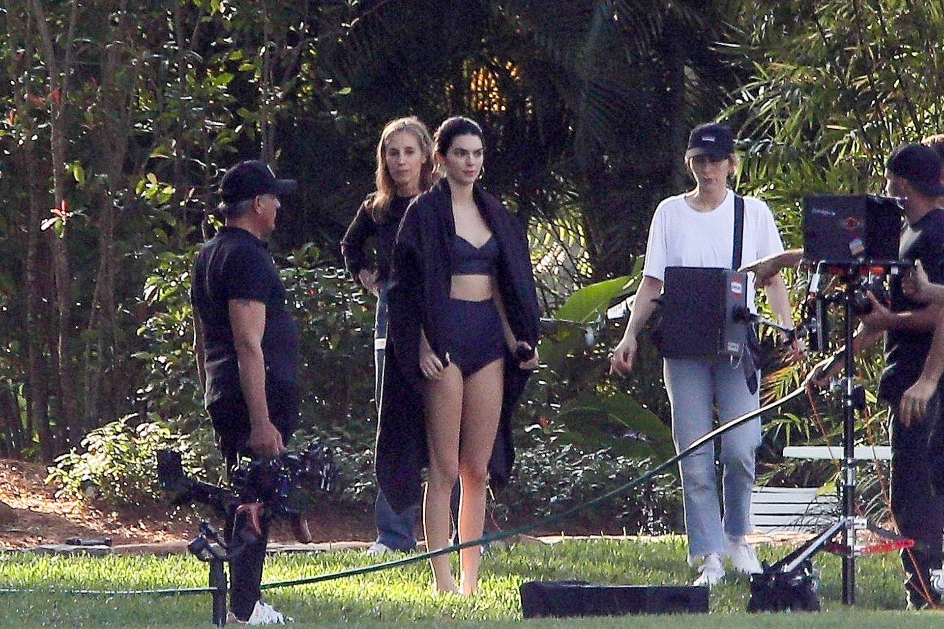 Kendall Jenner slips out of a baby blue outfit and changes into a black ensemble during a photoshoot. Kendall Jenner was wearing a bikini and spraying water out of a hose in Miami, 02/05/2020.