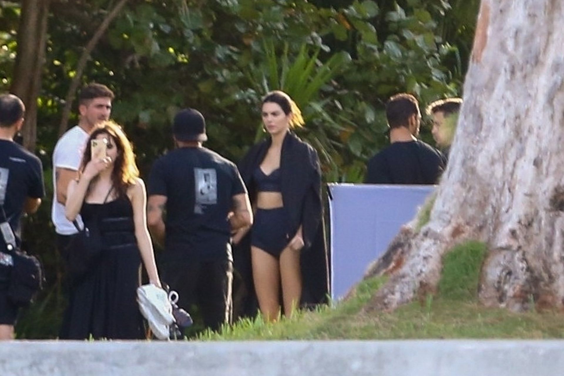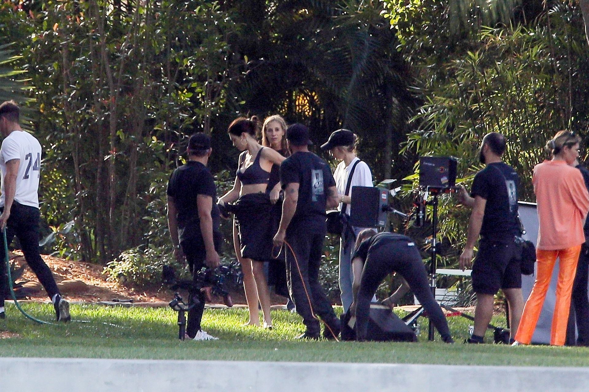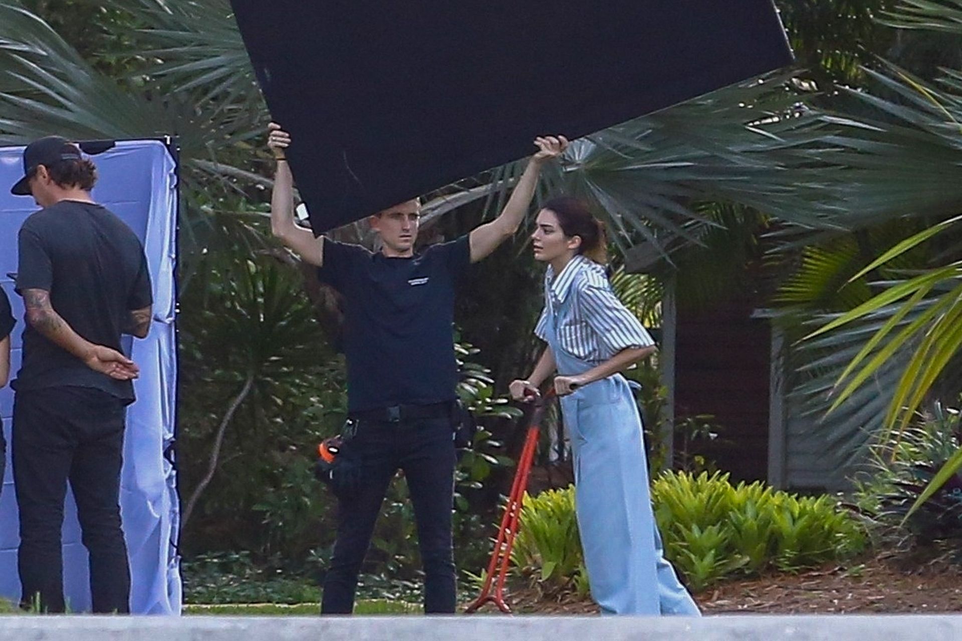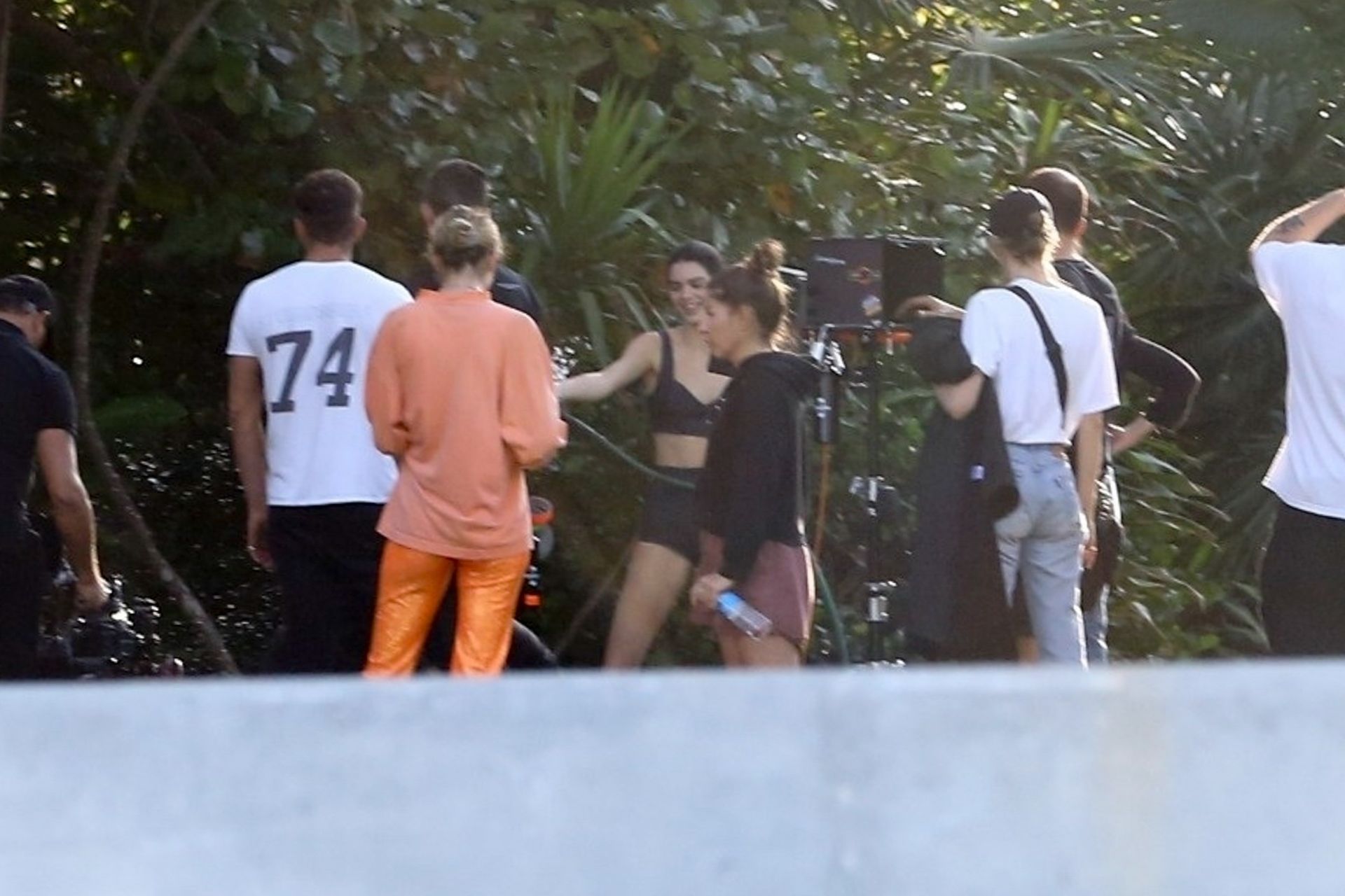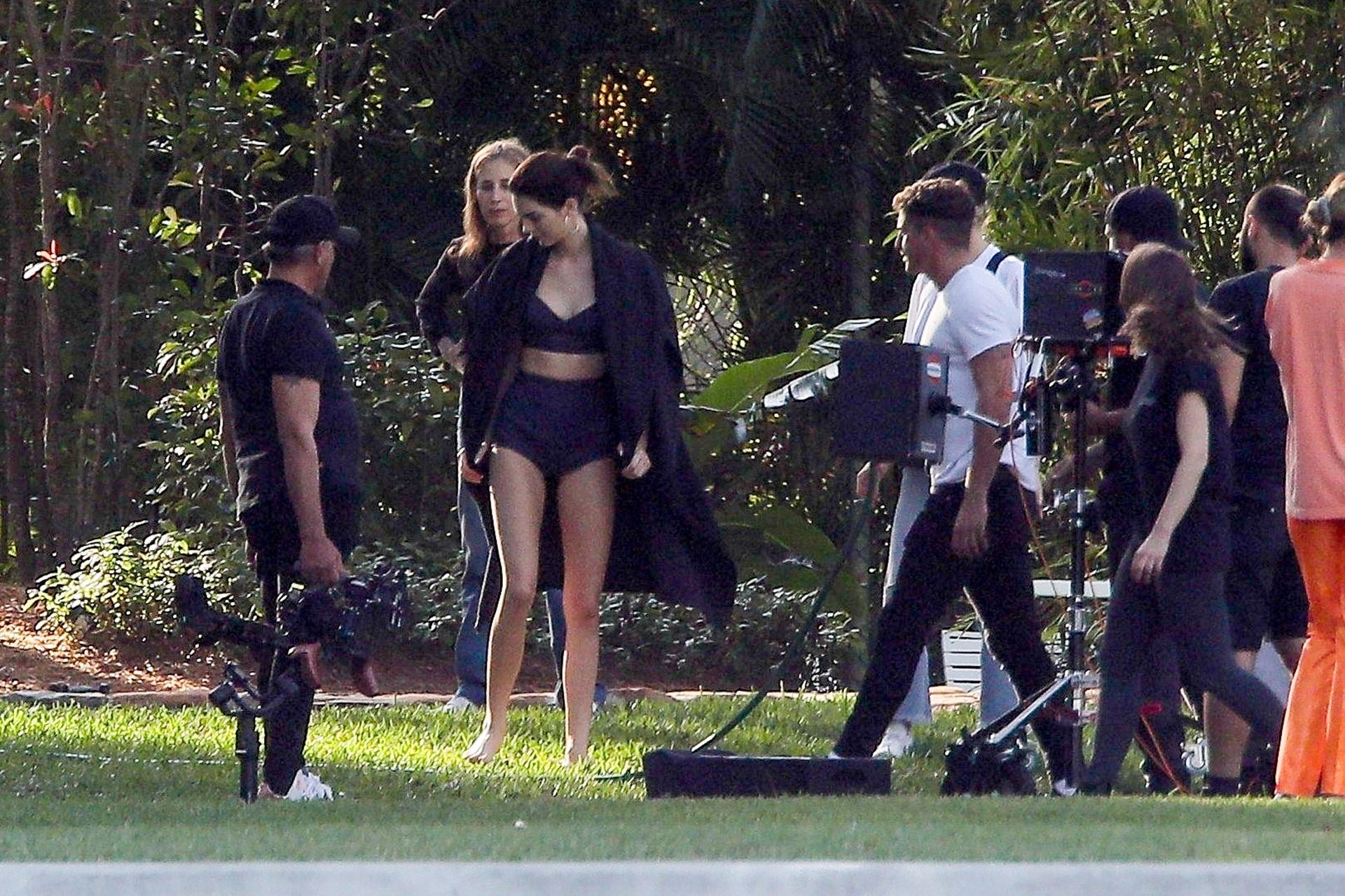 Kendall Jenner slips out of a baby blue outfit and changes into a black ensemble during a photoshoot. Kendall Jenner was wearing a bikini and spraying water out of a hose in Miami, 02/05/2020.