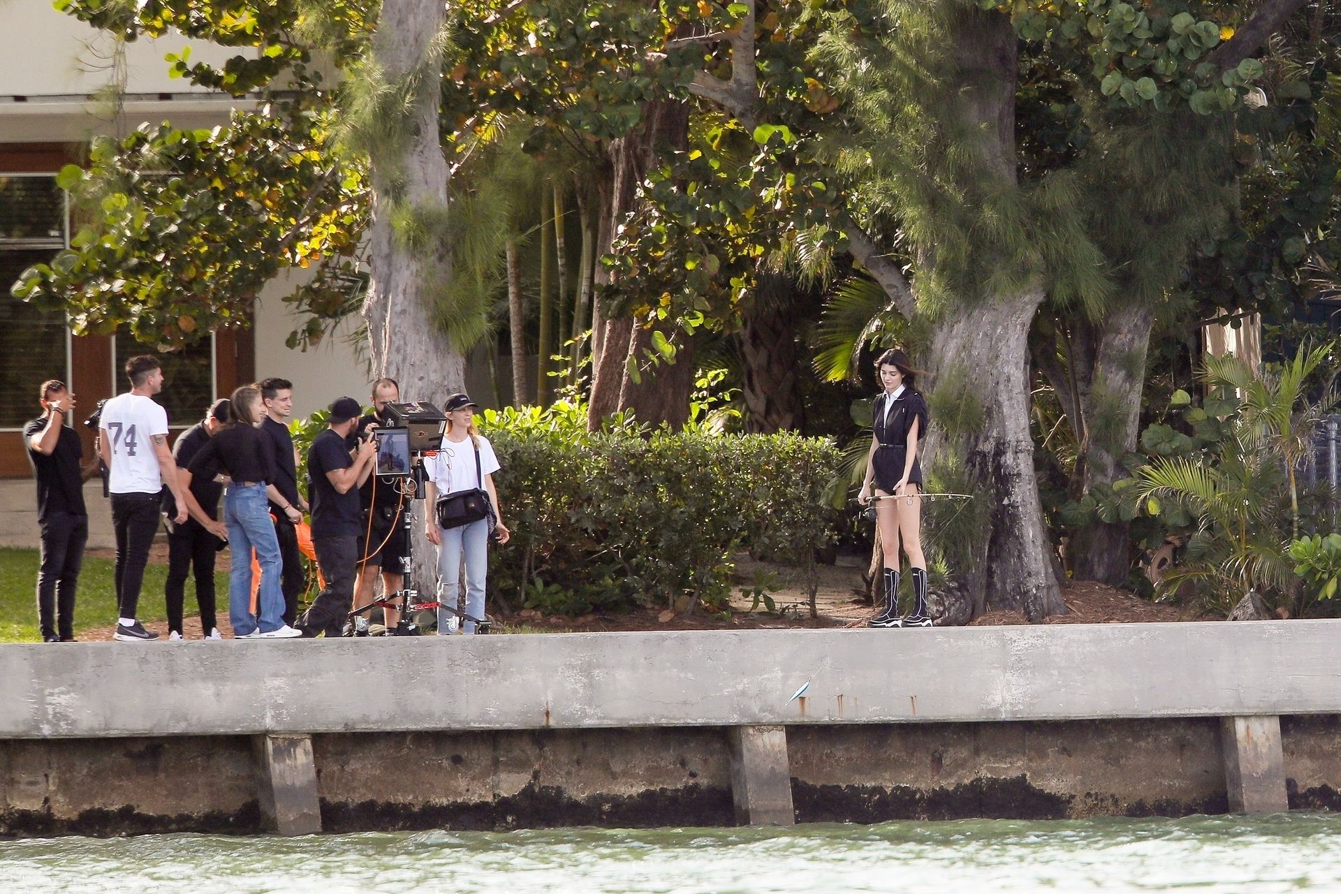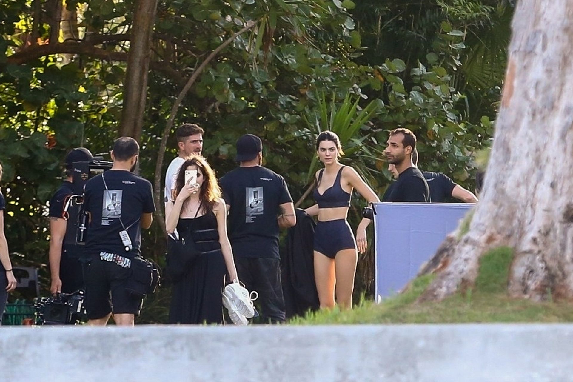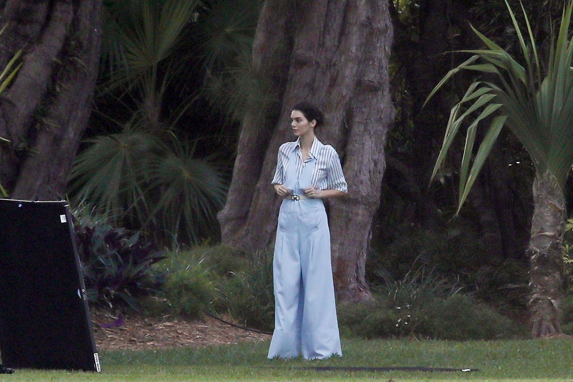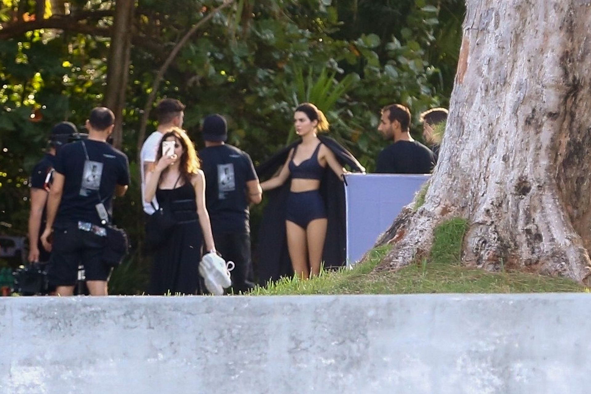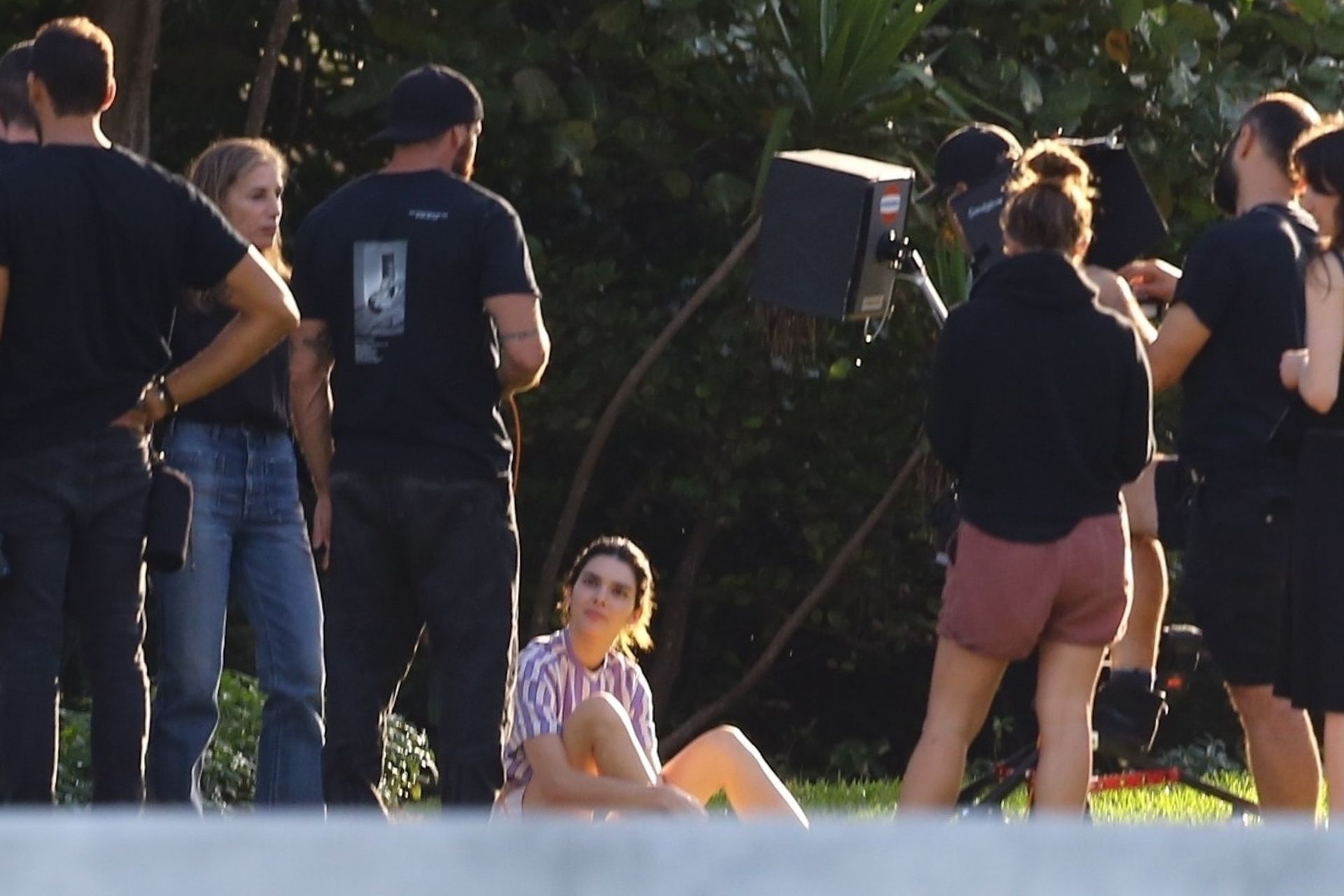 Kendall Jenner slips out of a baby blue outfit and changes into a black ensemble during a photoshoot. Kendall Jenner was wearing a bikini and spraying water out of a hose in Miami, 02/05/2020.